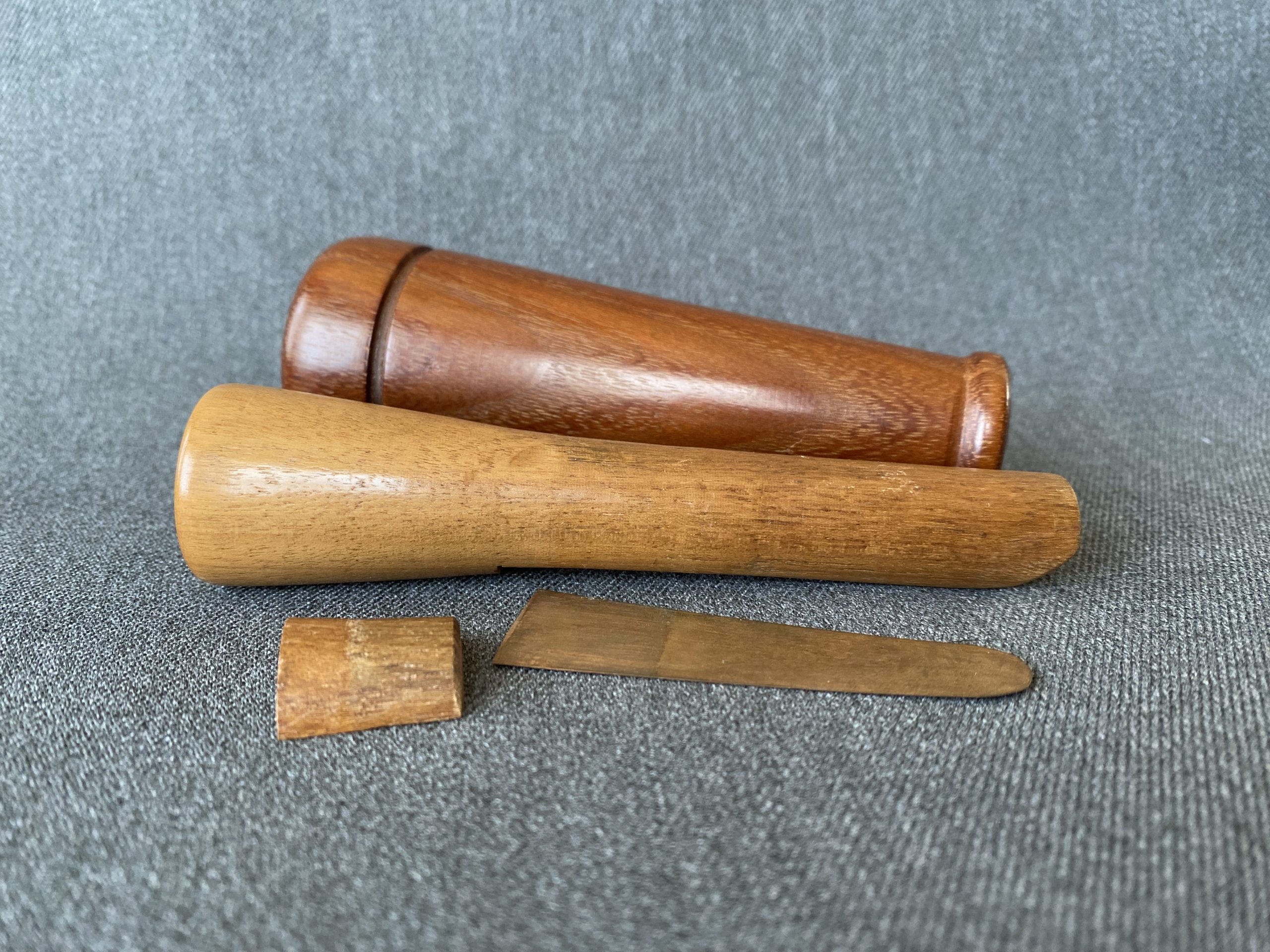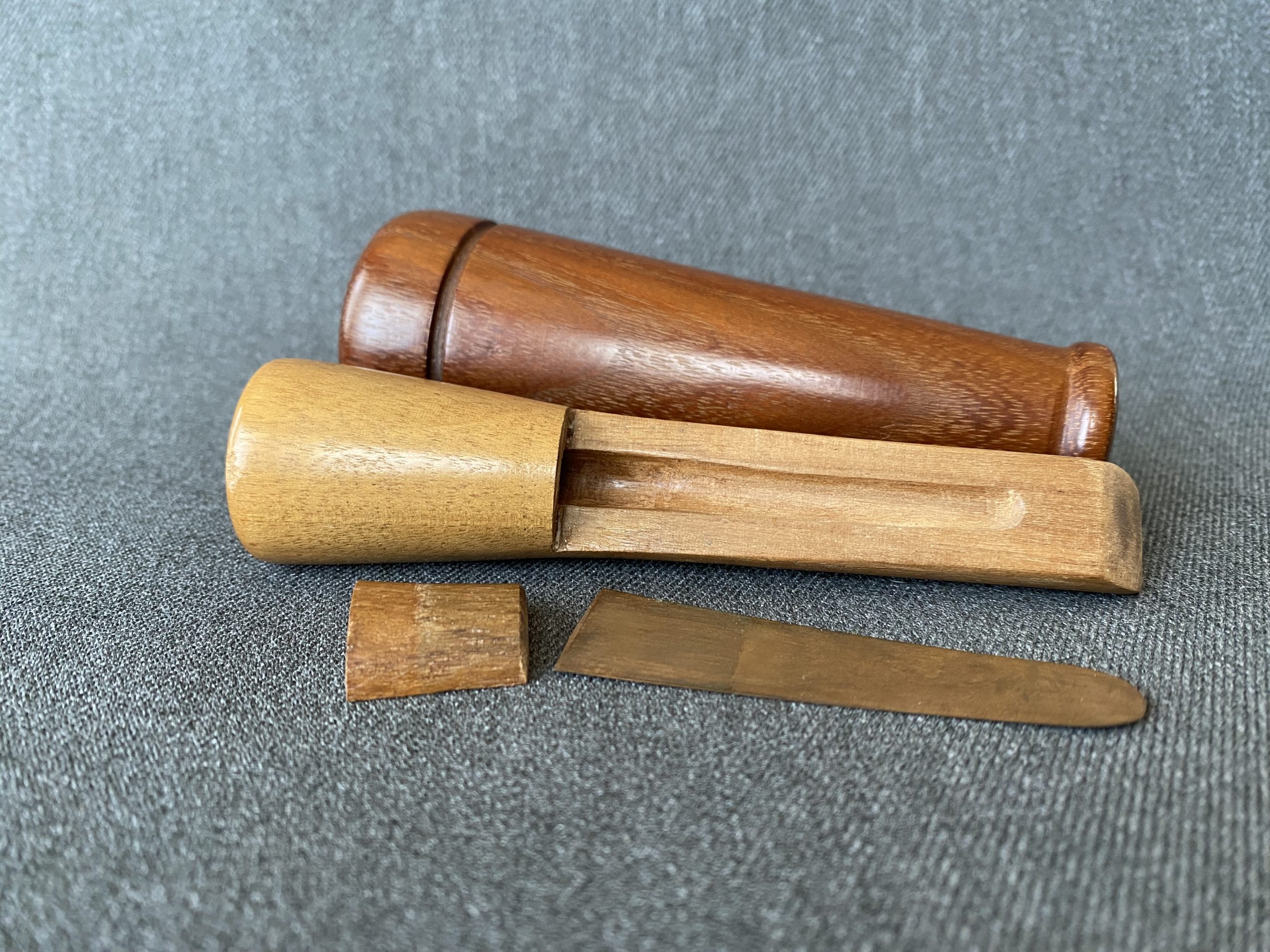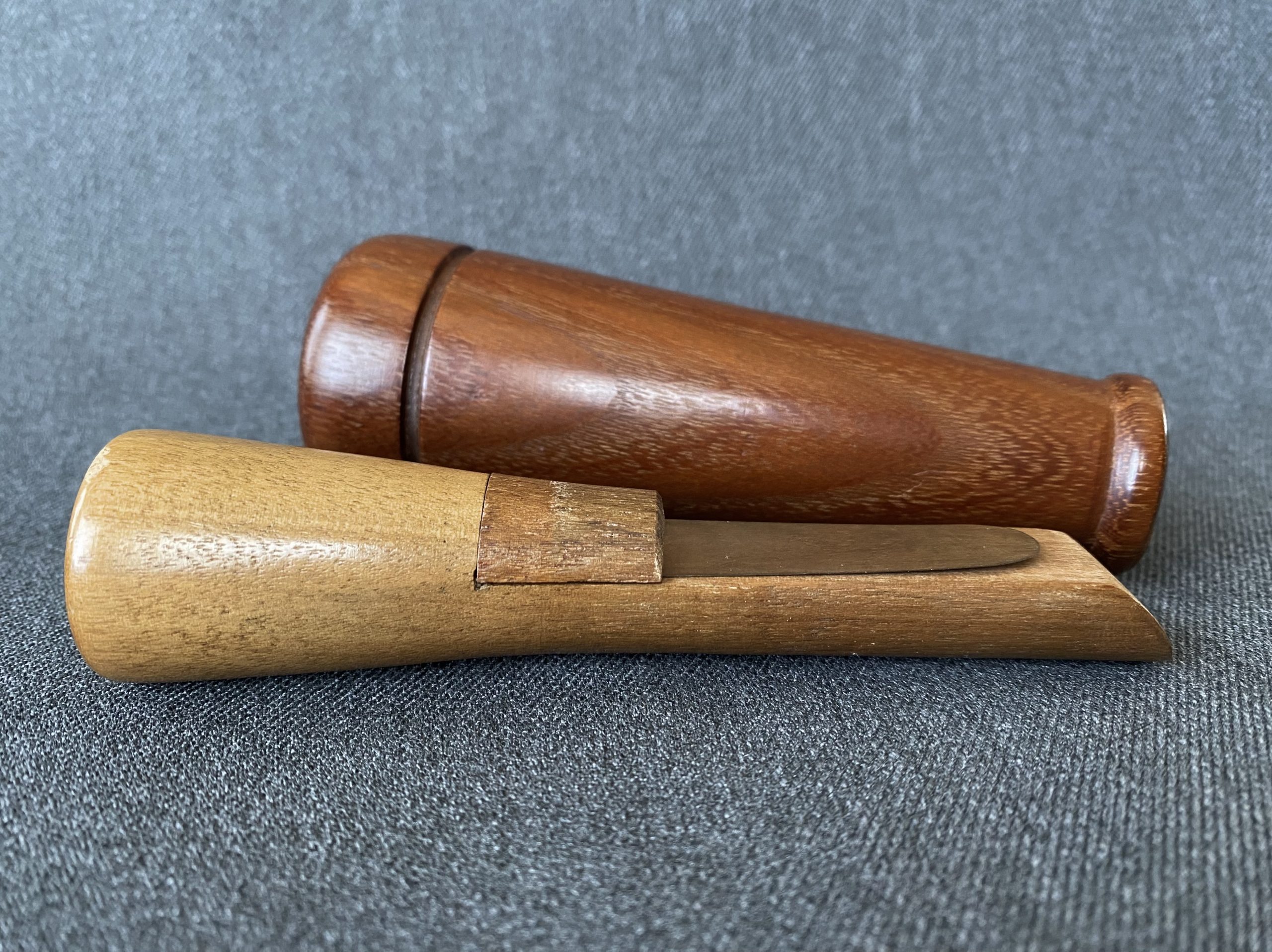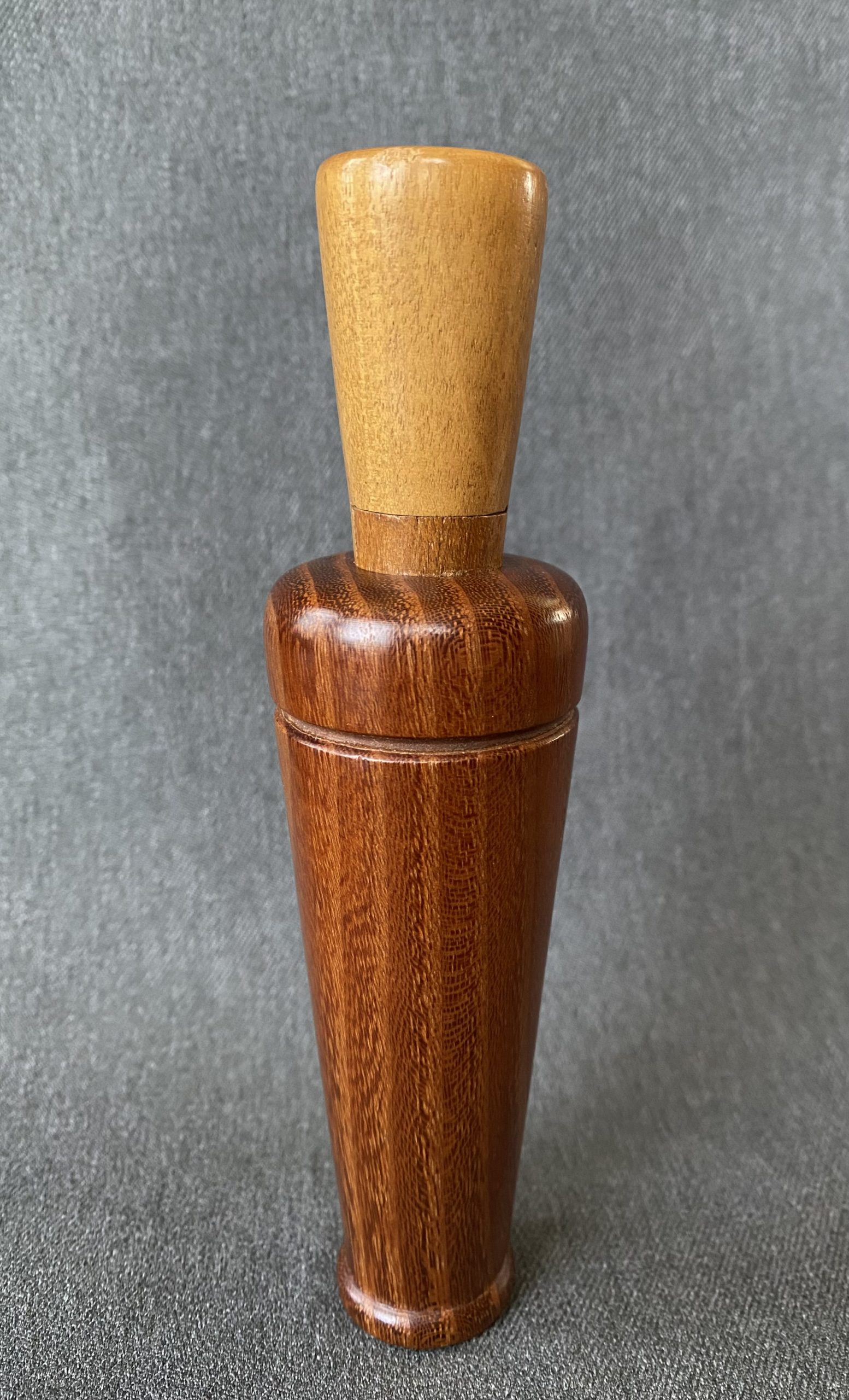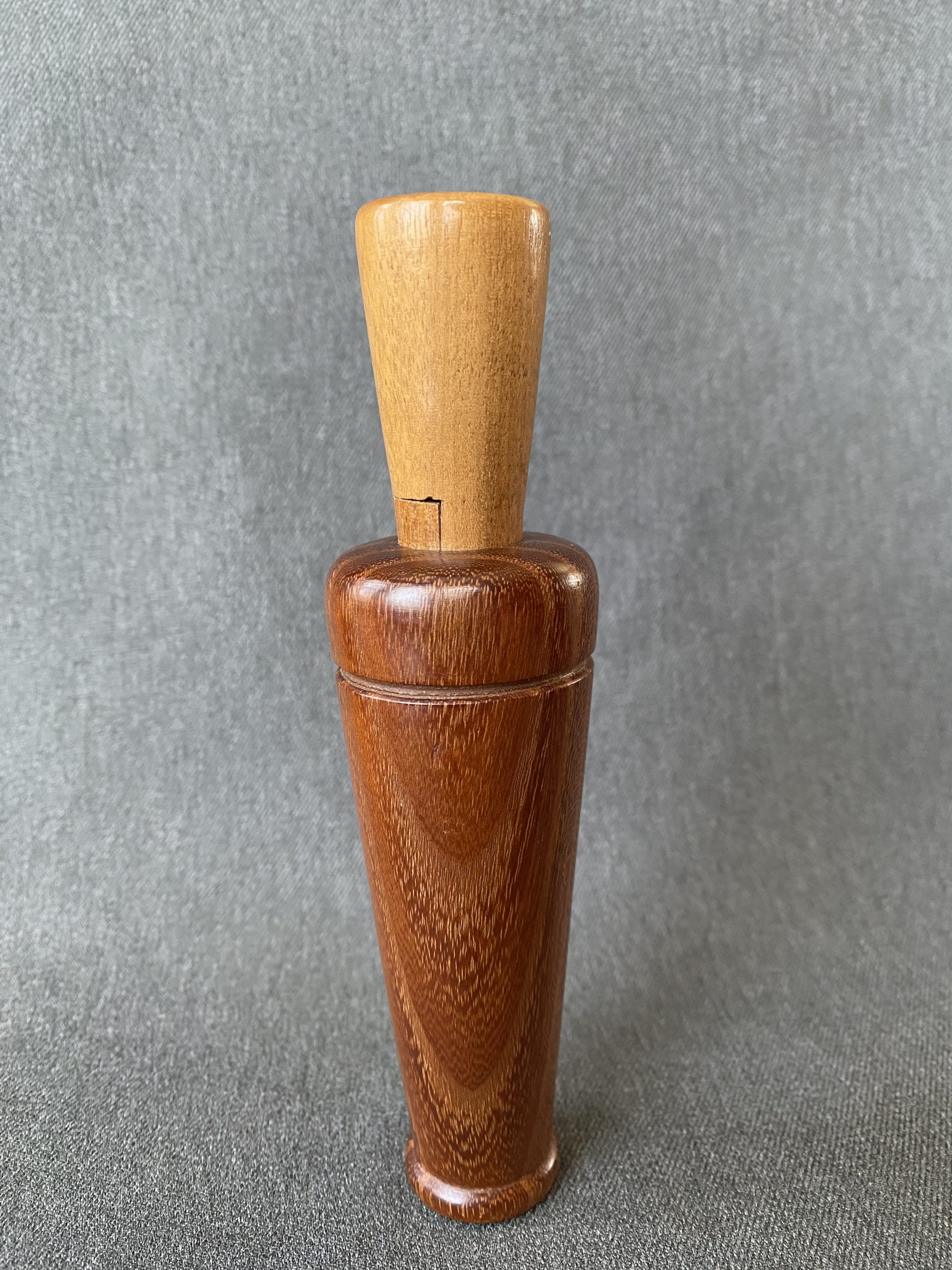 A very nice call from Floyd Abercrombie. It has a very smooth barrel with a lanyard groove and rounded flat top. The call is Reerlfoot style with a copper reed.