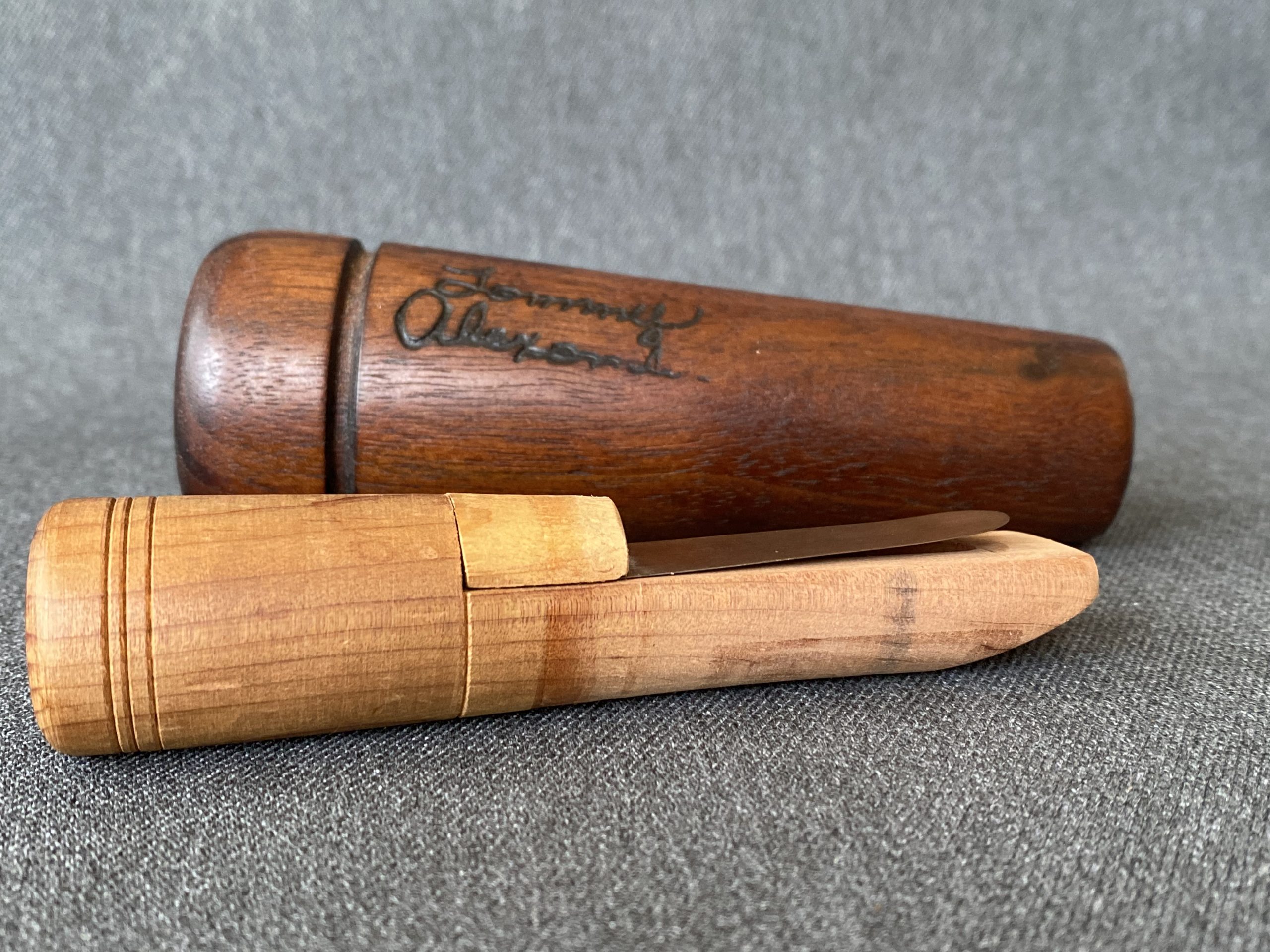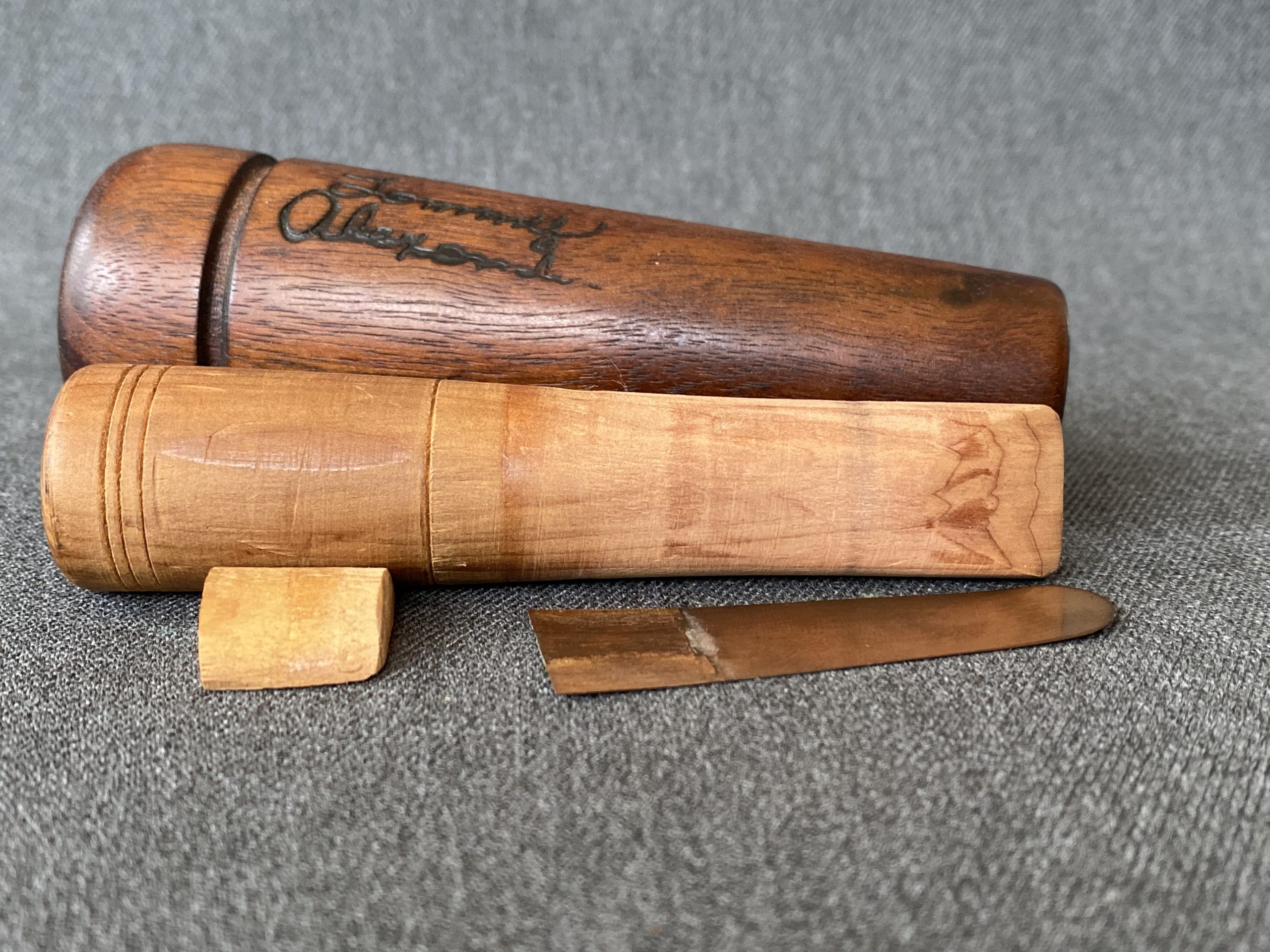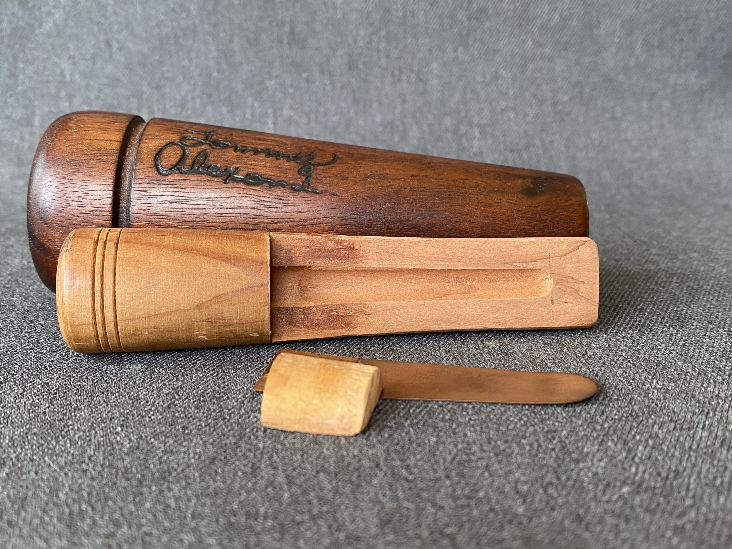 This is a great looking call from Tommy Alexander. The call is Reelfoot style with a copper reed. Alexander’s signature is engraved into the barrel.