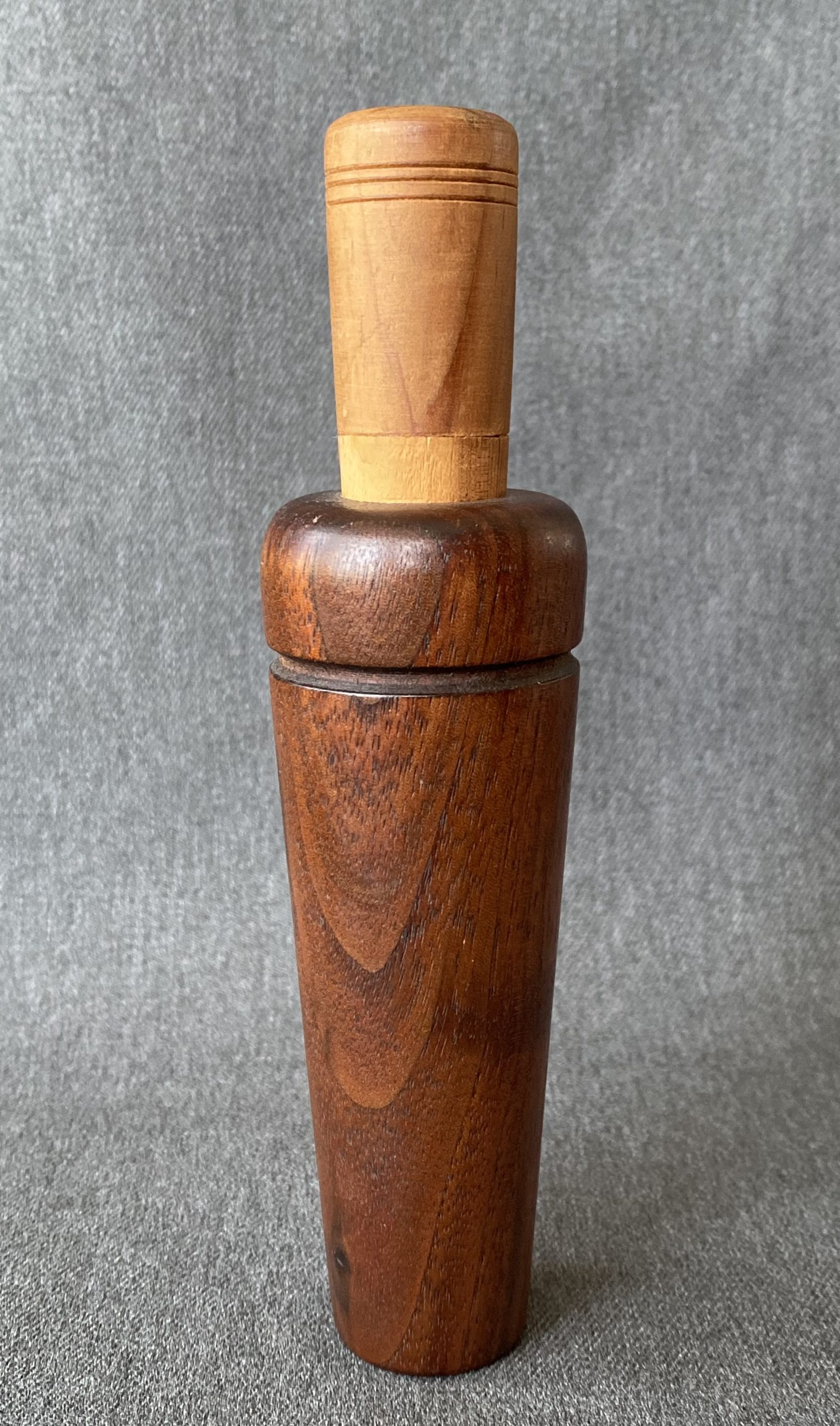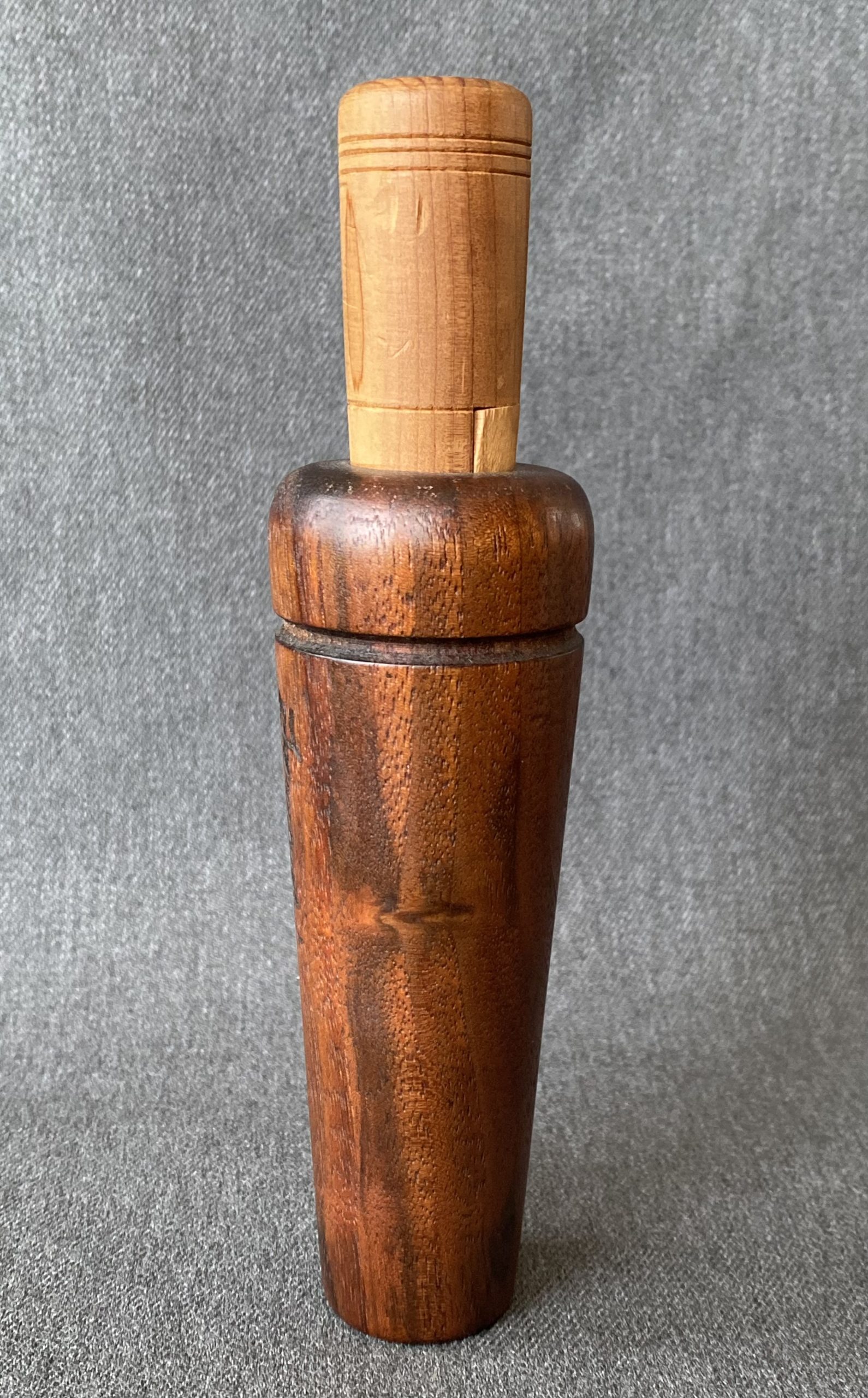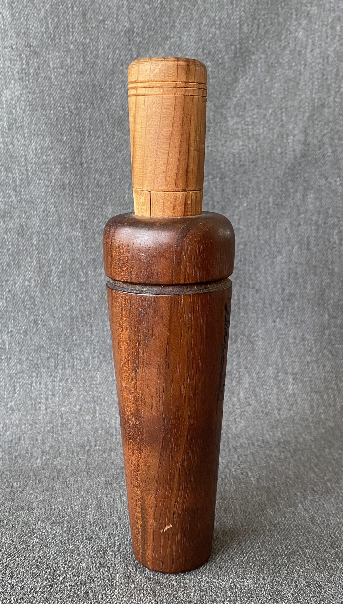 This is a great looking call from Tommy Alexander. The call is Reelfoot style with a copper reed. Alexander’s signature is engraved into the barrel.