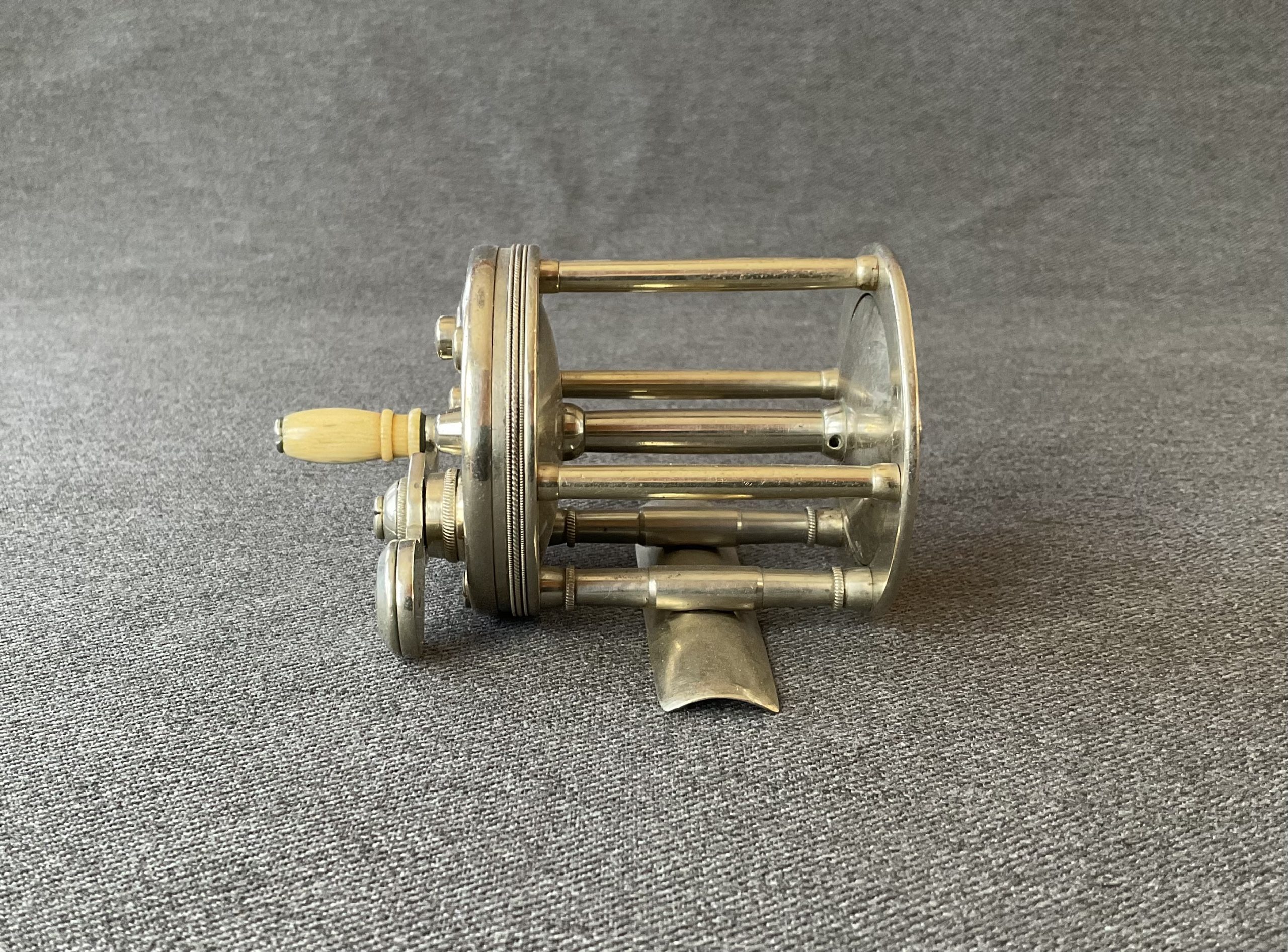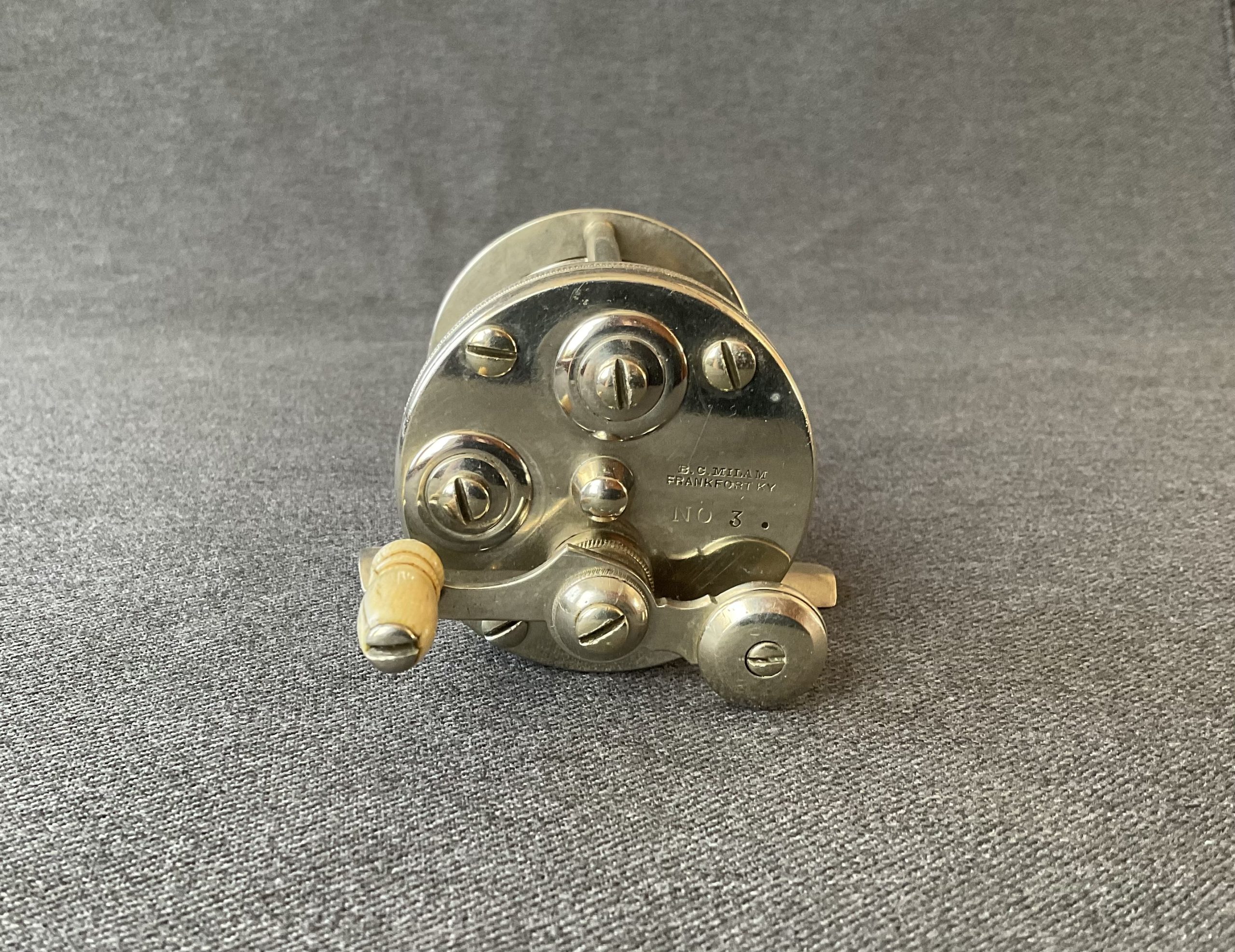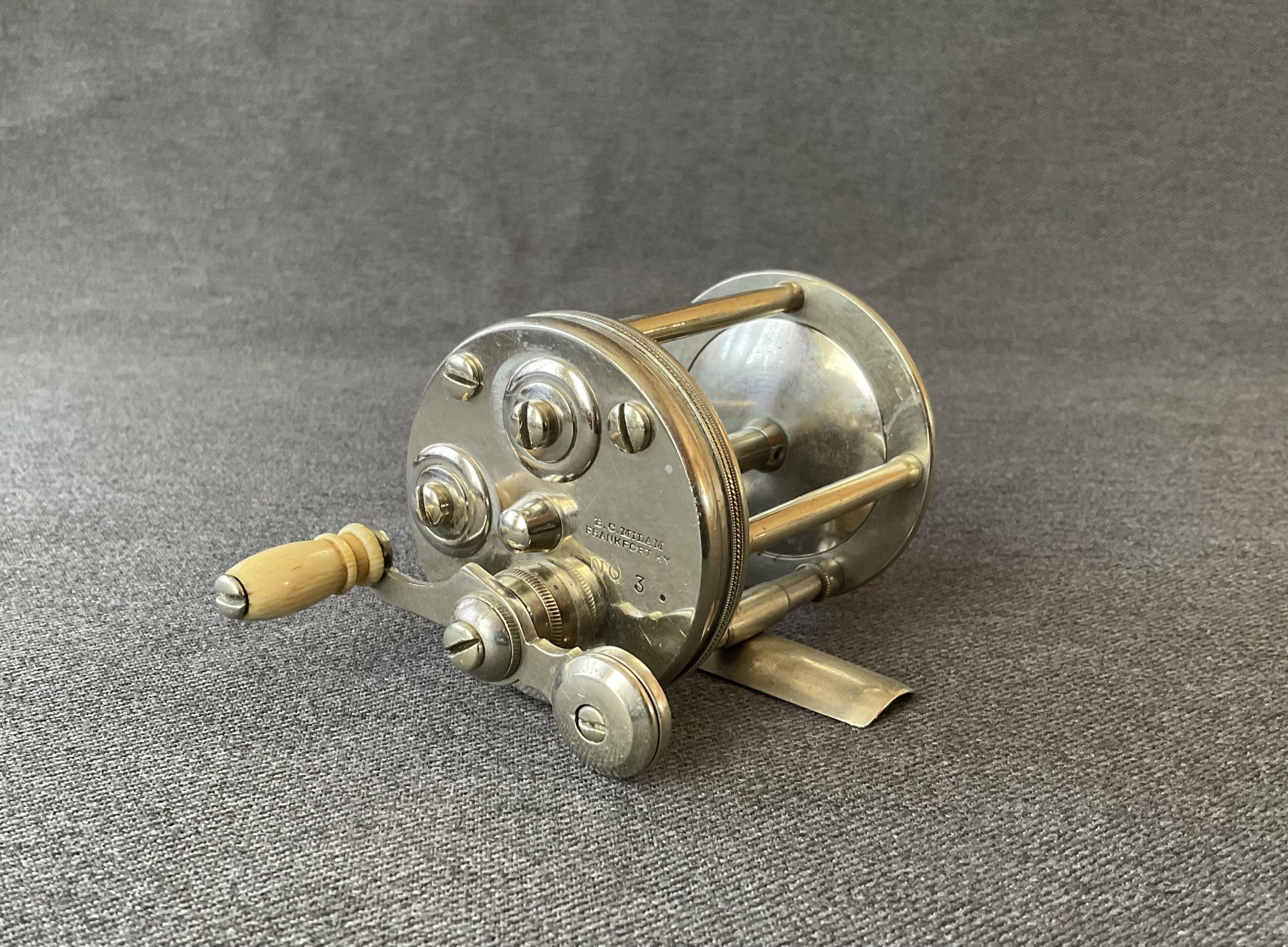 An early pre serial number bait casting reel from B.C. Milam. The reel is nicely polished German silver, it has a dog leg handle and click/drag switches.