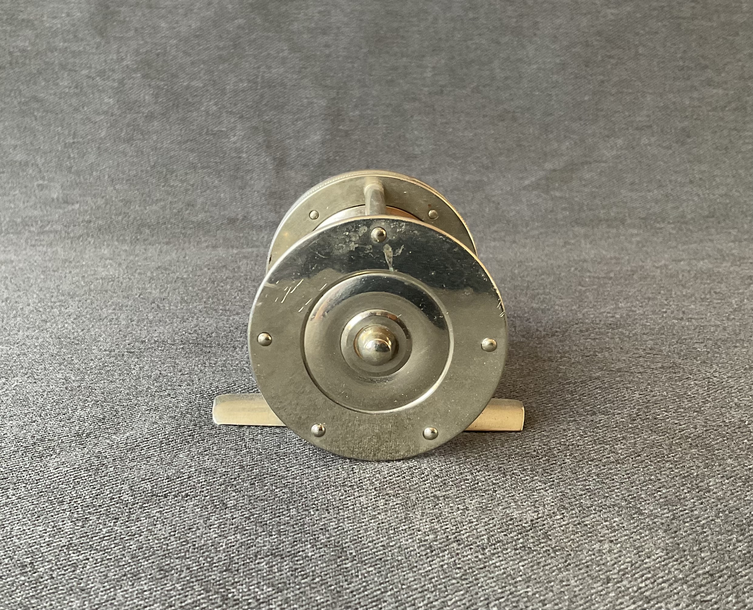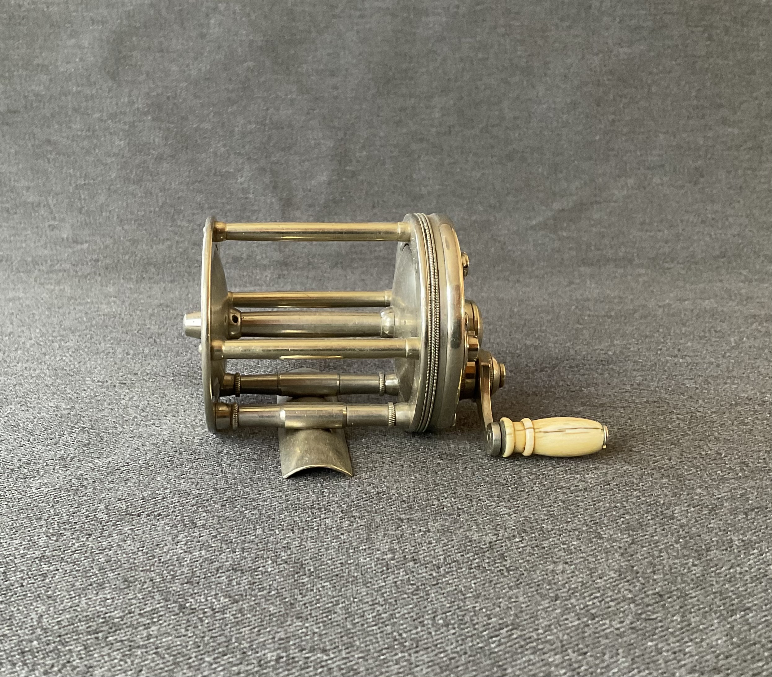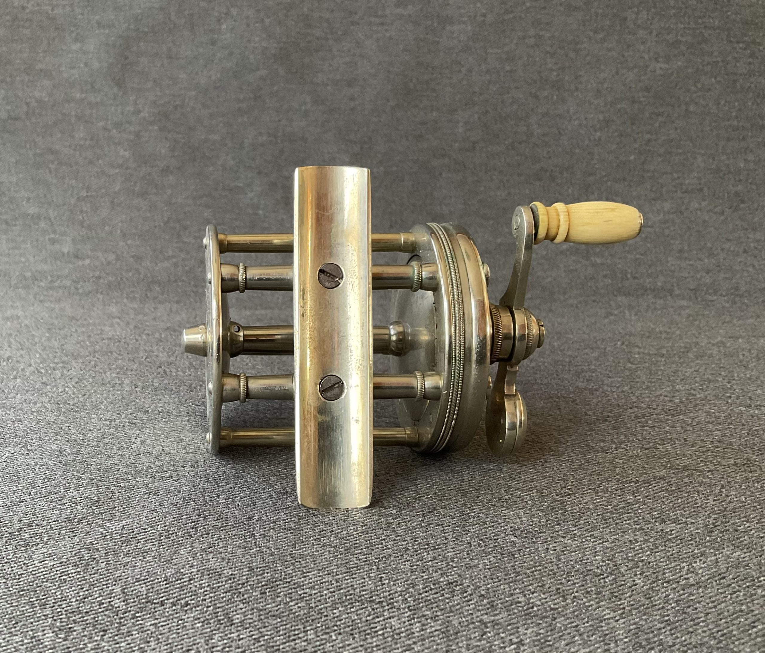 An early pre serial number bait casting reel from B.C. Milam. The reel is nicely polished German silver, it has a dog leg handle and click/drag switches.