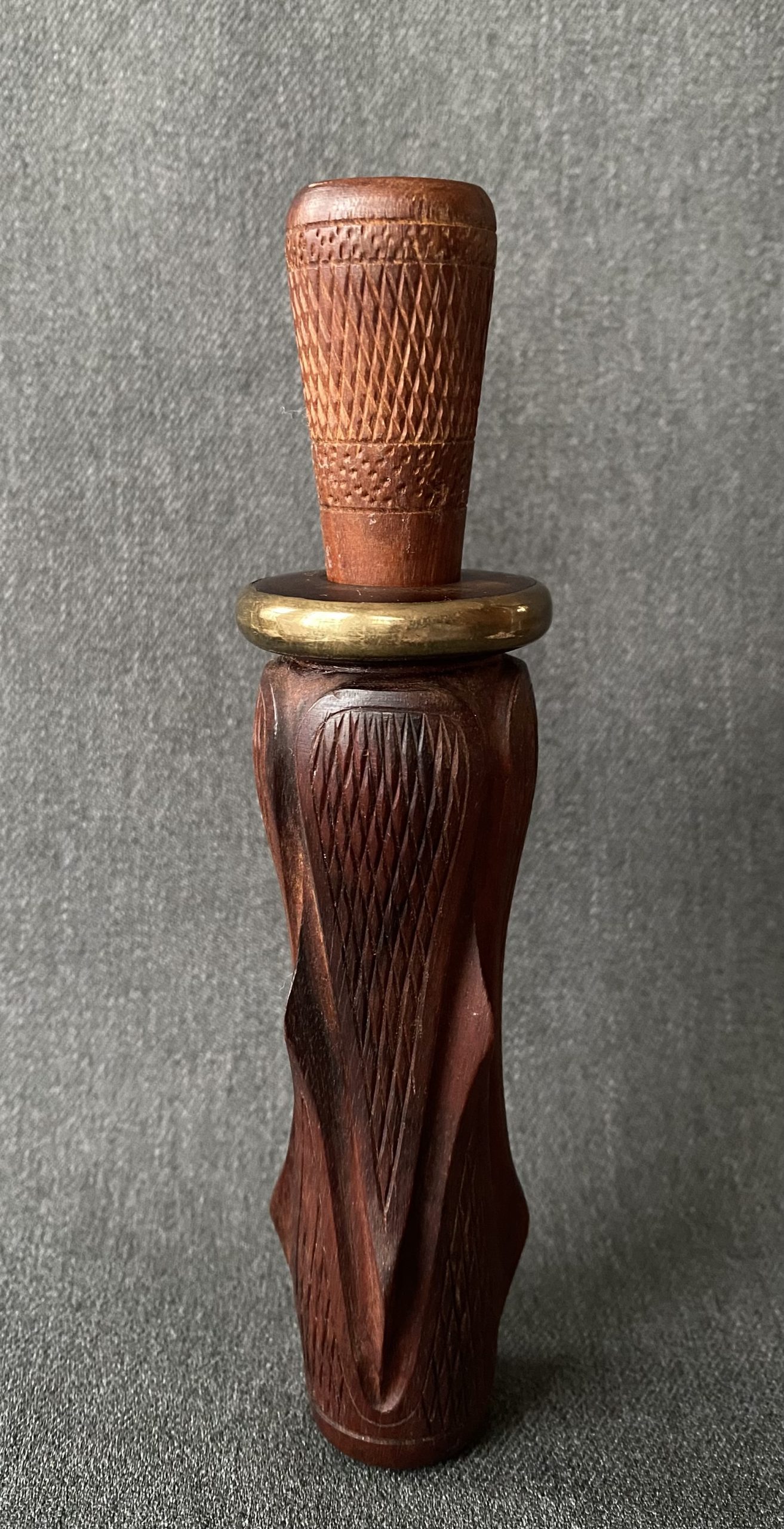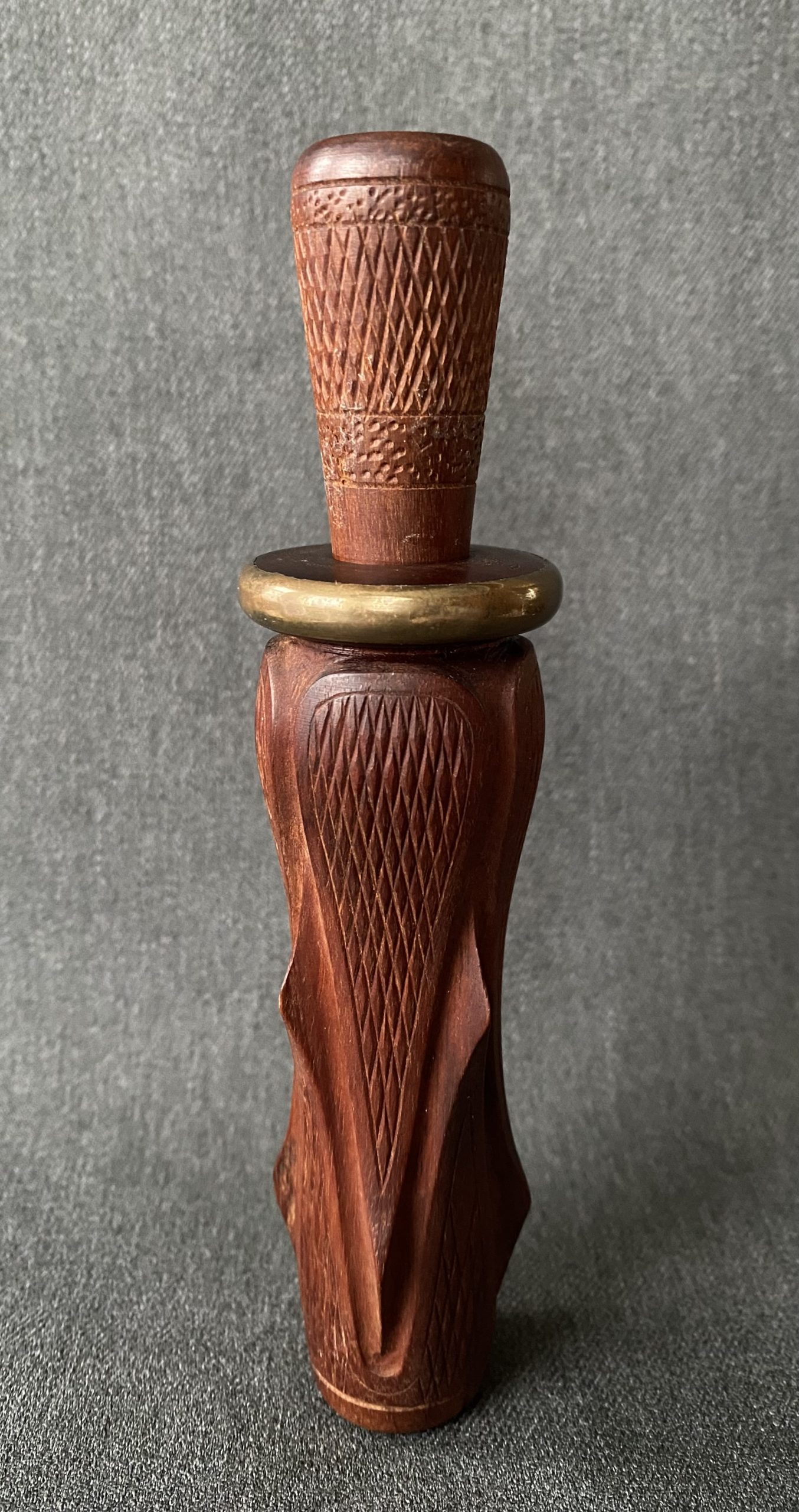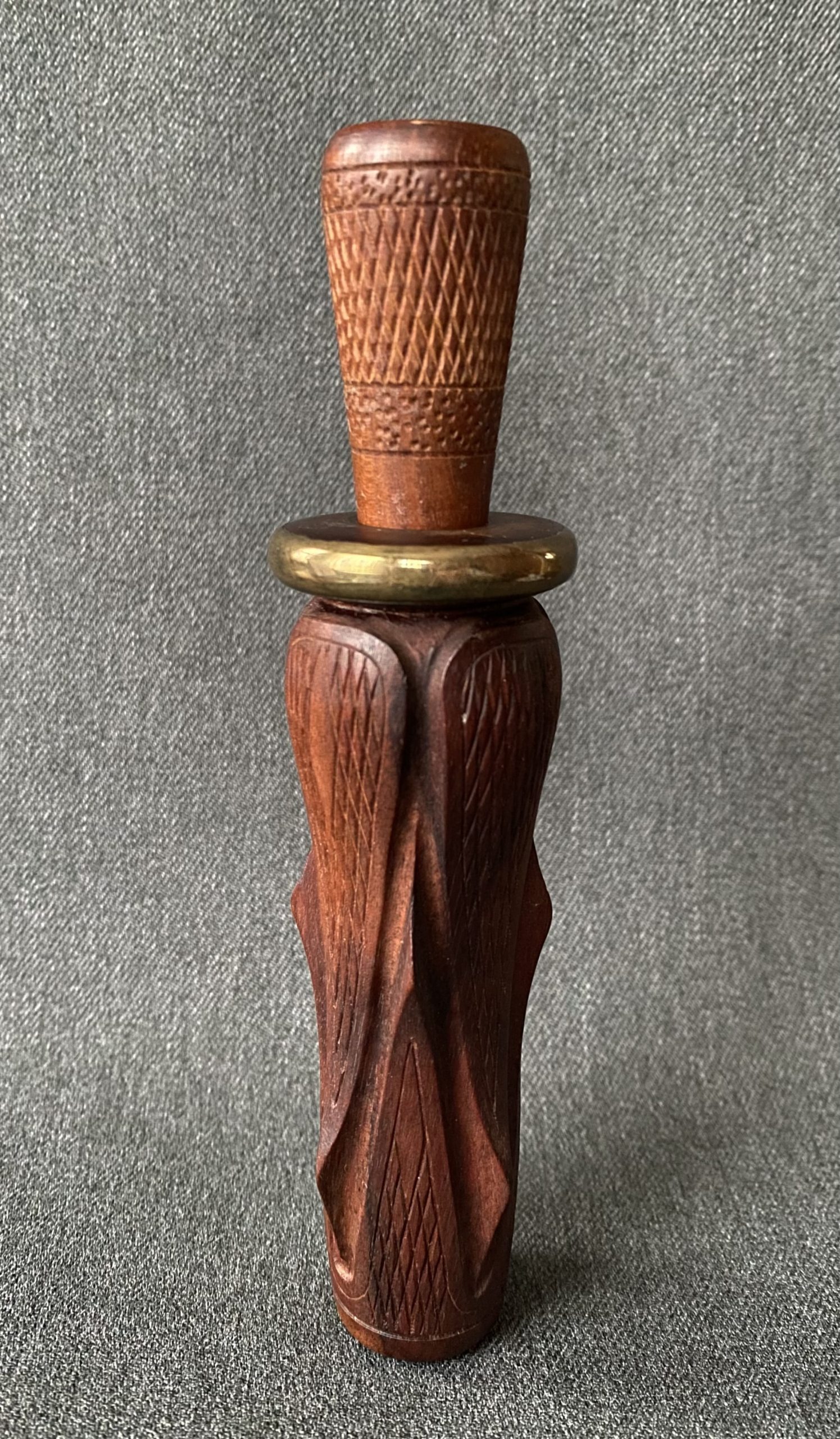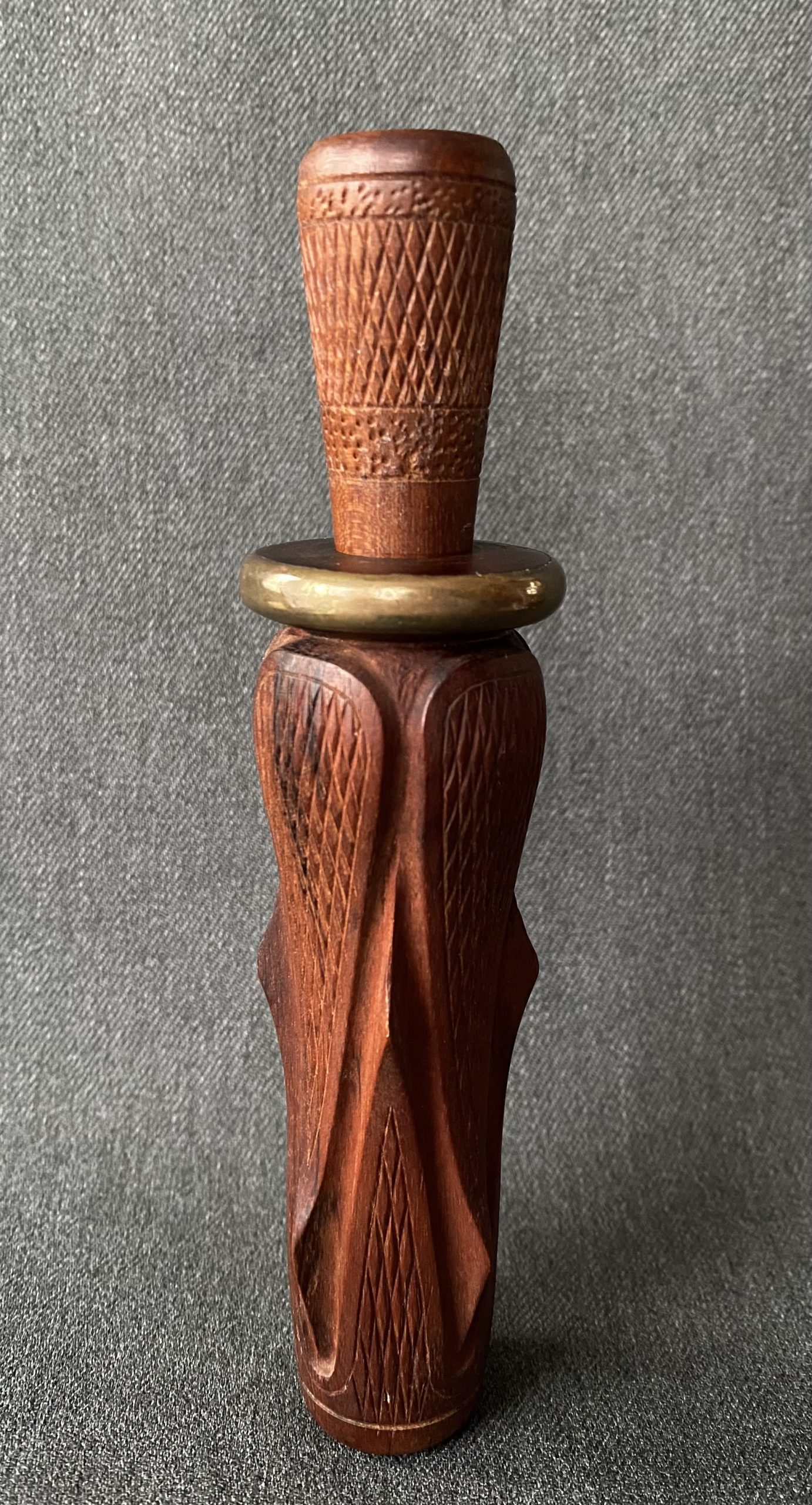 A beautifully, intricately checkered Rosewood call from Everett Baldridge. The call is Arkansas style with a plastic reed and a brass ring around the top of the barrel.