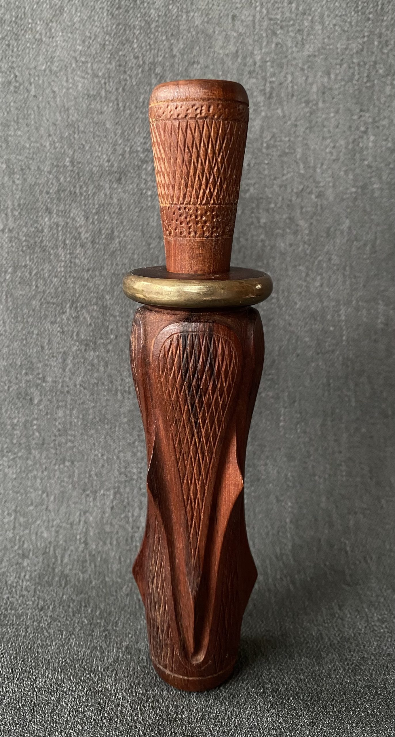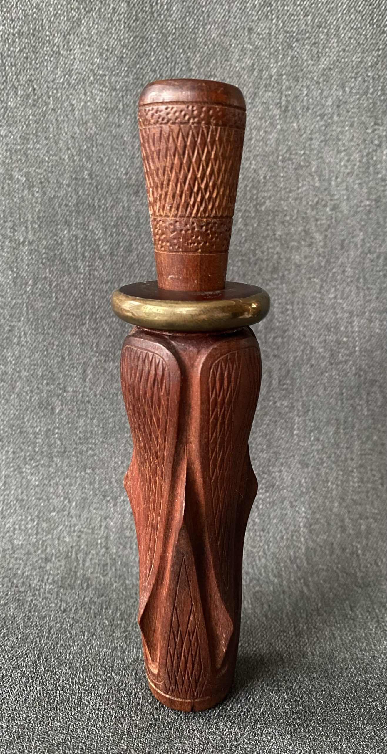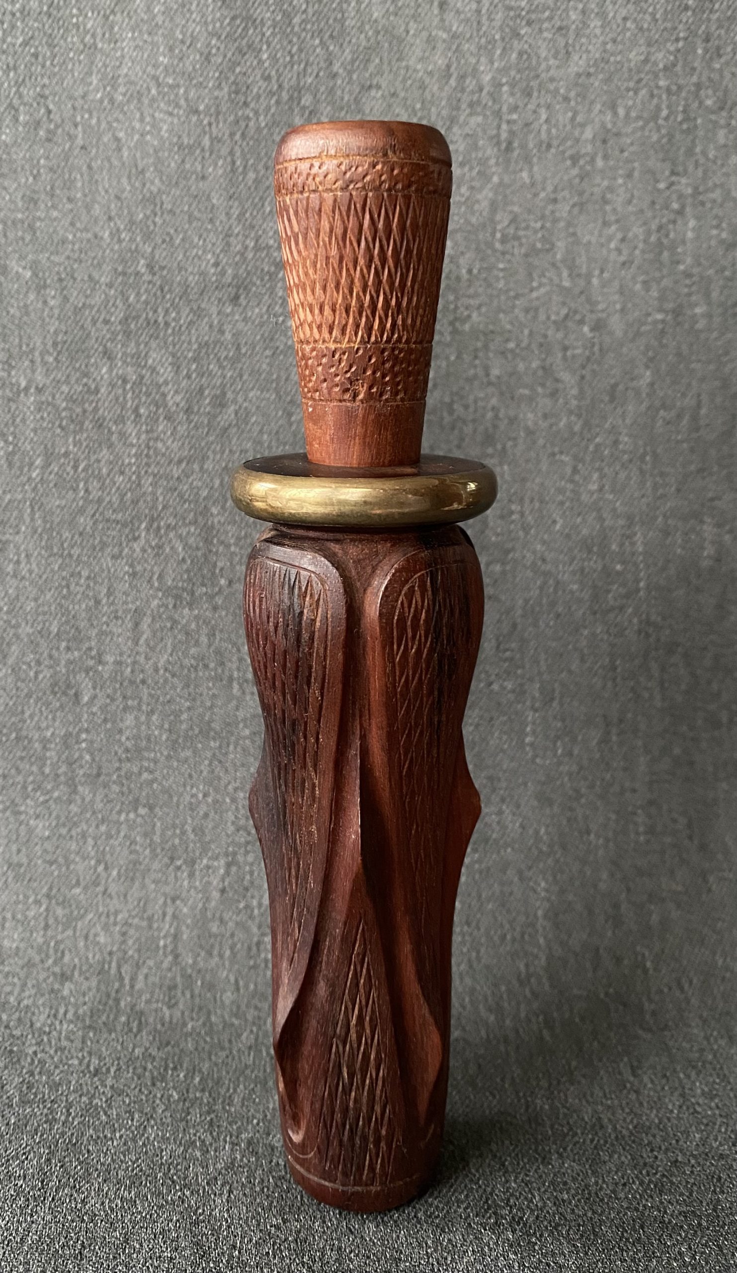 A beautifully, intricately checkered Rosewood call from Everett Baldridge. The call is Arkansas style with a plastic reed and a brass ring around the top of the barrel.