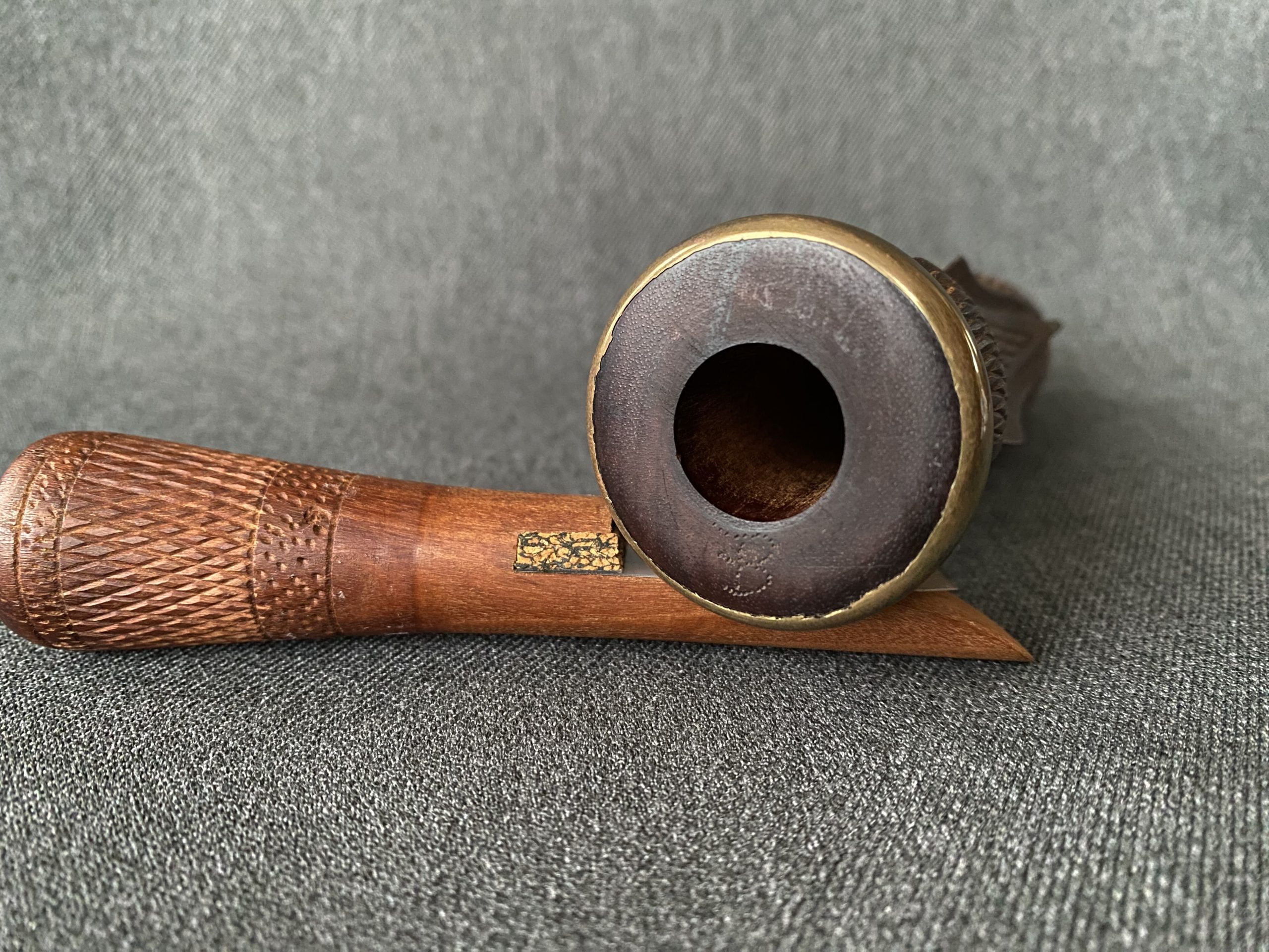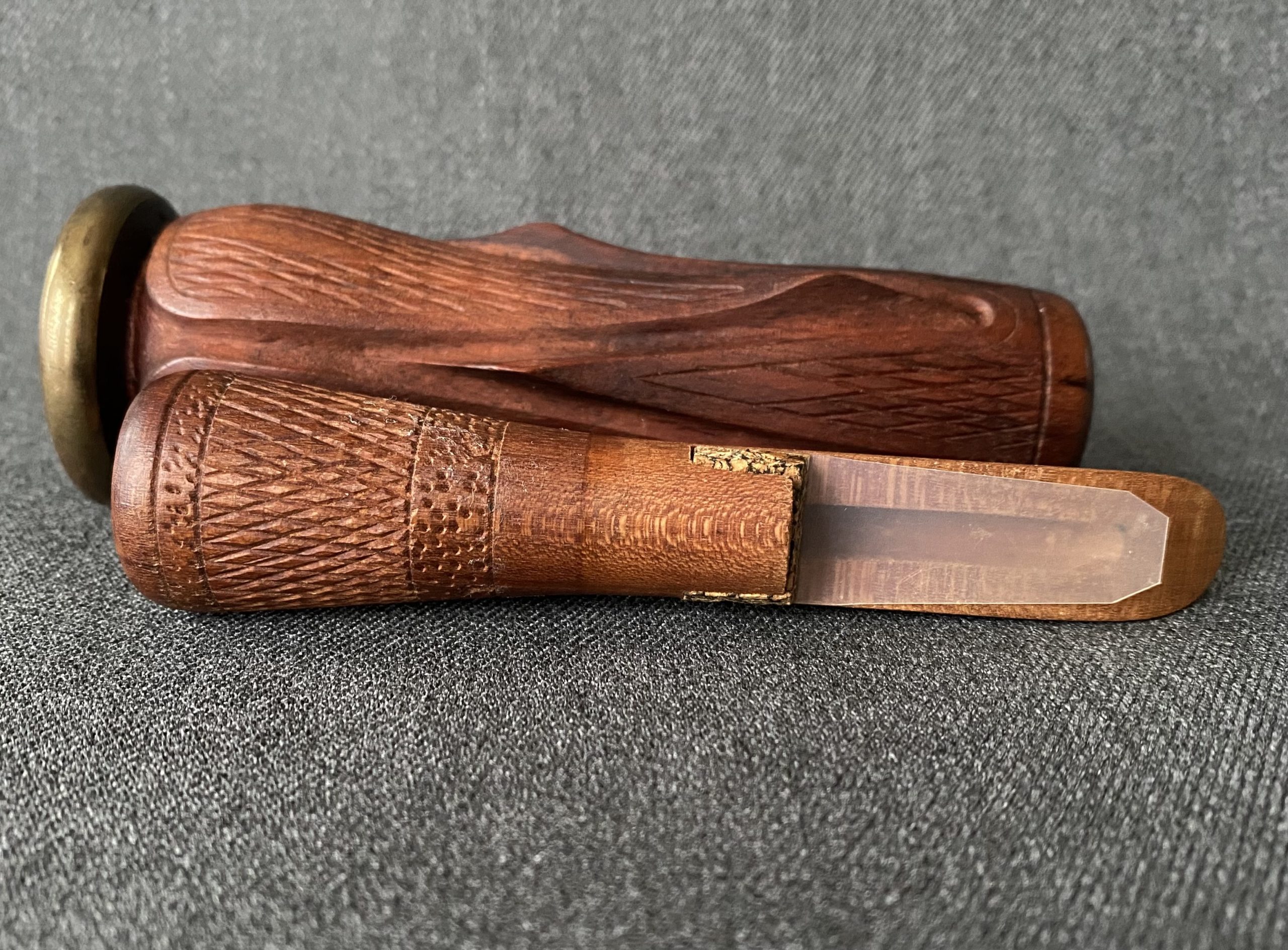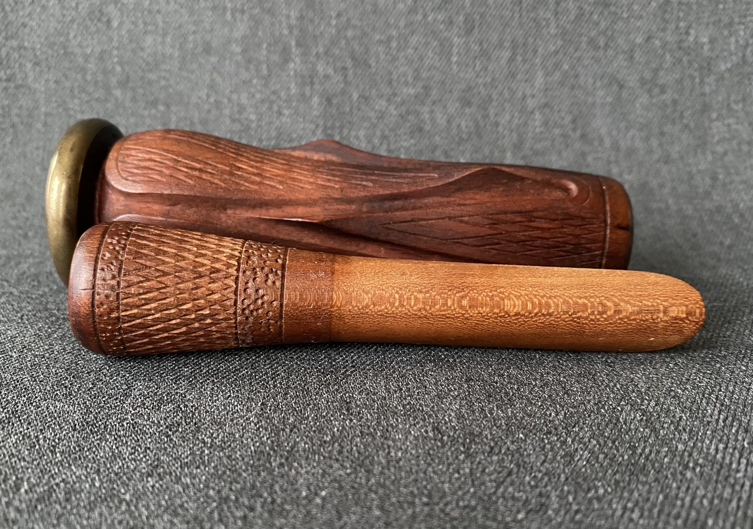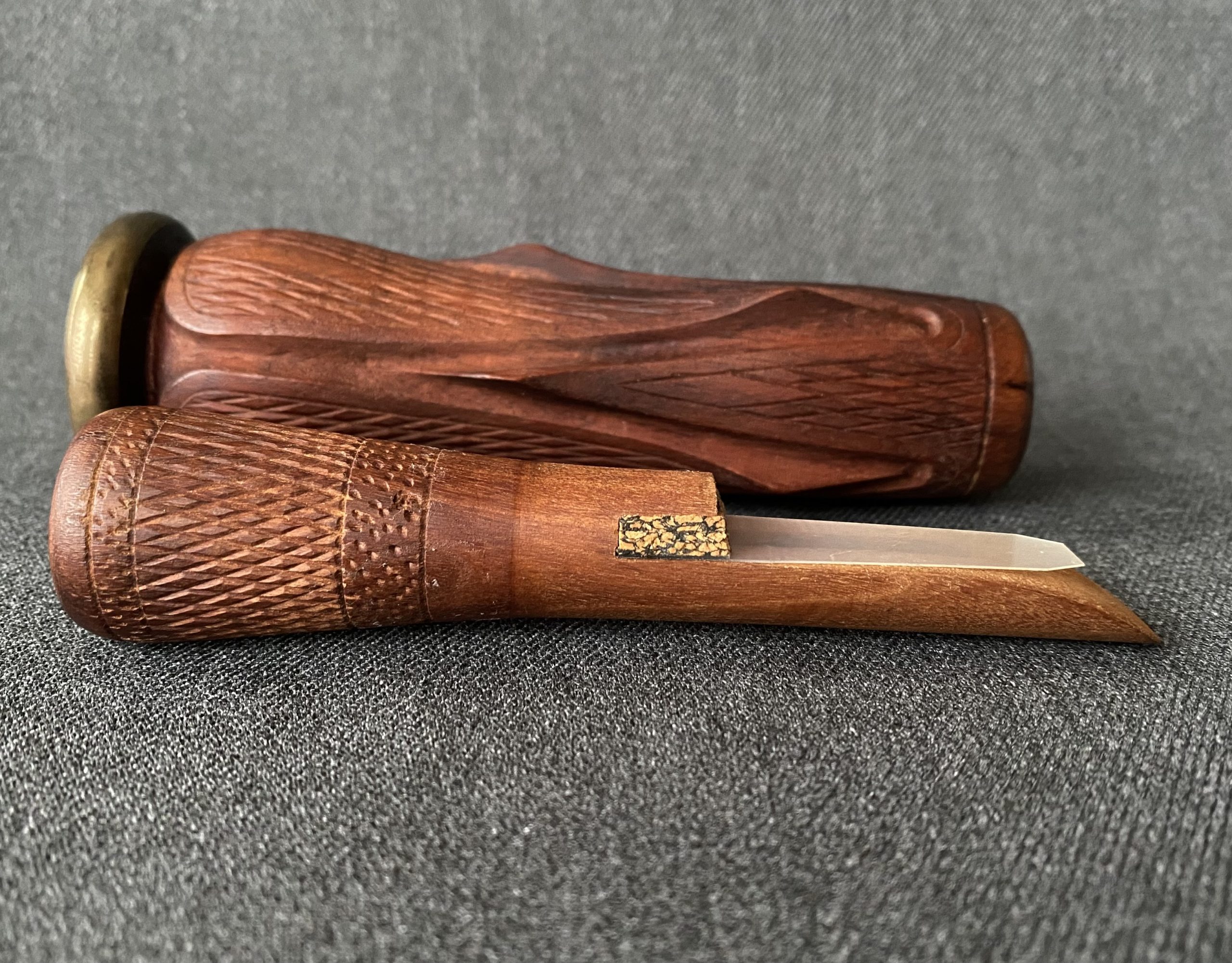 A beautifully, intricately checkered Rosewood call from Everett Baldridge. The call is Arkansas style with a plastic reed and a brass ring around the top of the barrel.
