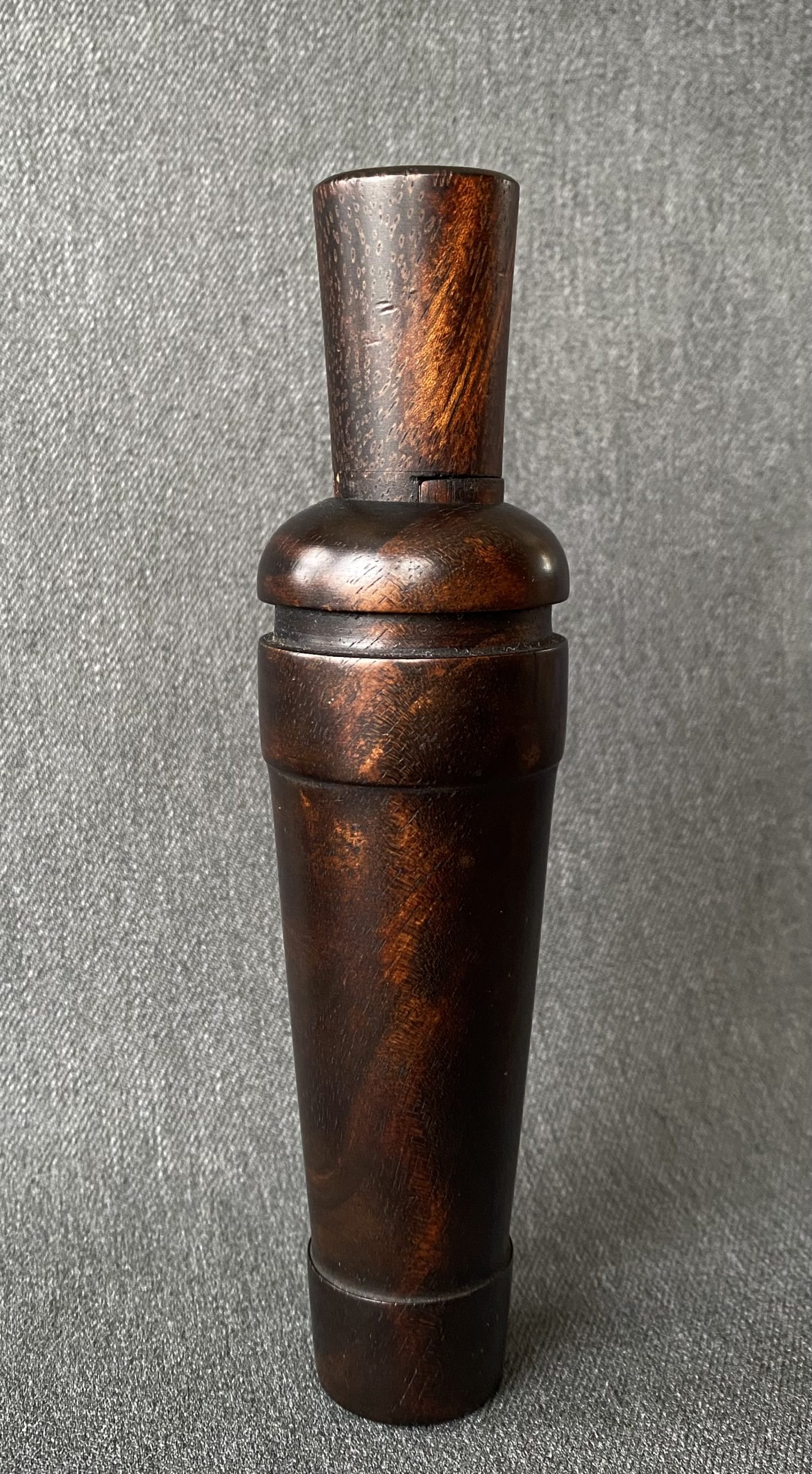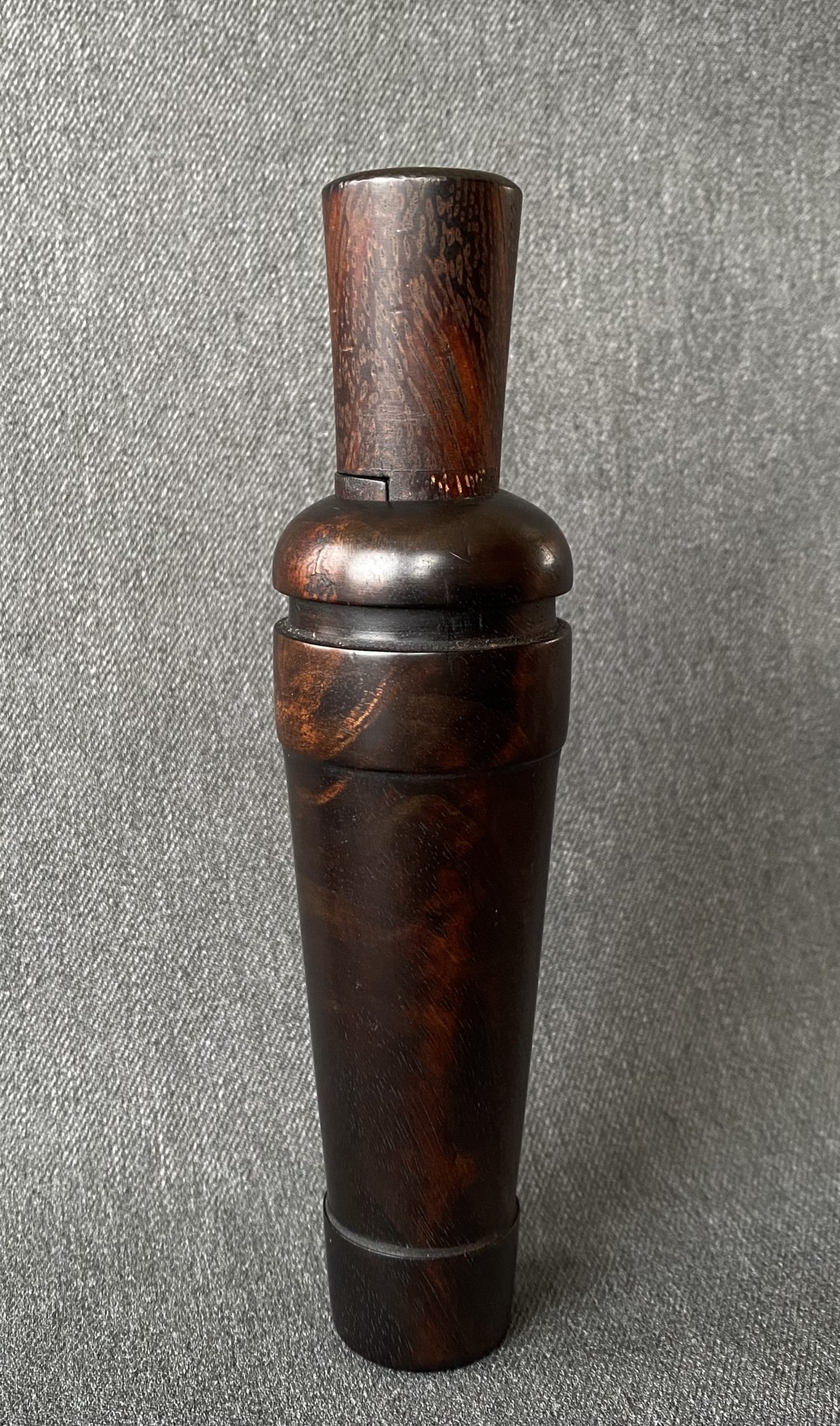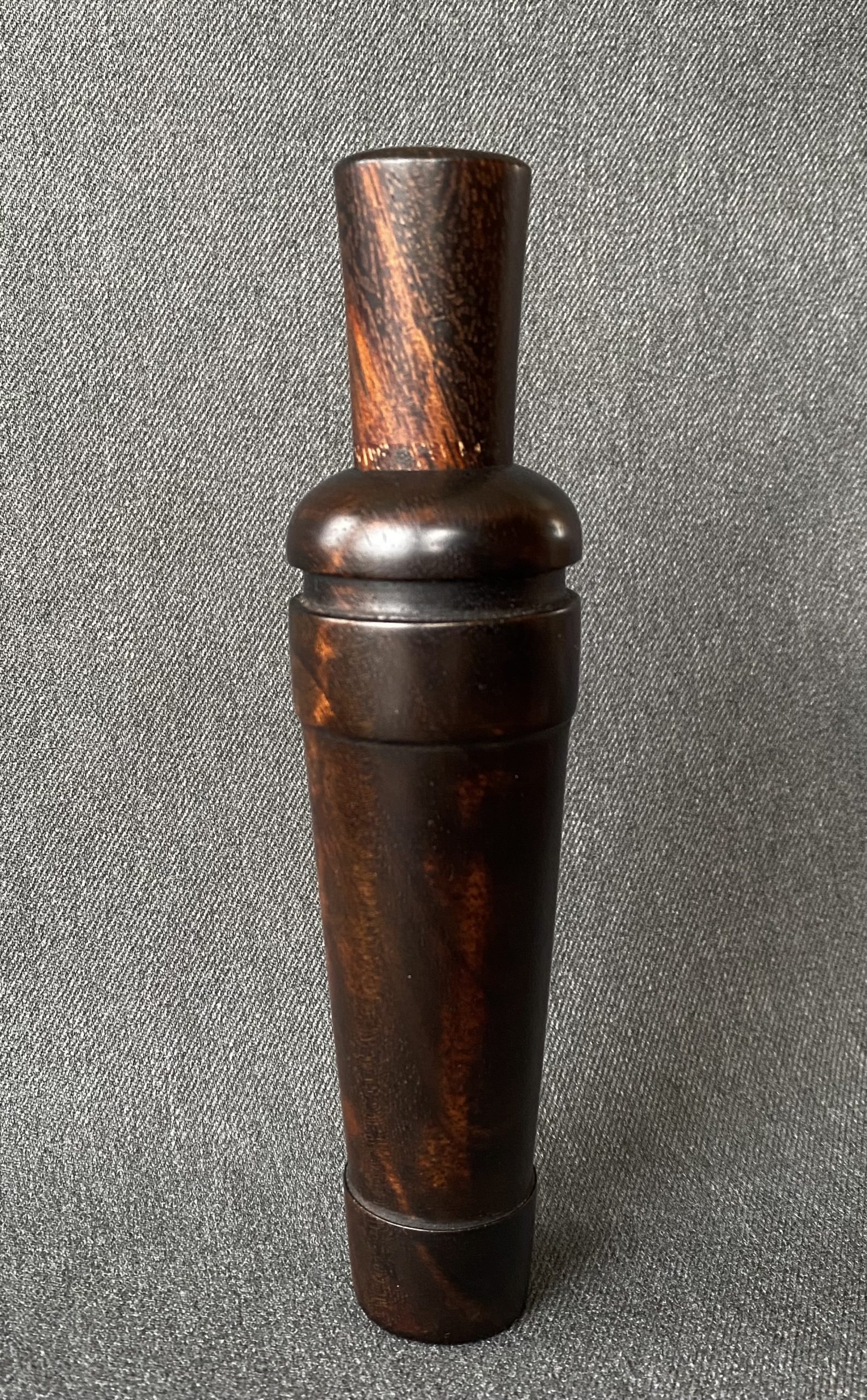 A beautiful, dark burled walnut call from Bill Barnett. The call is Reelfoot style with a copper reed. The call has a nice smooth feel in the hand.