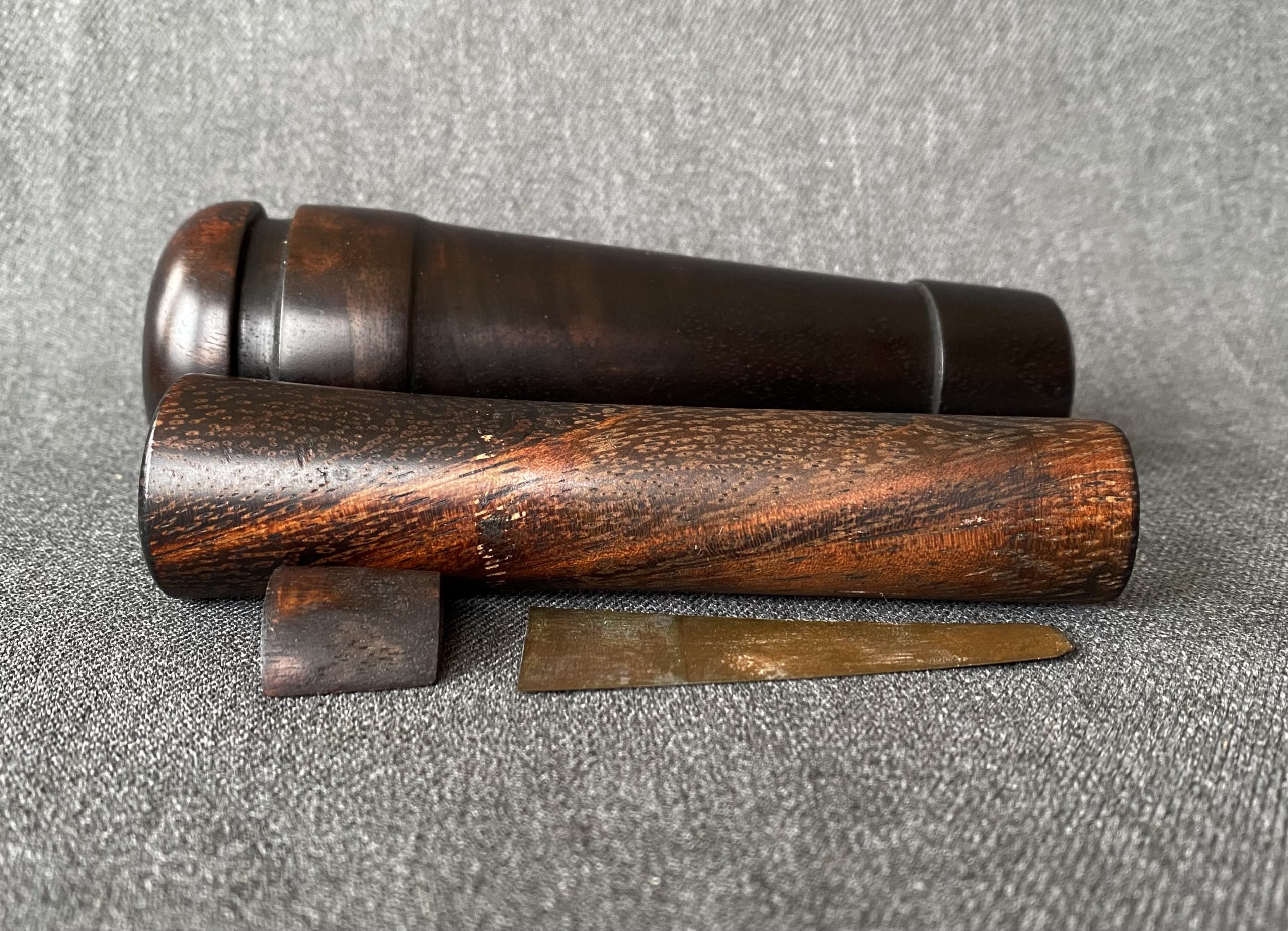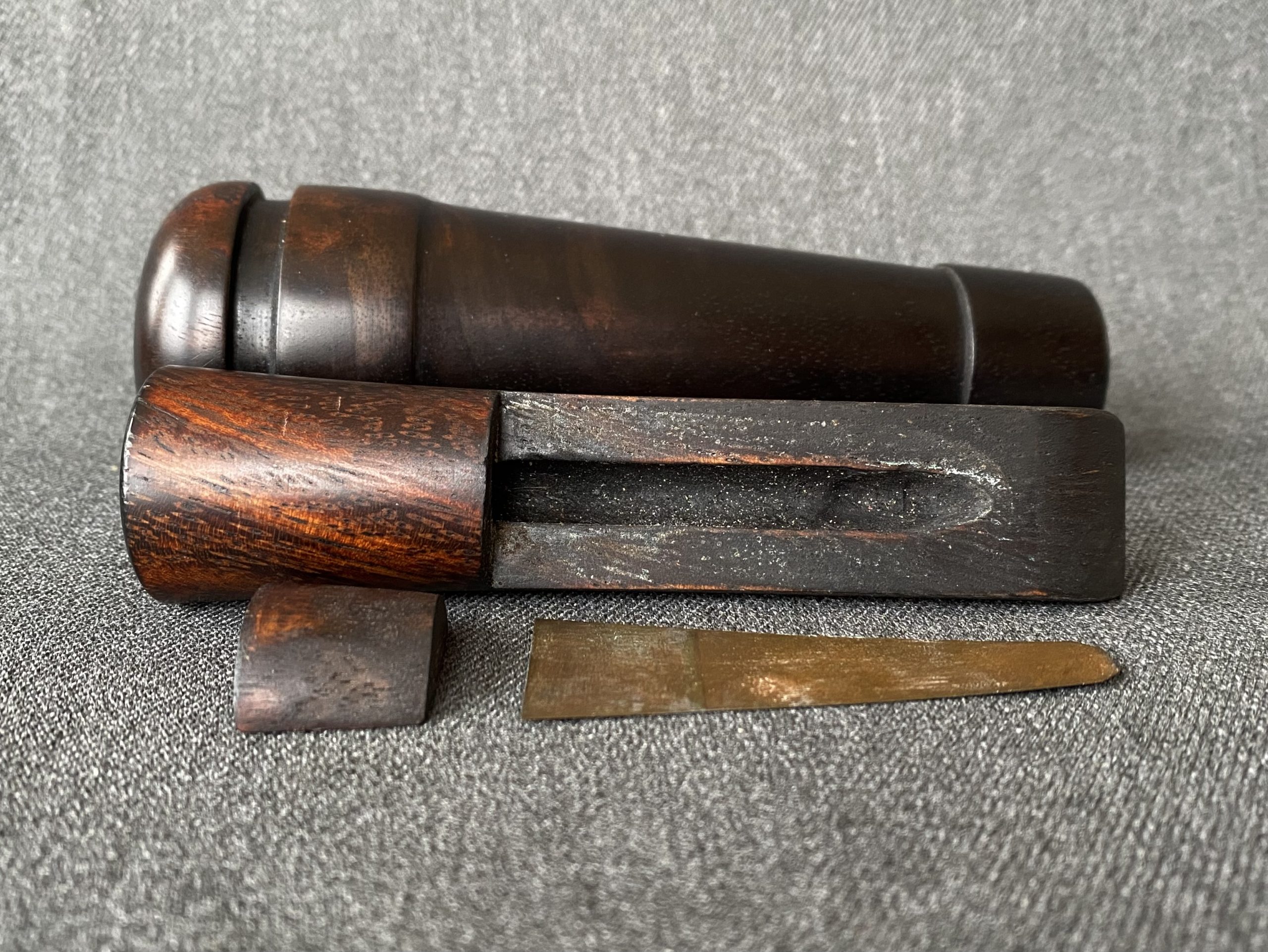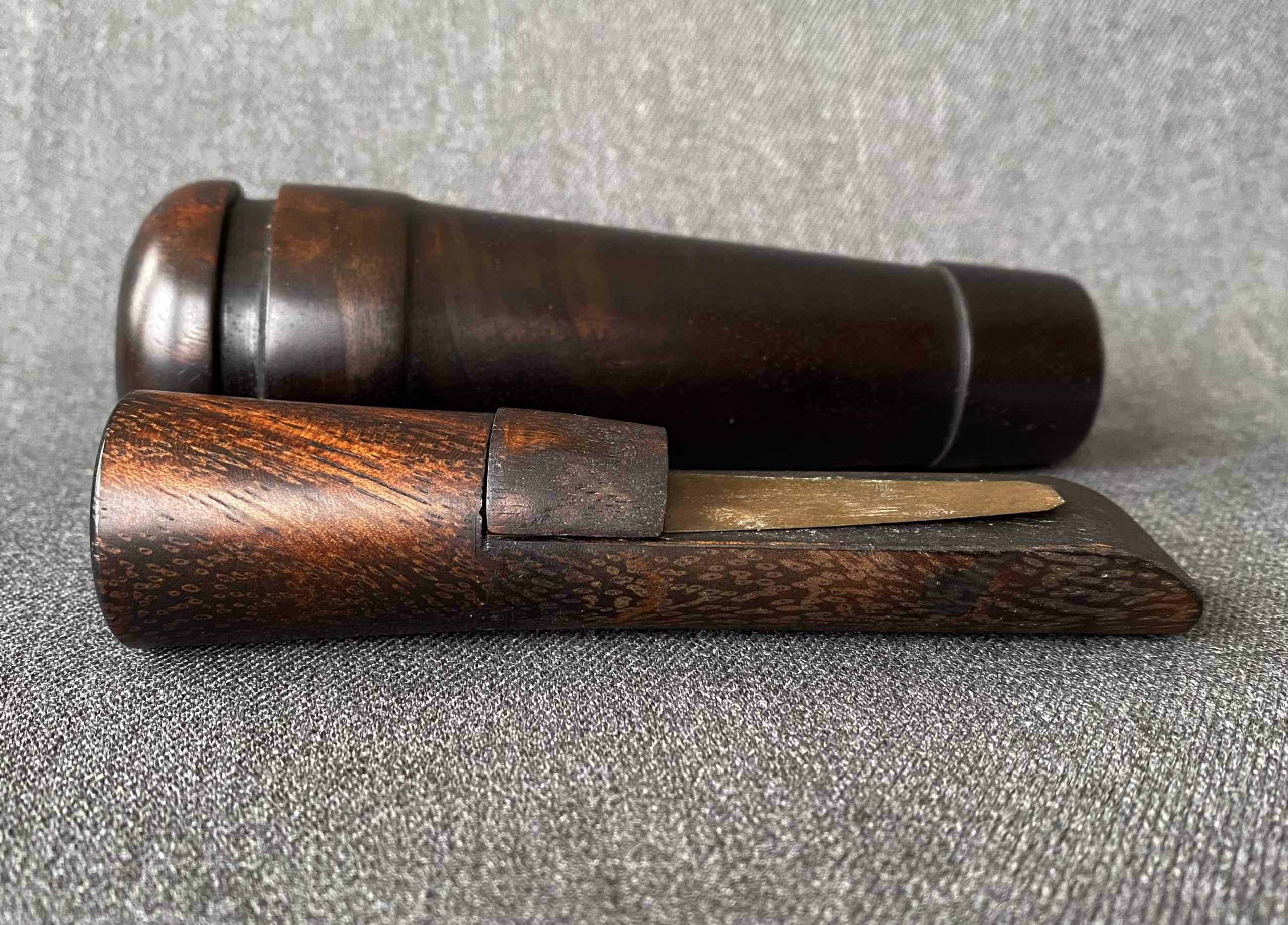 A beautiful, dark burled walnut call from Bill Barnett. The call is Reelfoot style with a copper reed. The call has a nice smooth feel in the hand.