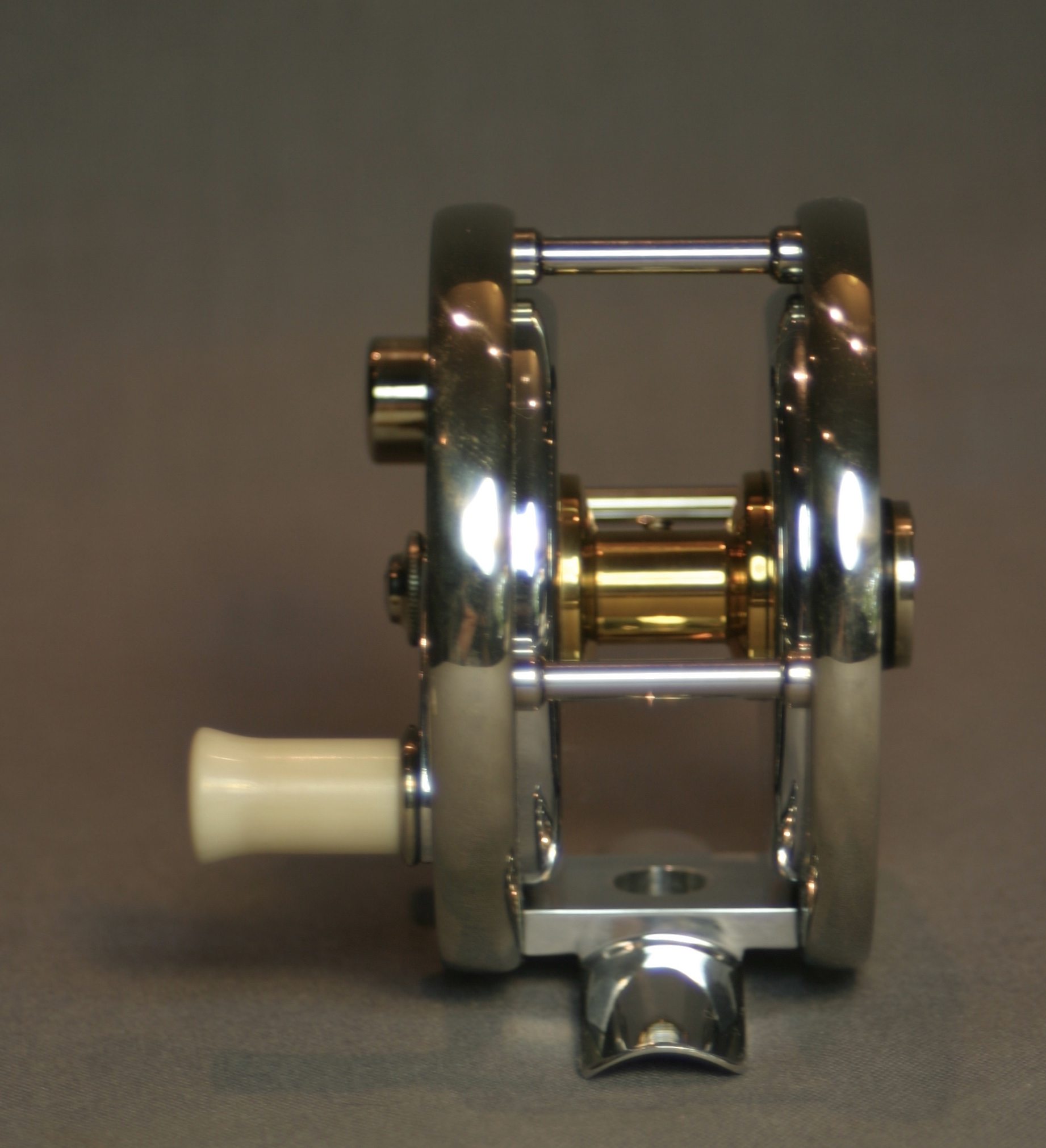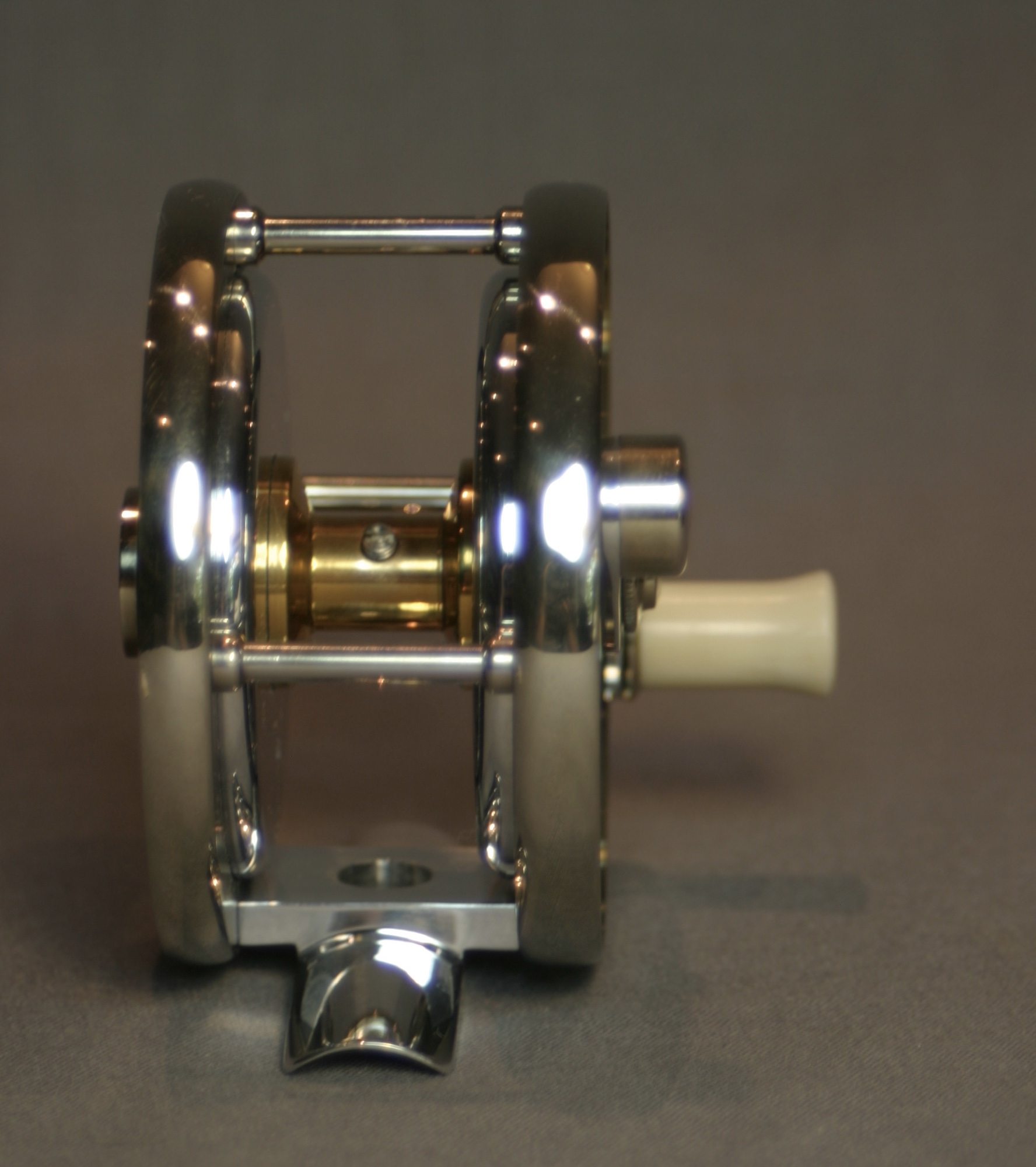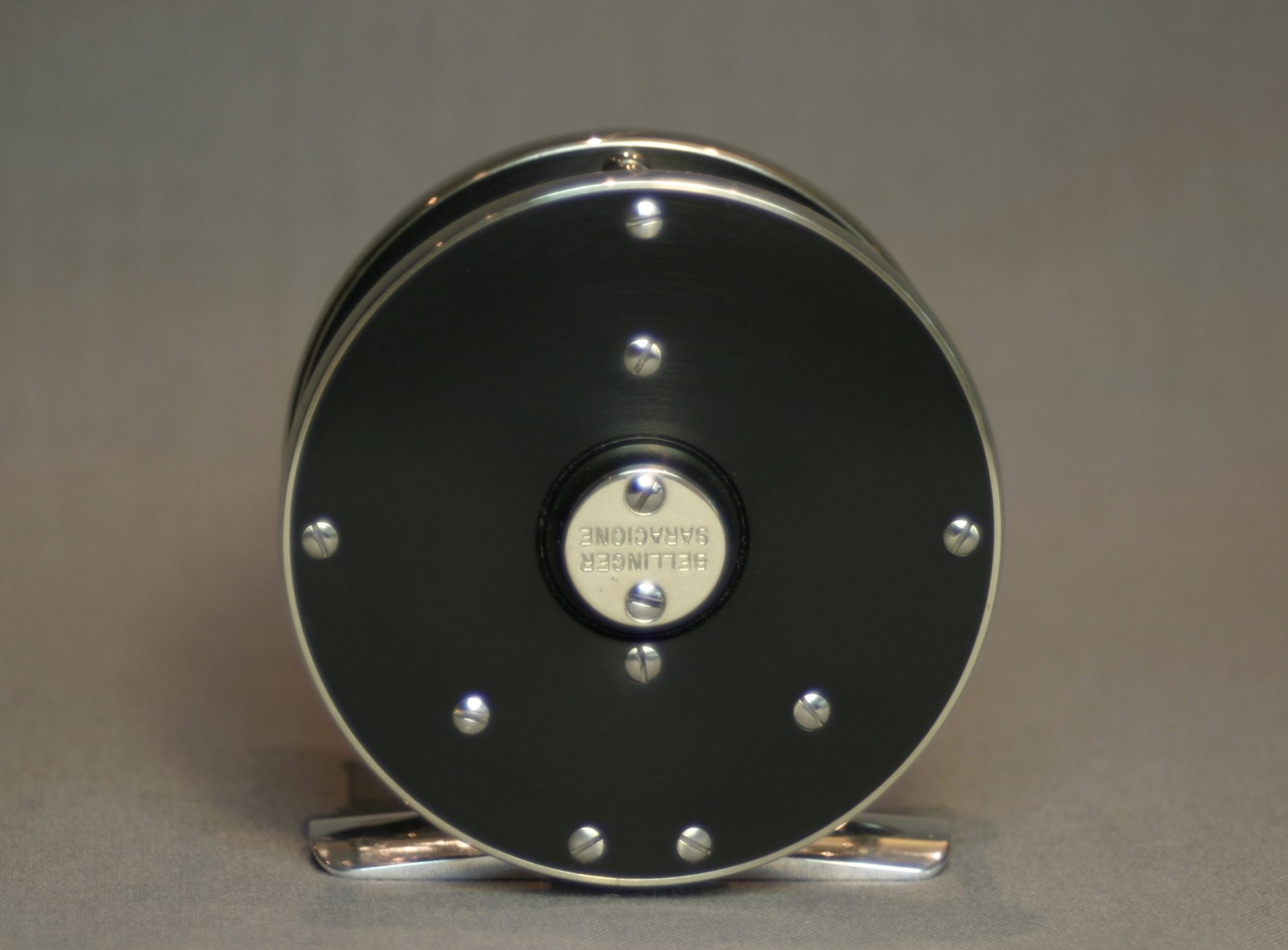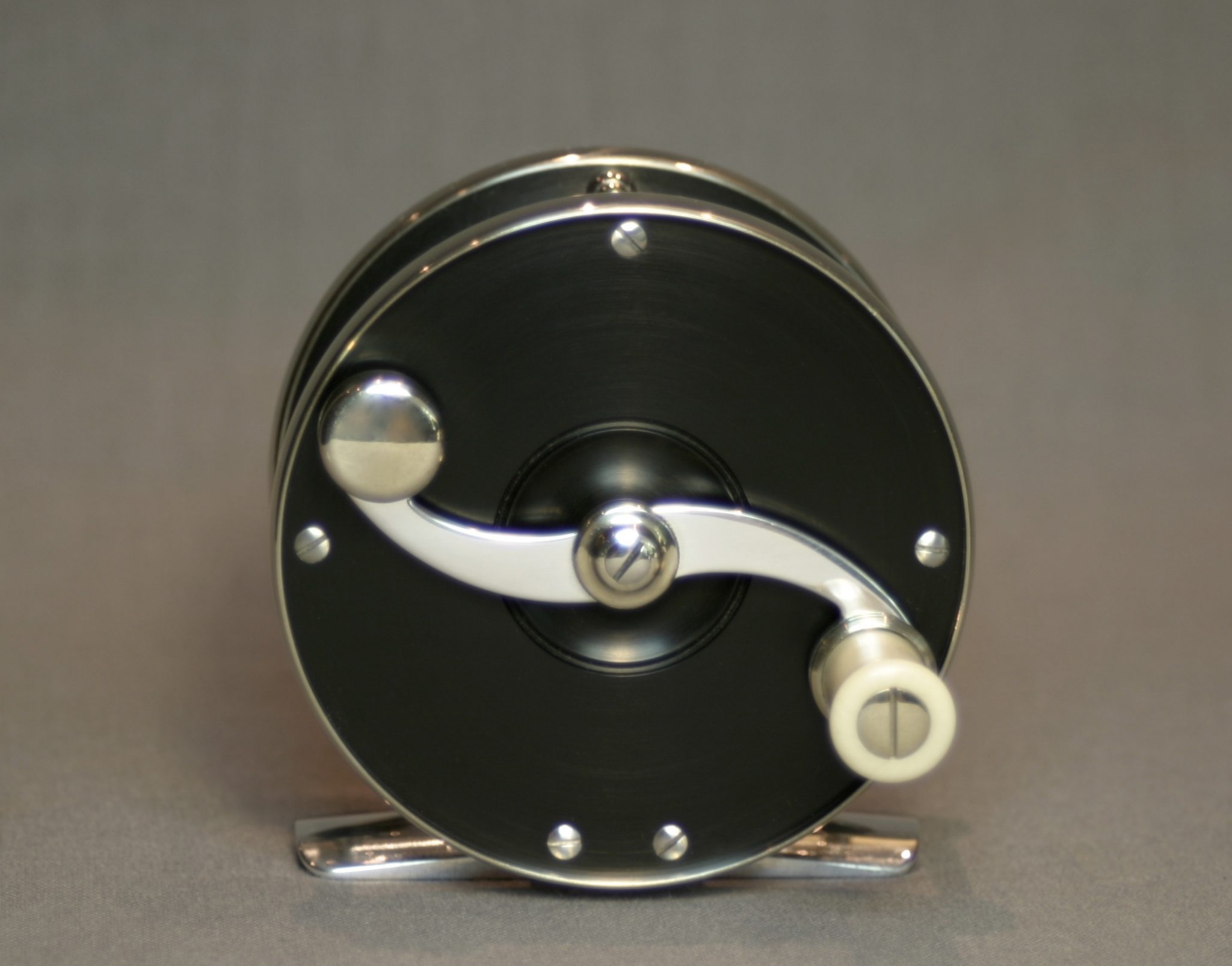 A small, mint condition trout reel from Saracione. The reel has highly polished nikel hardware and slightly matte finish to the hard Ebonite rubber sides.