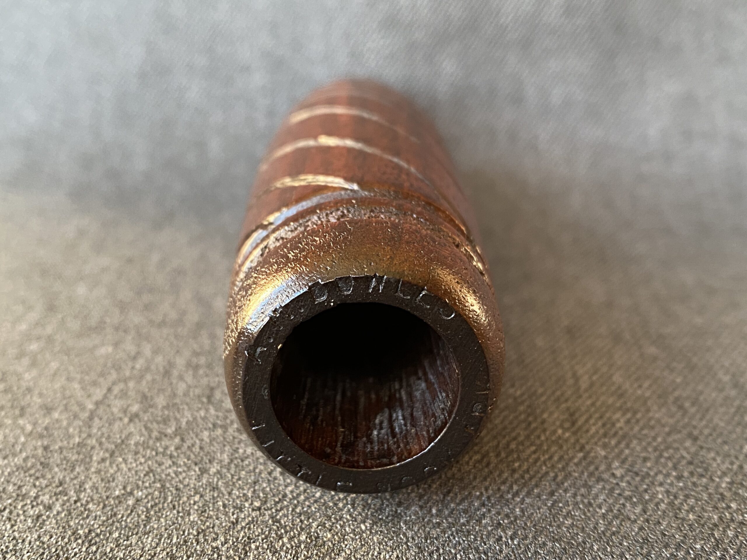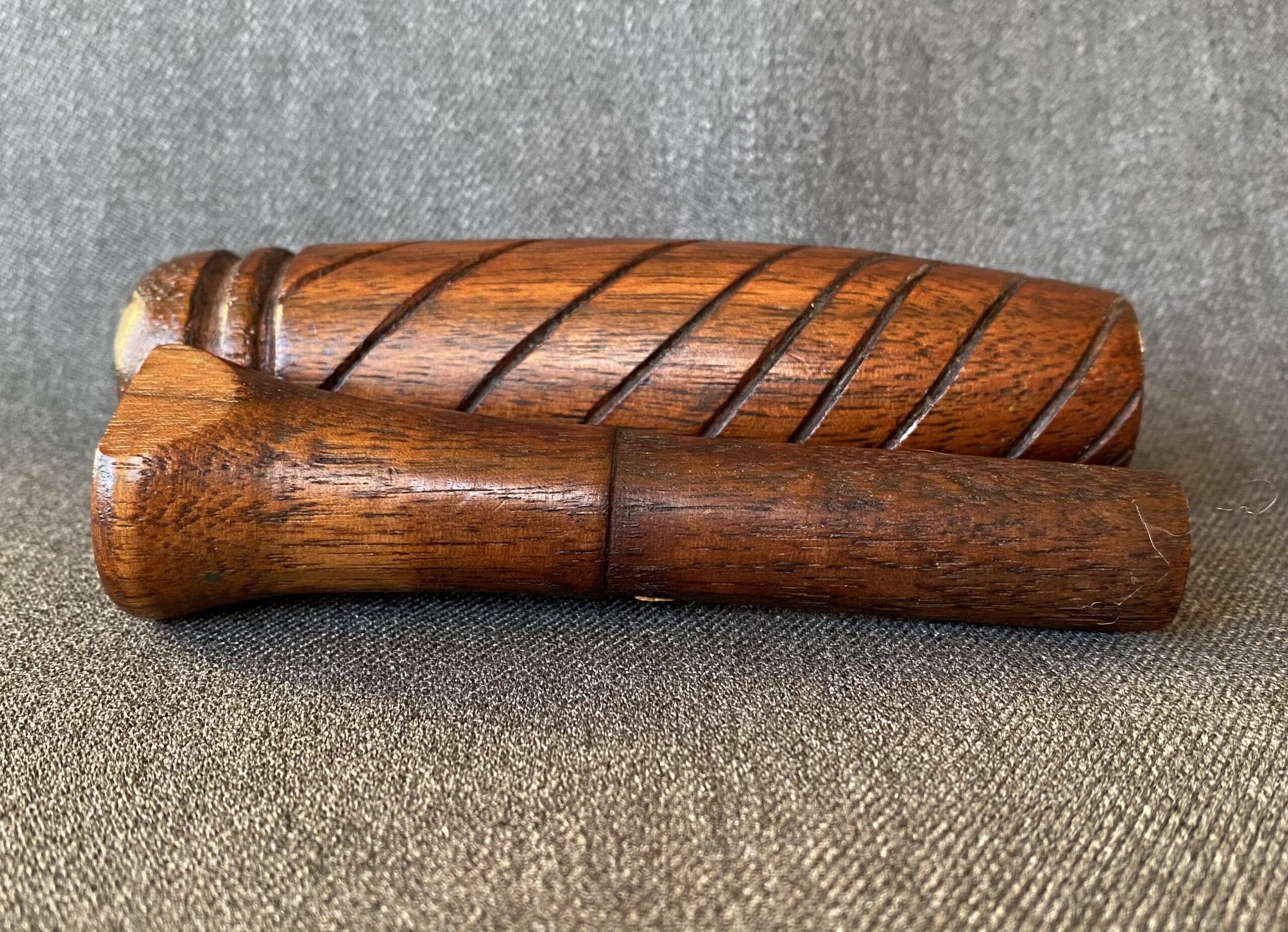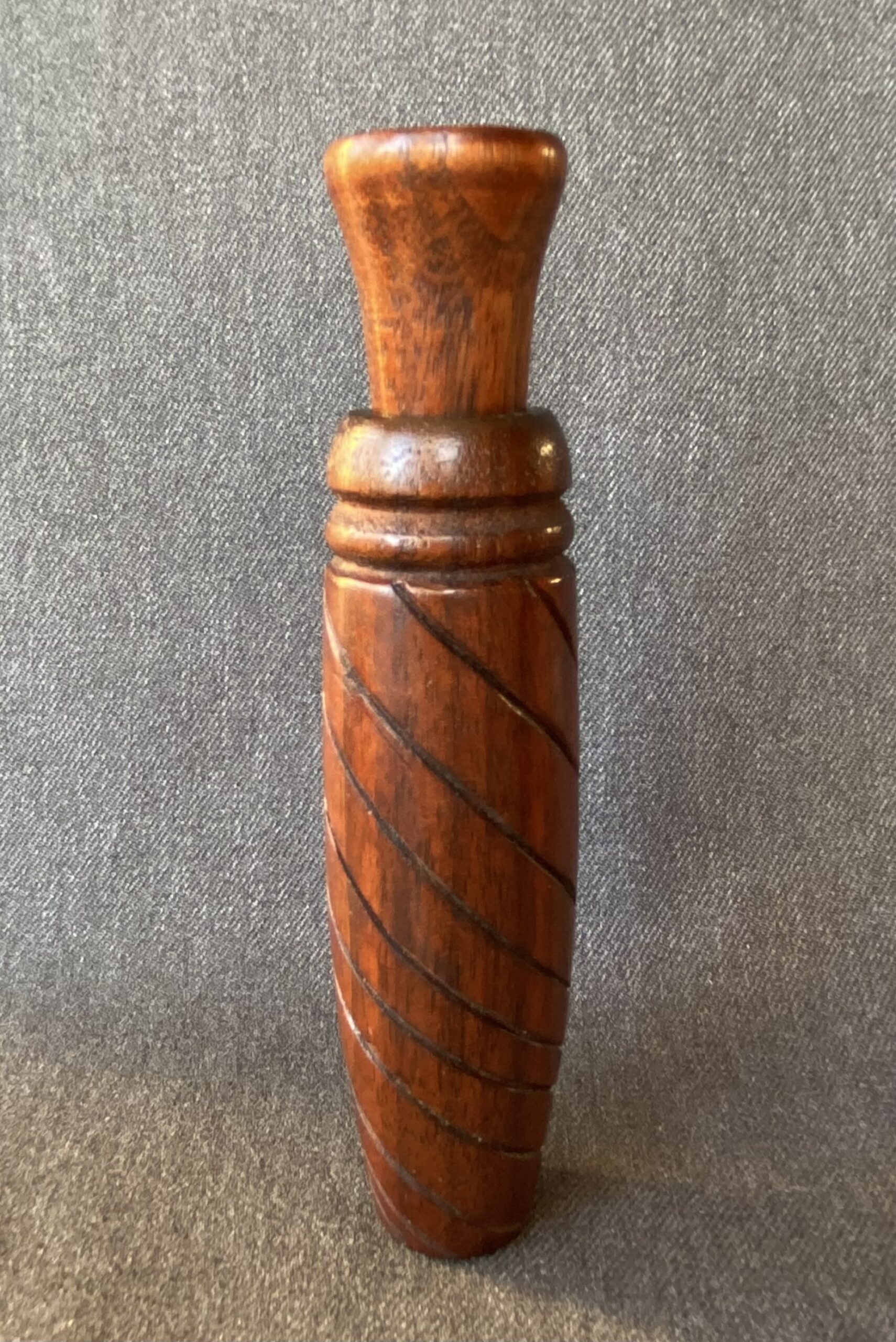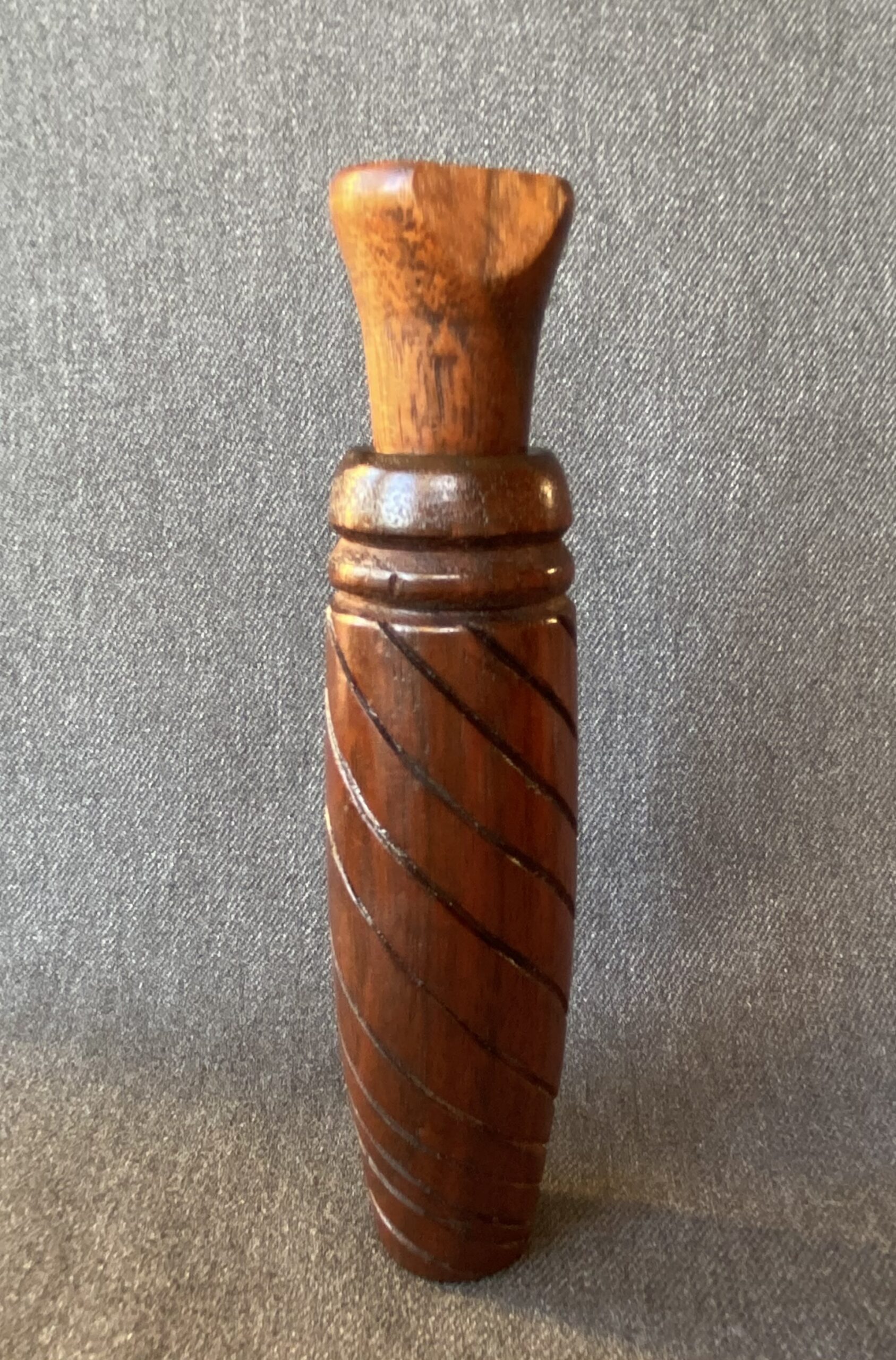 This is a nice, uniquely carved call from A.M. Bowles. The call is Arkansas style with a black plastic reed. It is carved from walnut and has a lacquer finish.