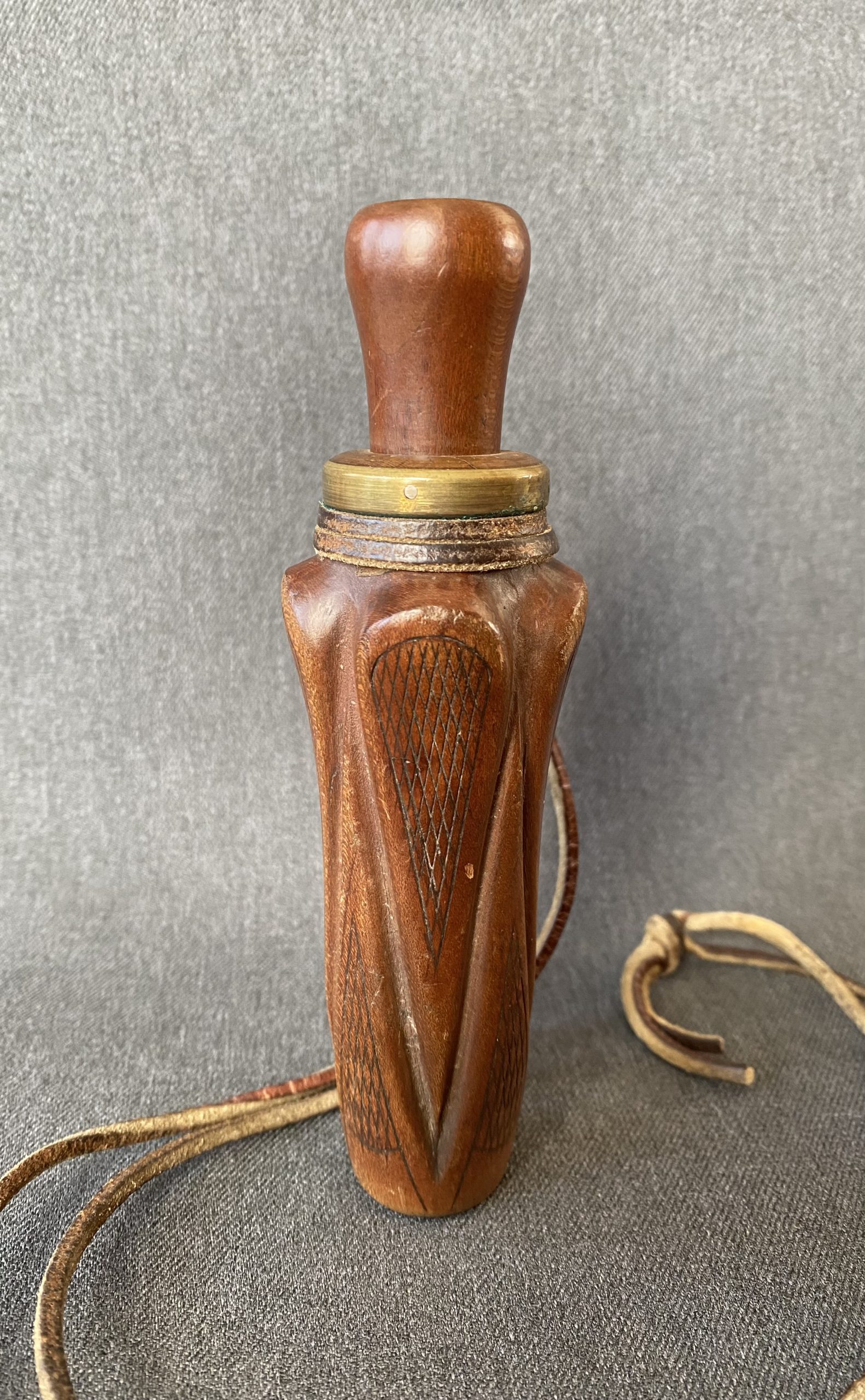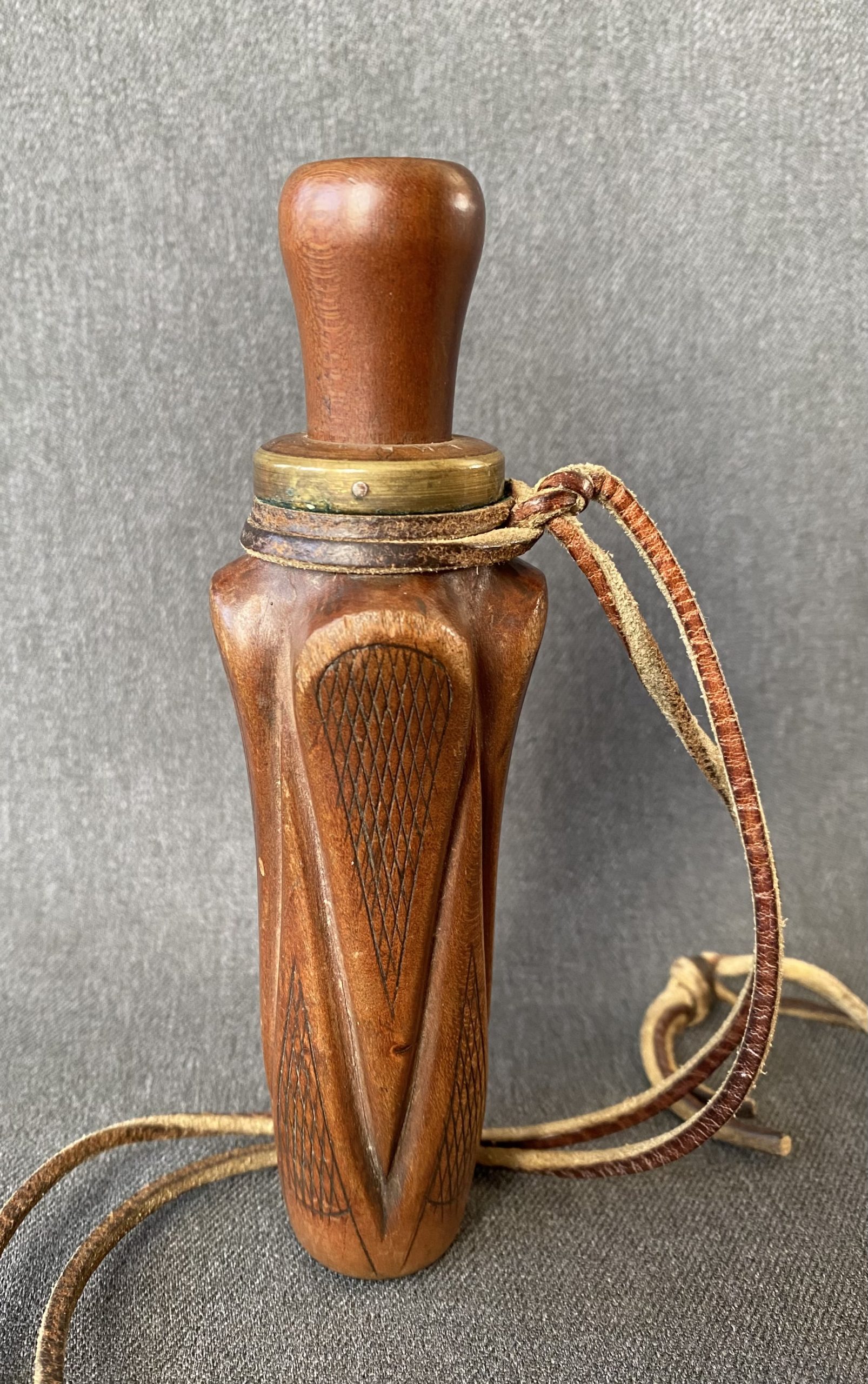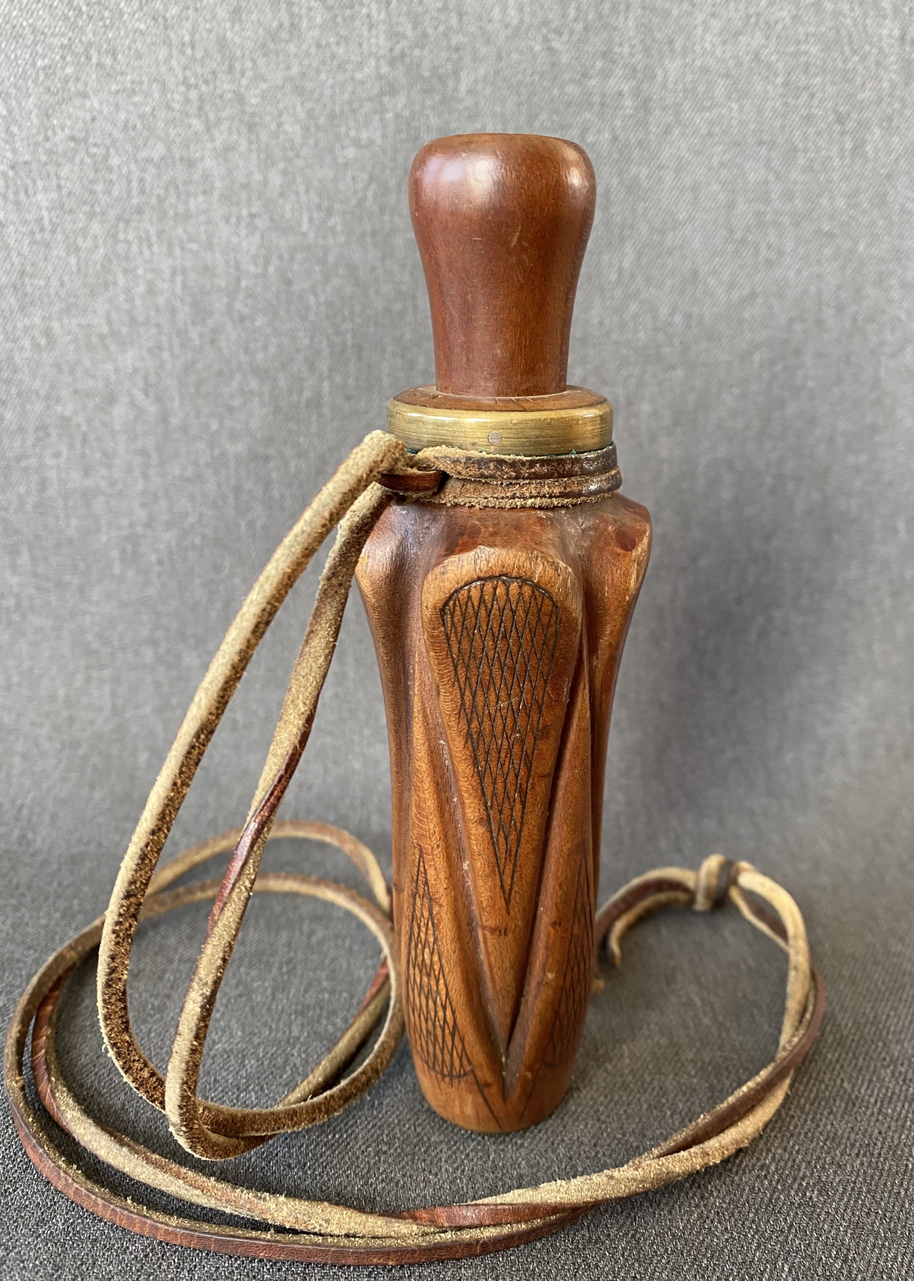 A very nice old Arkansas style checkered call from A.M. Bowles. The call has four larger checkered panels and four smaller panels. It has a brass band and is stamped A.M. Bowles Little Rock Ark
