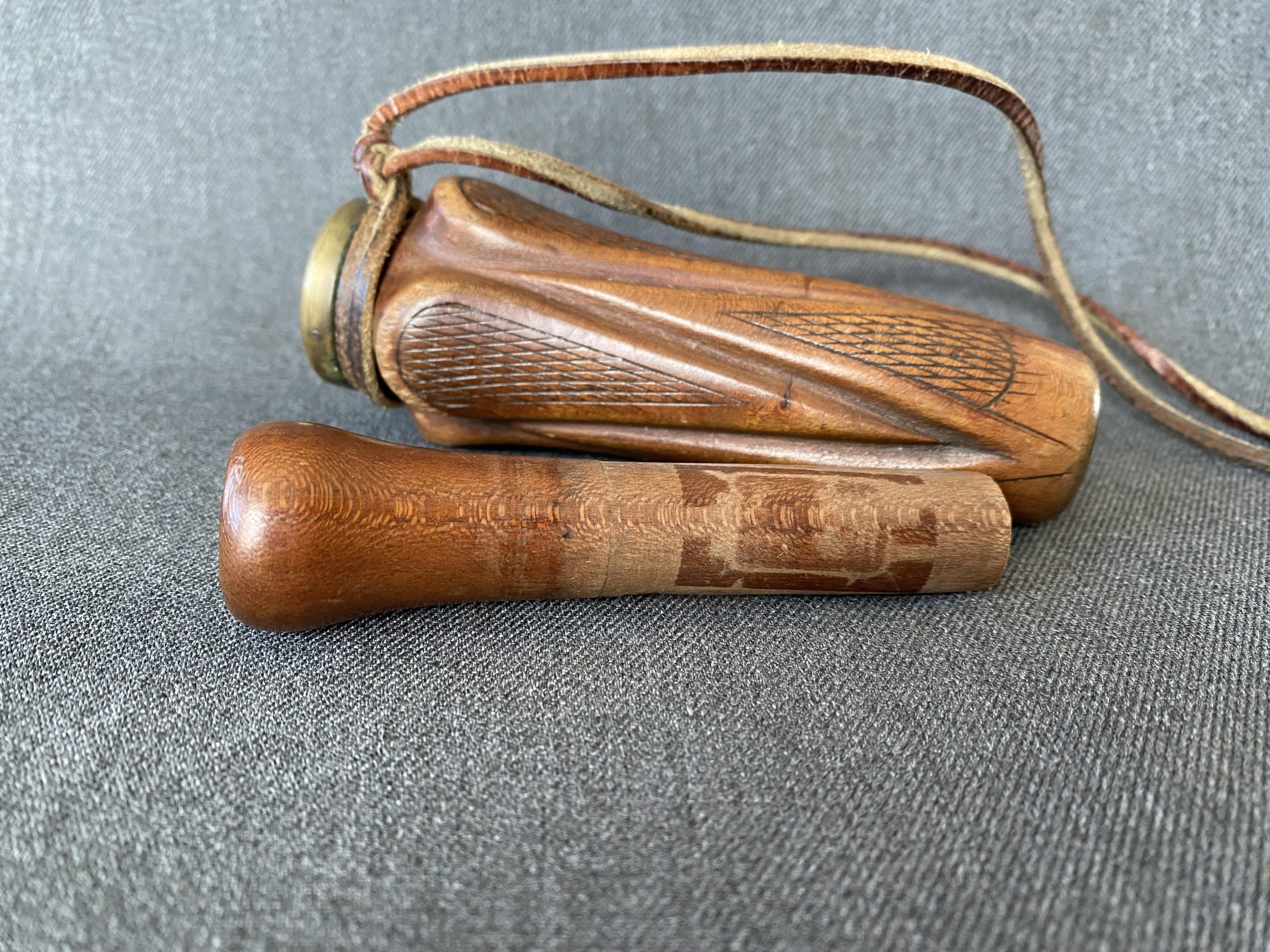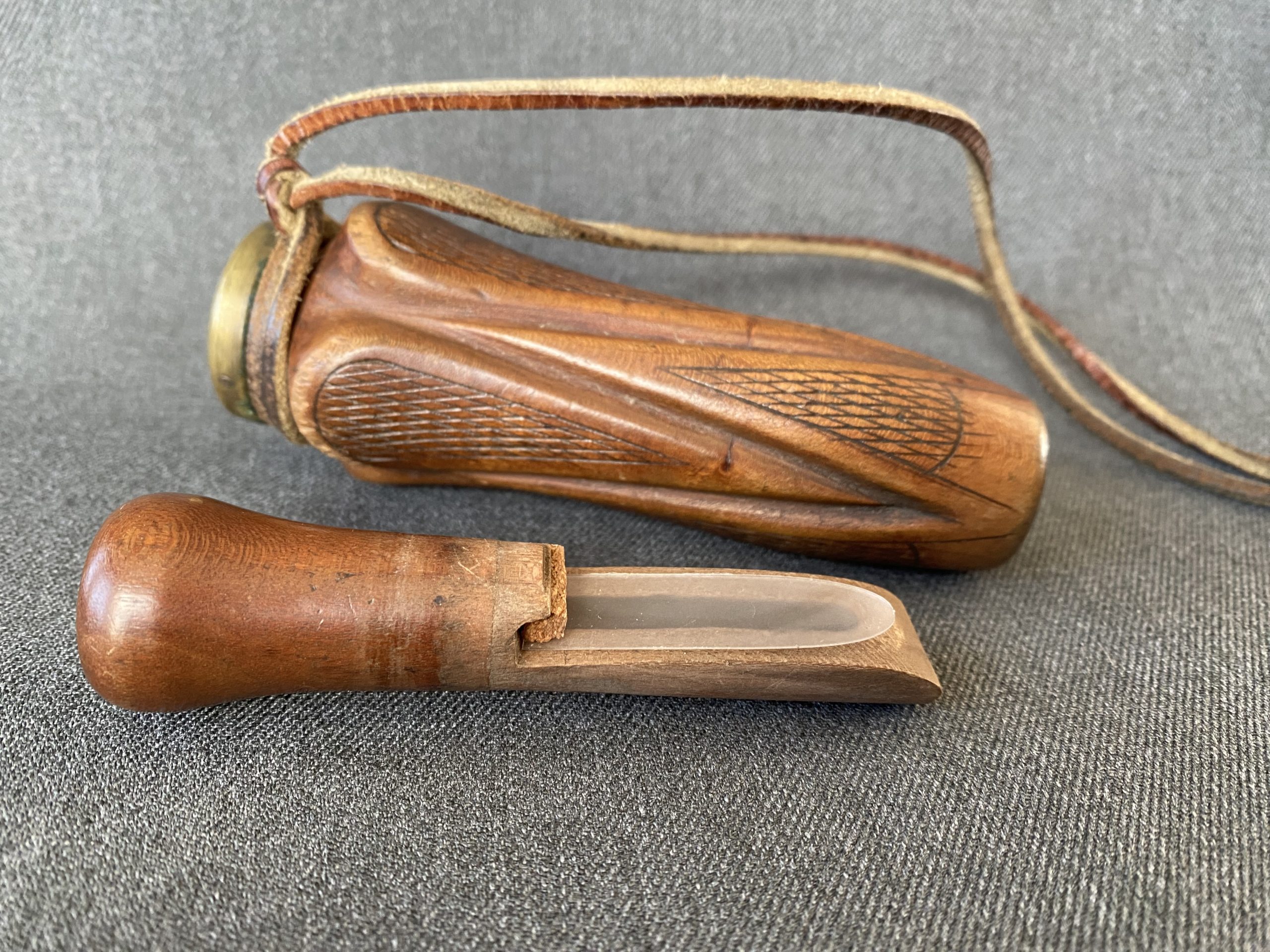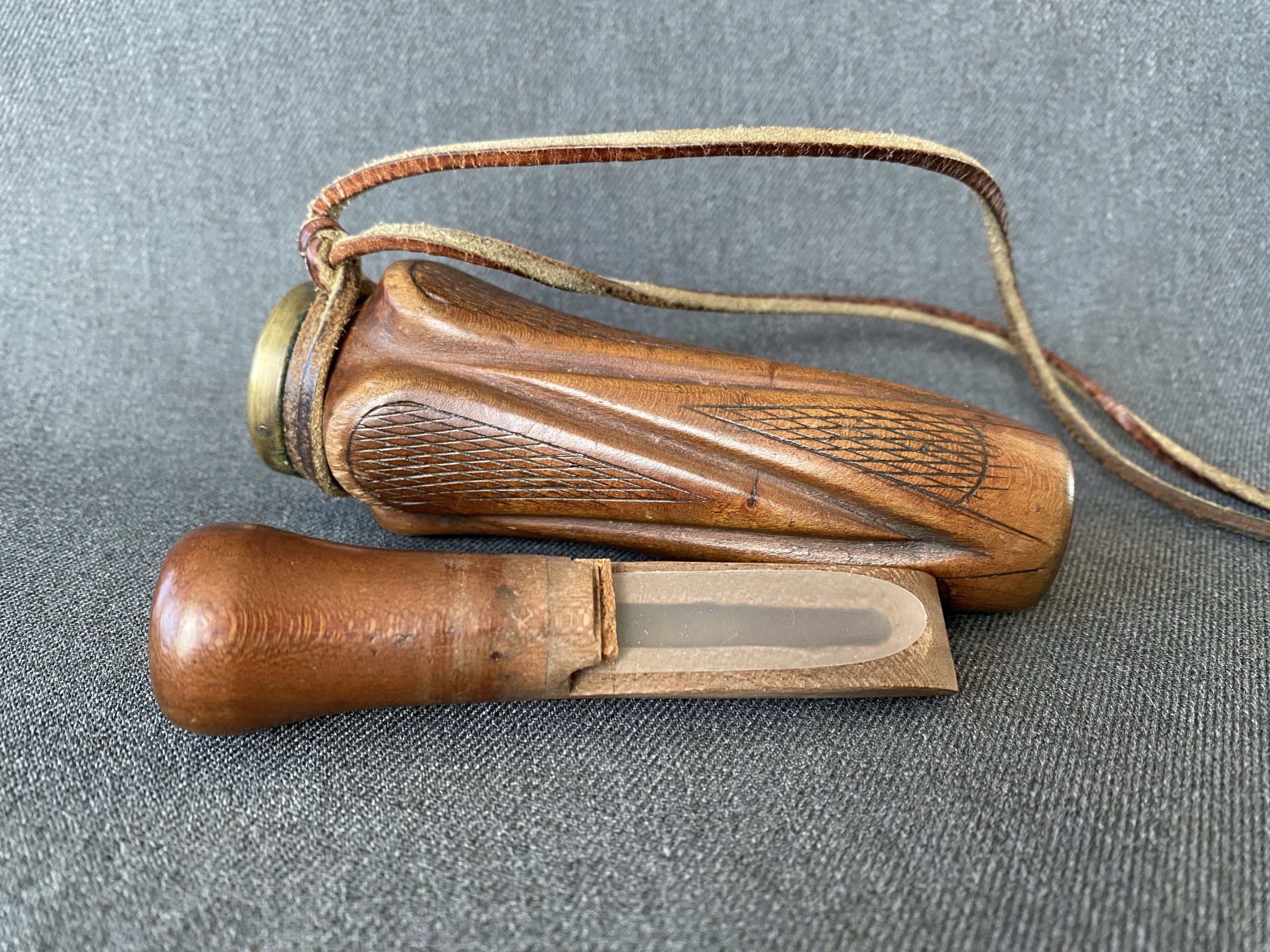 A very nice old Arkansas style checkered call from A.M. Bowles. The call has four larger checkered panels and four smaller panels. It has a brass band and is stamped A.M. Bowles Little Rock Ark