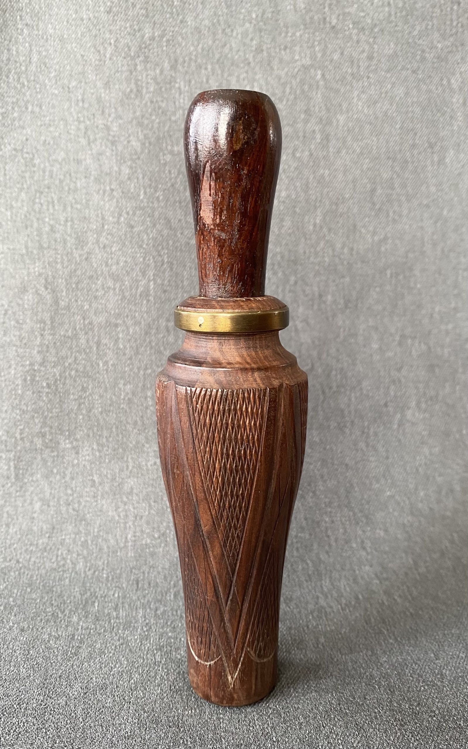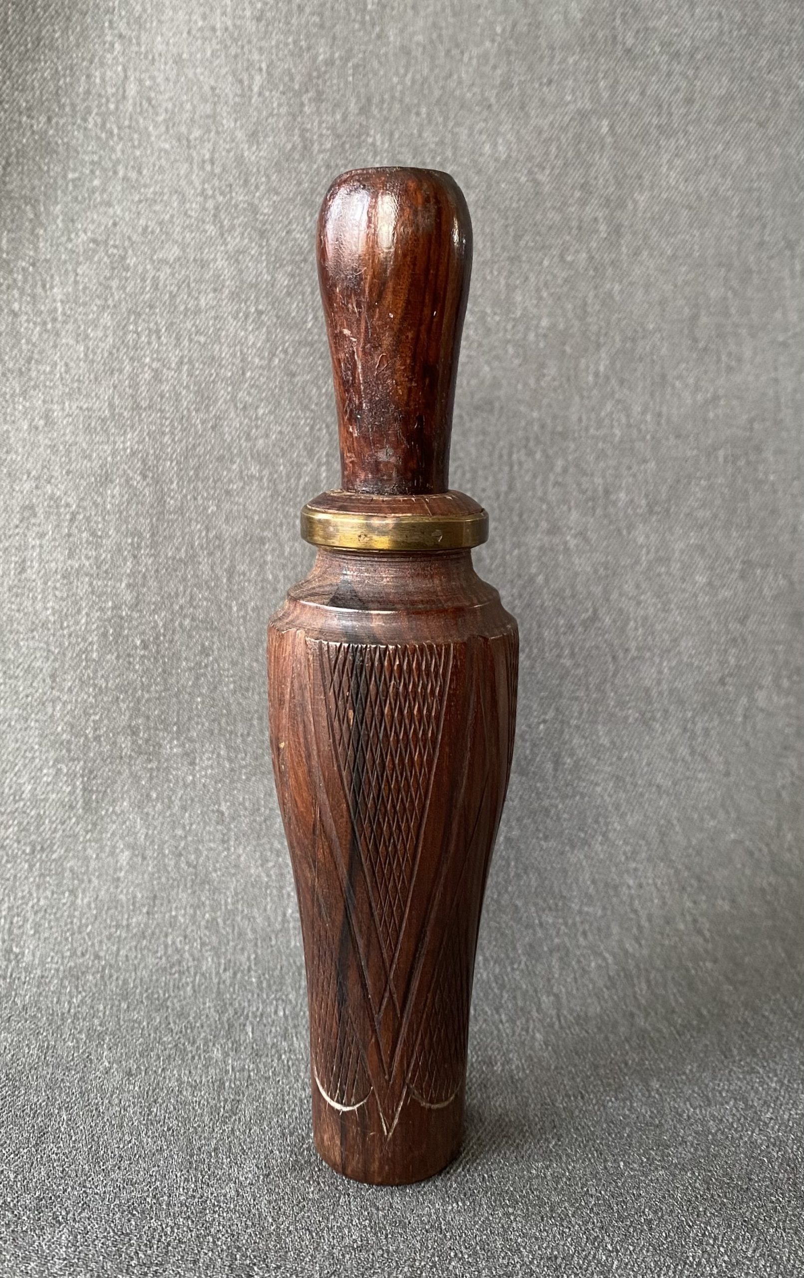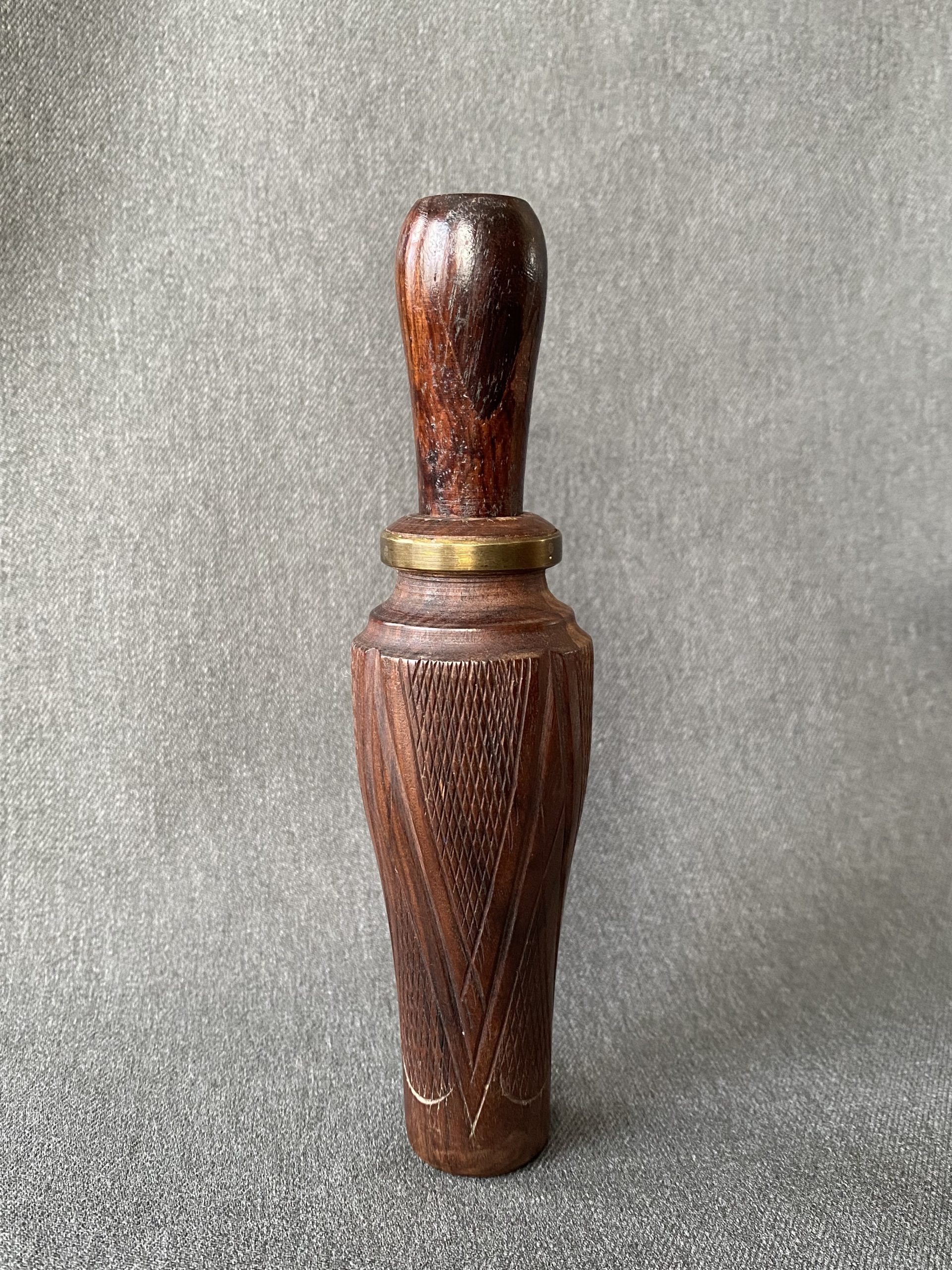 A very nice walnut call from A.M. Bowles. It has four large checkered panels and four smaller checkered panels. It has a brass ring around the top of the barrel attached with three flush brads. The call is Arkansas style with a black plastic reed.