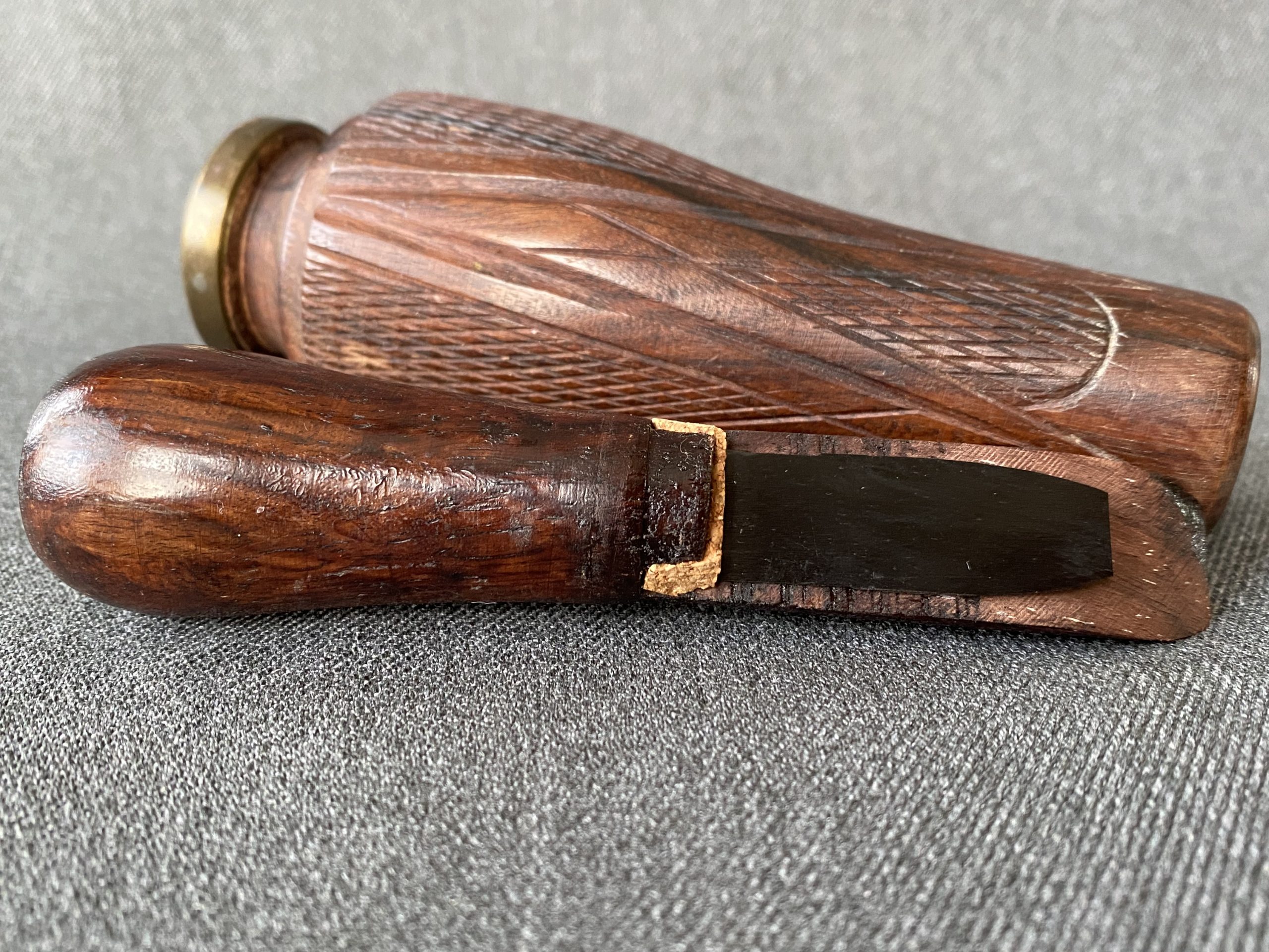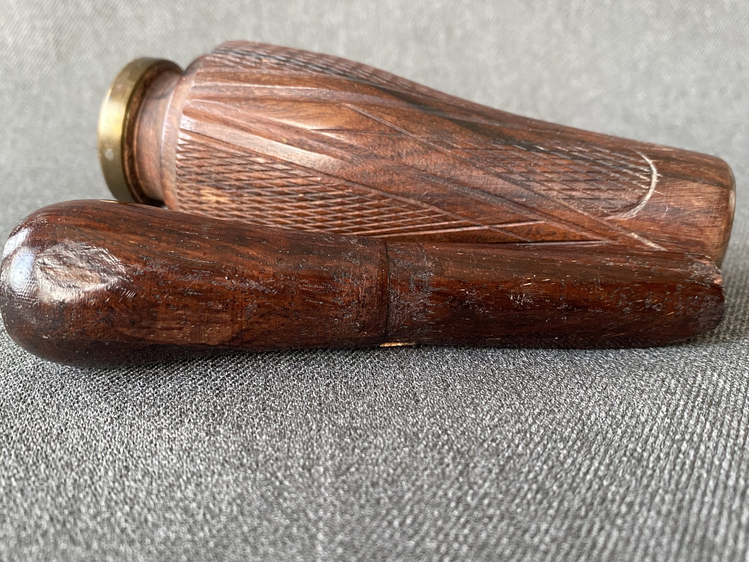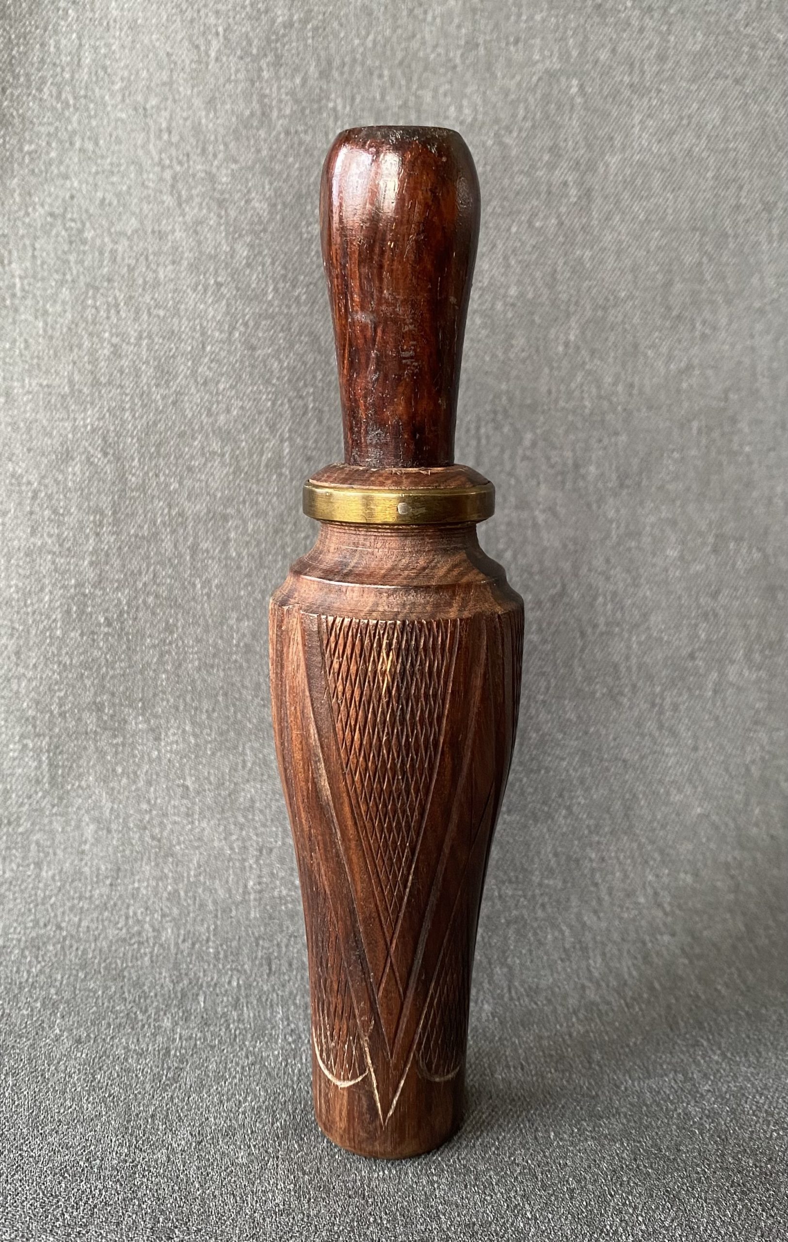 A very nice walnut call from A.M. Bowles. It has four large checkered panels and four smaller checkered panels. It has a brass ring around the top of the barrel attached with three flush brads. The call is Arkansas style with a black plastic reed.