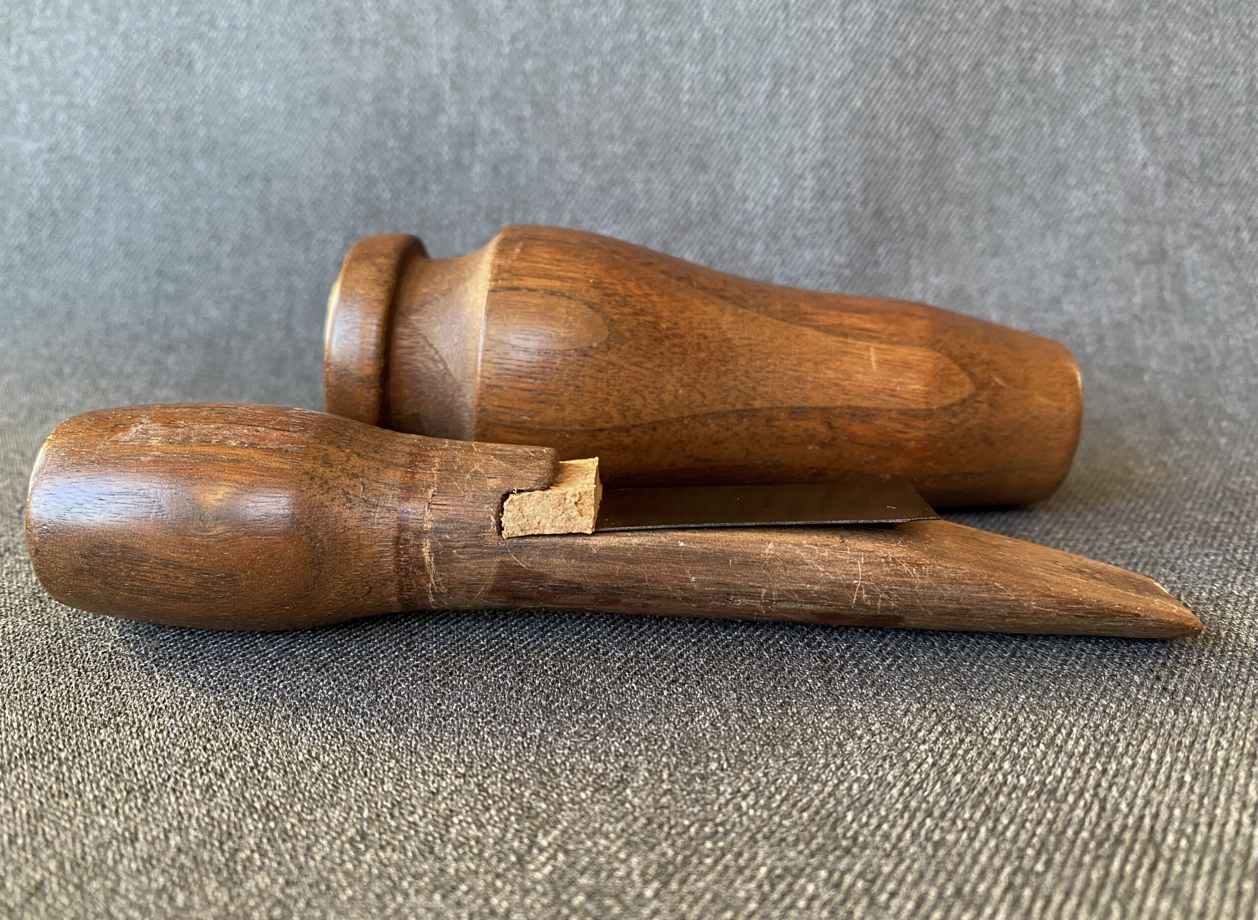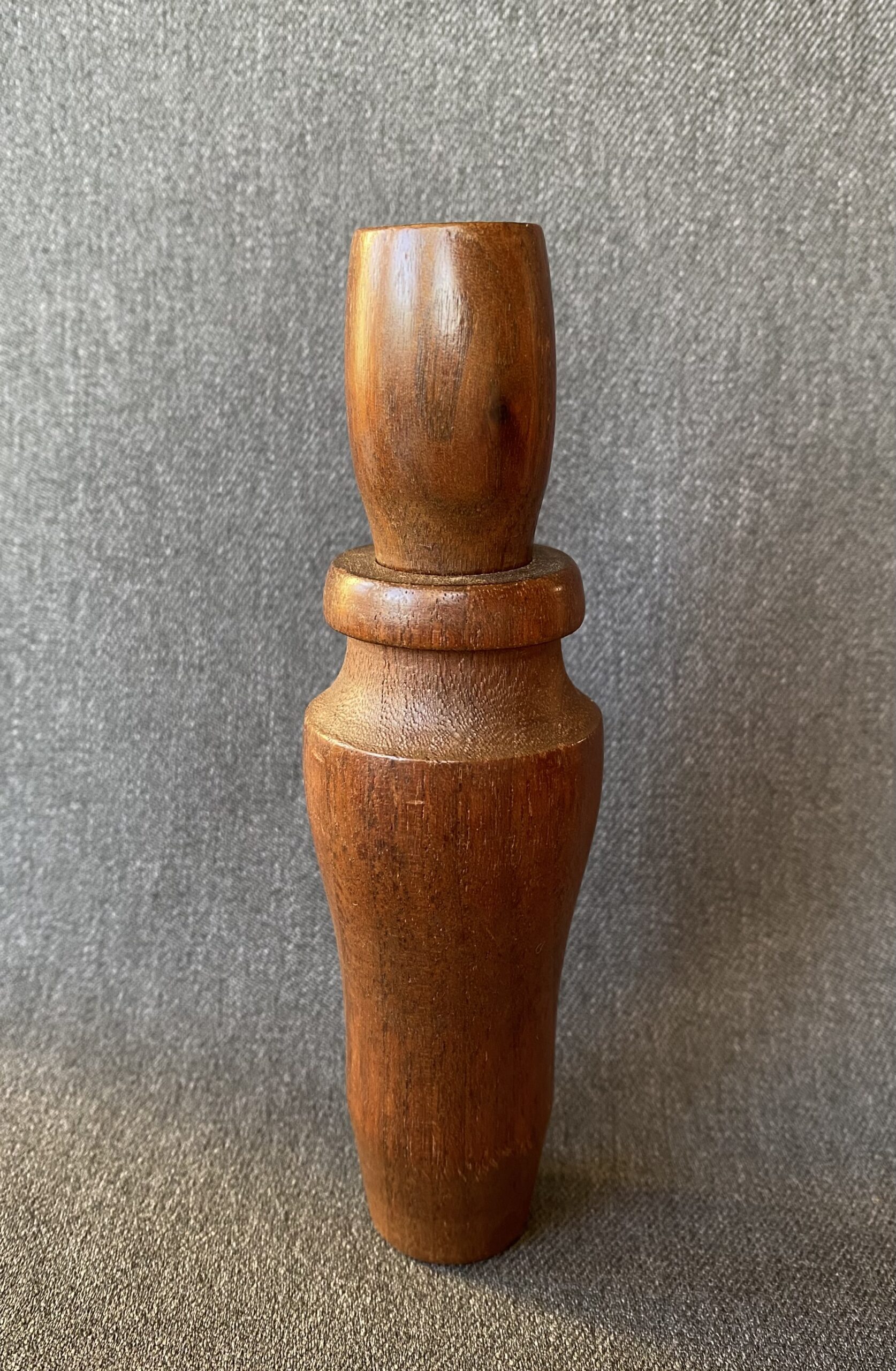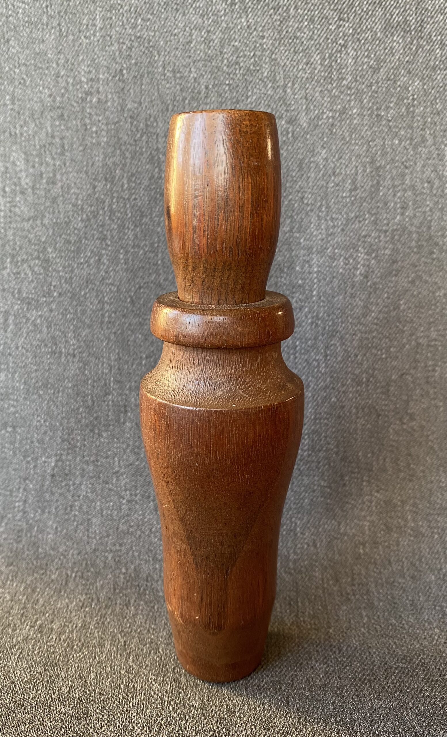 This is a rare, old smooth barrel call from A.M. Bowles. The call is Arkansas style with a black plastic reed. It is carved from walnut and has an oil finish.