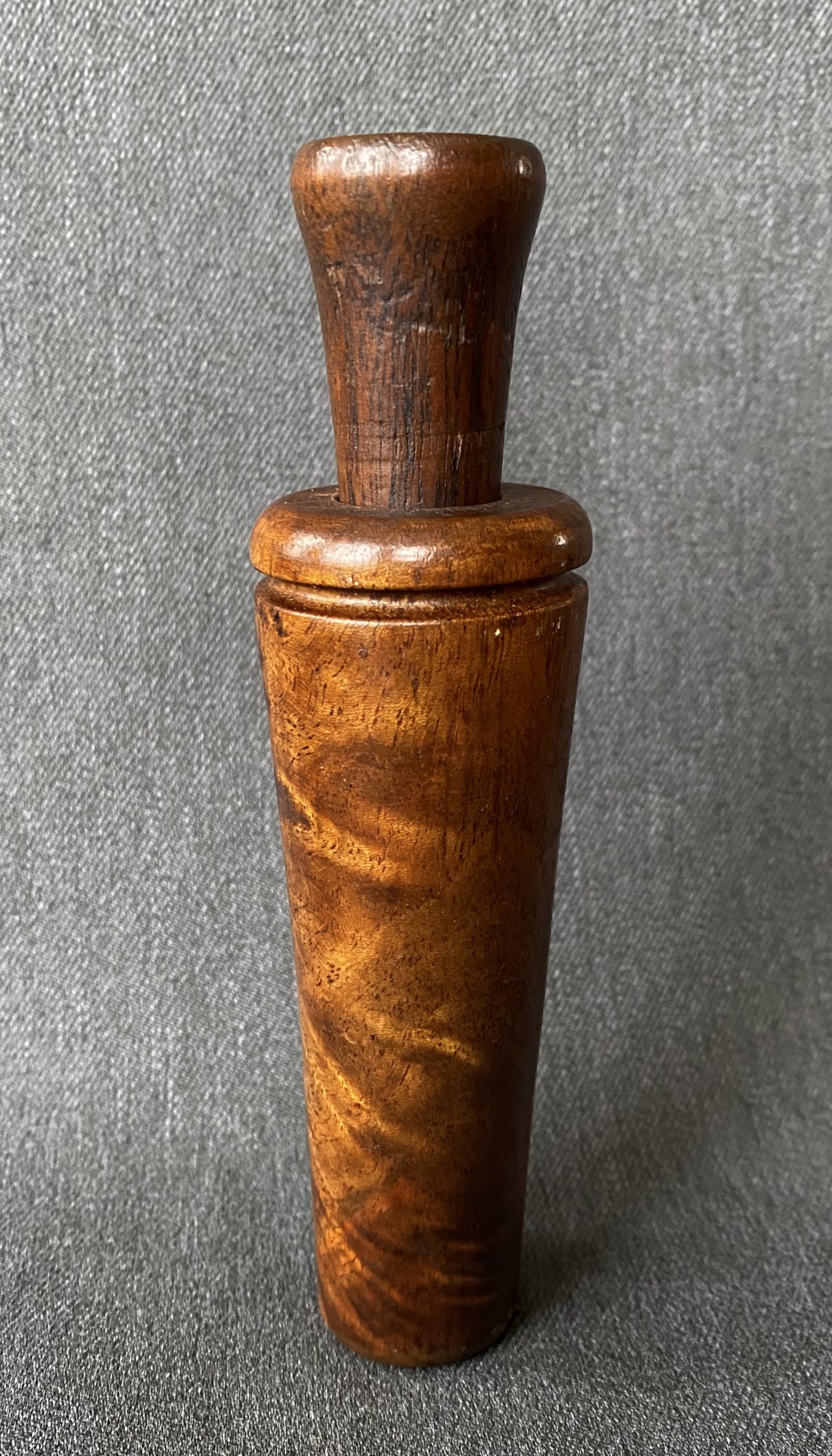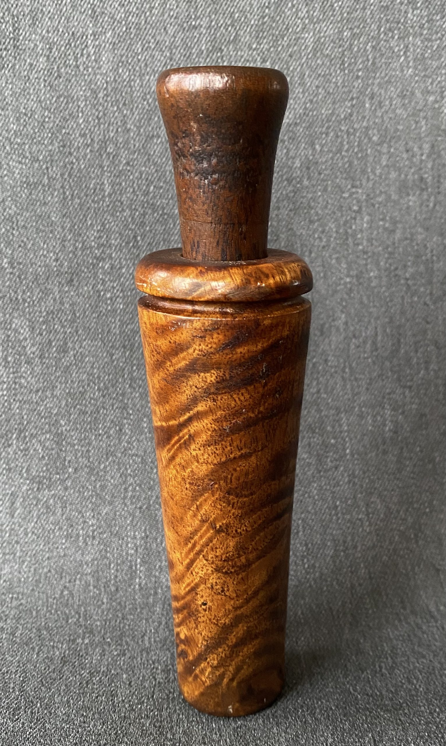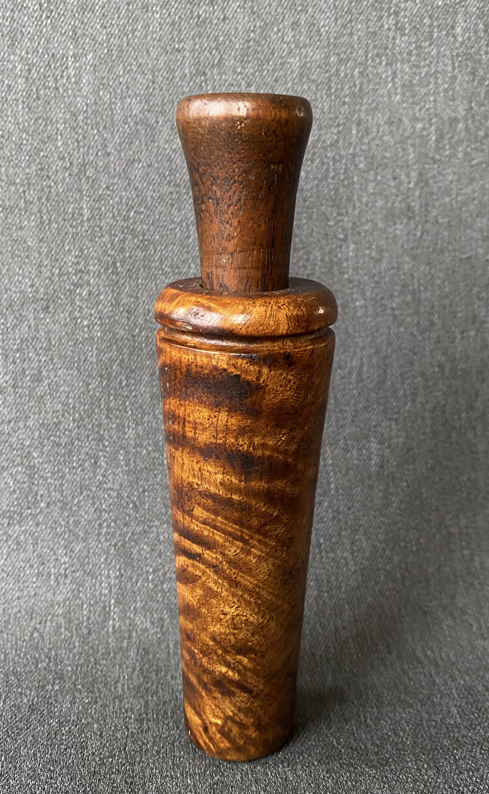 A beautiful walnut burl call from A.M. Bowles. The call is Arkansas style with a black reed.