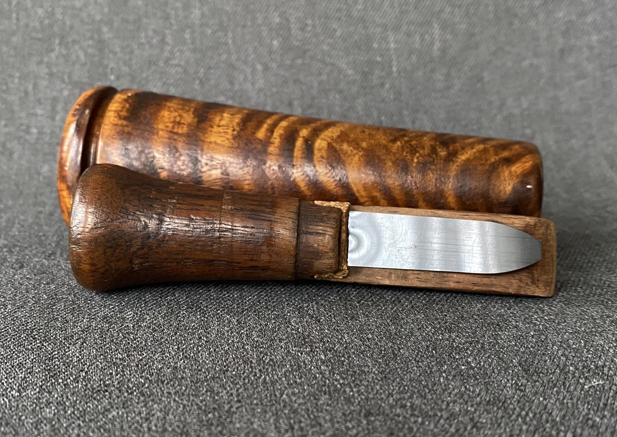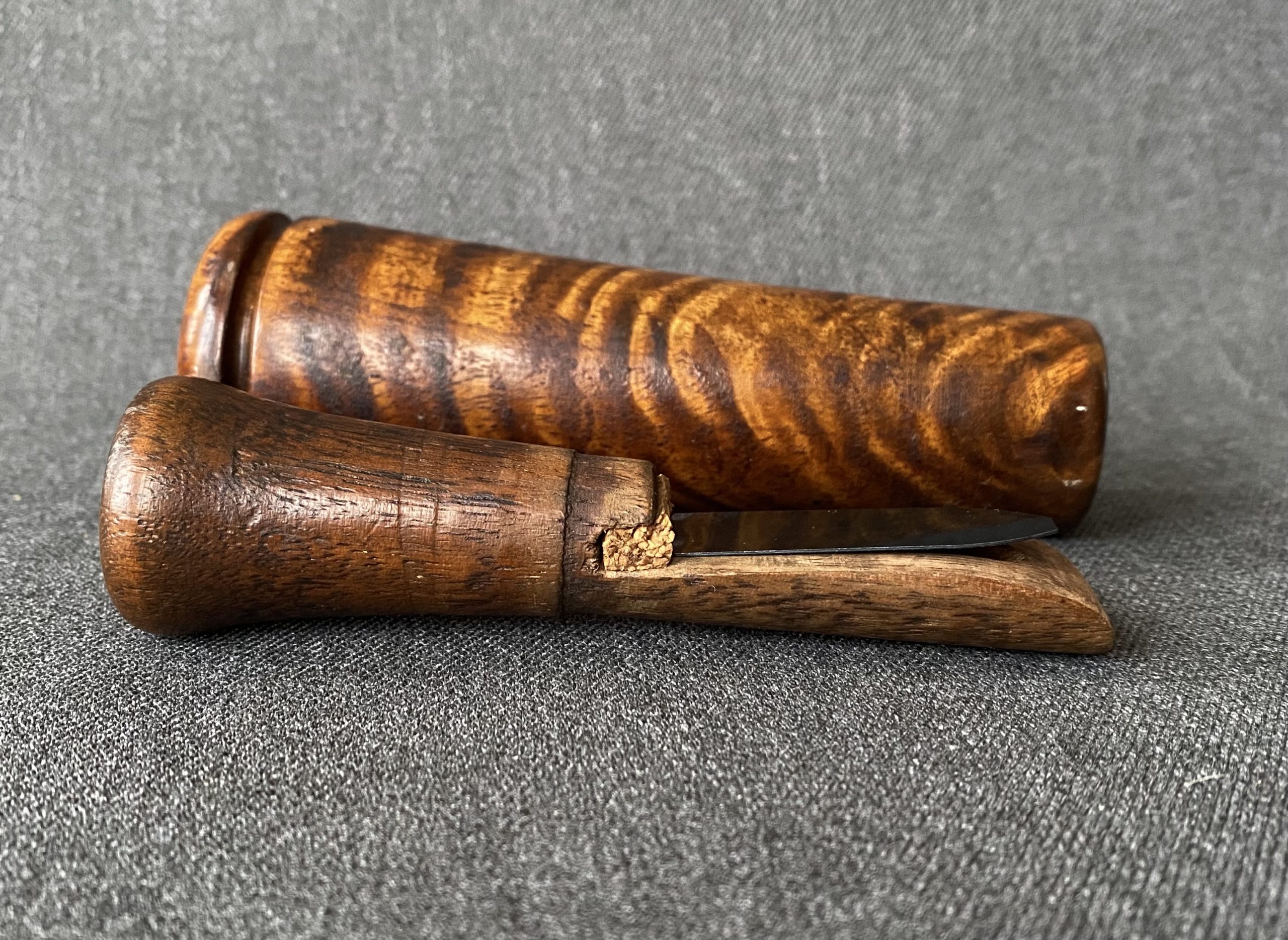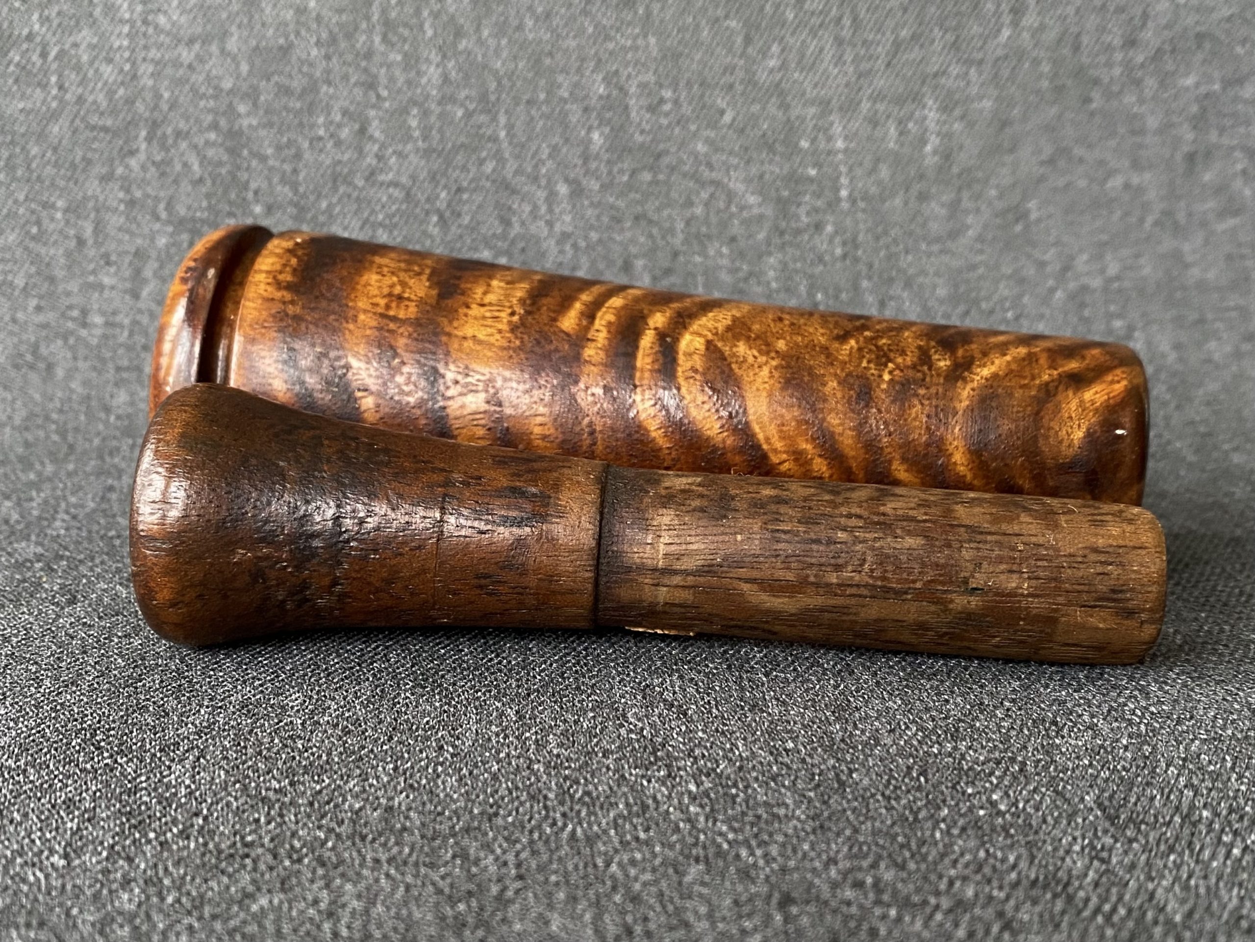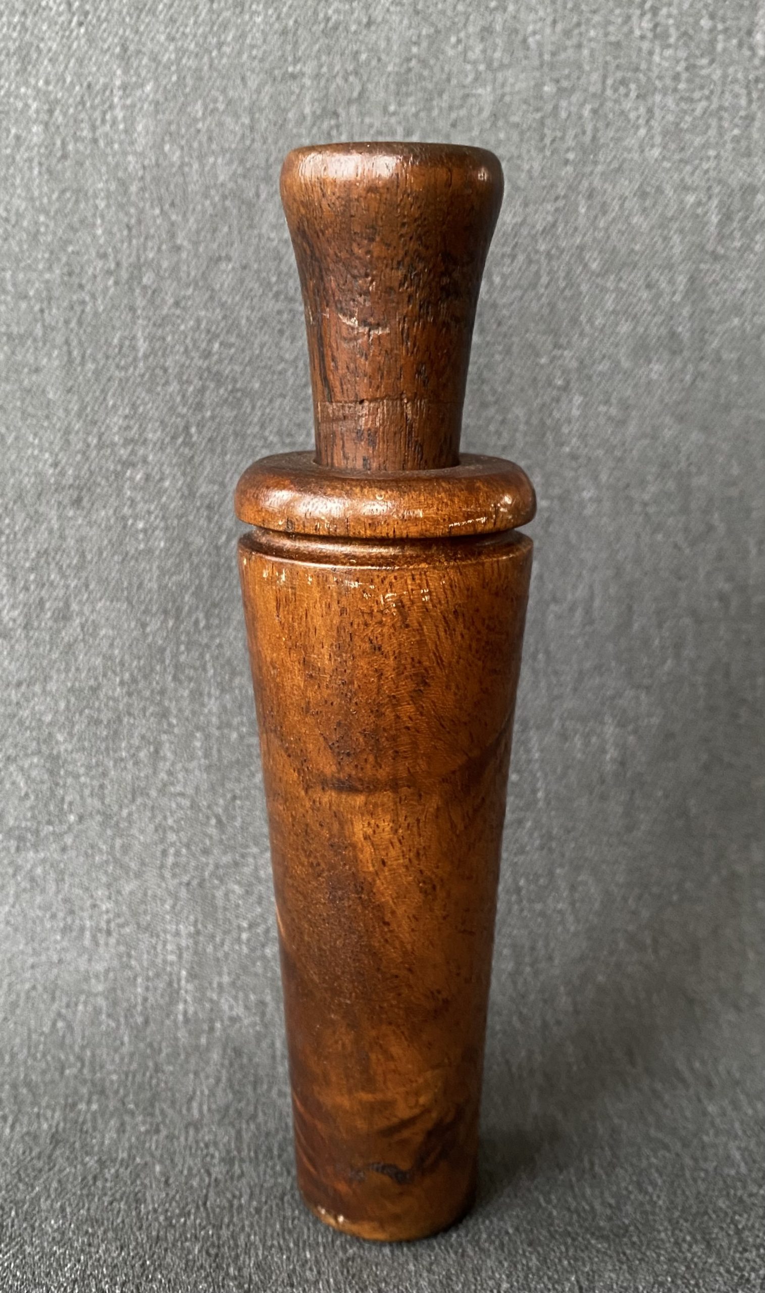 A beautiful walnut burl call from A.M. Bowles. The call is Arkansas style with a black reed.