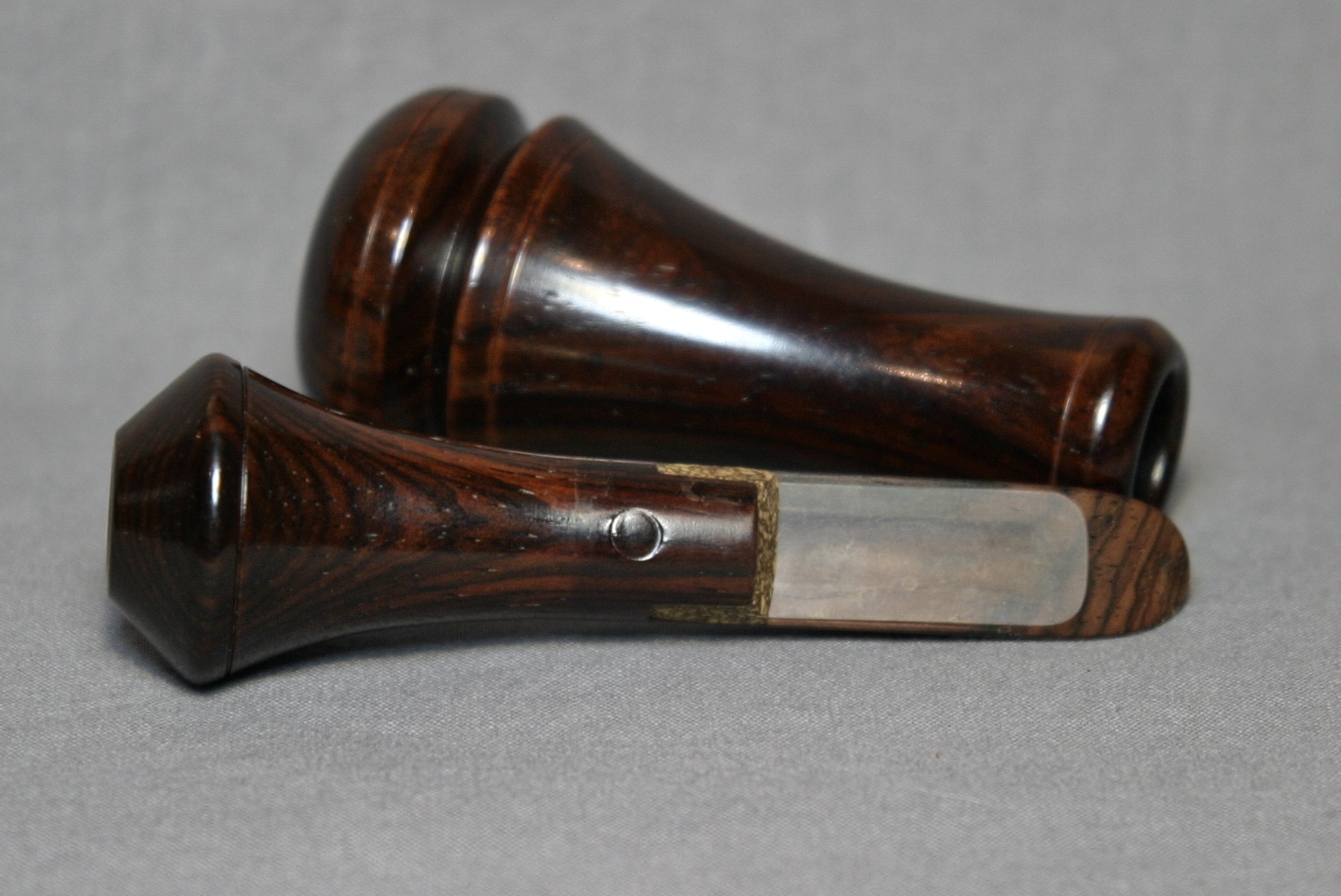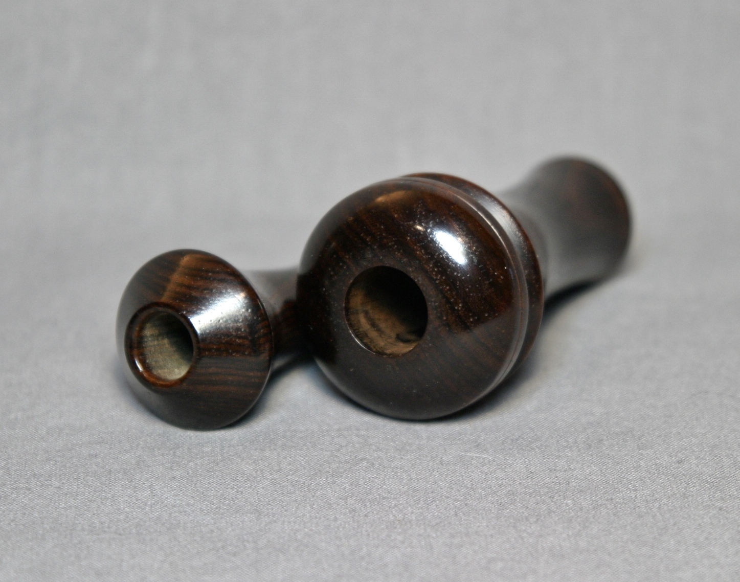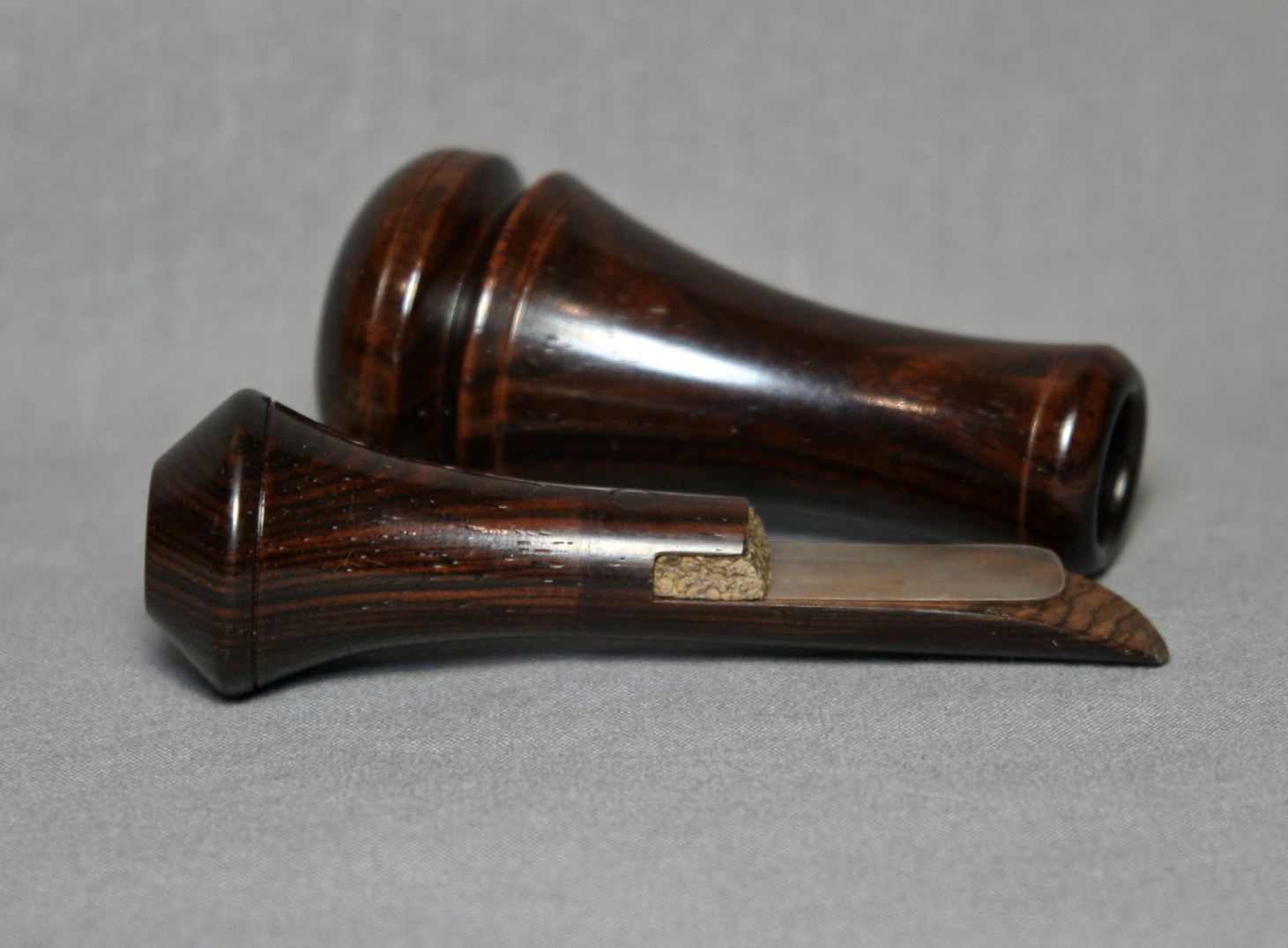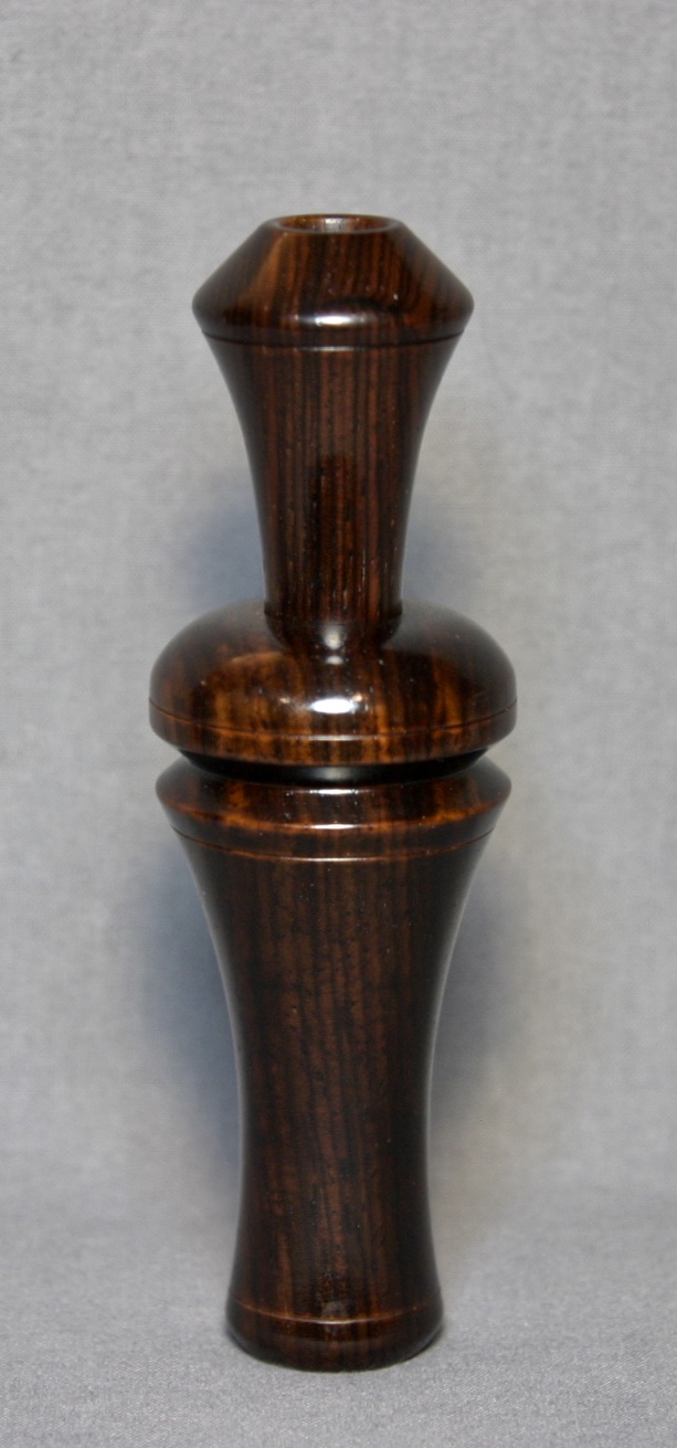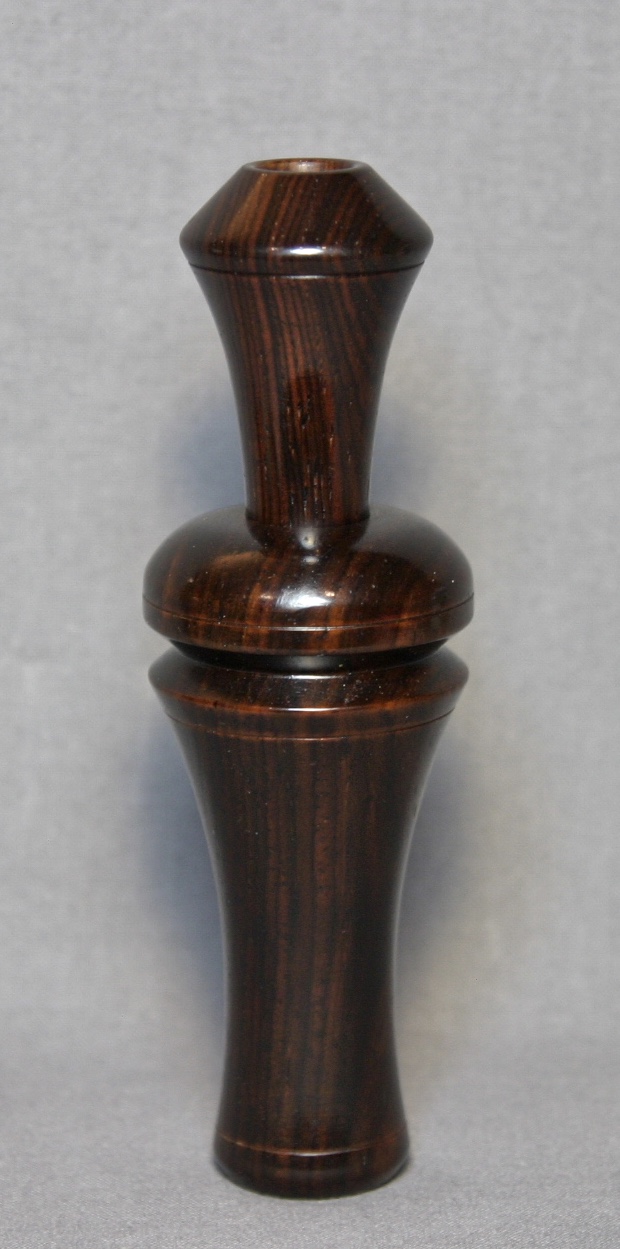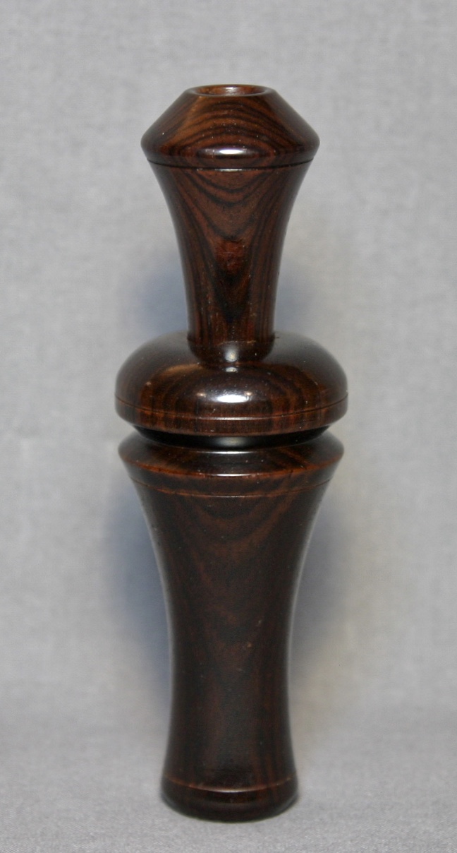 This is beautifully turned cocobolo call in wonderful condition from Buddy Duke. It’s an Arkansas style call with a plastic reed.
