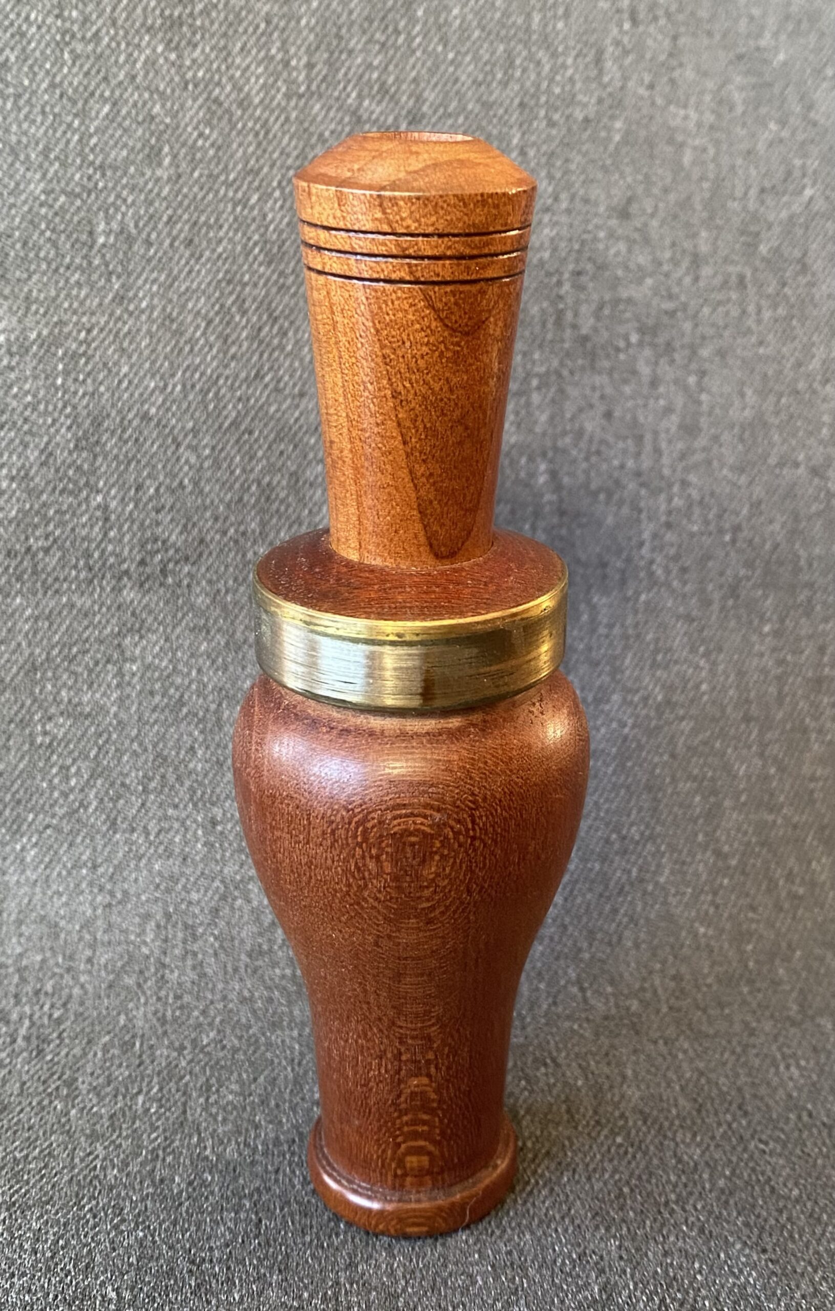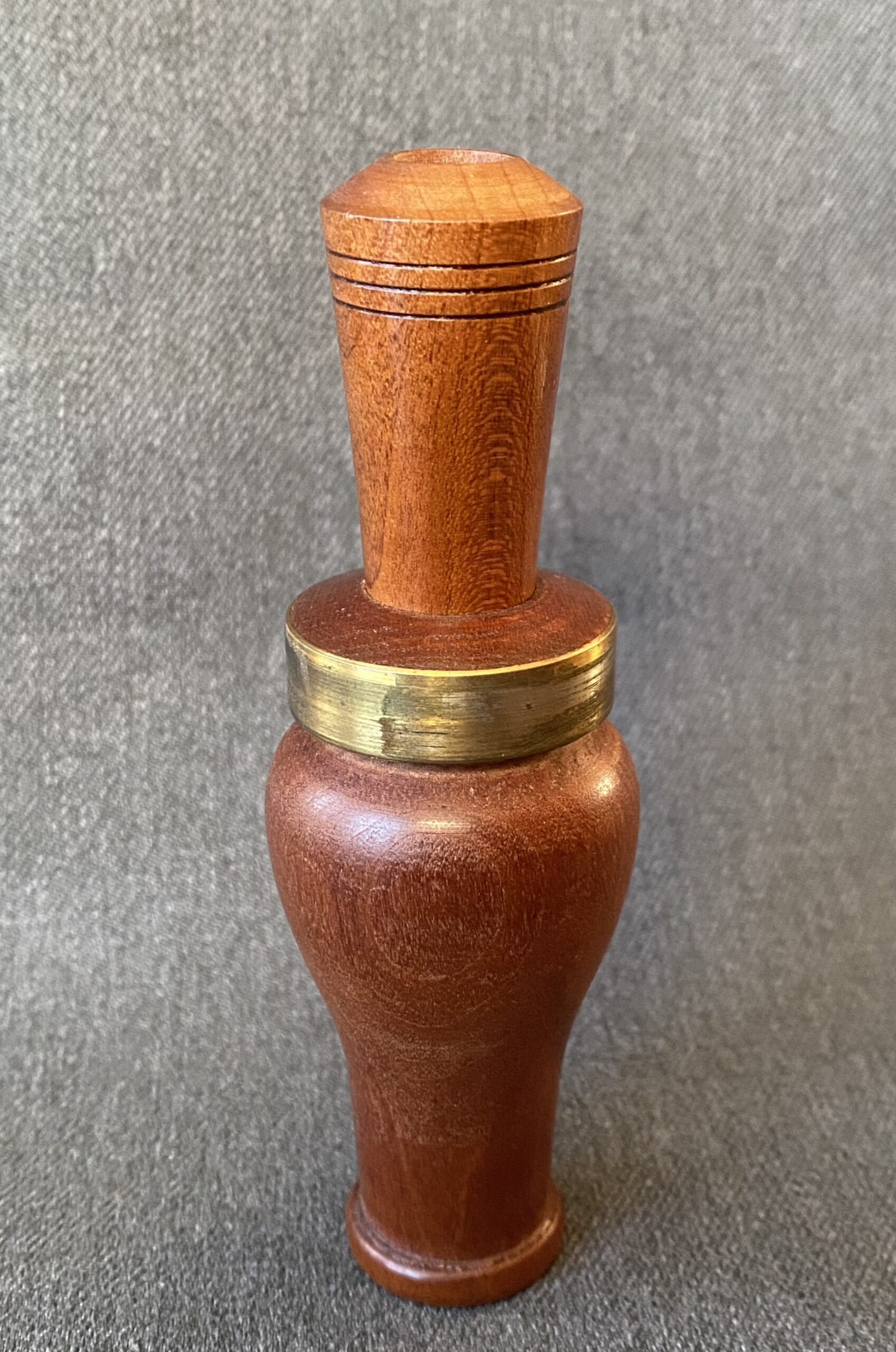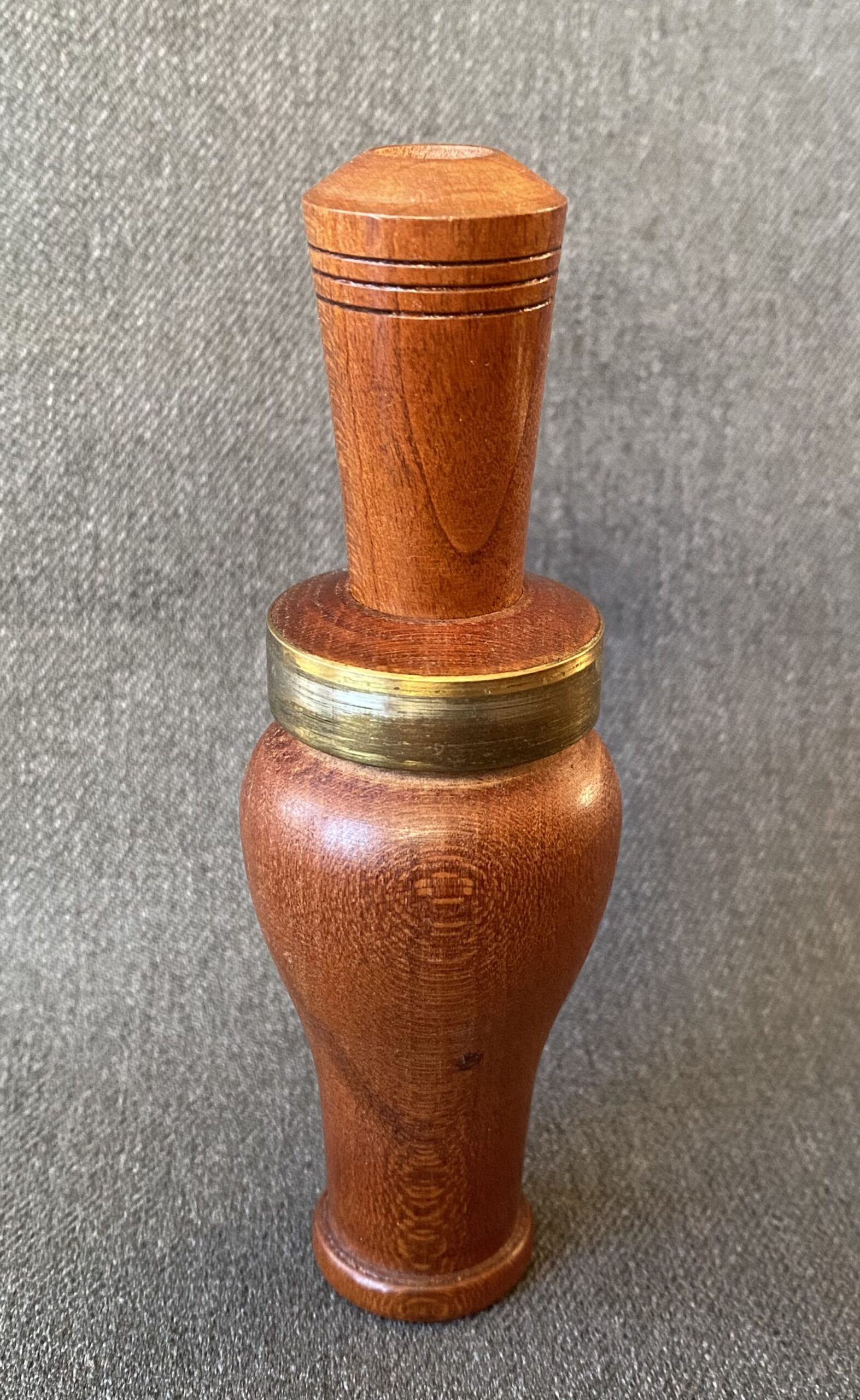 This is a very nice call from Billy Burke. The call is smaller than most Burke calls. It’s Arkansas style with a white plastic reed and a brass band around the top of the barrel.