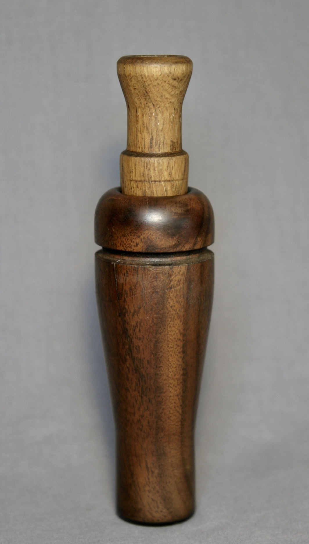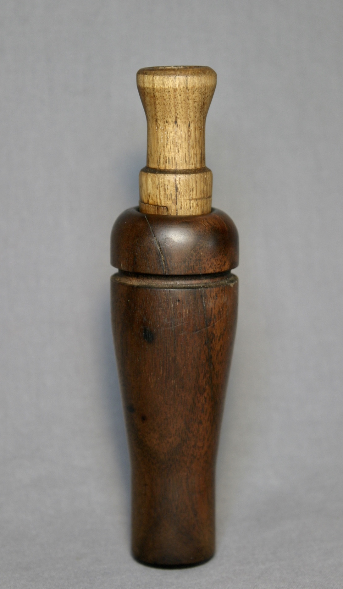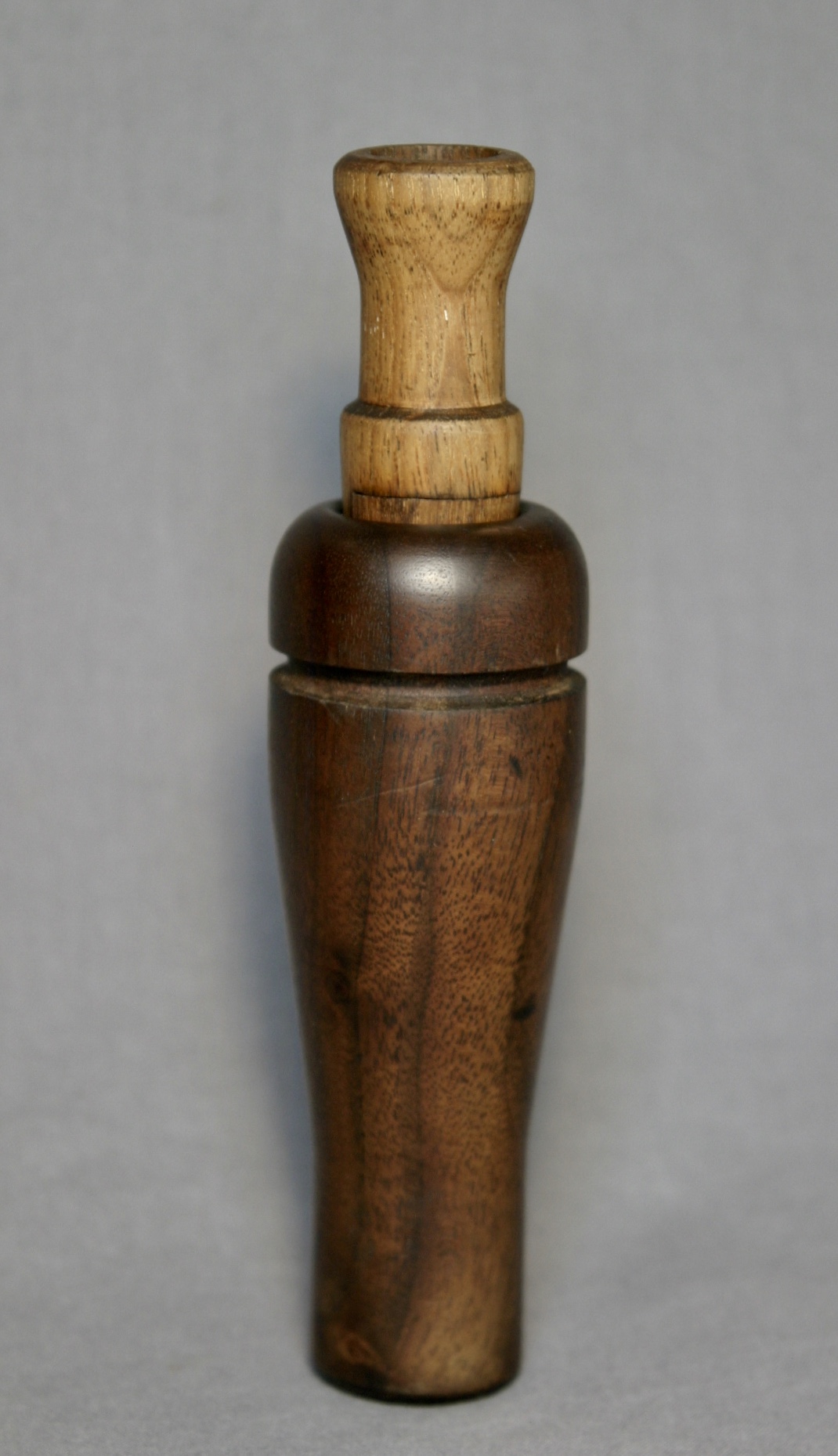 A great call by the master call maker Cecil Wellborn. The call has a Tom Turpin style stopper and the inside of the barrel is Glodoed in the style of Turpin calls. The call has a seasonal crack, running along the wood grain, on the outer top part of the barrel. The crack doesn’t go through to the inside of the barrel. This call has never been used.