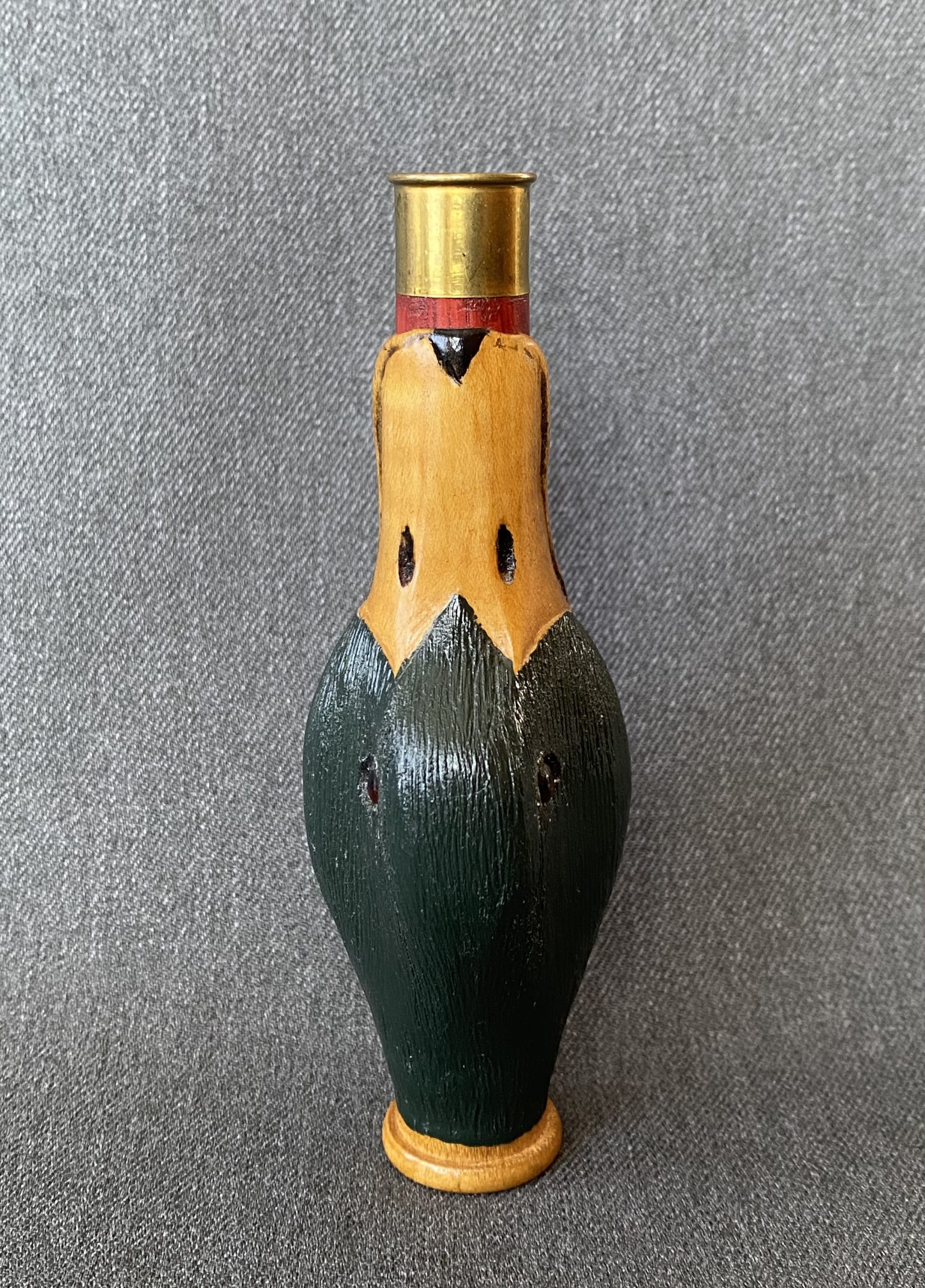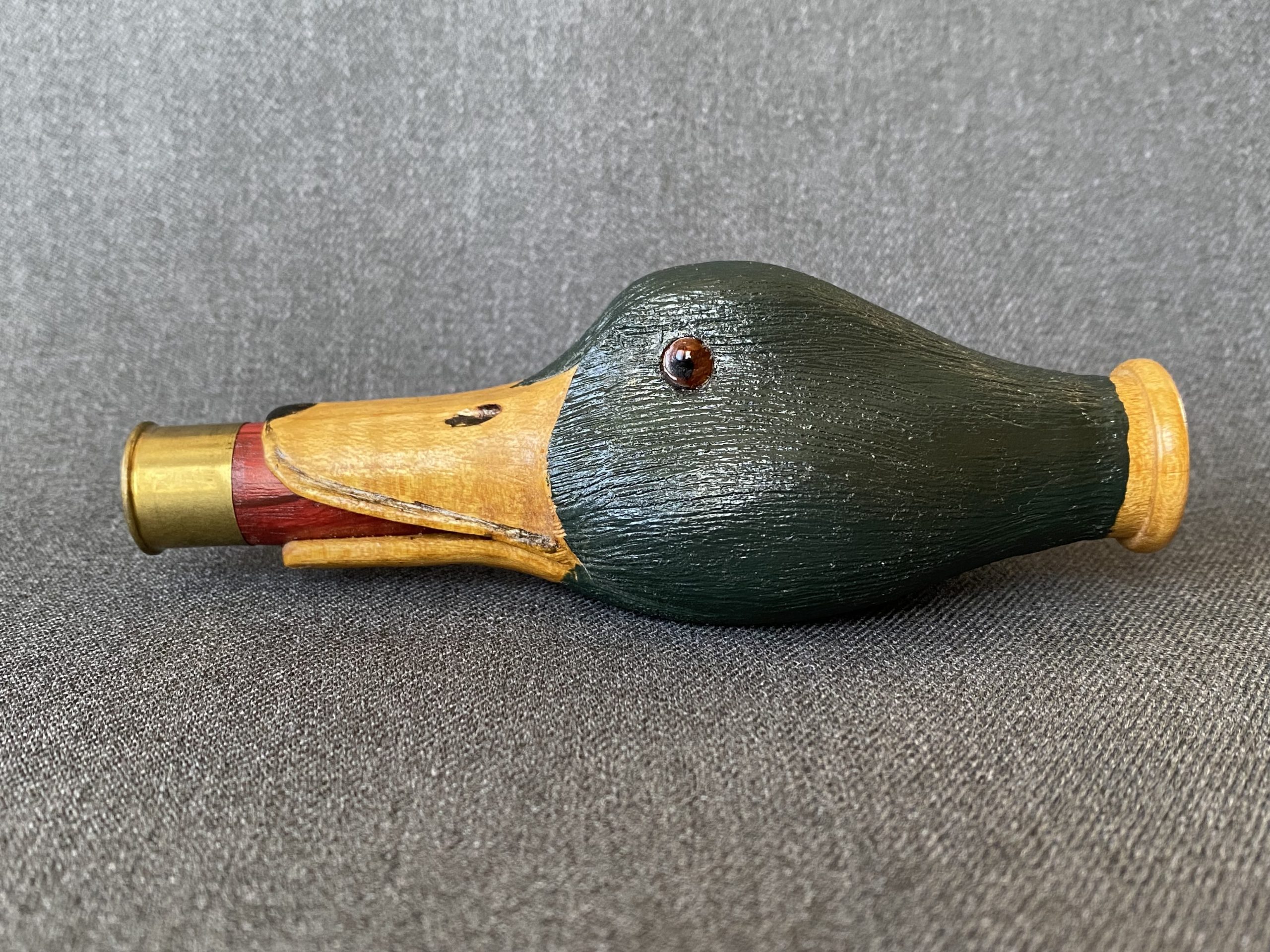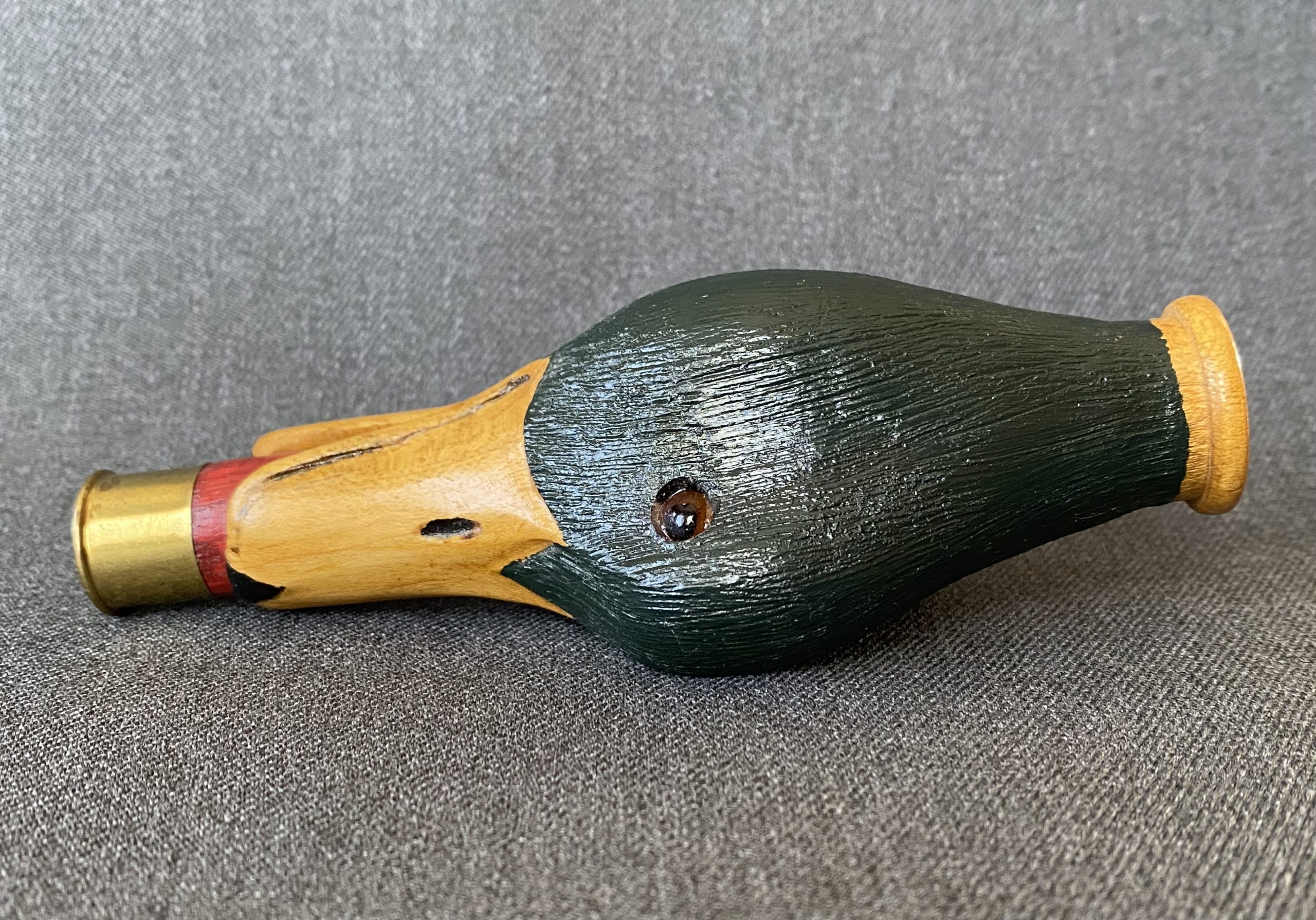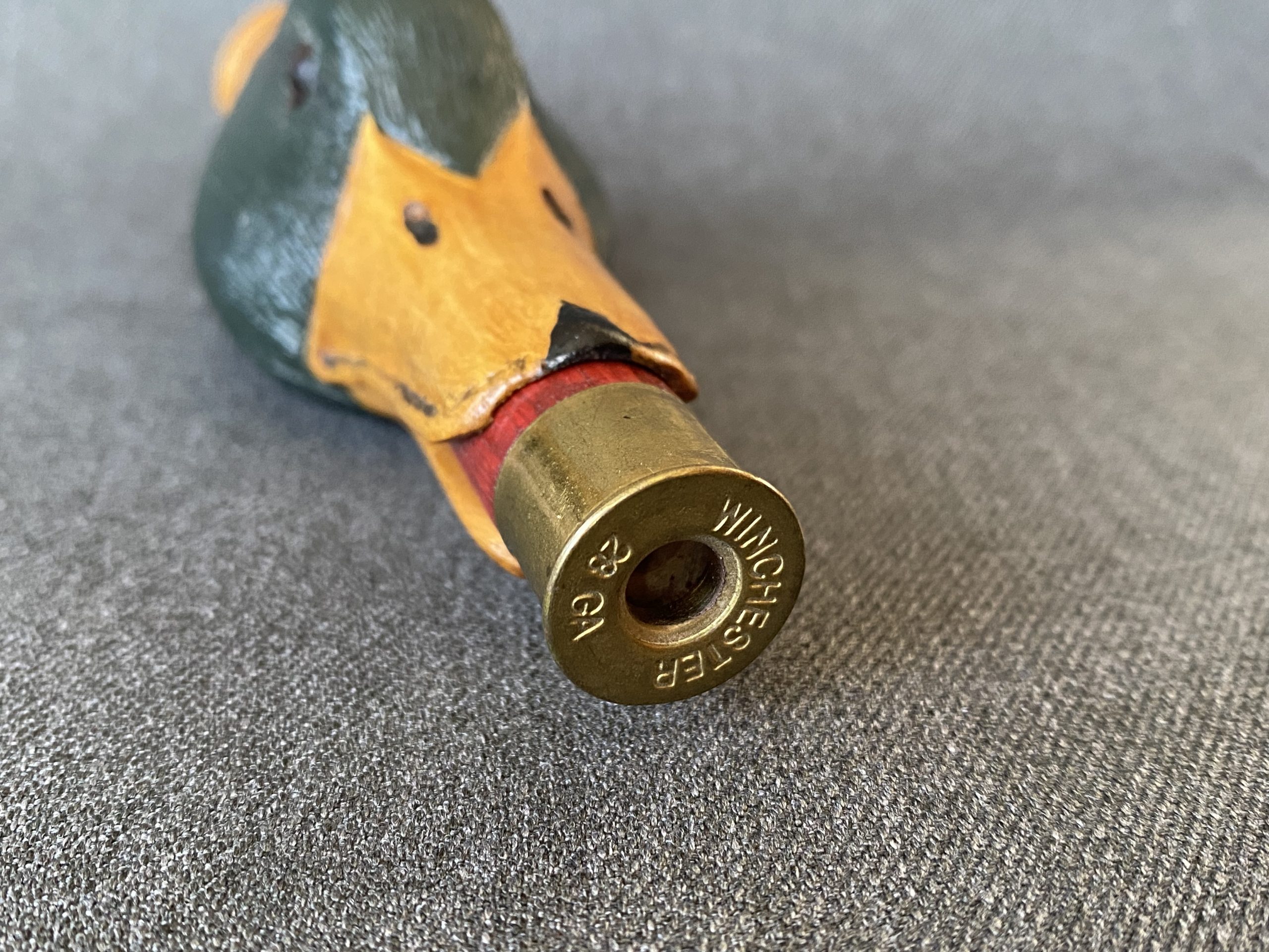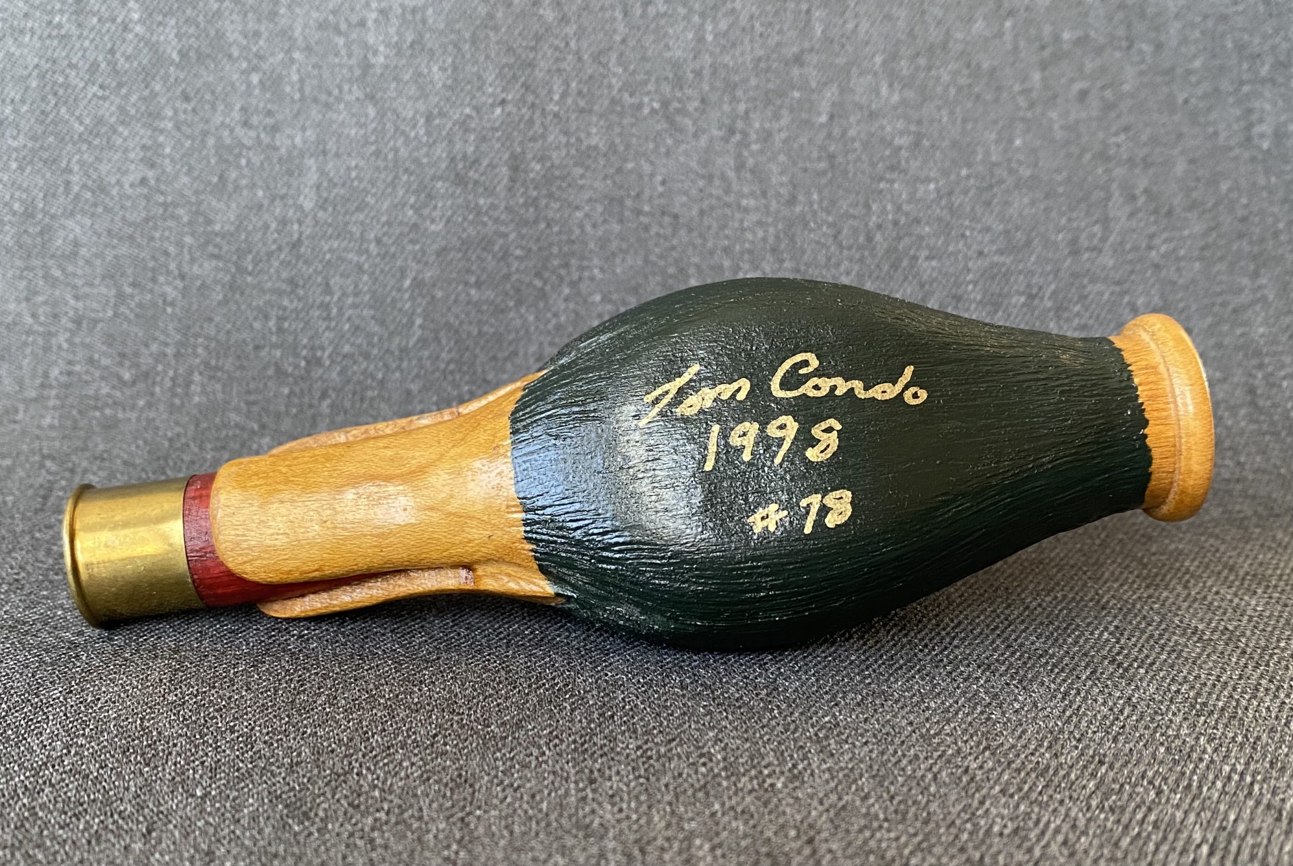 This is a Tom Condo duck call. The call is shaped like mallards head and has a Winchester shotshell for the mouth piece. This is a cedar call with oil finish.