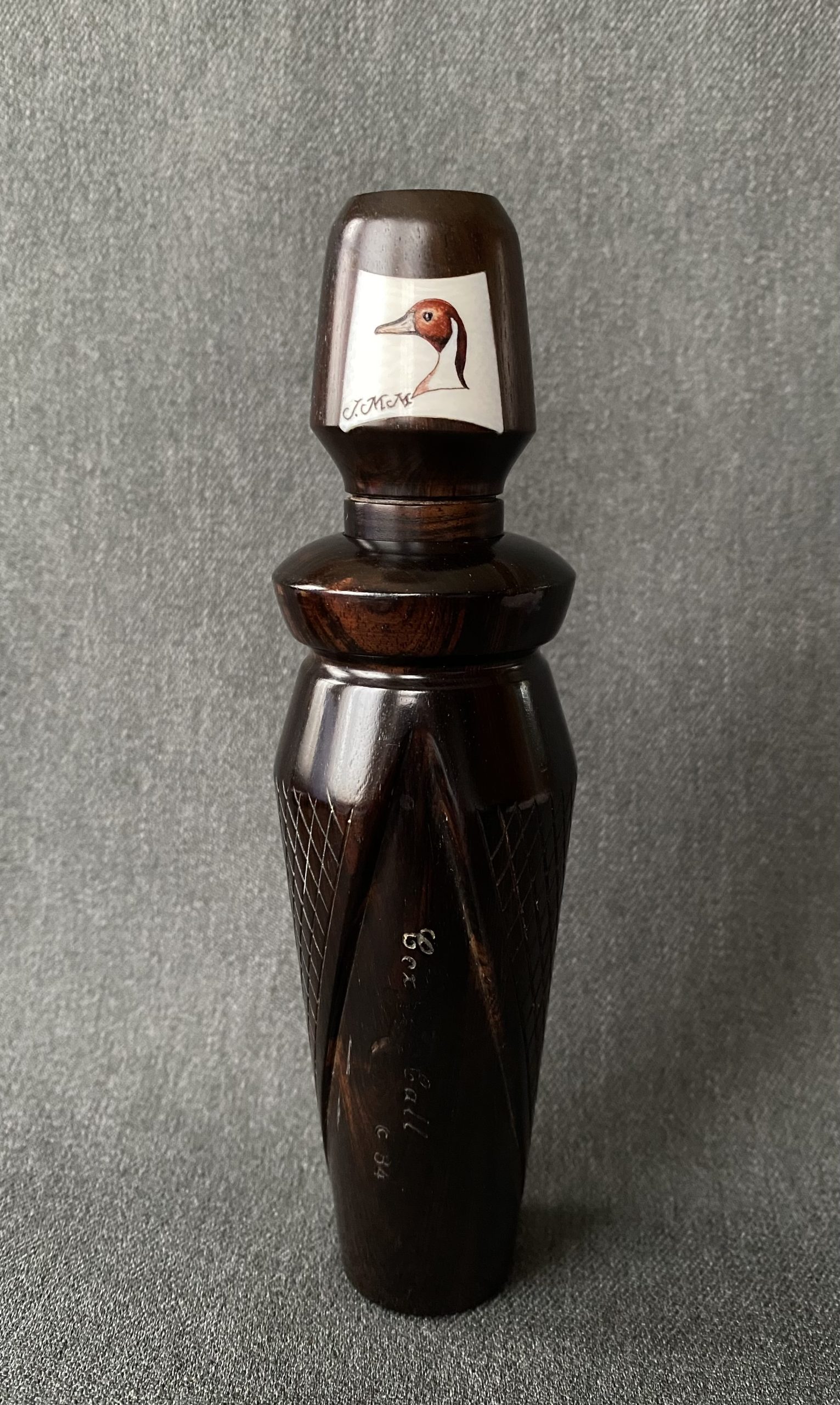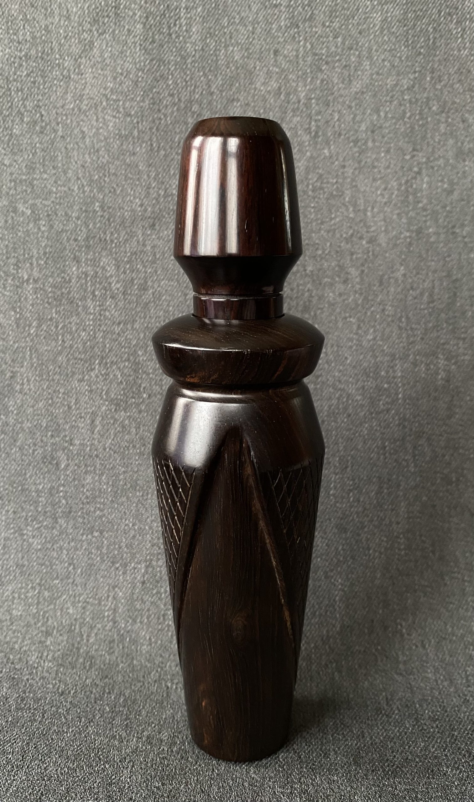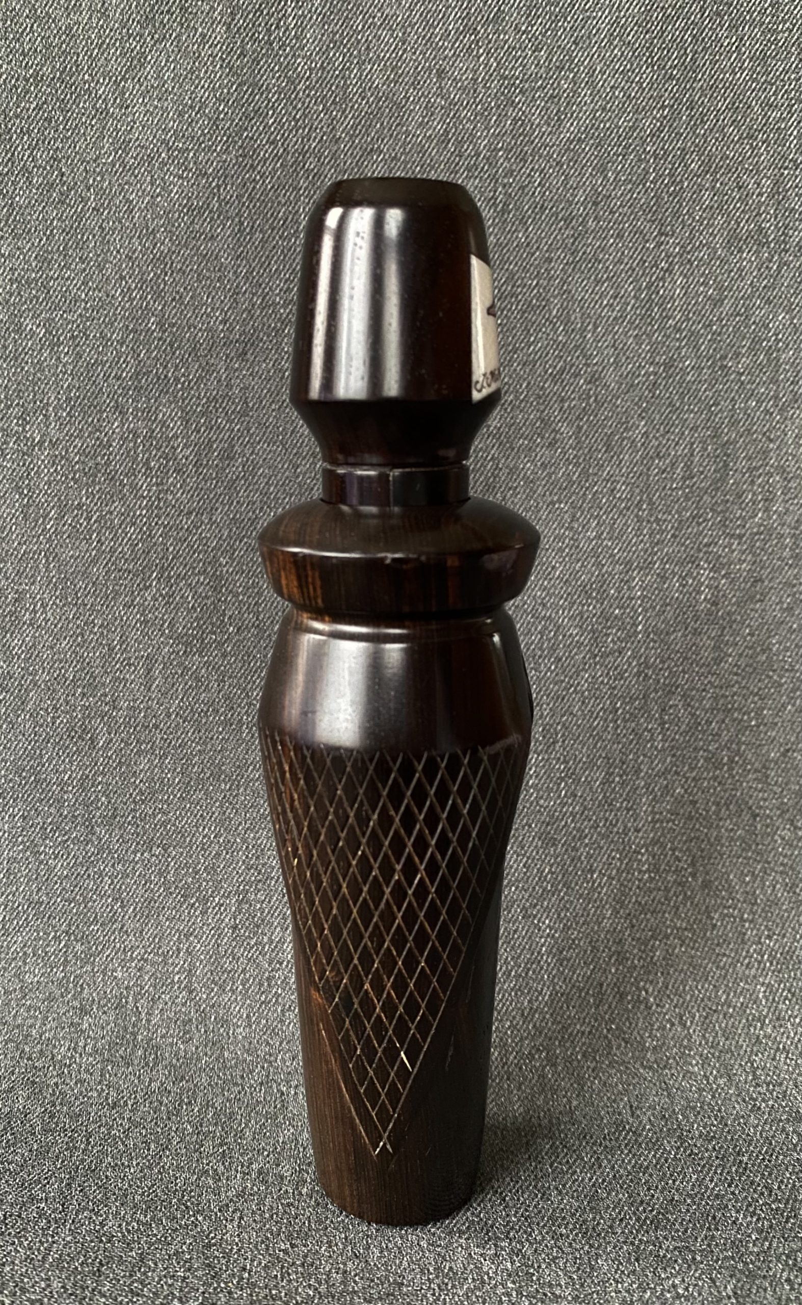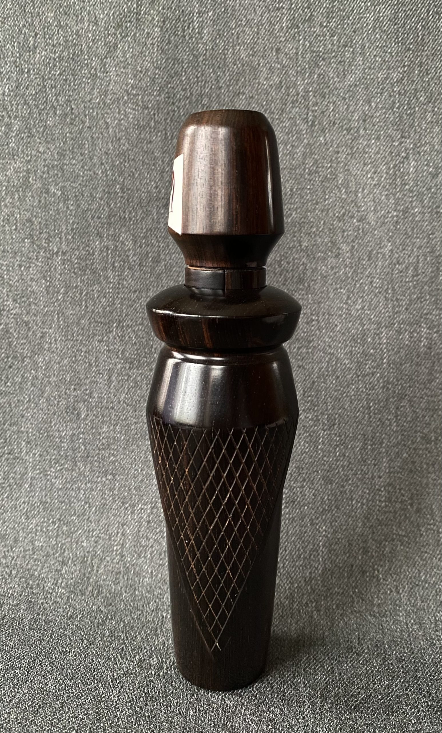 A beautiful African Blackwood call from Sam Cox. The call has two checkered panels on the barrel and a carved inset on the stopper. The call is Reelfoot style with a copper reed.