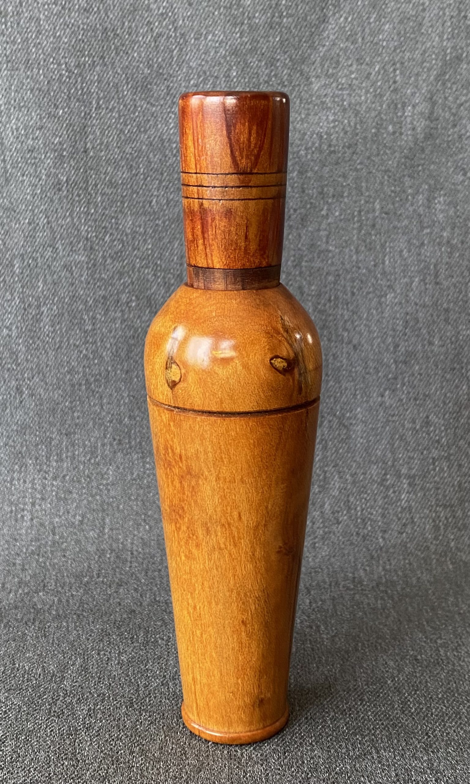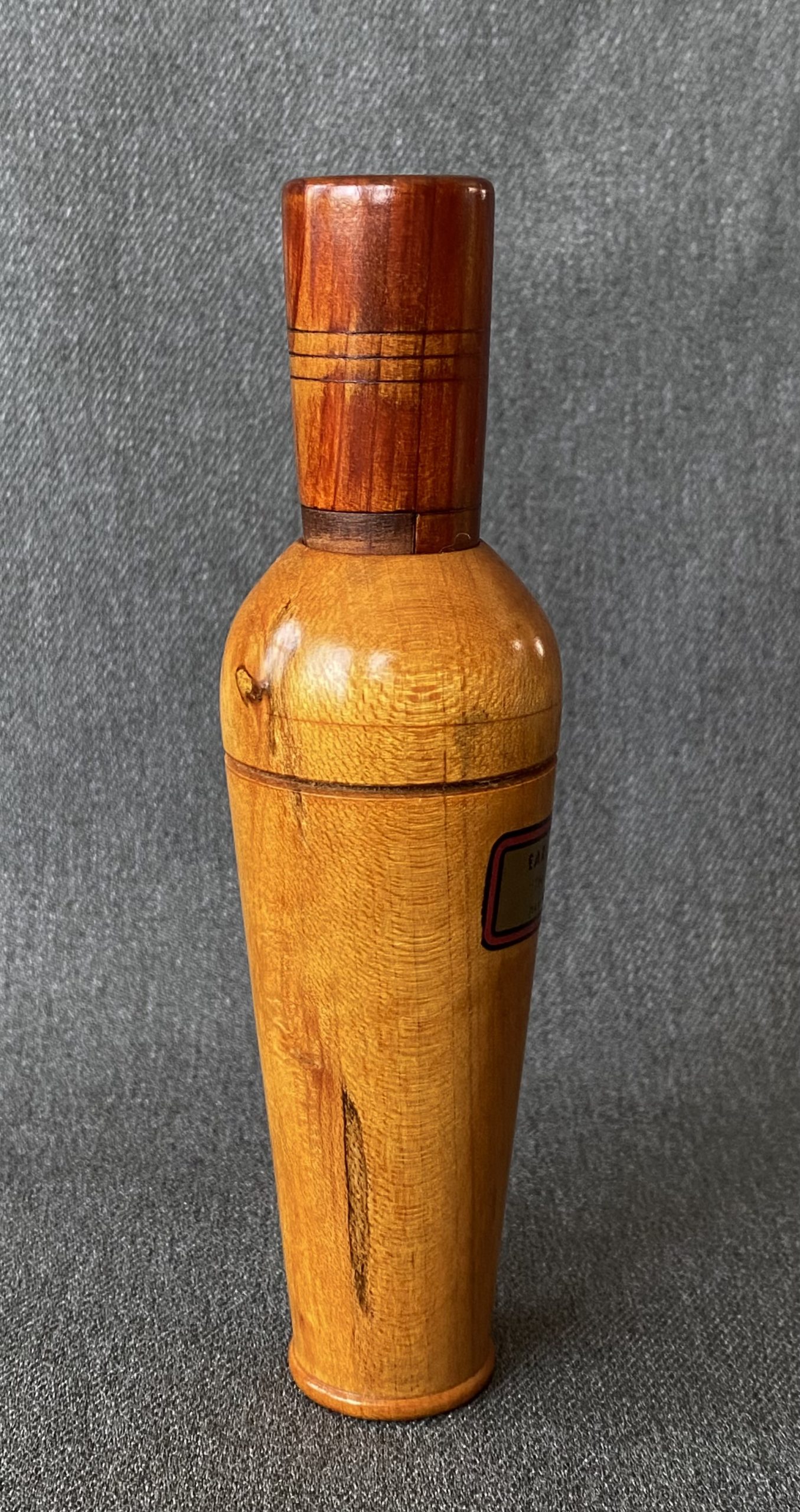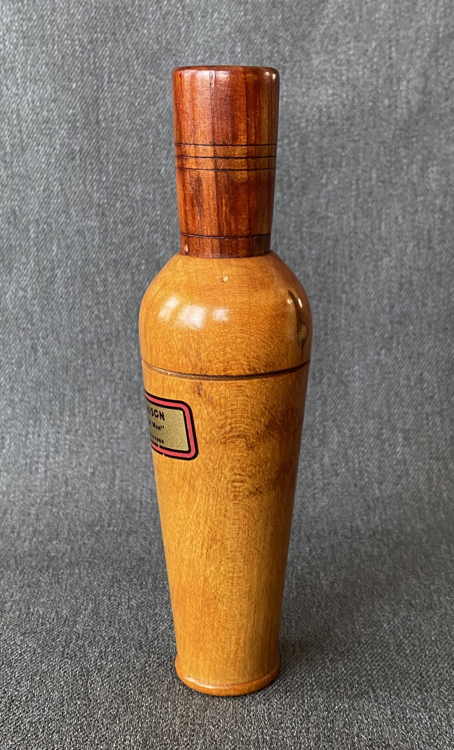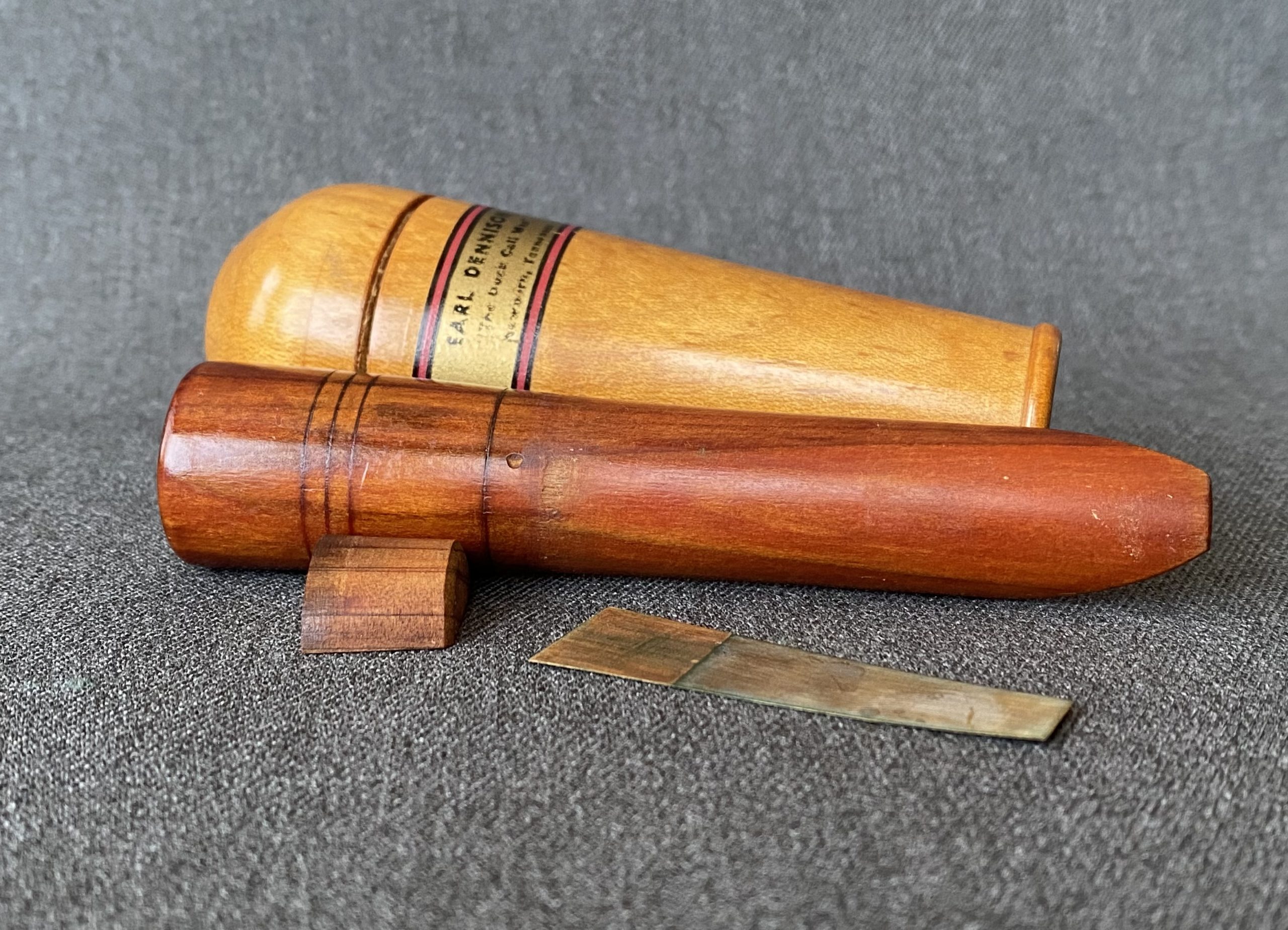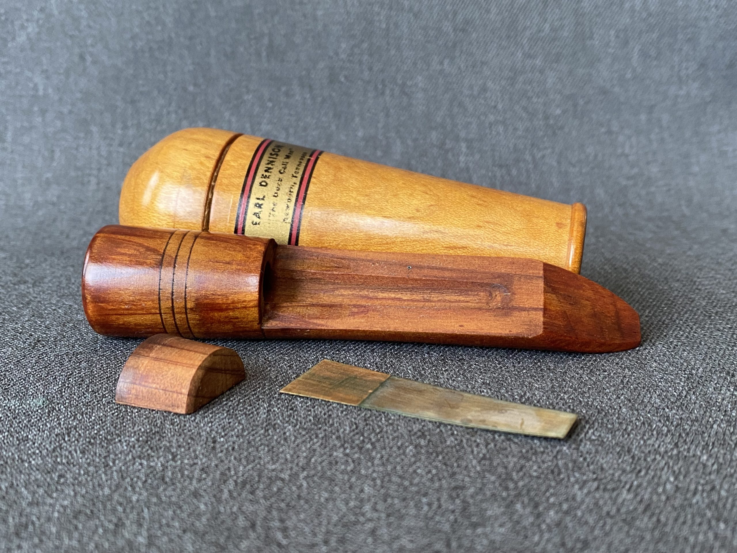 This is a wonderful Earl Dennison call with the gold label. The call is Reelfoot style with a copper reed. The barrel has a round rolled lip.