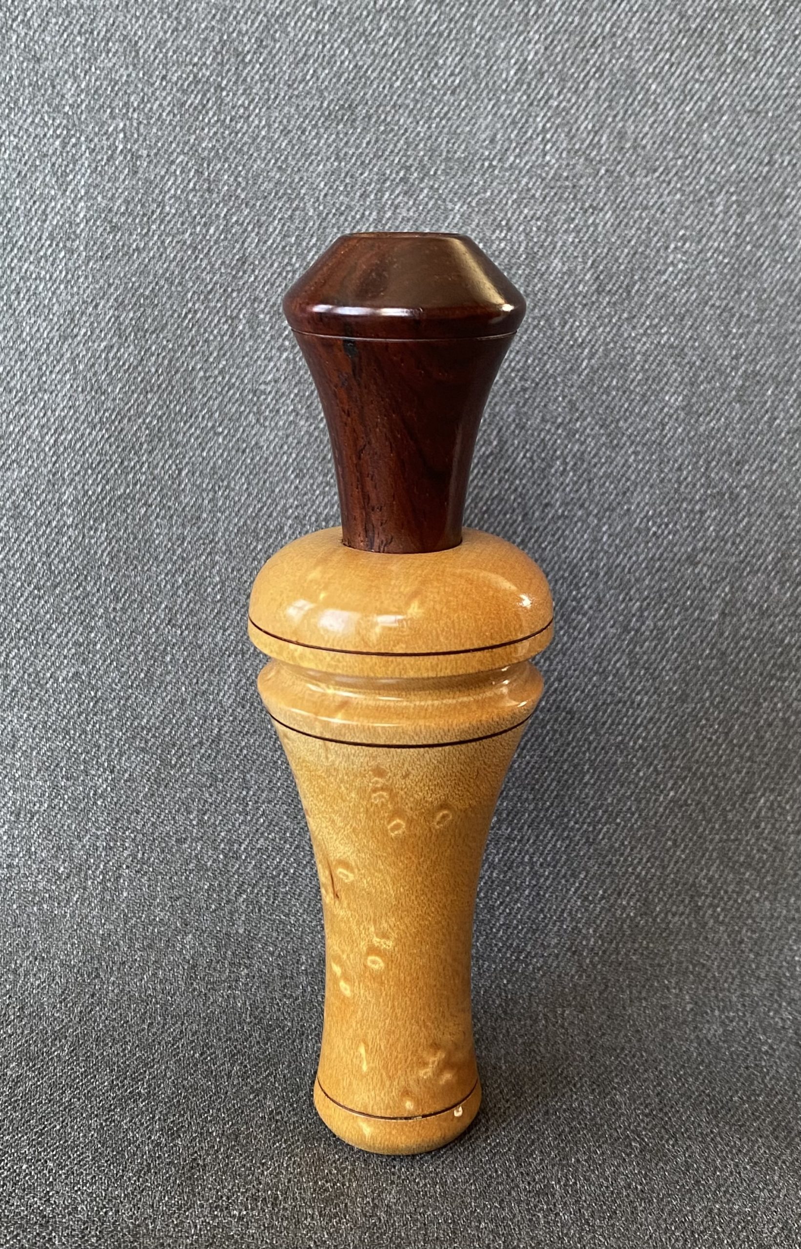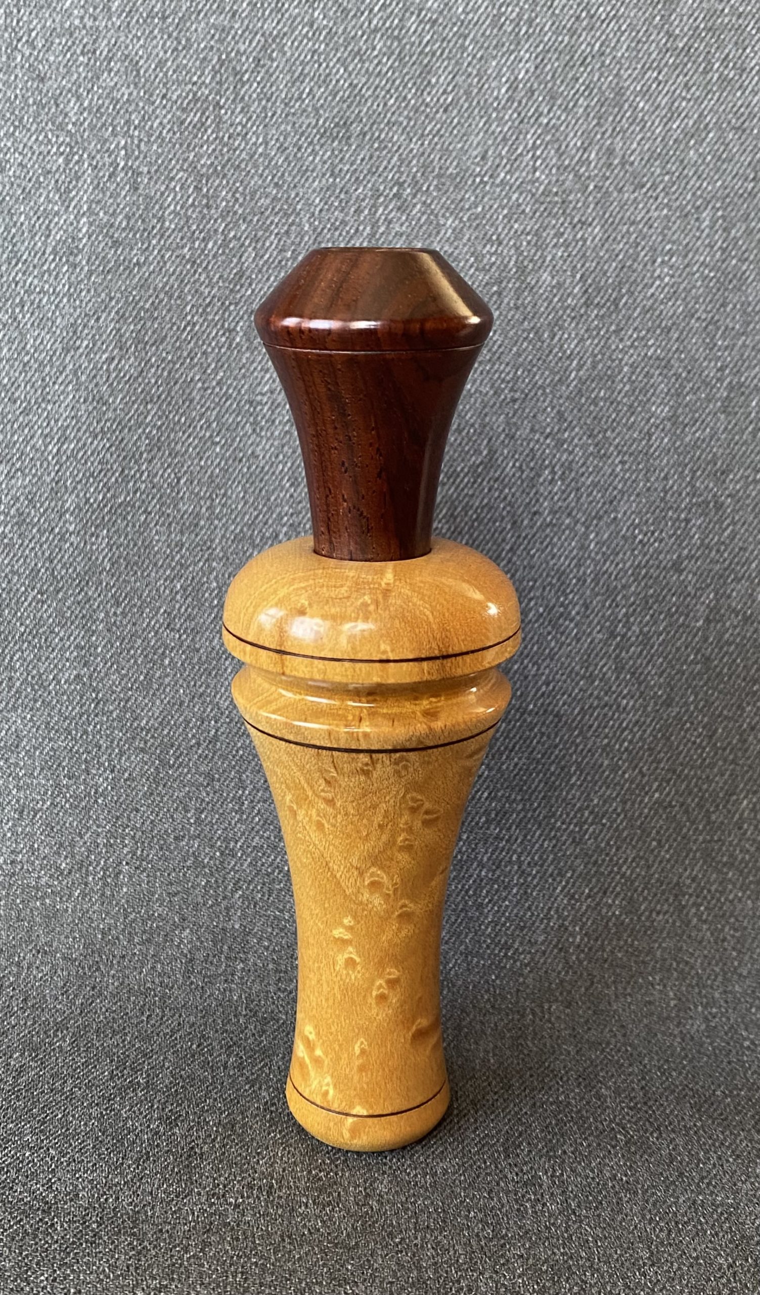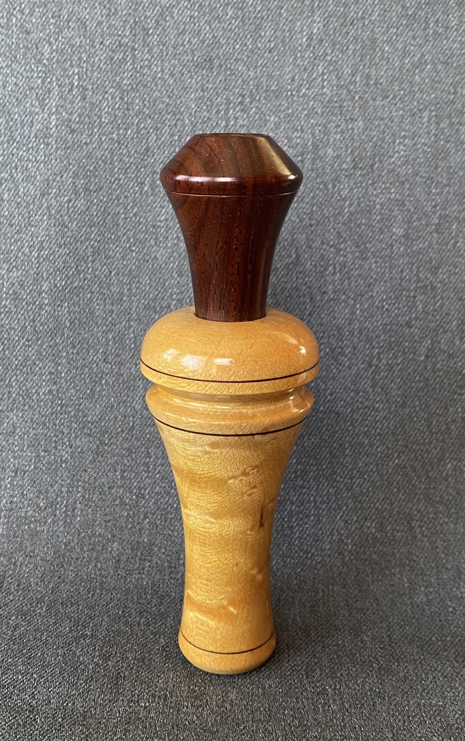 This a is a beautiful call from Buddy Duke. The barrel is turned from birdseye maple with a cocobolo stopper, with lacquer finish. It’s Arkansas style with an opaque plastic reed.