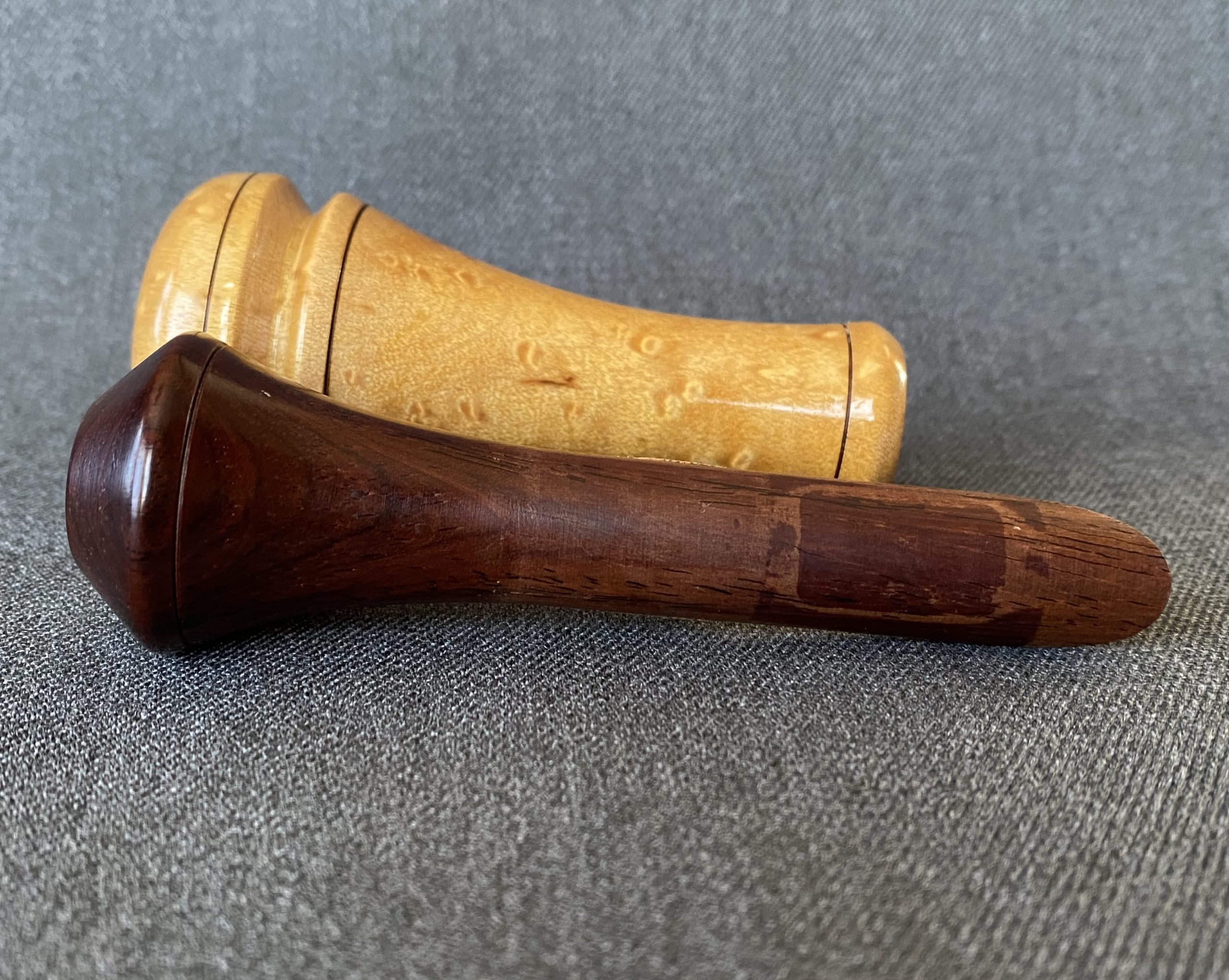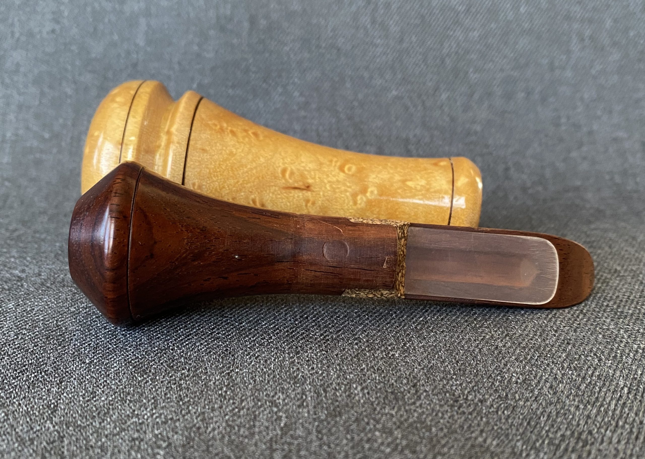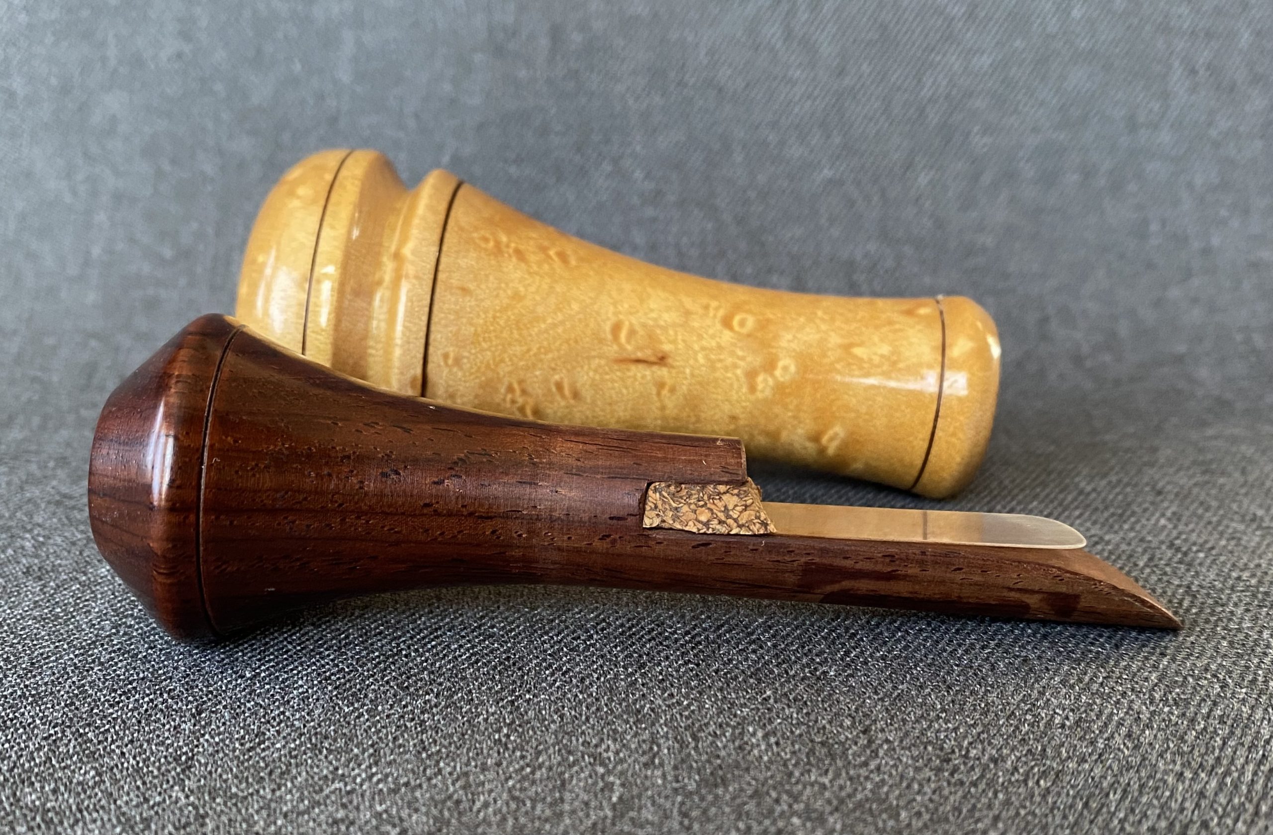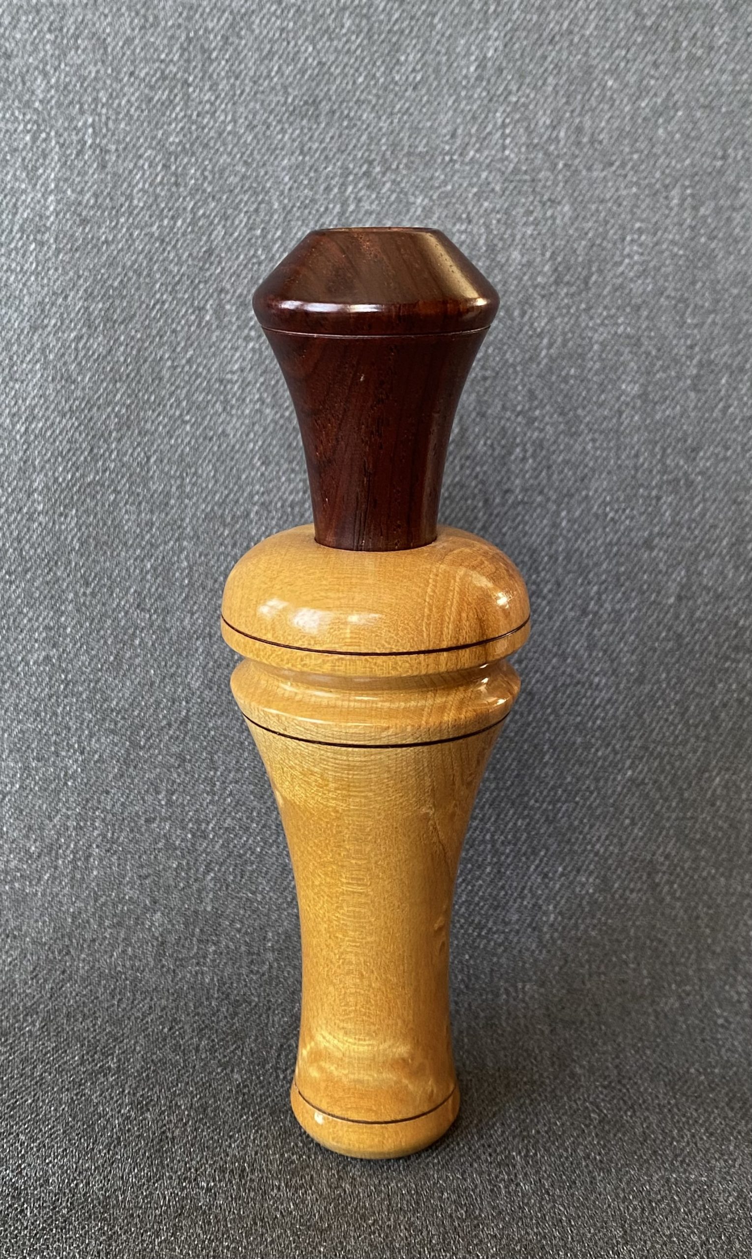This a is a beautiful call from Buddy Duke. The barrel is turned from birdseye maple with a cocobolo stopper, with lacquer finish. It’s Arkansas style with an opaque plastic reed.