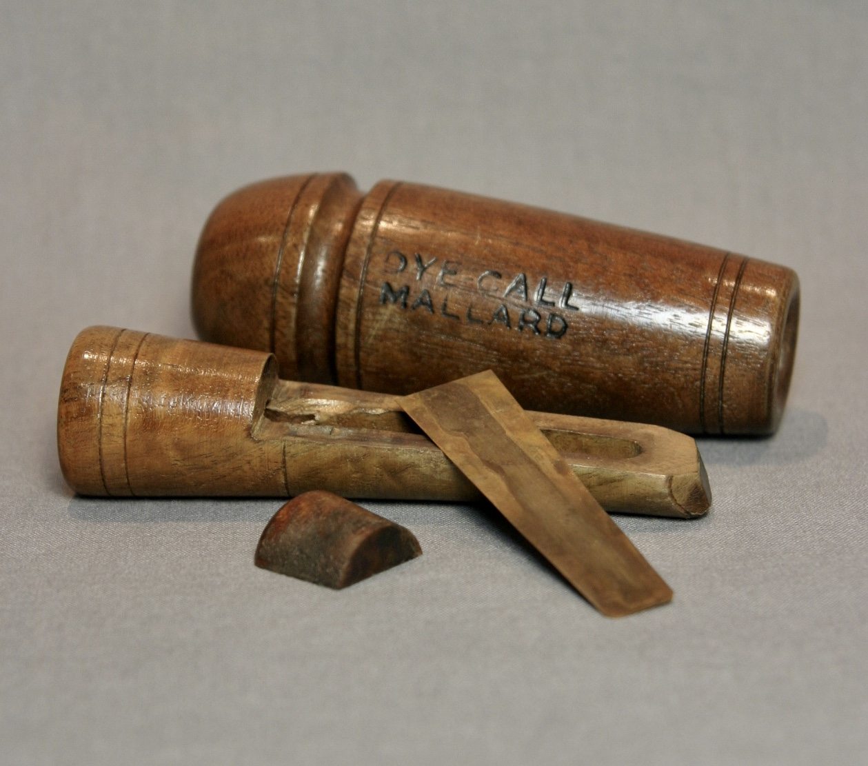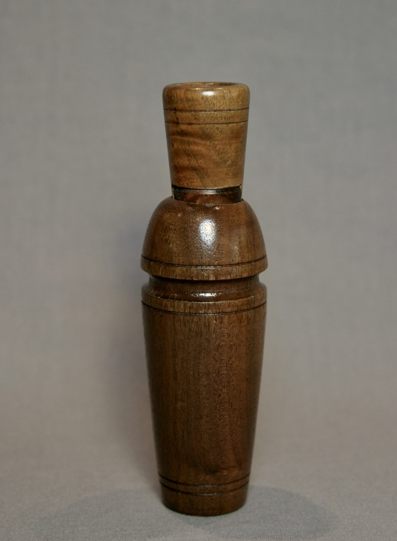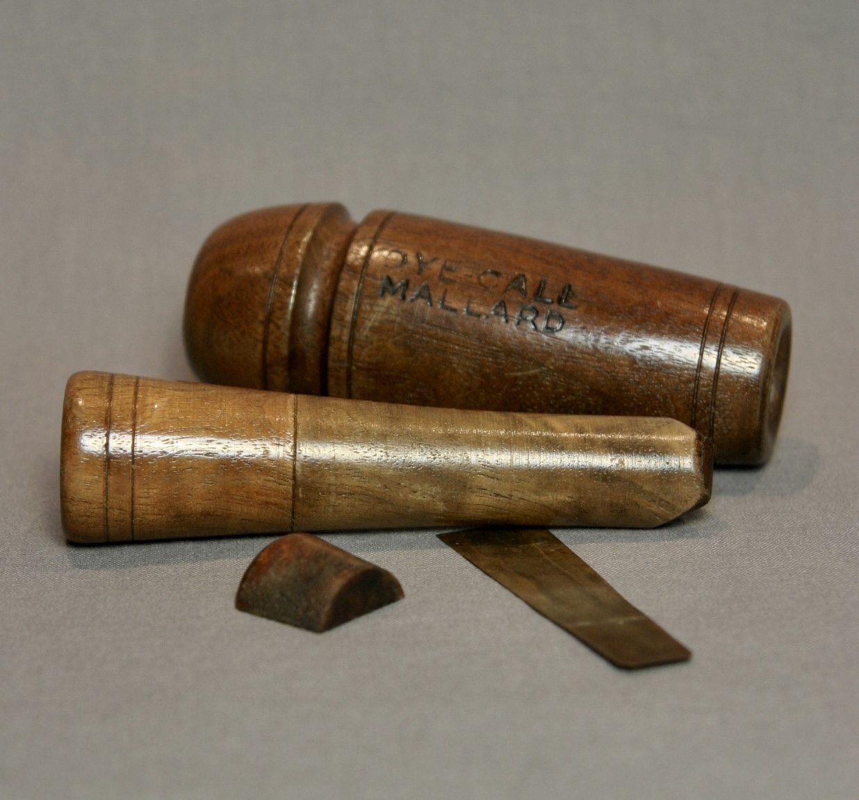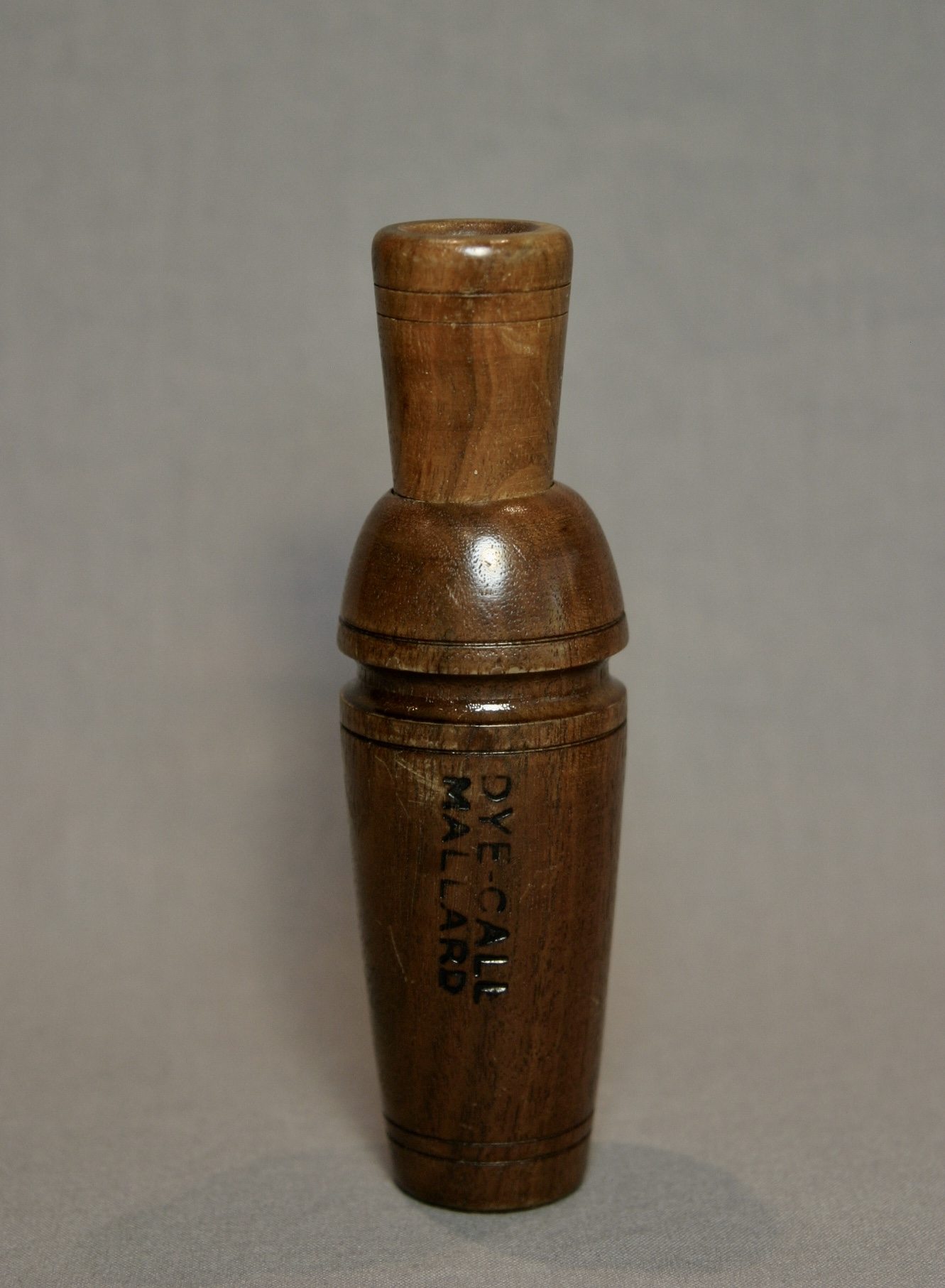A nice Dye Duck Mallard from Harry Dye. The call is turned from walnut and has an oil finish. It’s Reelfoot style with a metal reed.