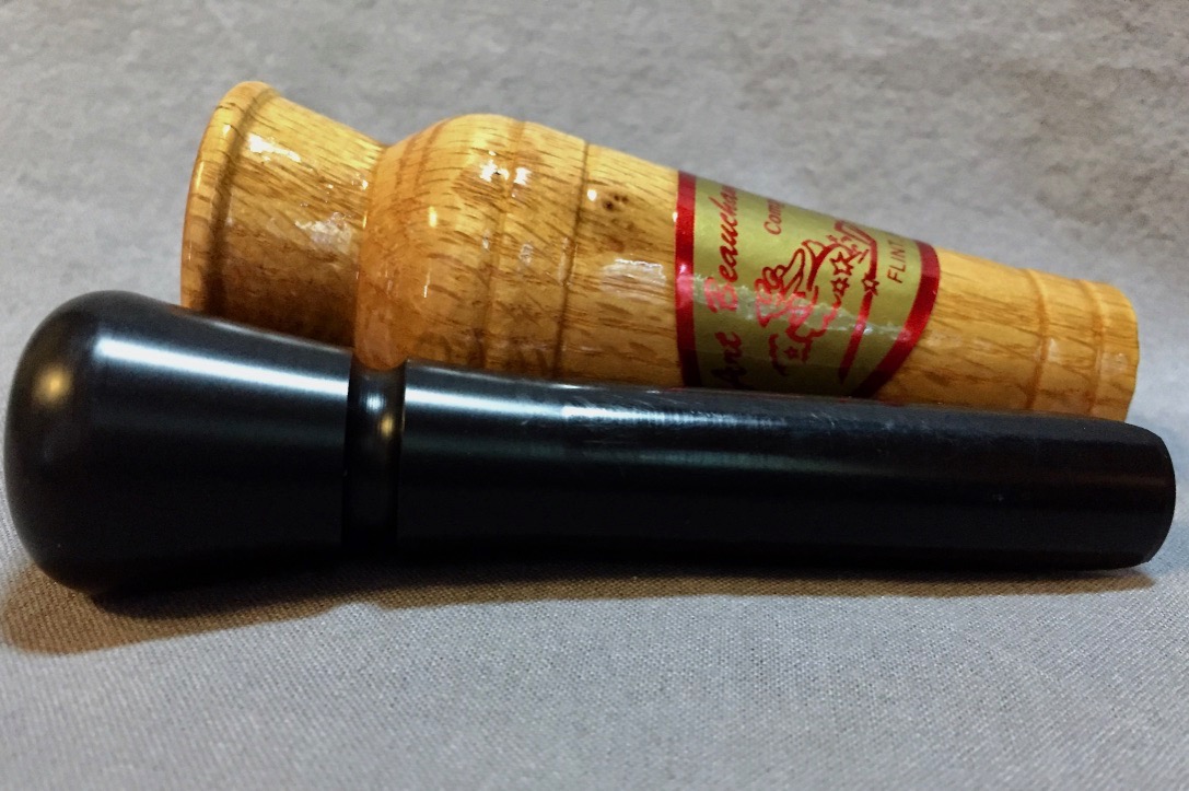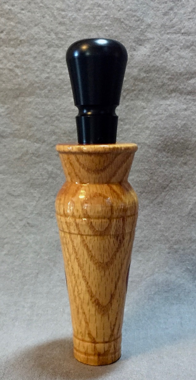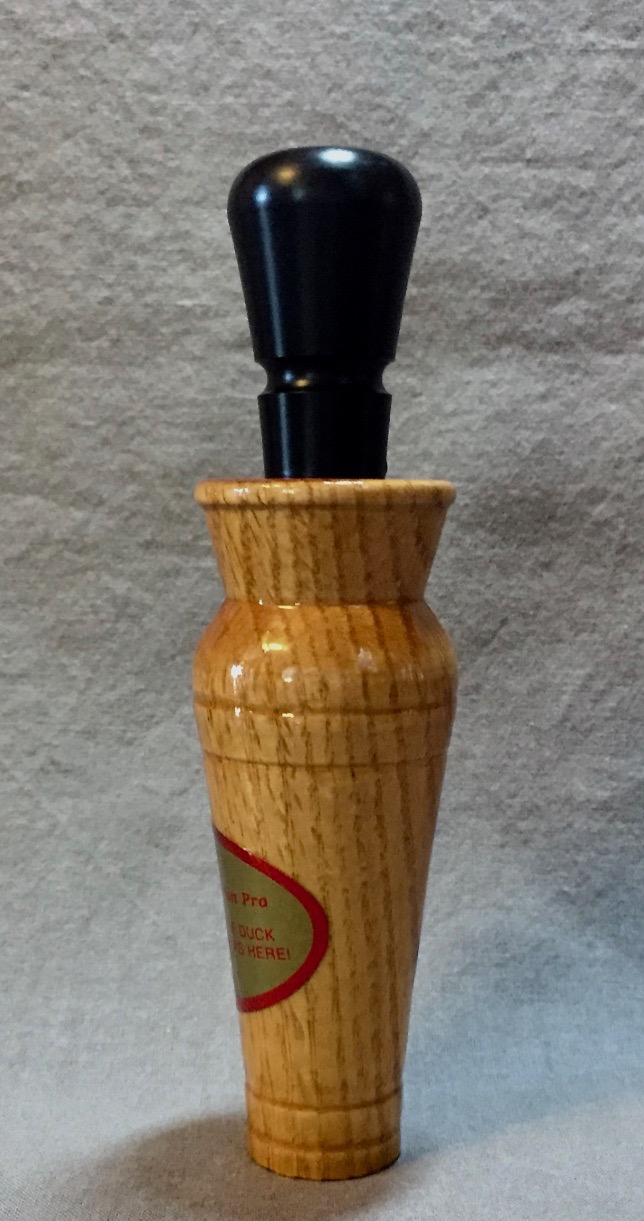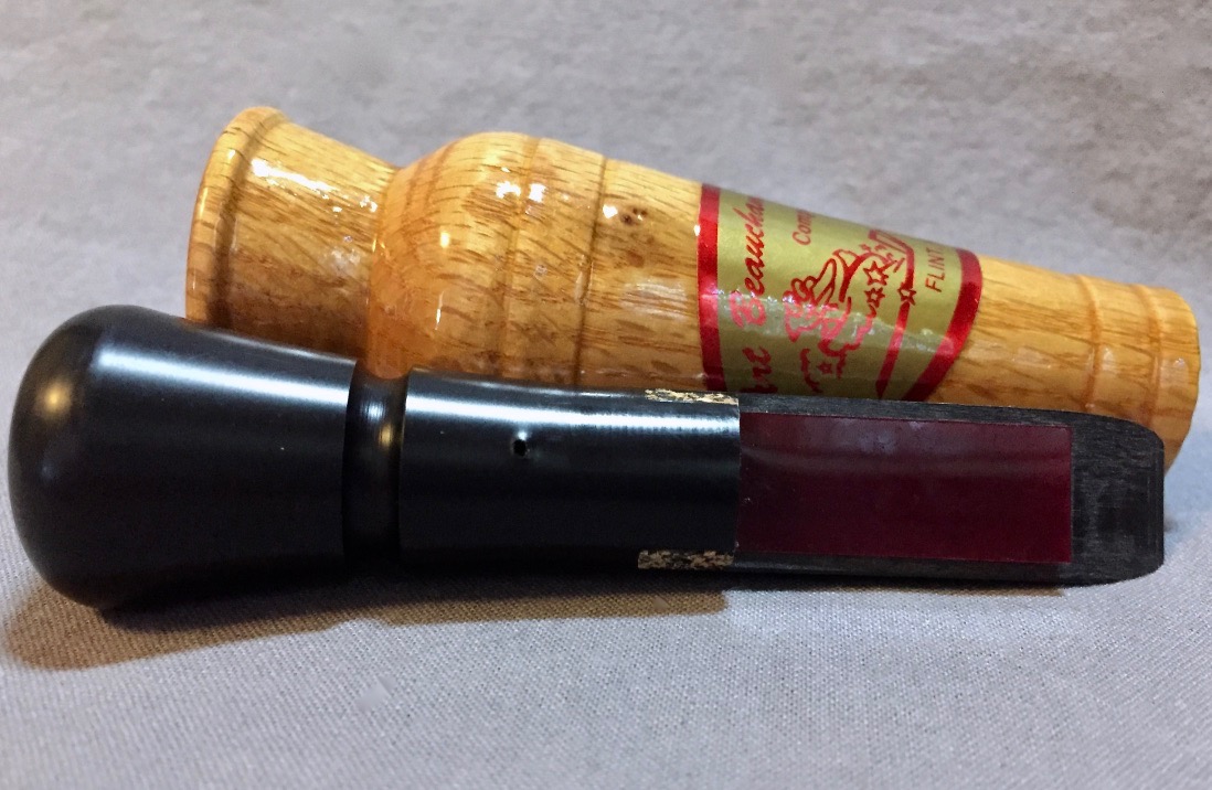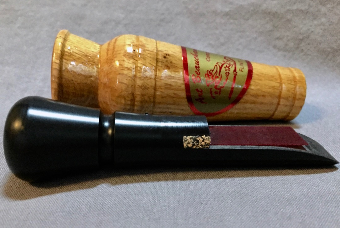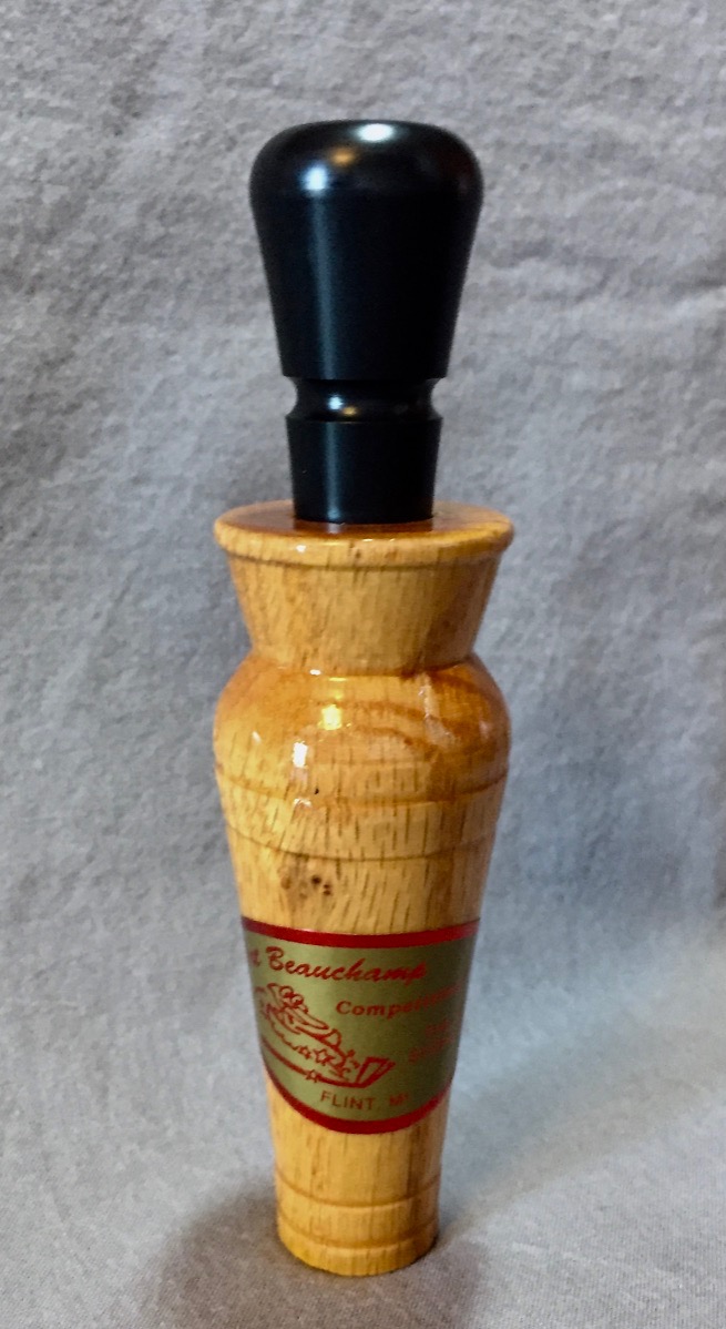 A nice maple and dark wood call from Art Beauchamp, the Competition Pro. It’s Arkansas style with a plastic reed. The call is in great condition.