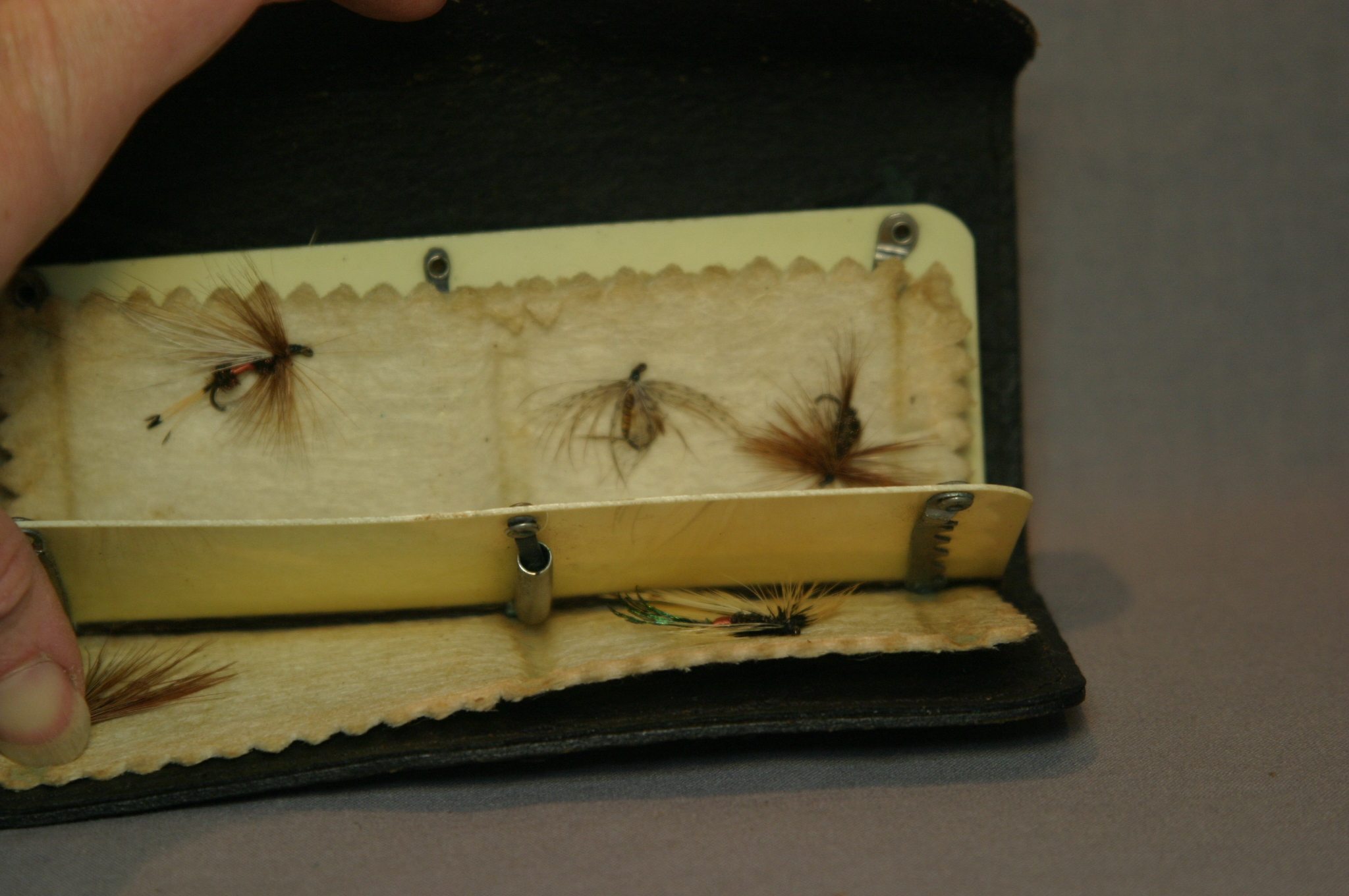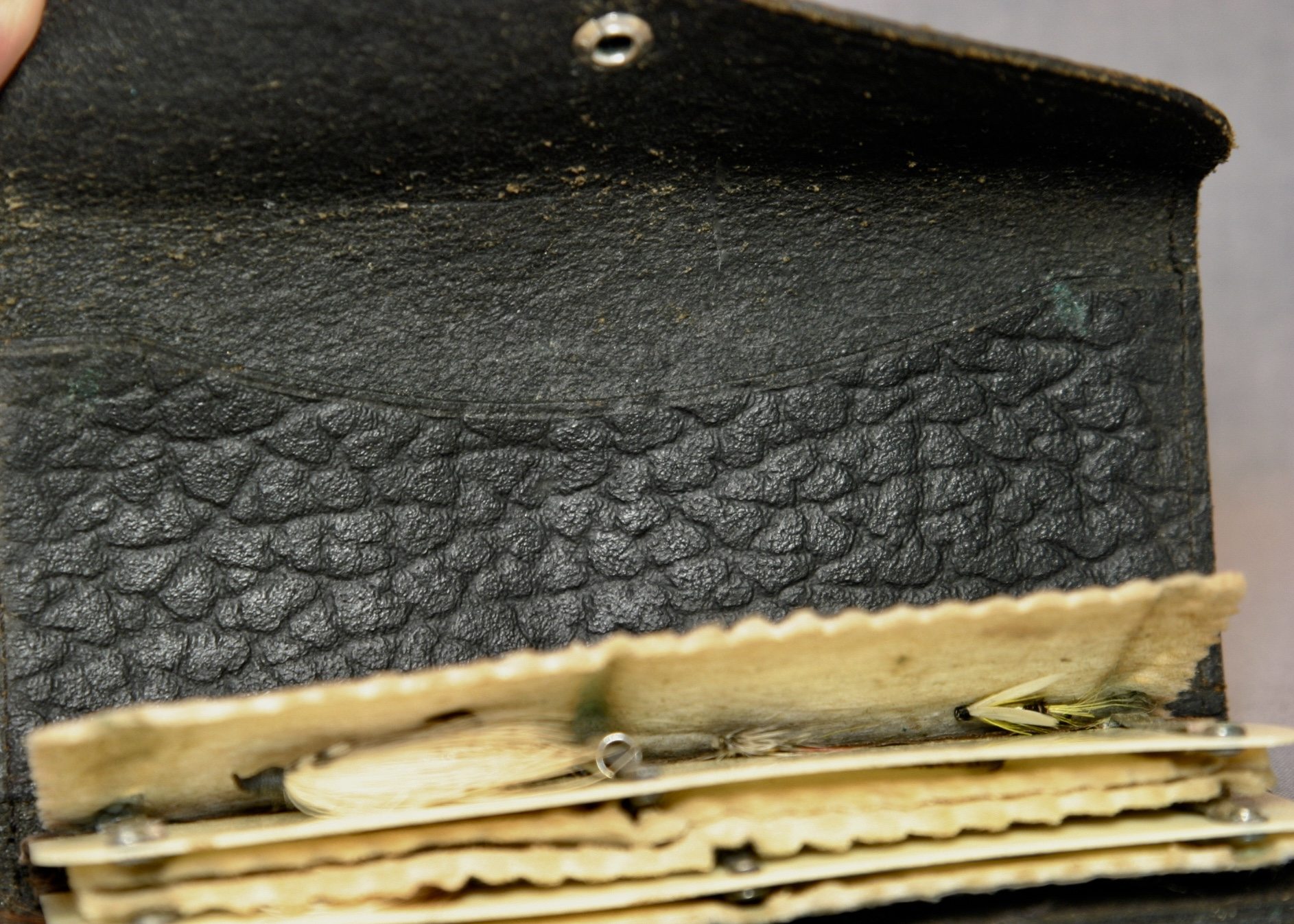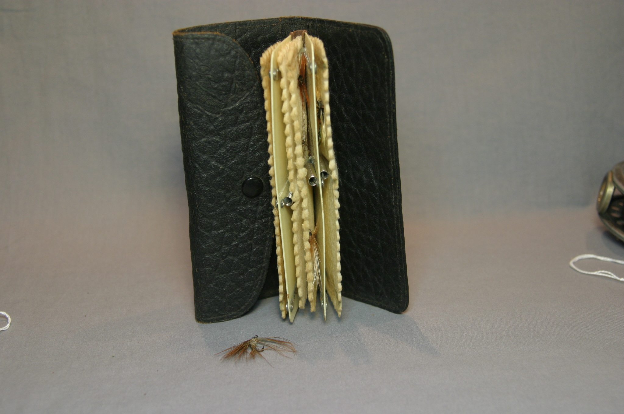 This is a nice English fly wallet with embossed black cowhide leather and felt pages. The wallet has 2 dozen flies, some flies with leaders.