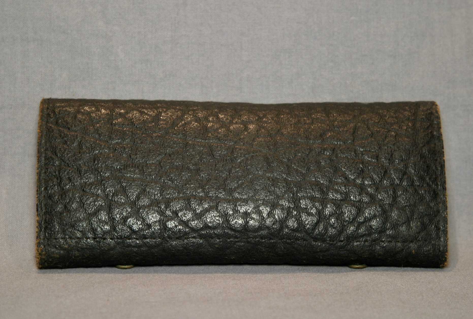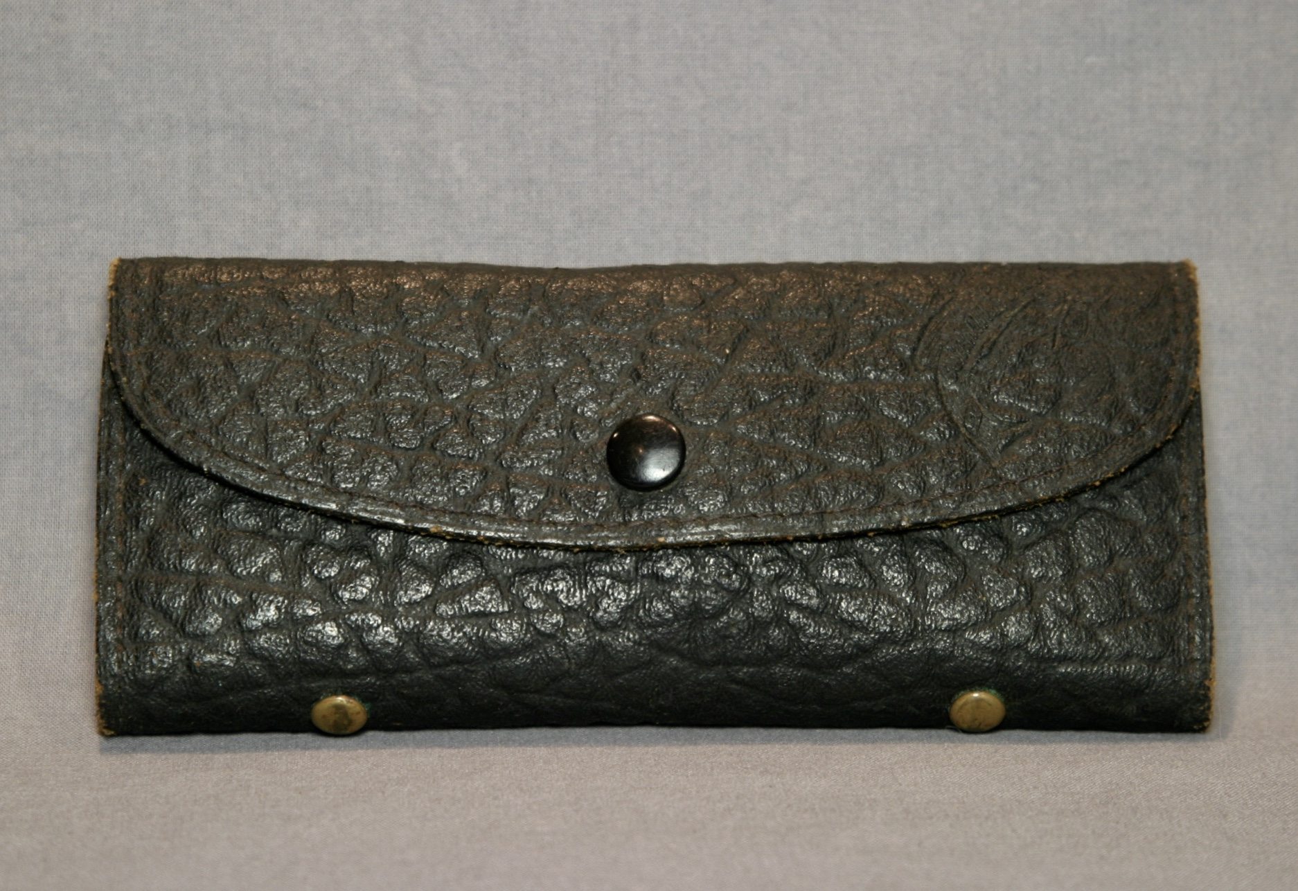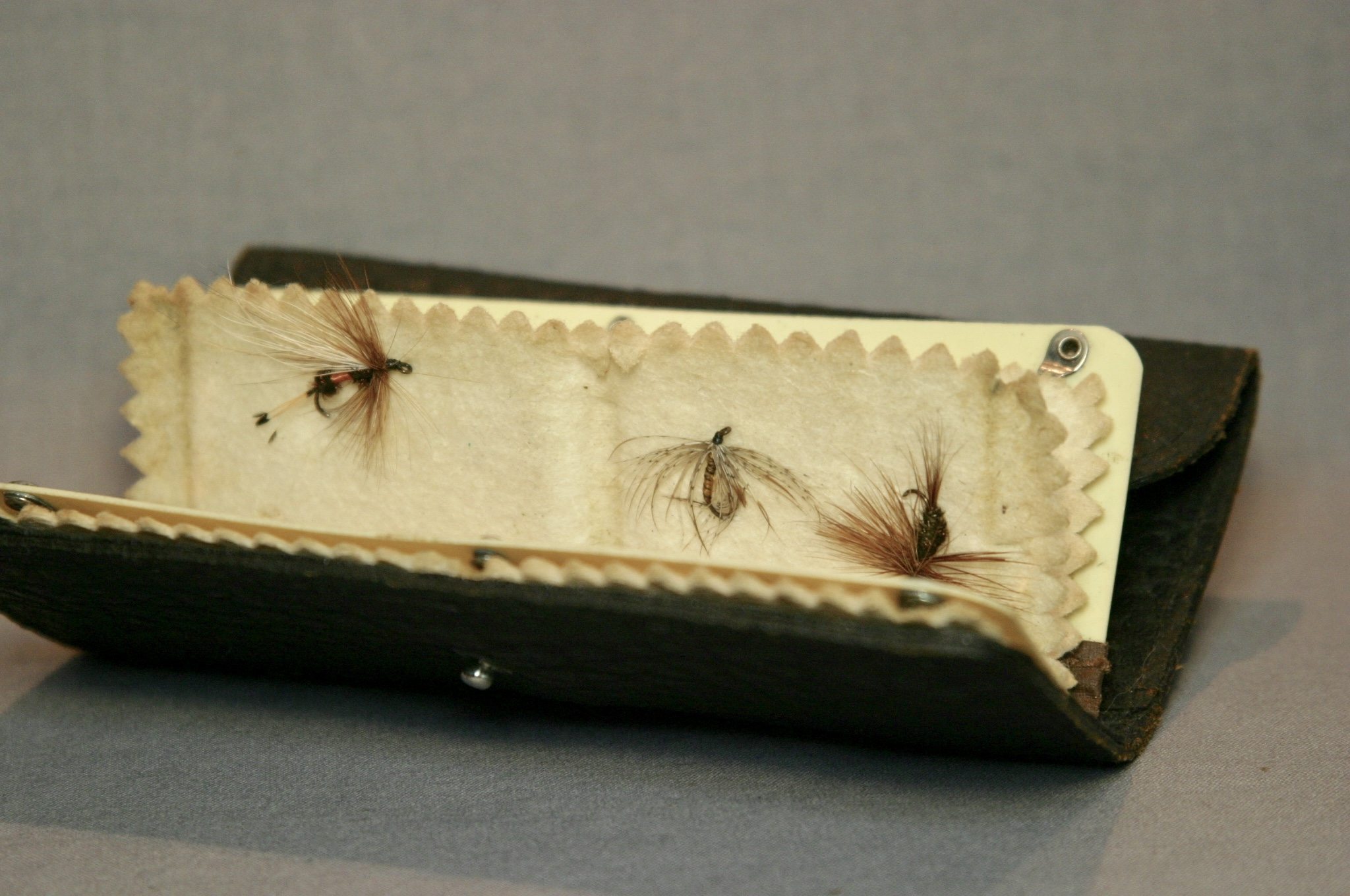 This is a nice English fly wallet with embossed black cowhide leather and felt pages. The wallet has 2 dozen flies, some flies with leaders.