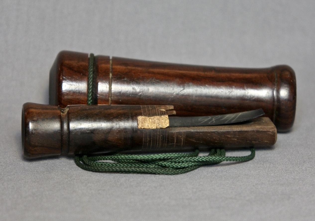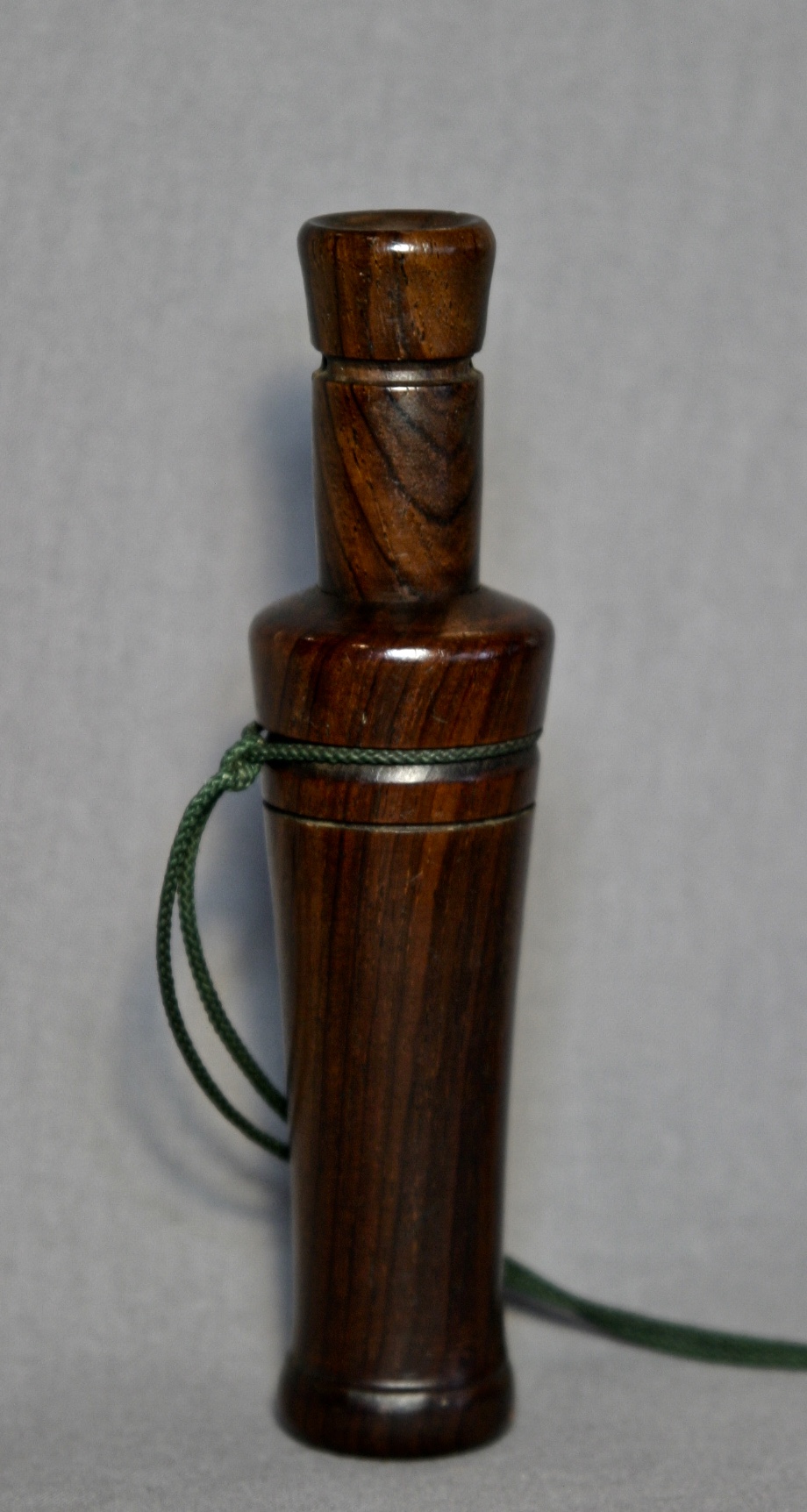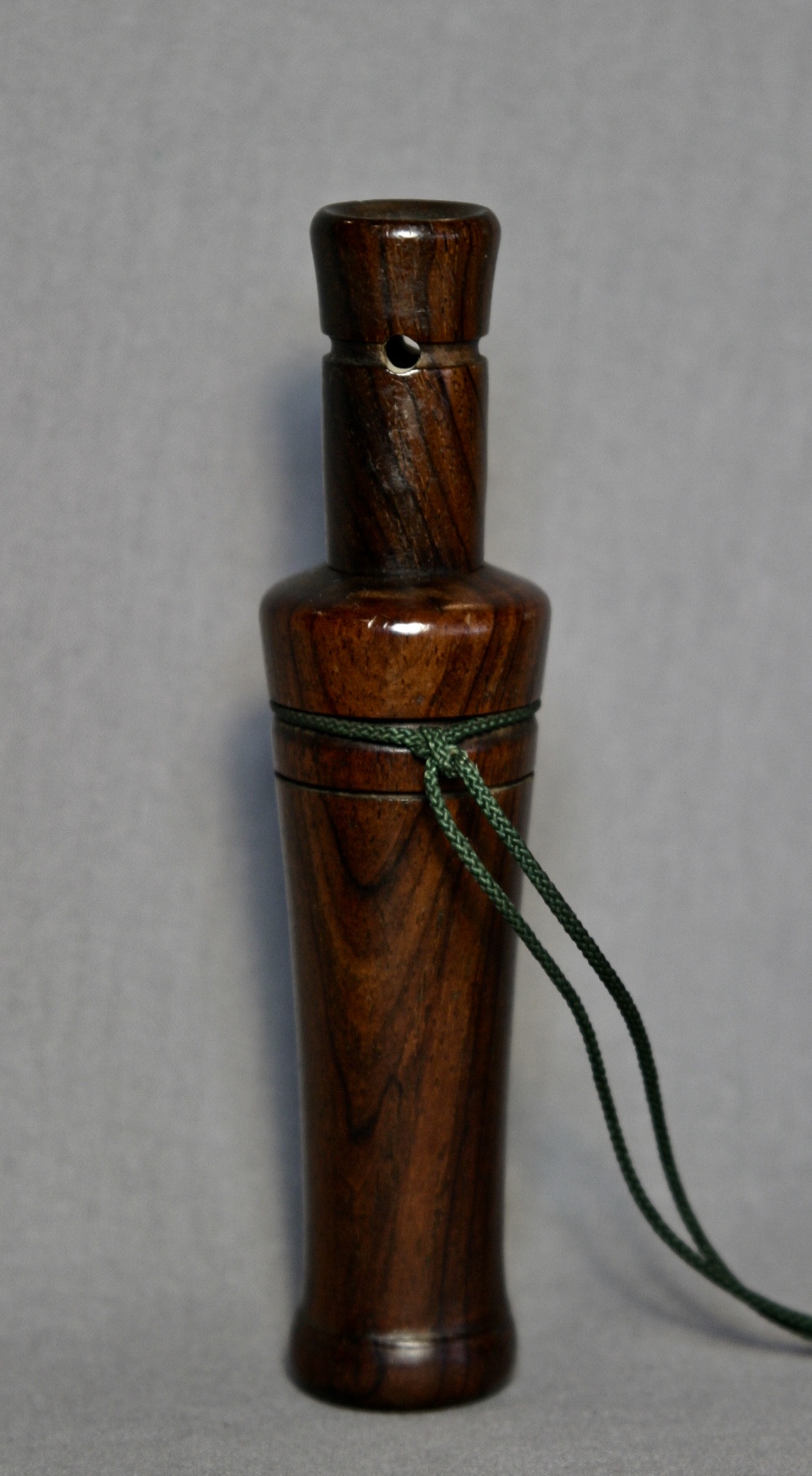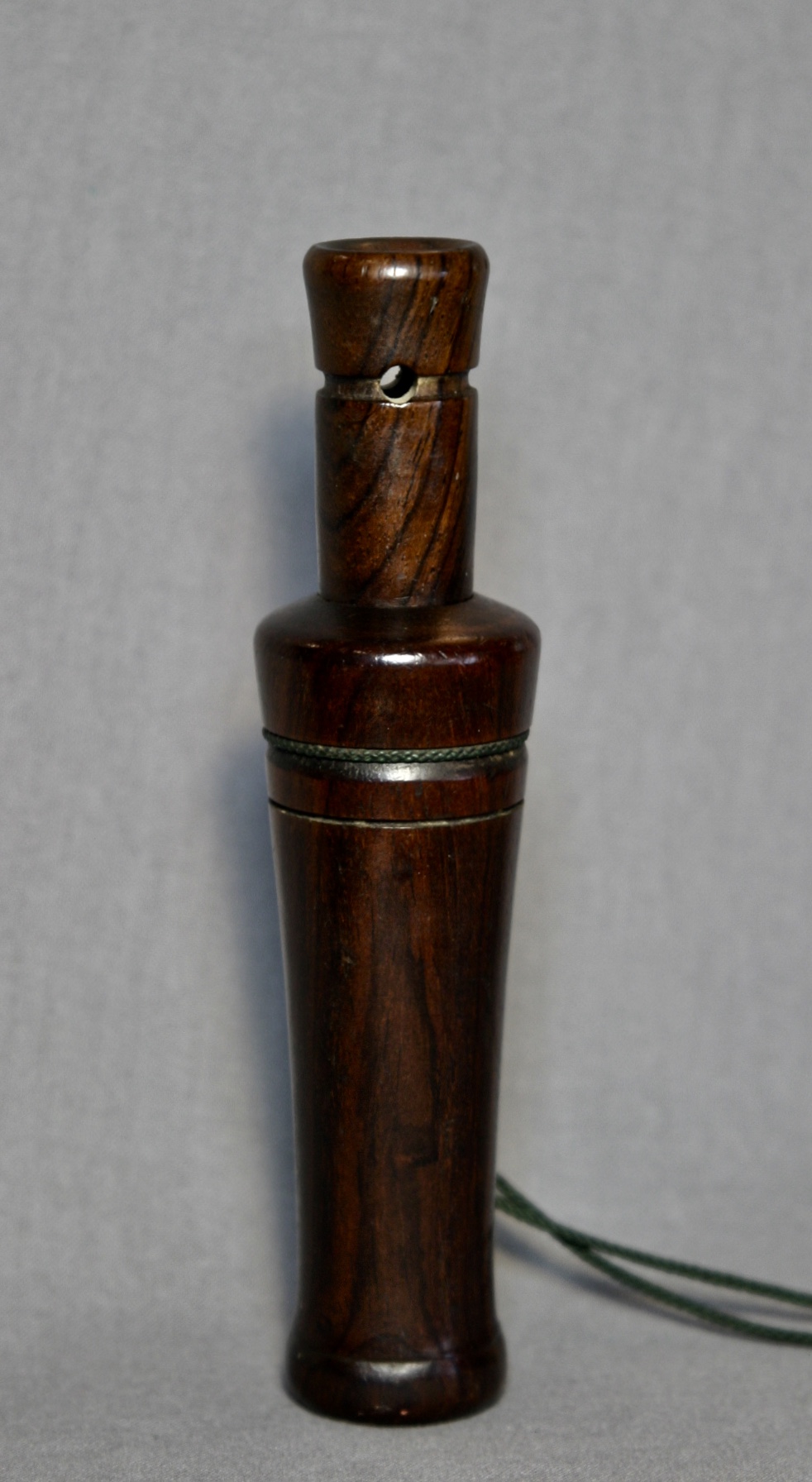 This is a very early New York style call from EV Iverson, called the Old Style Standard Call. A great walnut call with a plastic reed and green lanyard. 984L written on the stopper indicates the style of call and the size of reed.