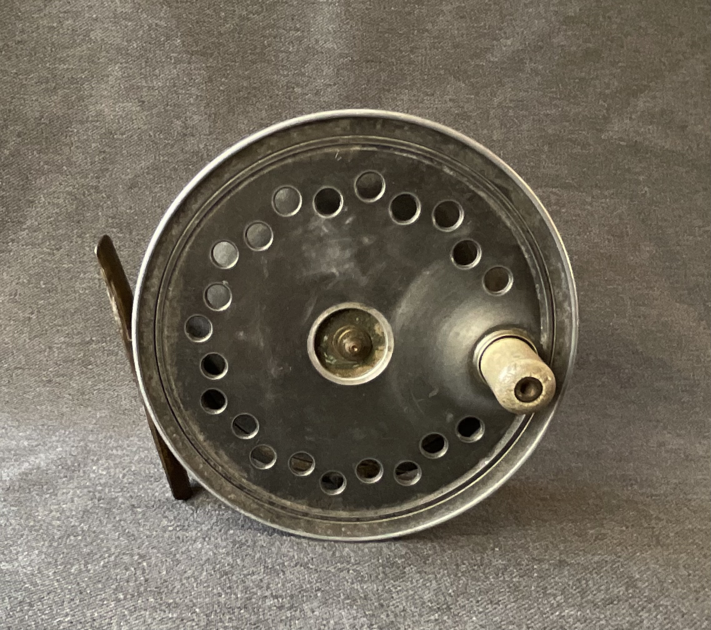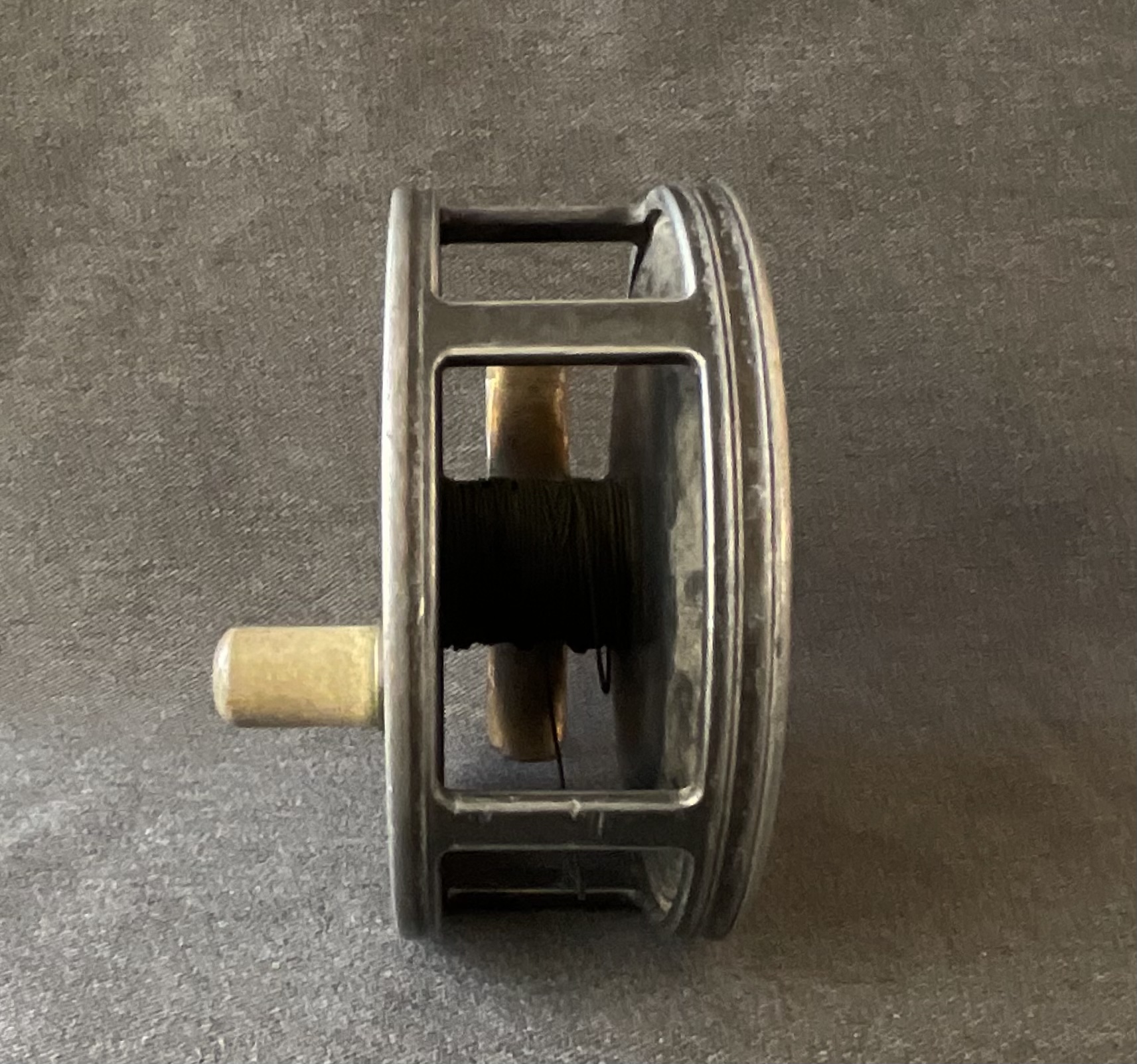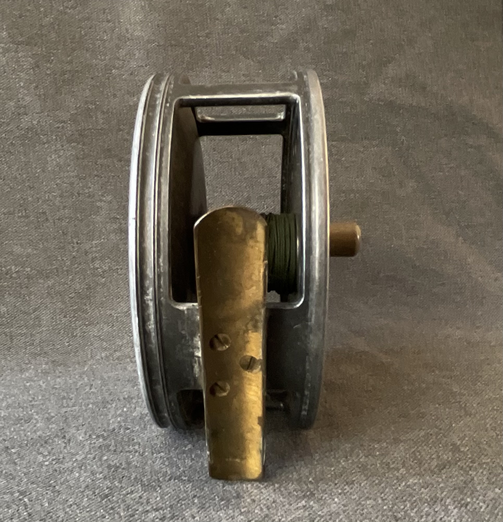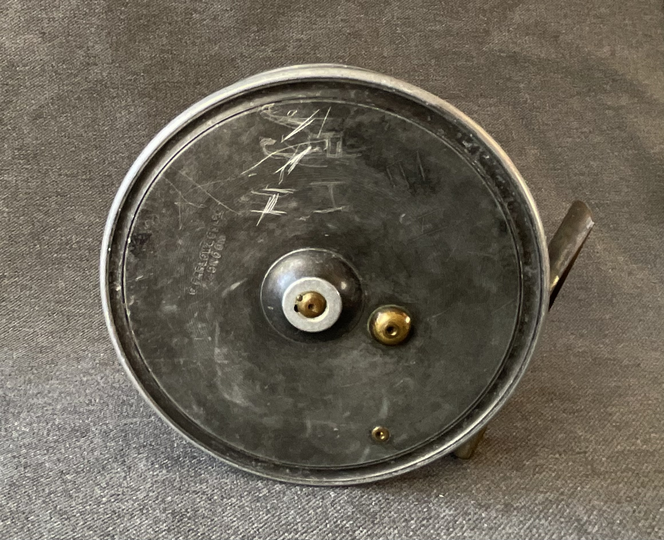 A large old C. Farlow & Co Ltd reel with a brass foot. The reel is in good condition, it appears someone carved initials into one side years ago.