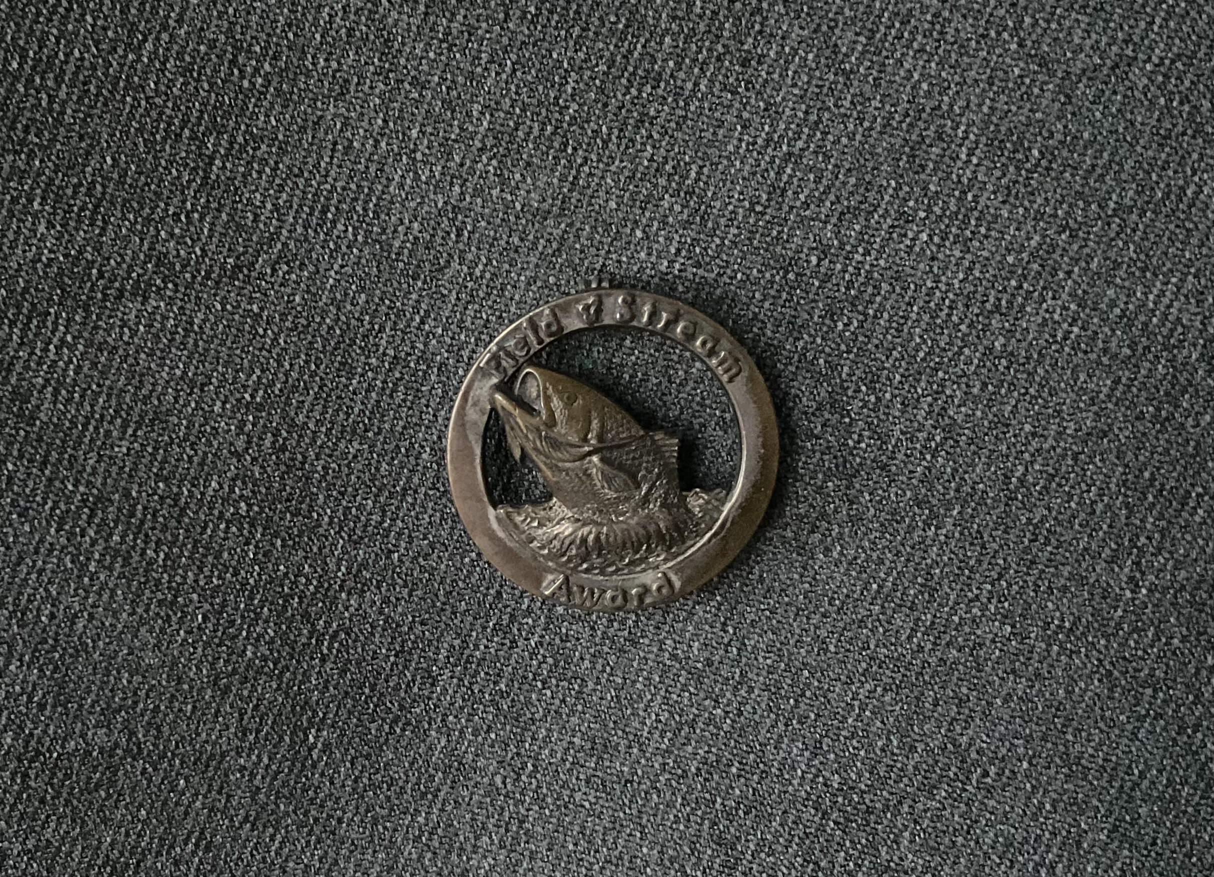 A brass 38 pound 8 ounce Field & Stream Black Bass Award pin.