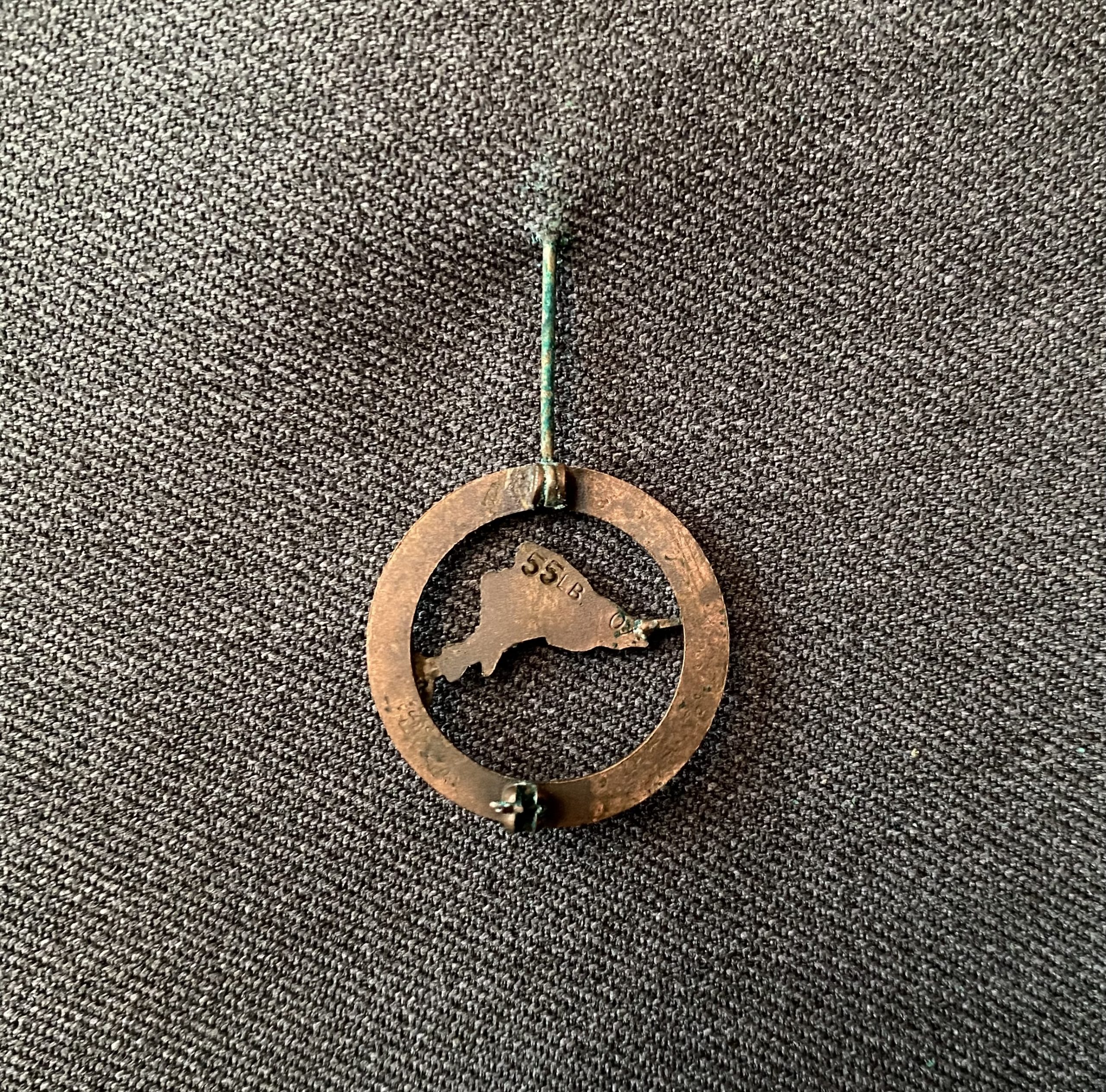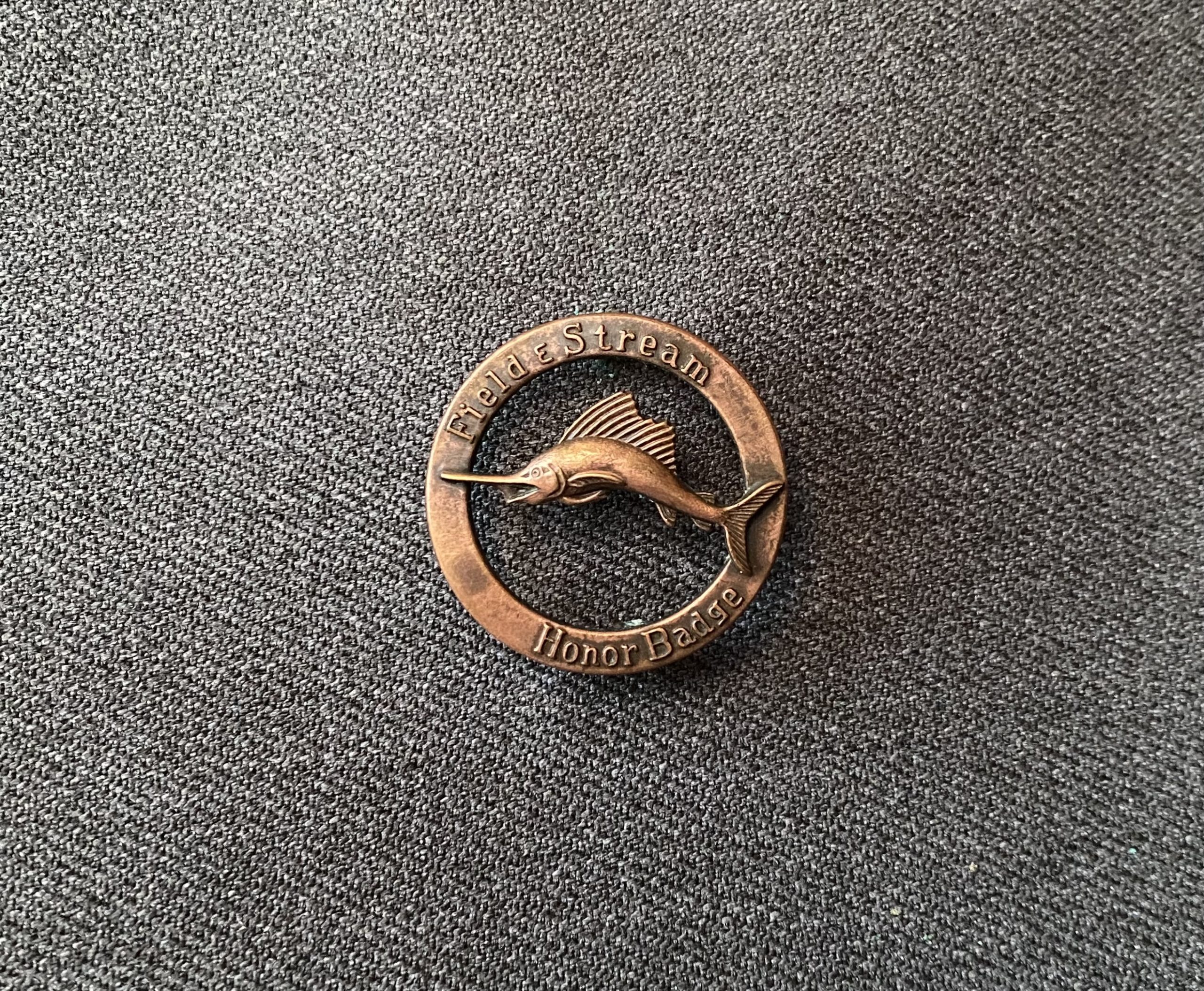 A copper Field & Stream 55 pound sailfish honor badge pin.