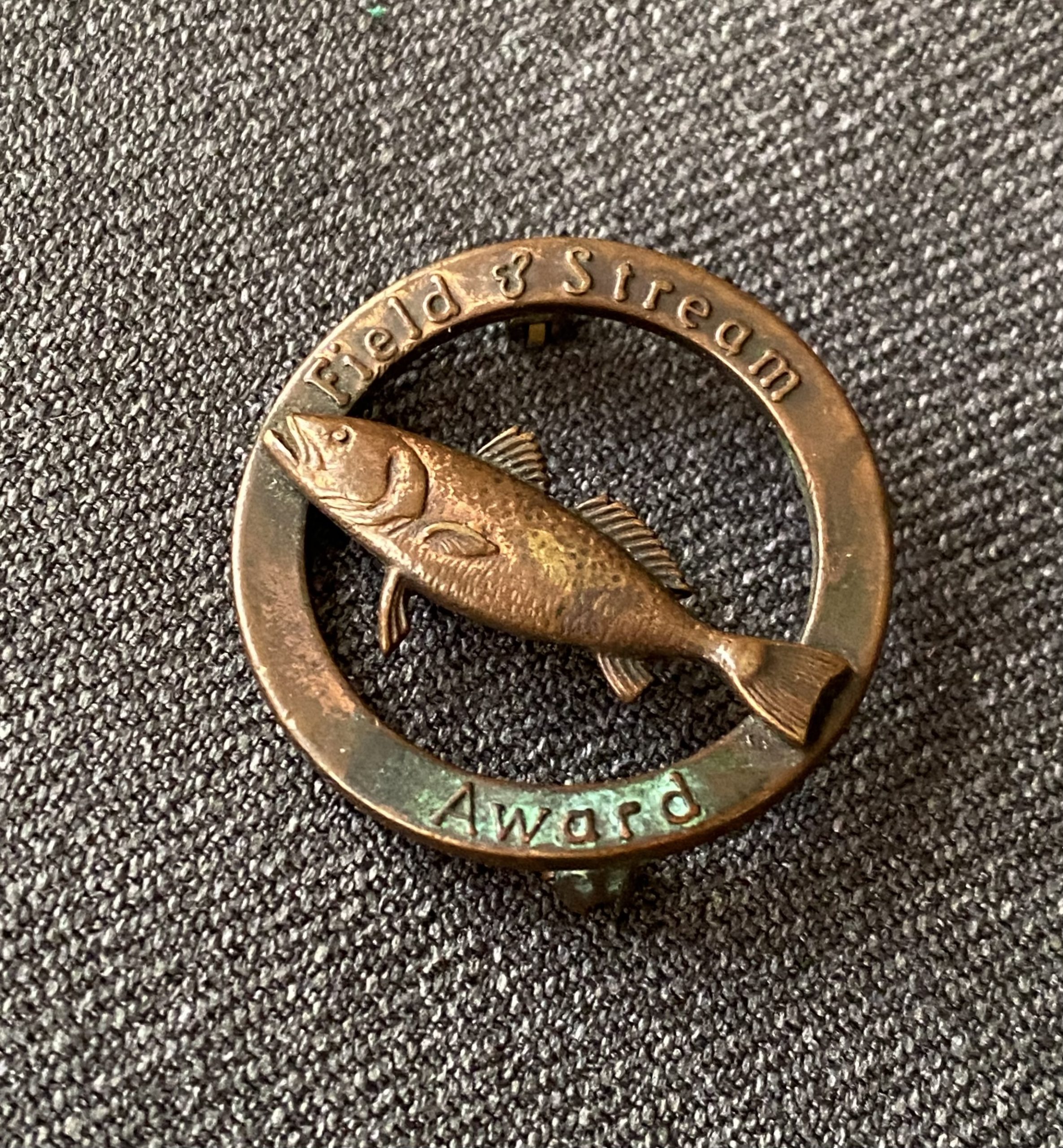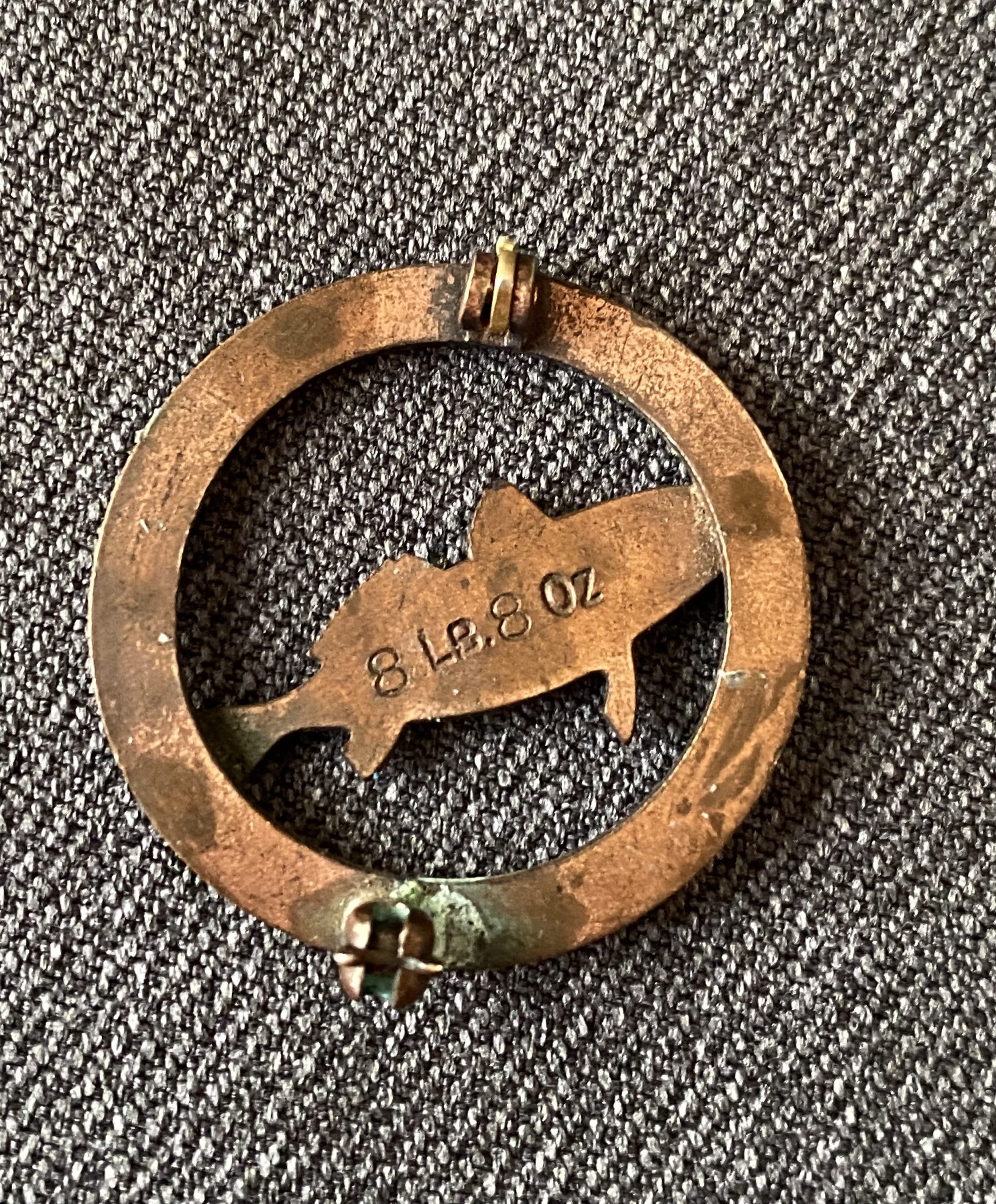 A copper 8 pound 8 ounce Field & Stream Weakfish Honor Badge pin.