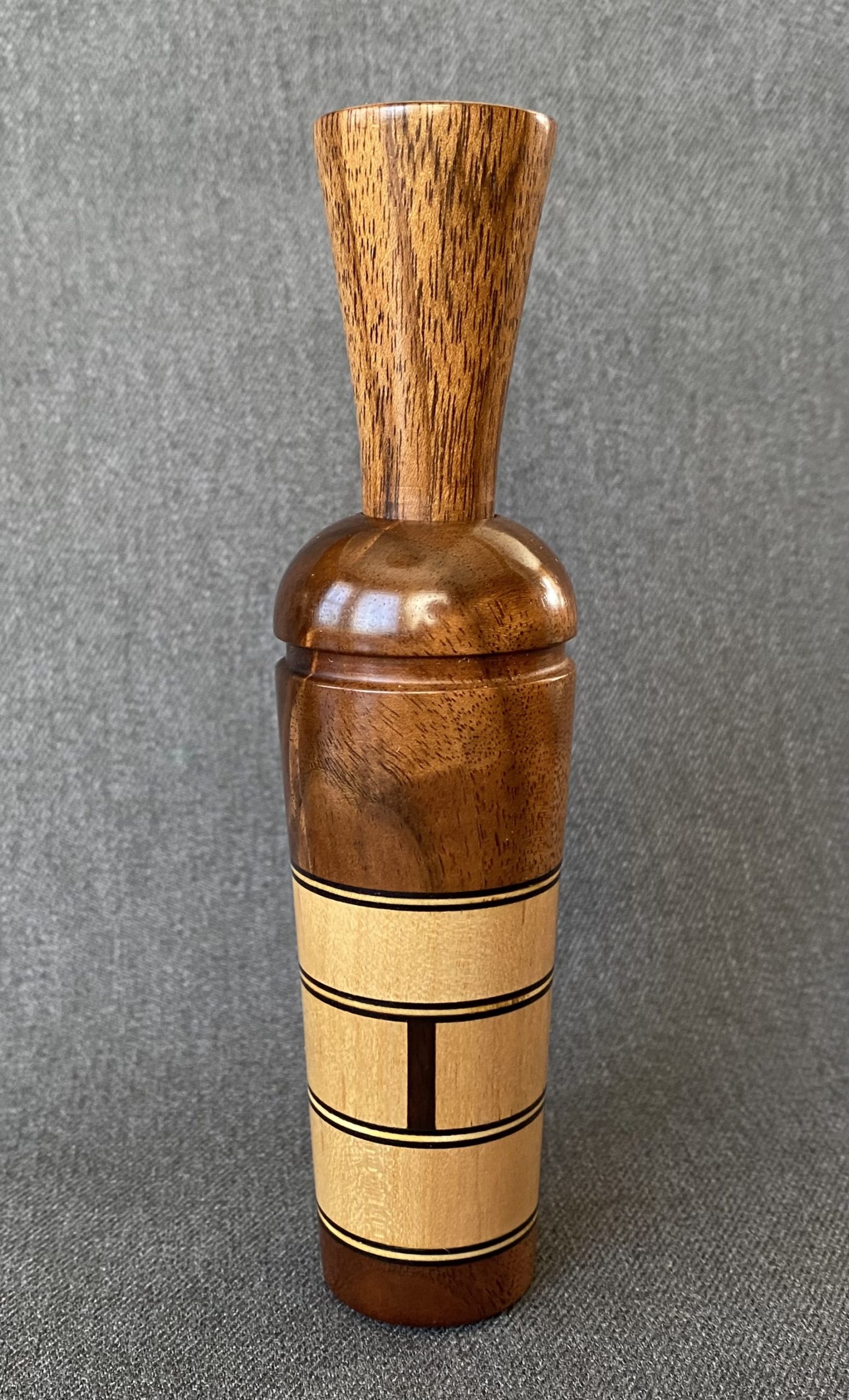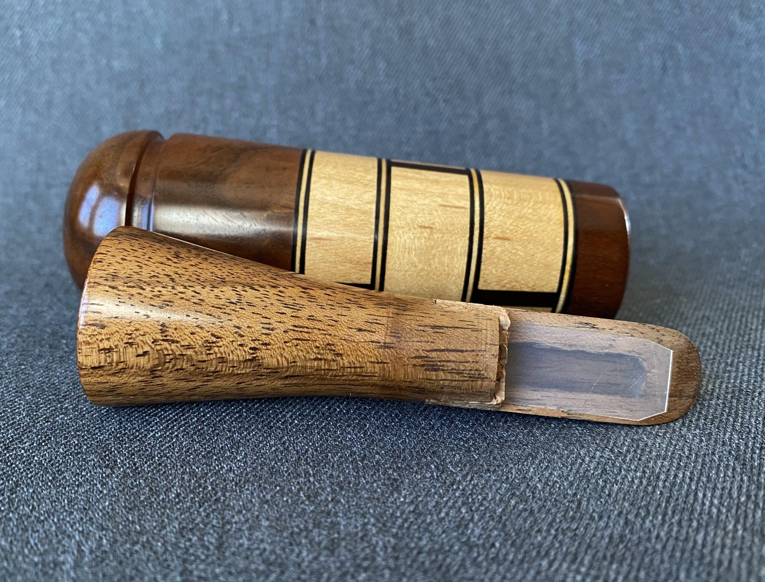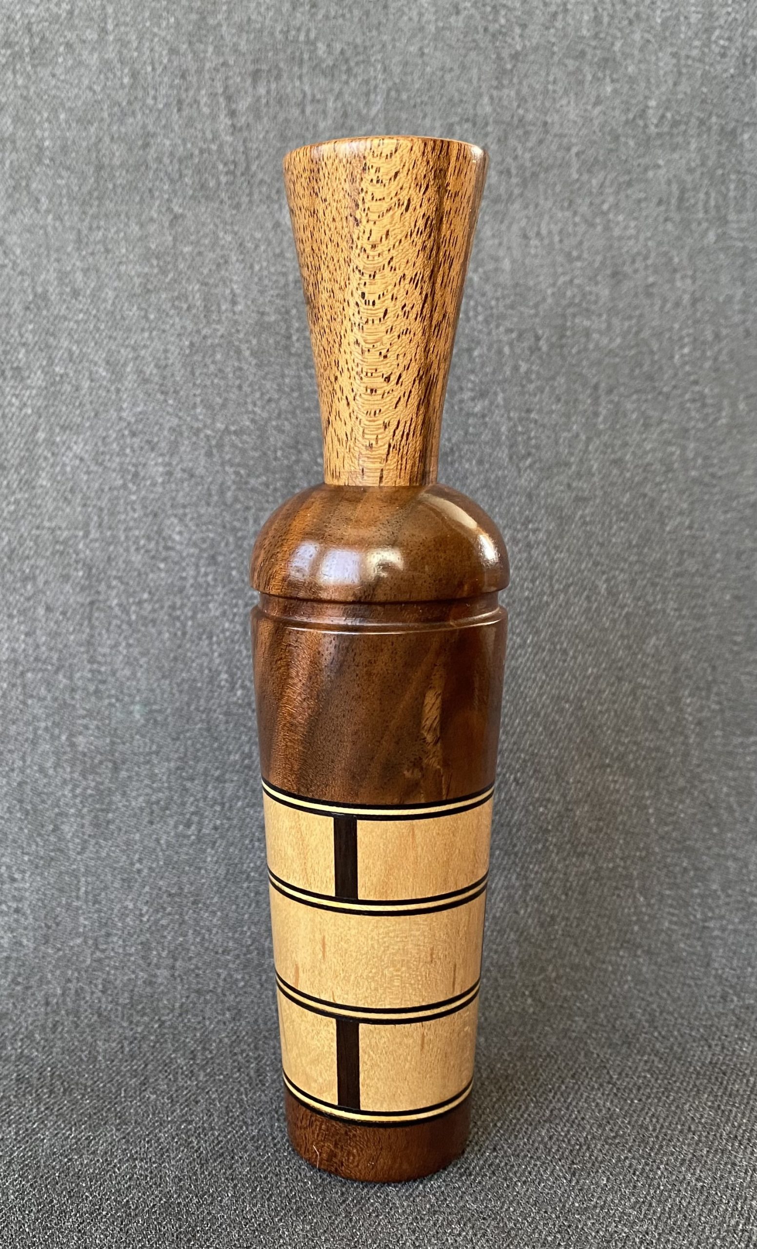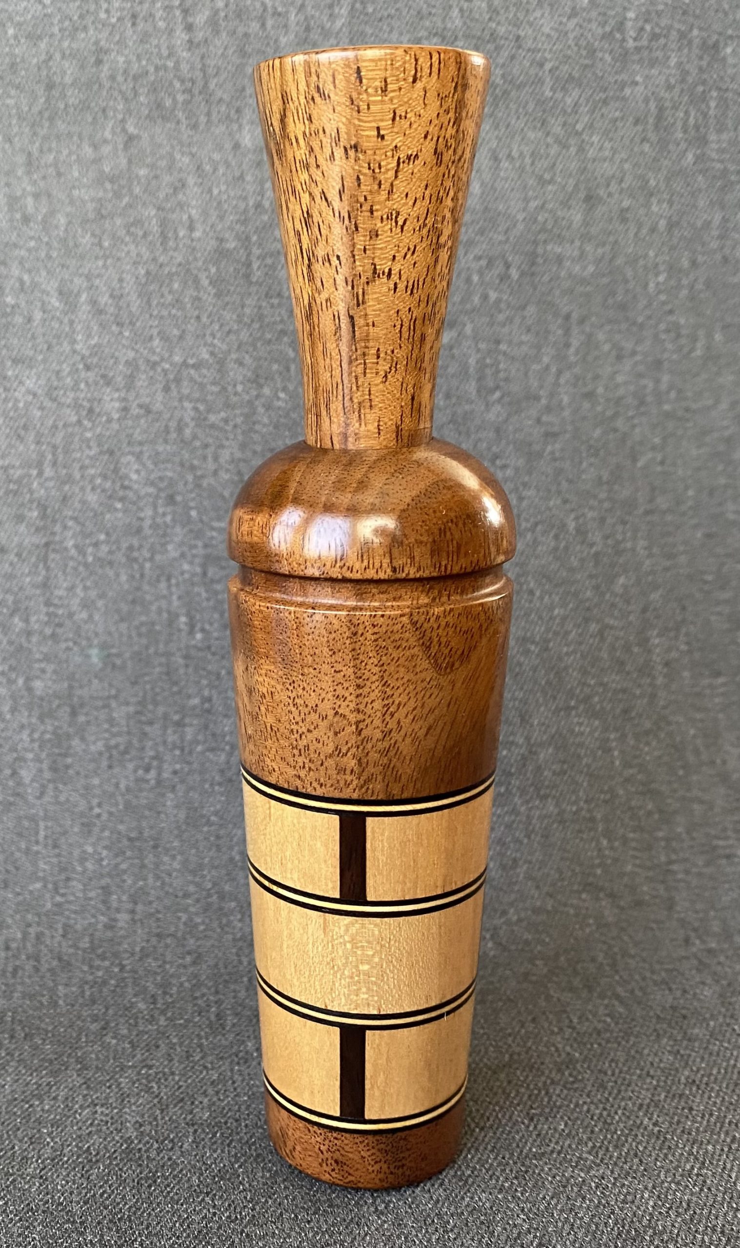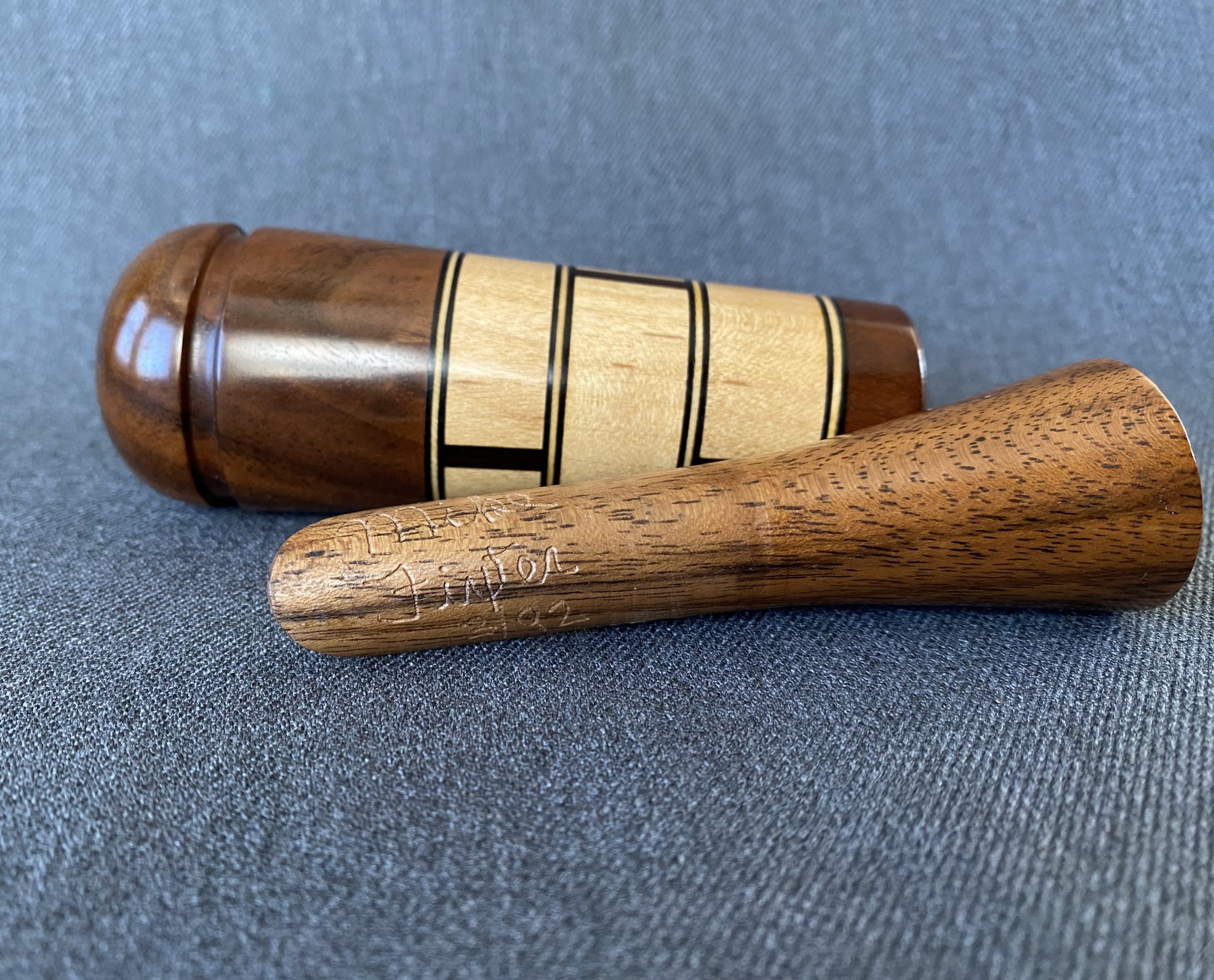This is a beautiful laminated call from Mike Fixter. The call is Arkansas style with a plastic reed. The call is signed (engraved) on the stopper by Fixter, Mike Fixter 3/92.