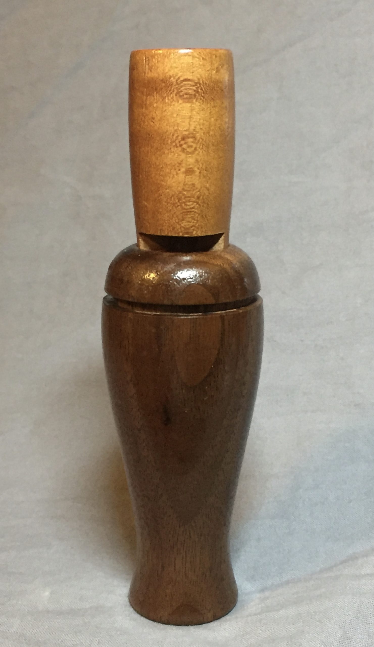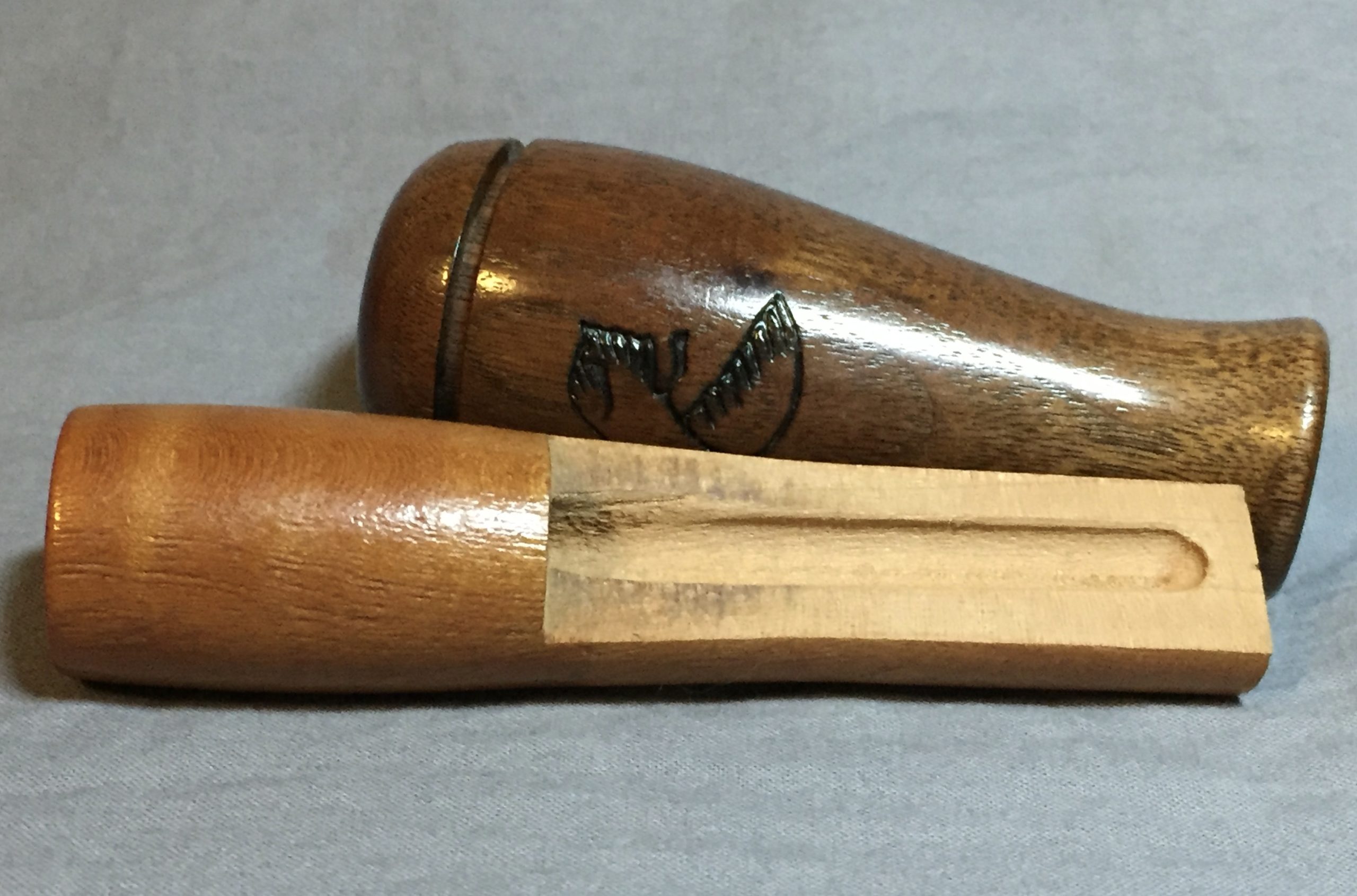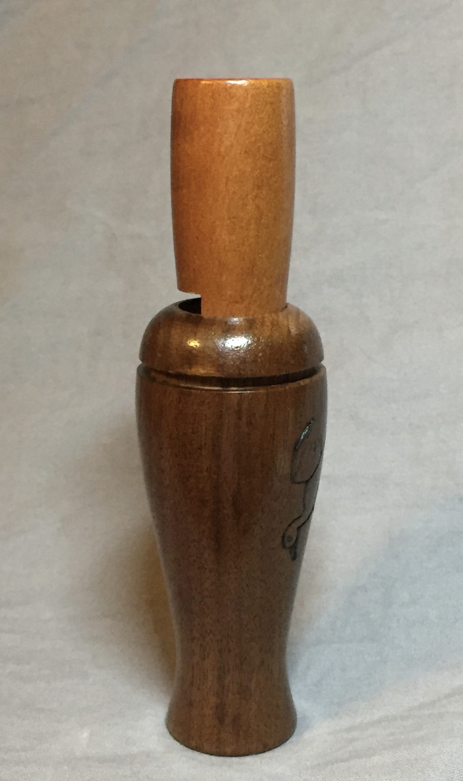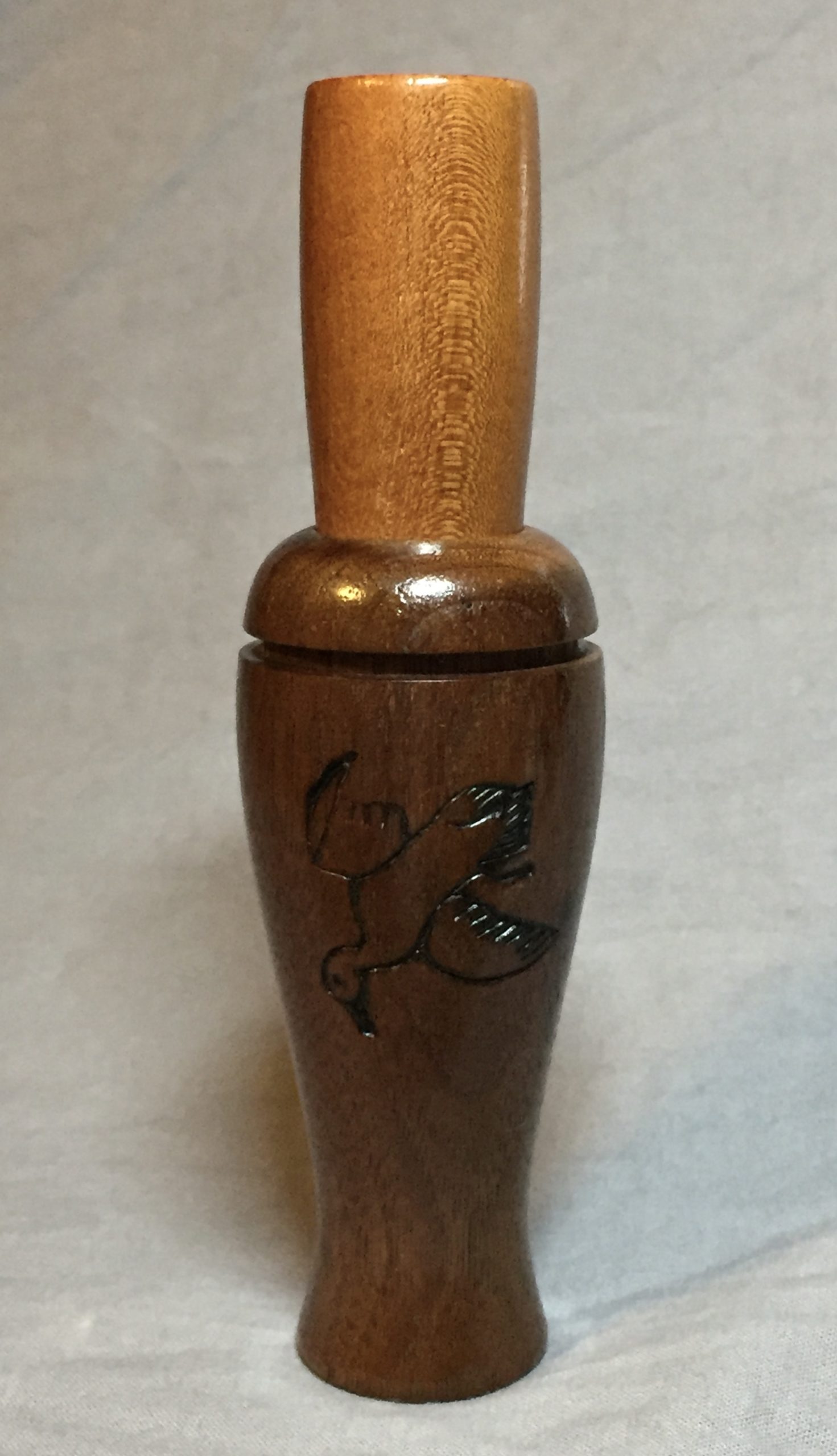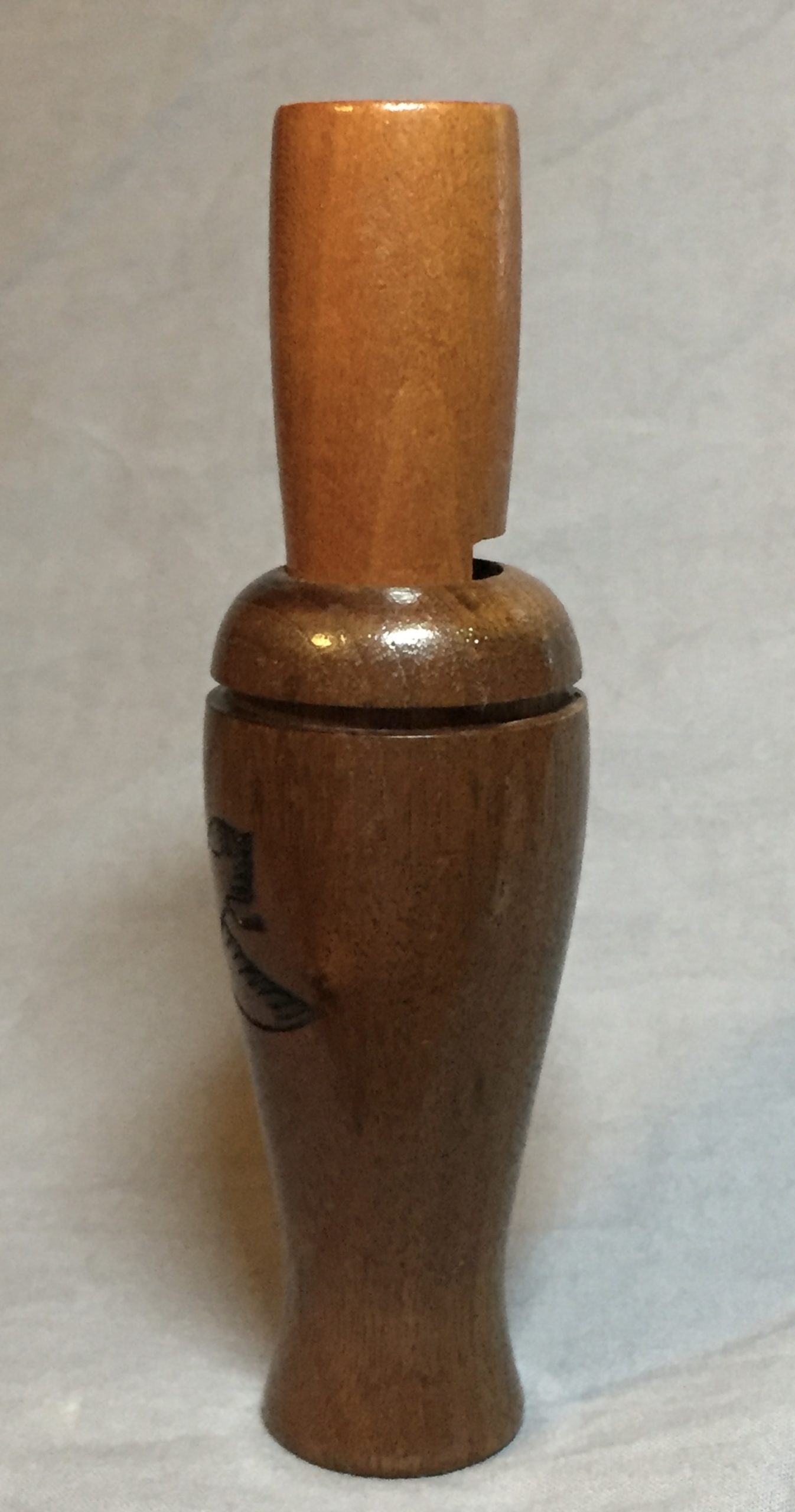 This is a nice call from Frank Bryant of Louisiana. A flying mallard is carved into the walnut barrel. The call is Reelfoot style with does not have a reed or wedge block.