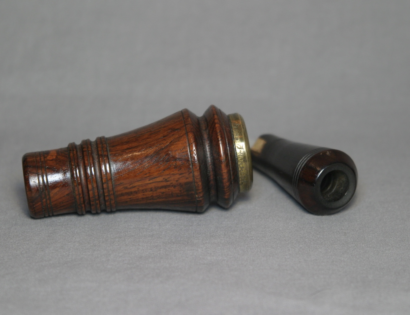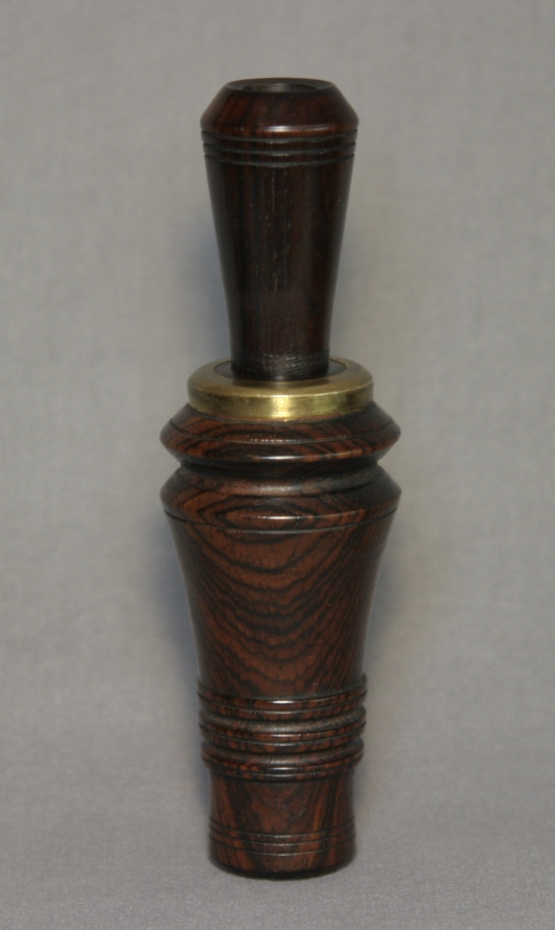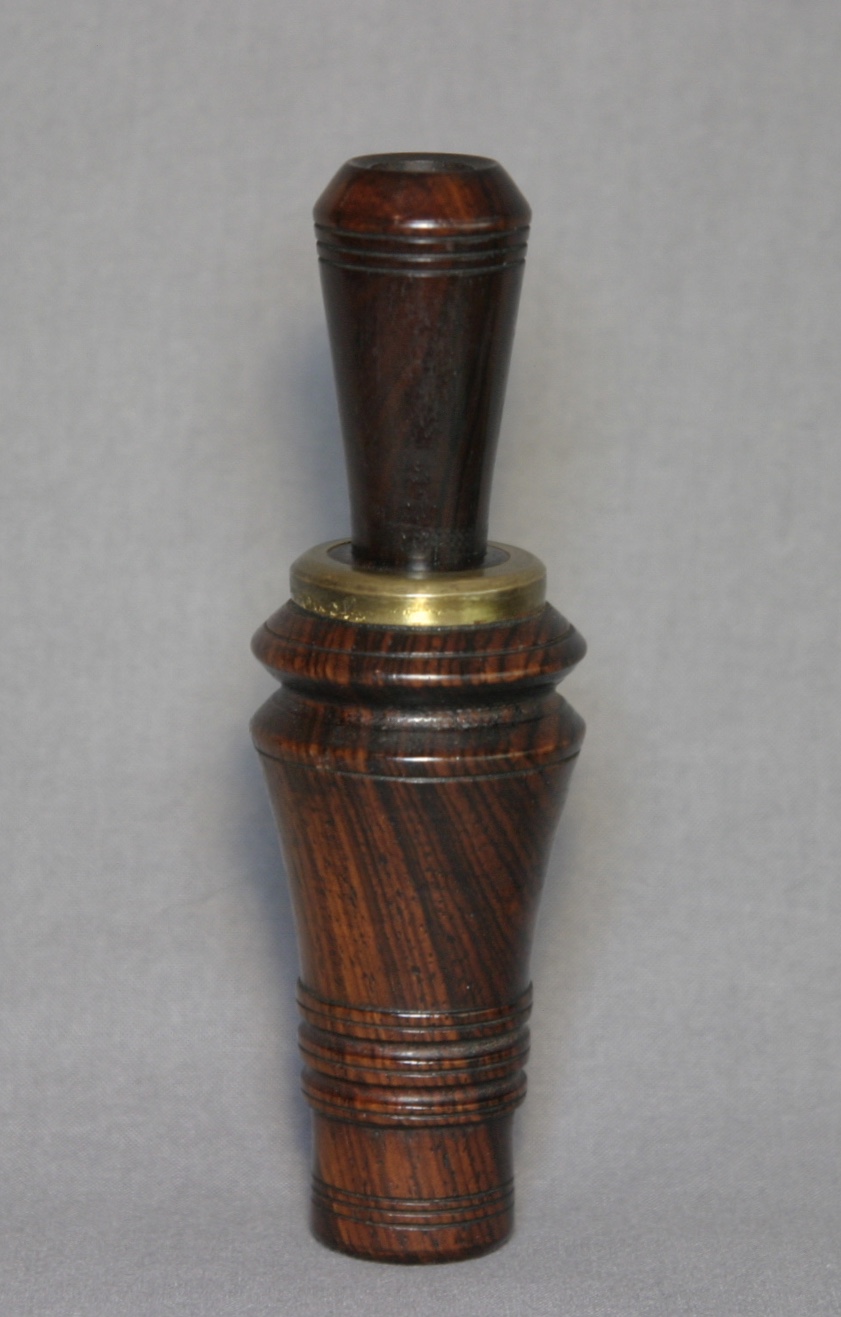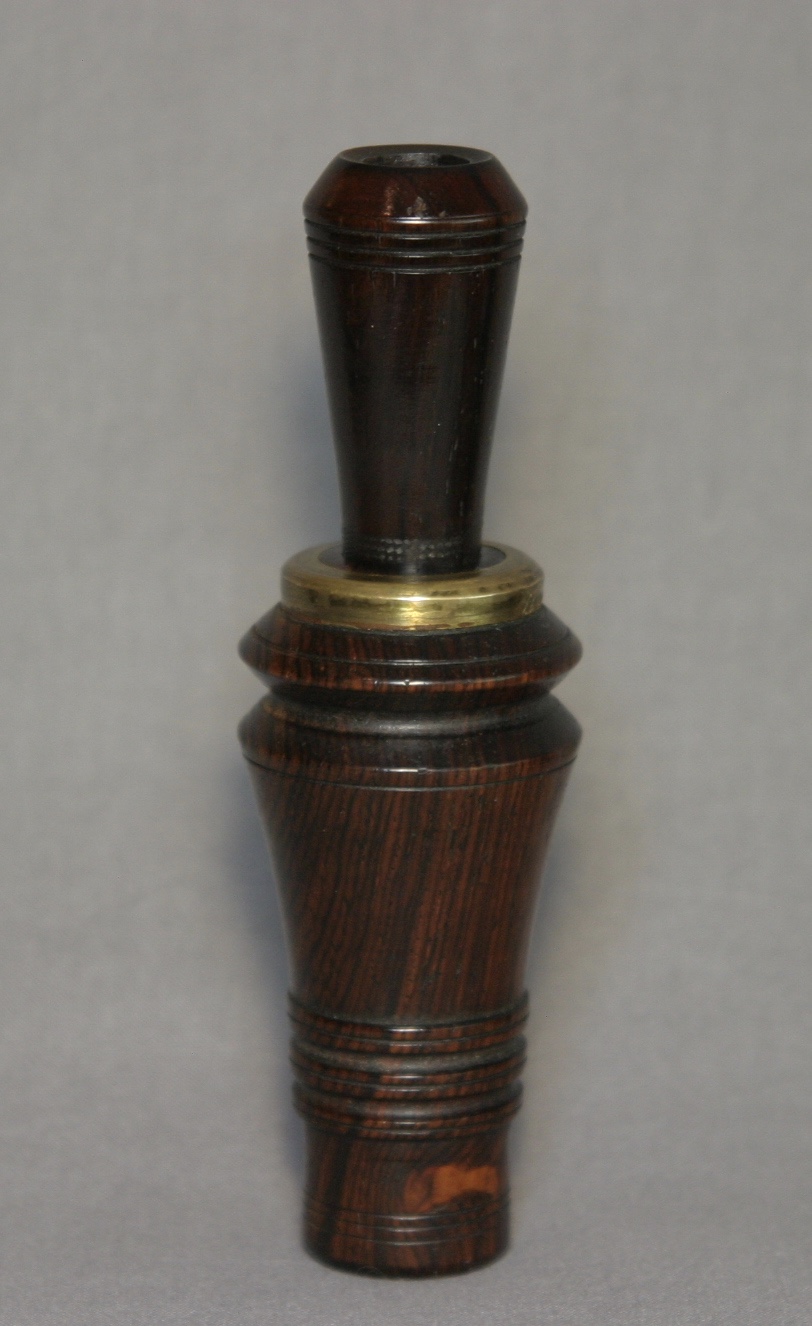 This is a beautifully turned call from Gen Parrish. Turned from walnut, the call has a nice solid weight and a smooth finish. The call has a beautifully turned walnut barrel with a nice pattern in the grain. It’s an Arkansas style call with a plastic reed.