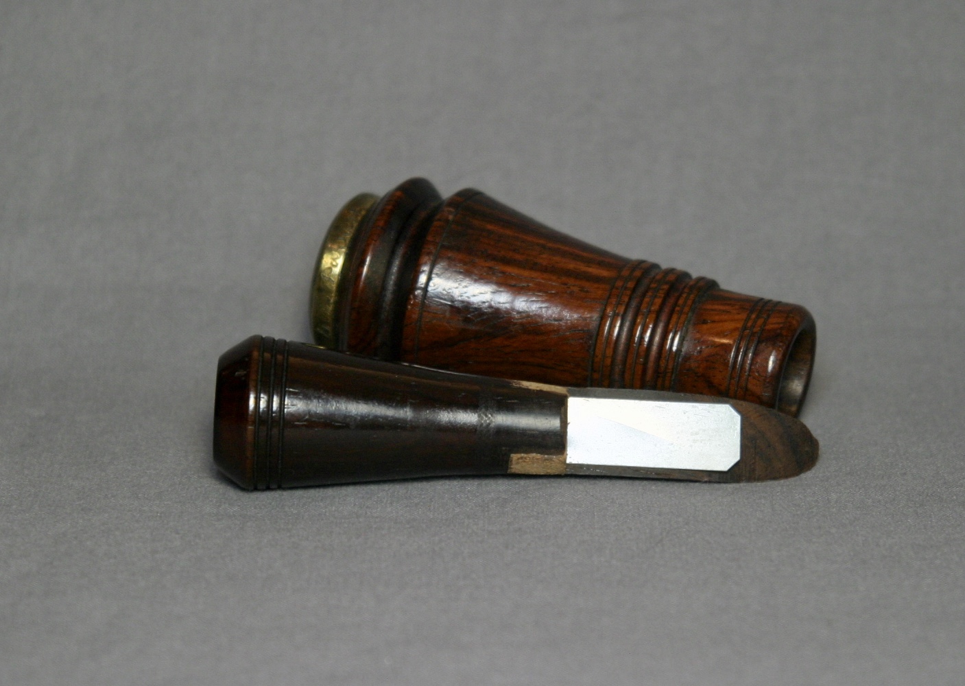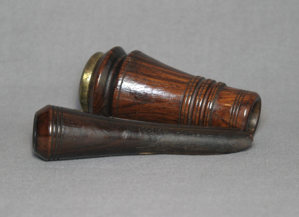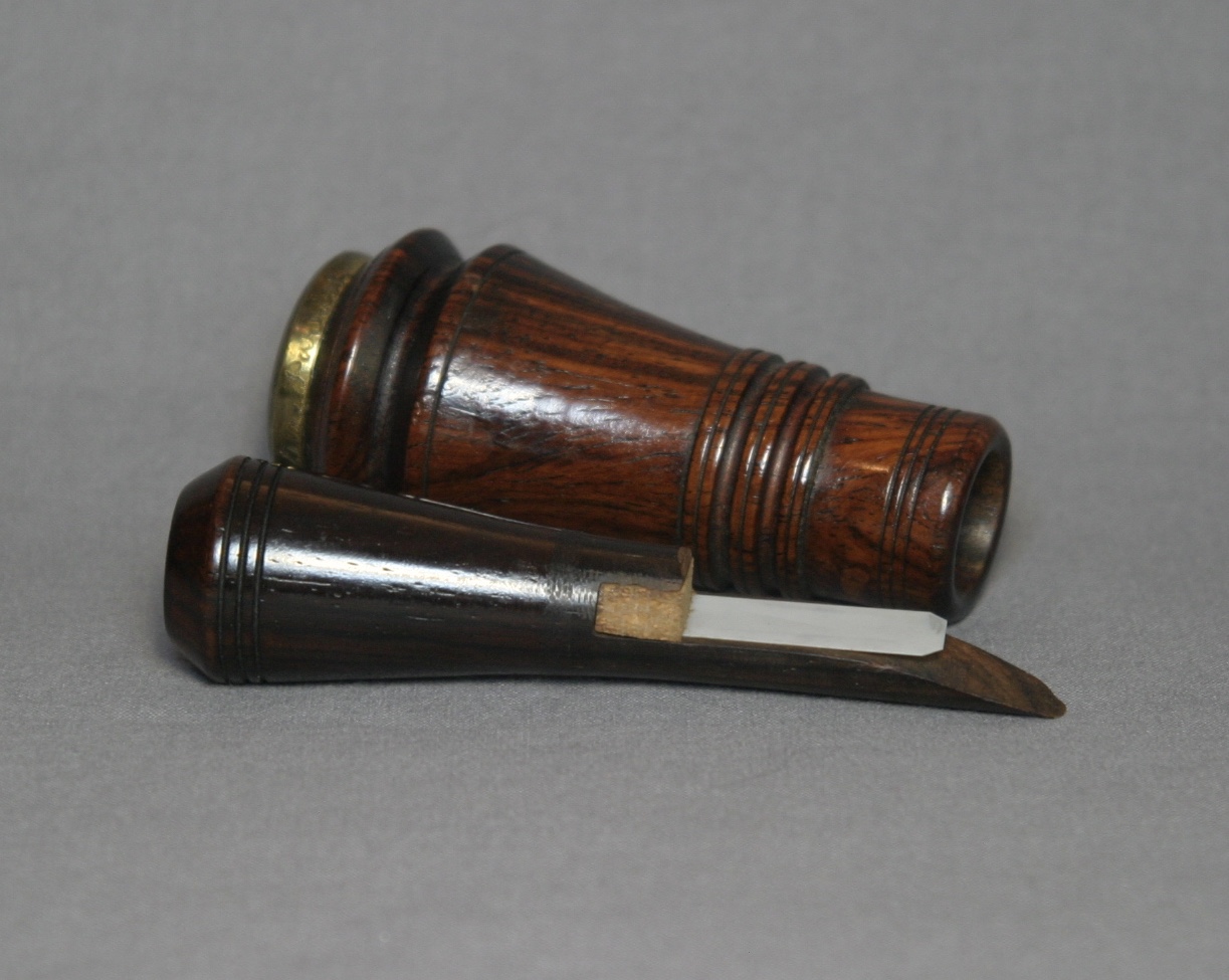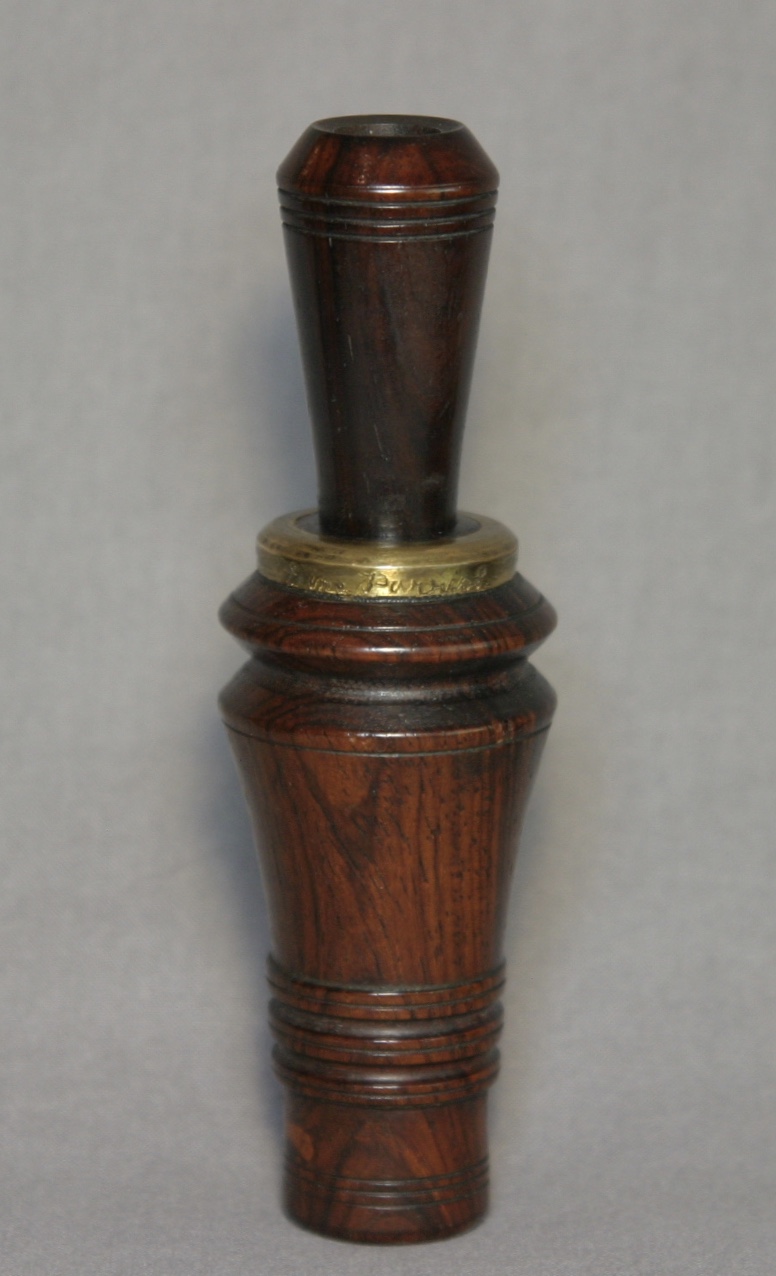 This is a beautifully turned call from Gen Parrish. Turned from walnut, the call has a nice solid weight and a smooth finish. The call has a beautifully turned walnut barrel with a nice pattern in the grain. It’s an Arkansas style call with a plastic reed.