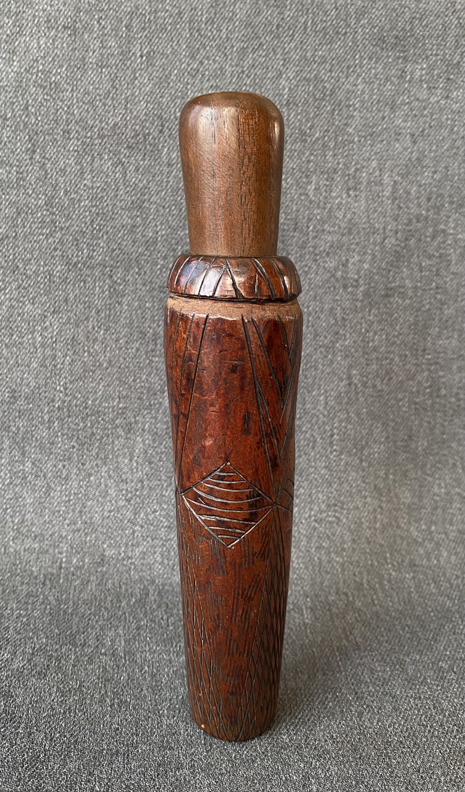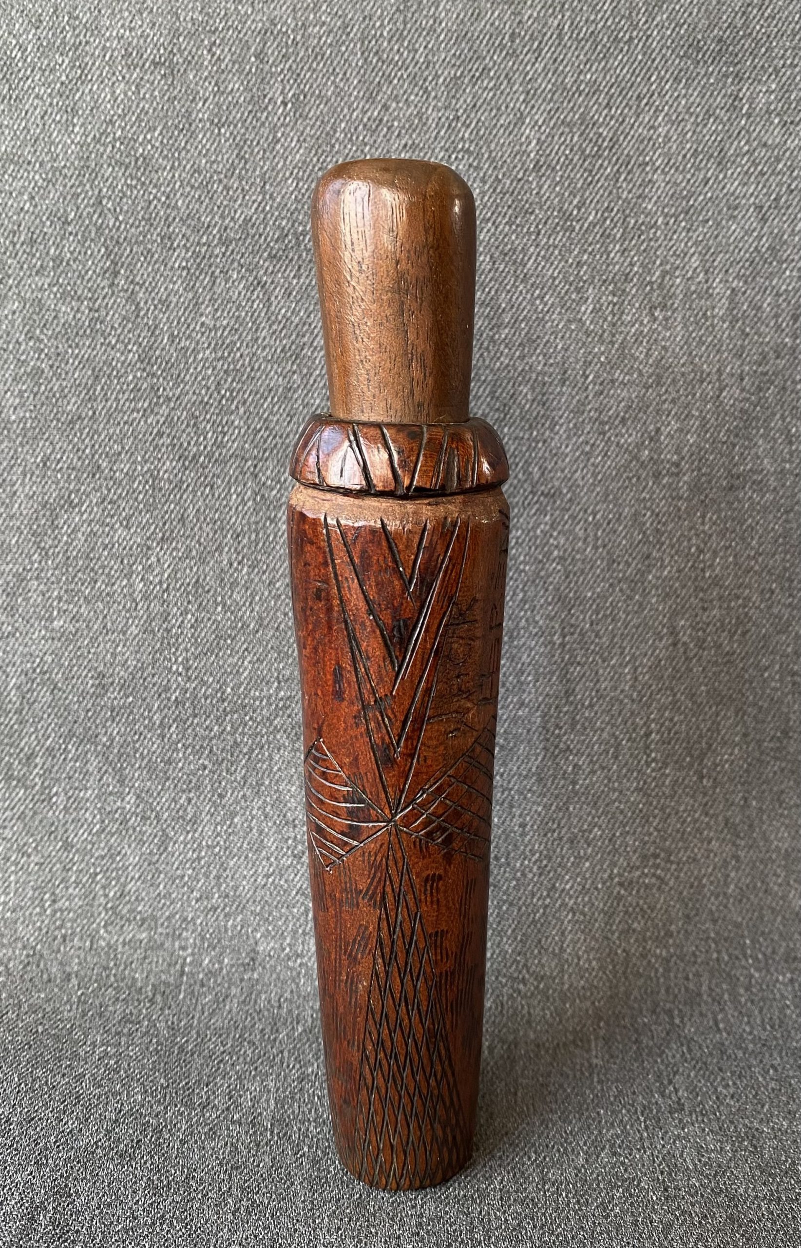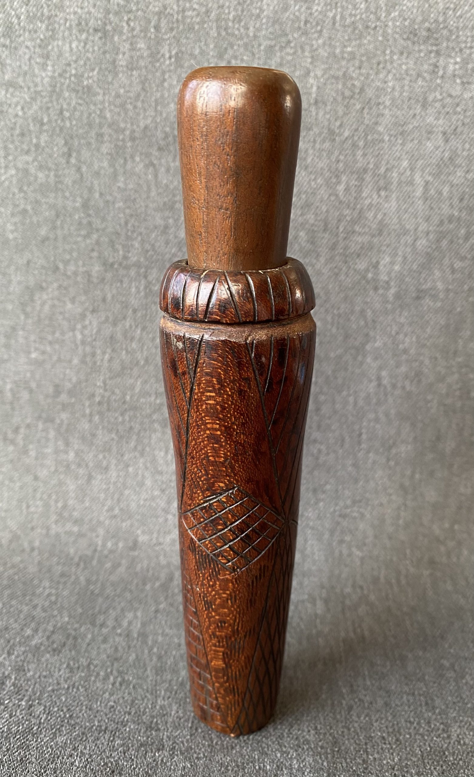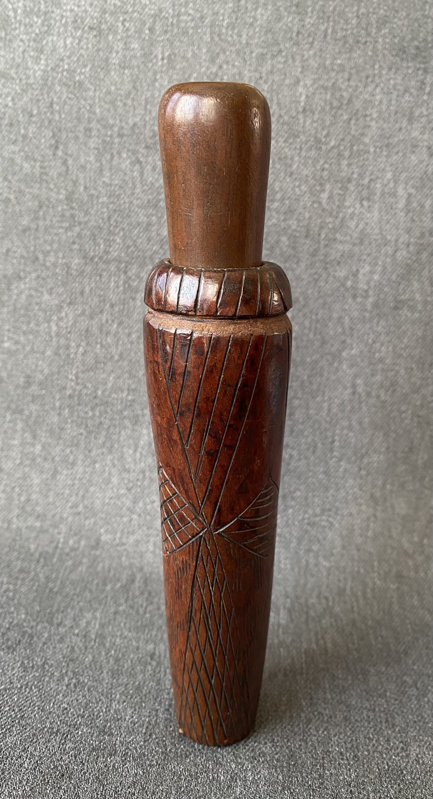This is a very nice Illinois call from Chuck Gent. It has carved lines in diamond, checker, brick, and straight line patterns. The prior owner’s name, Jack Heren, is also carved into the barrel. The call is Reelfoot style with a metal reed.