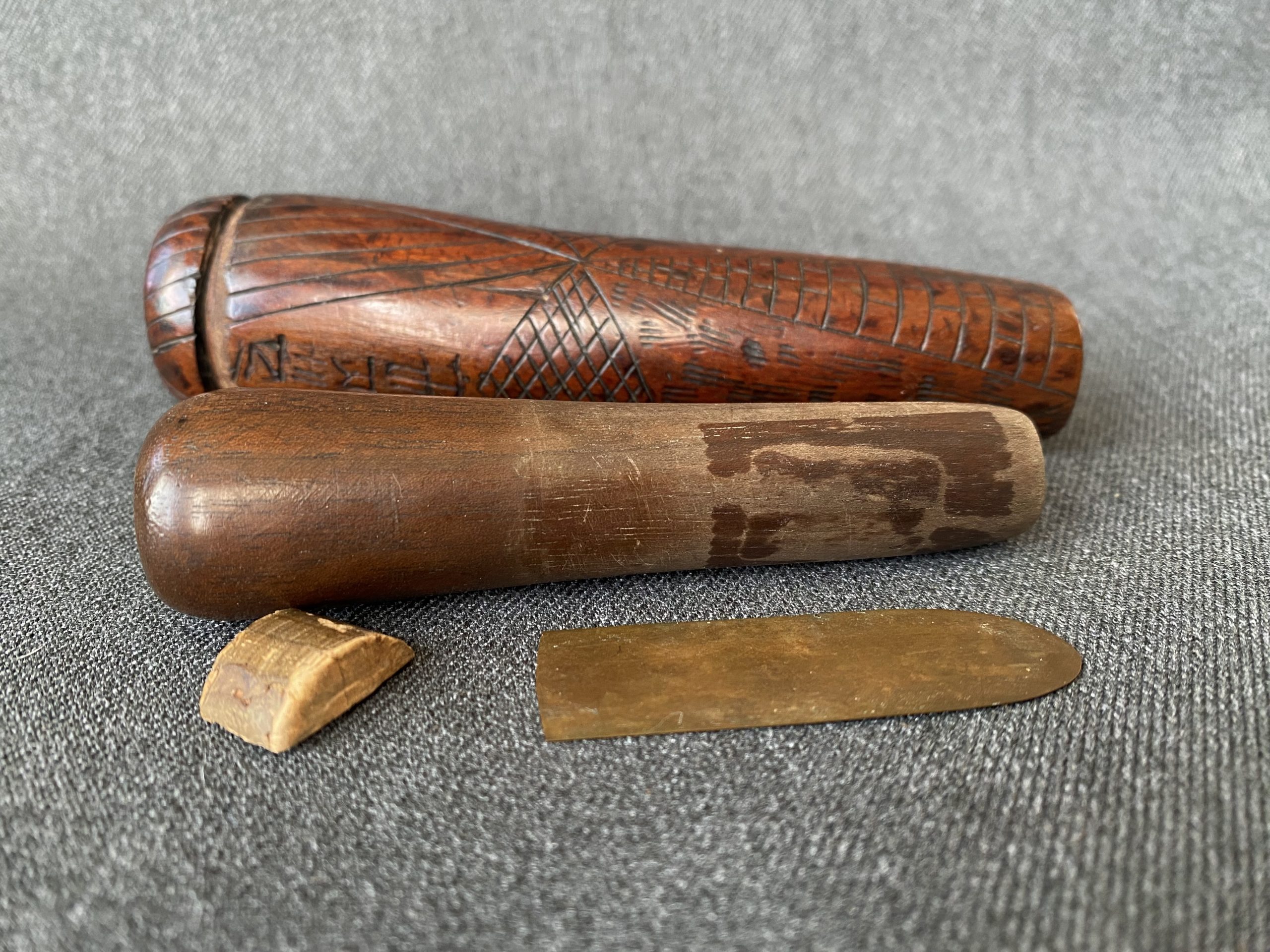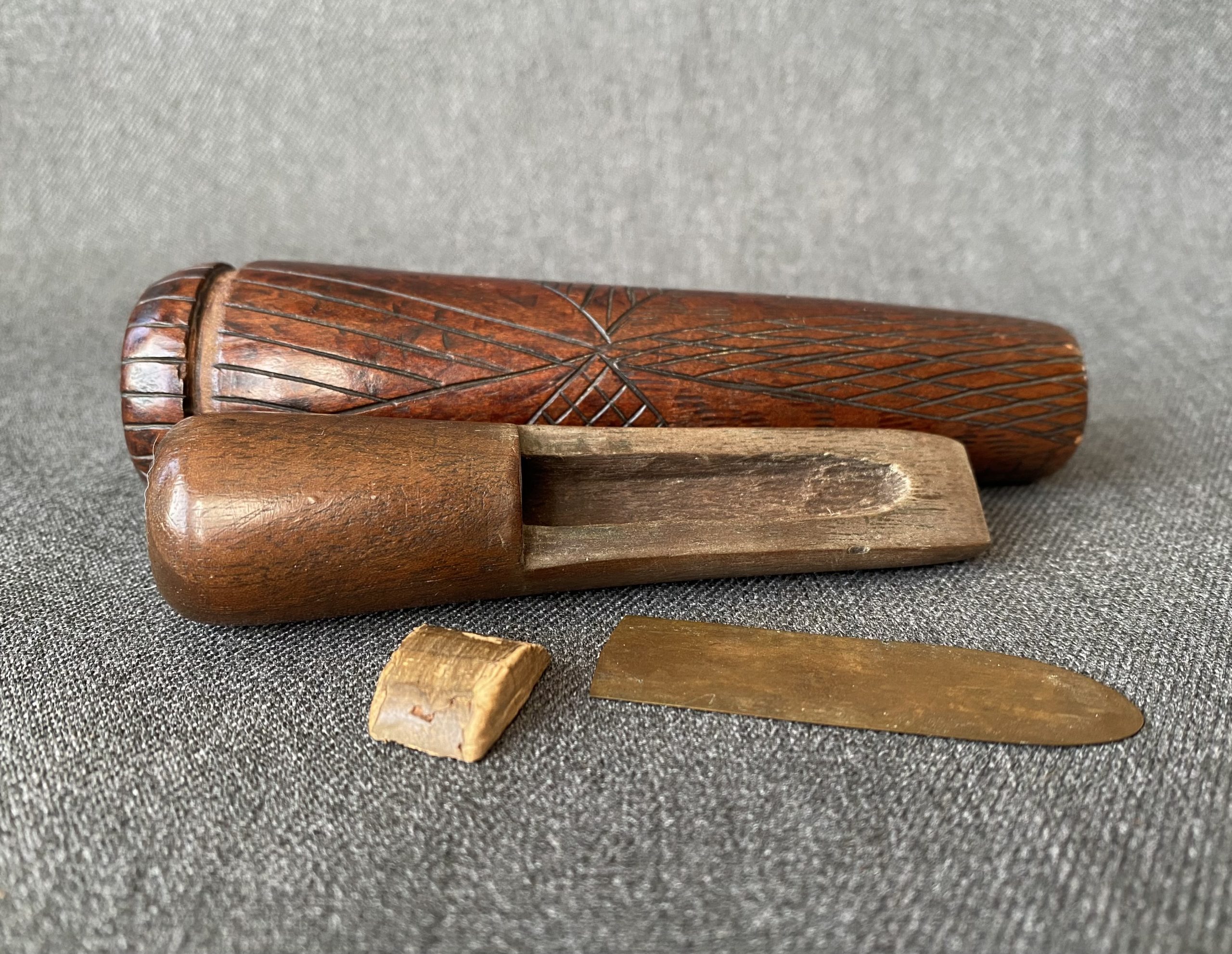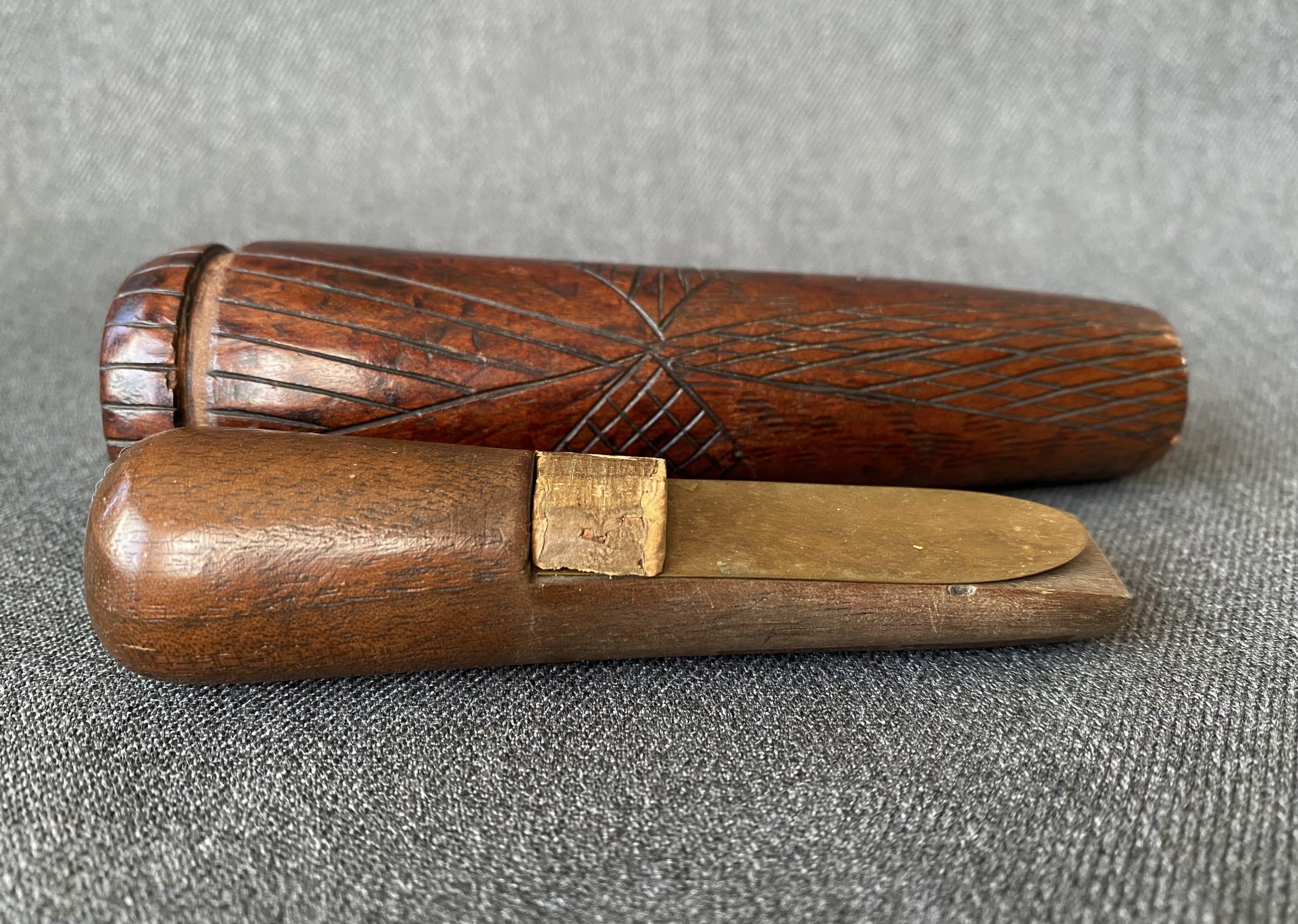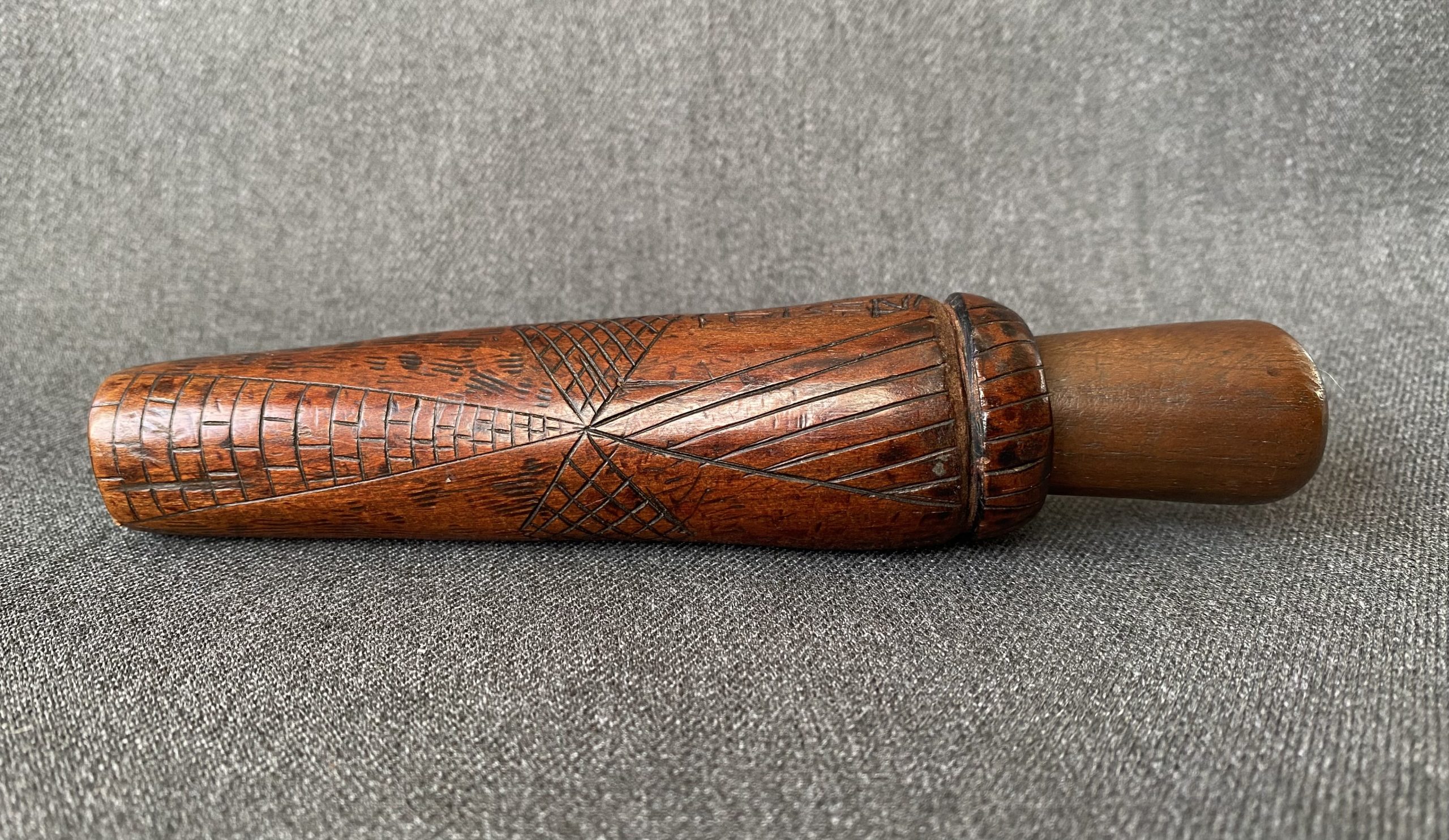 This is a very nice Illinois call from Chuck Gent. It has carved lines in diamond, checker, brick, and straight line patterns. The prior owner’s name, Jack Heren, is also carved into the barrel. The call is Reelfoot style with a metal reed.