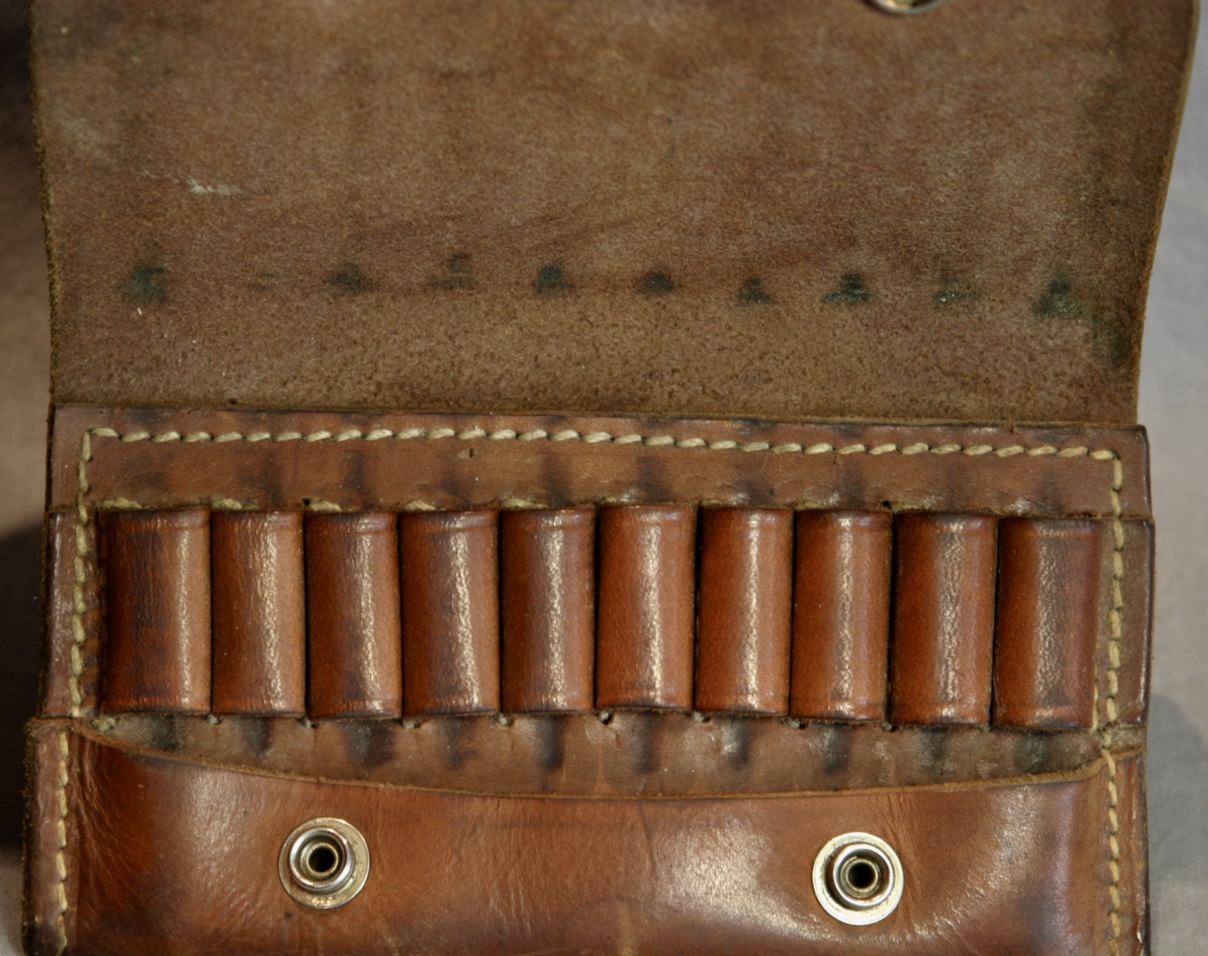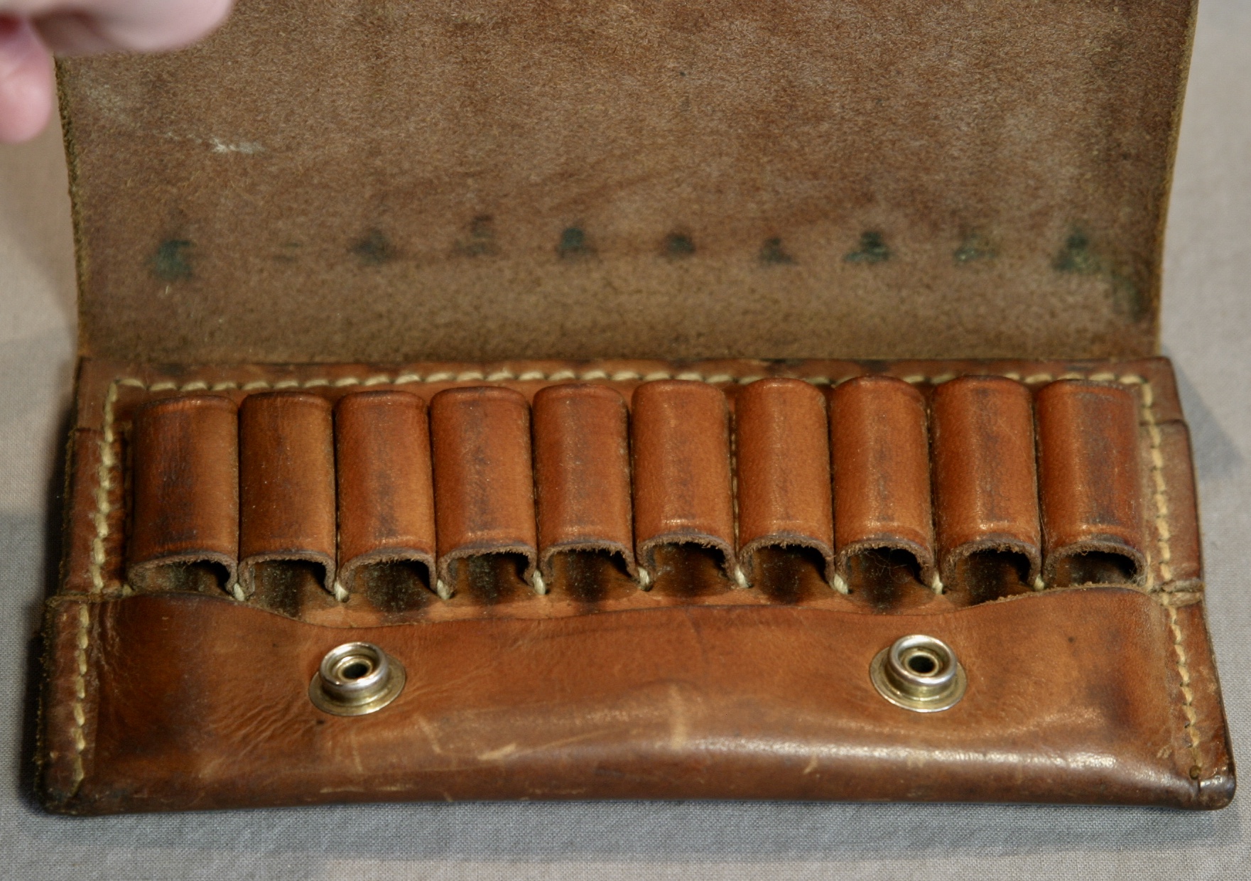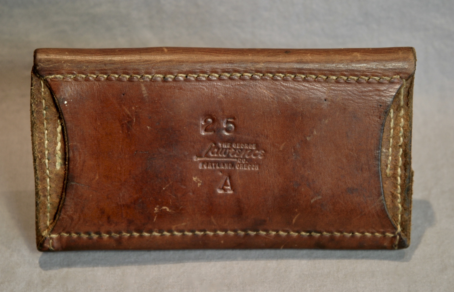 This is a great cartridge holder from George Lawrence! There are loops for ten cartridges and a slip on the back for your belt. The snaps on the front are stamped, Lawrence Since 1857. Stamped into the back: 25, The George Lawrence Co. Portland, Oregon, A