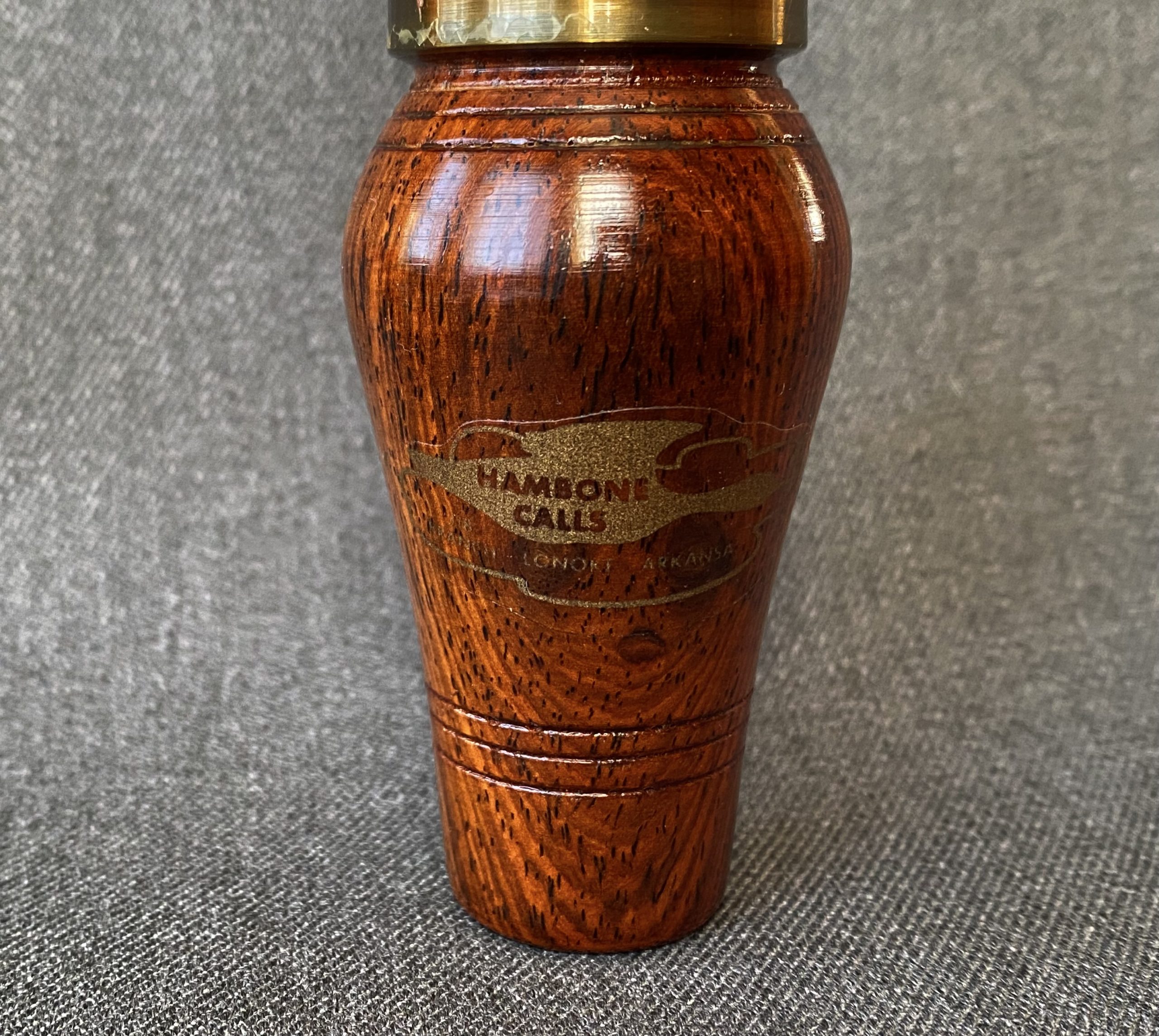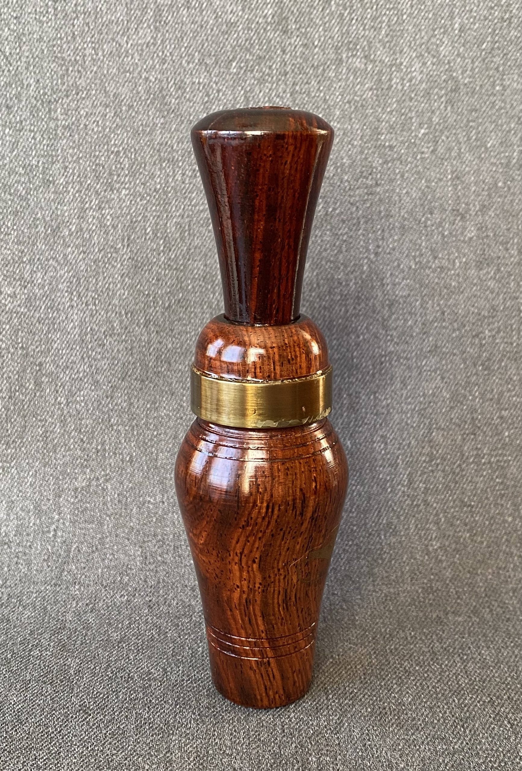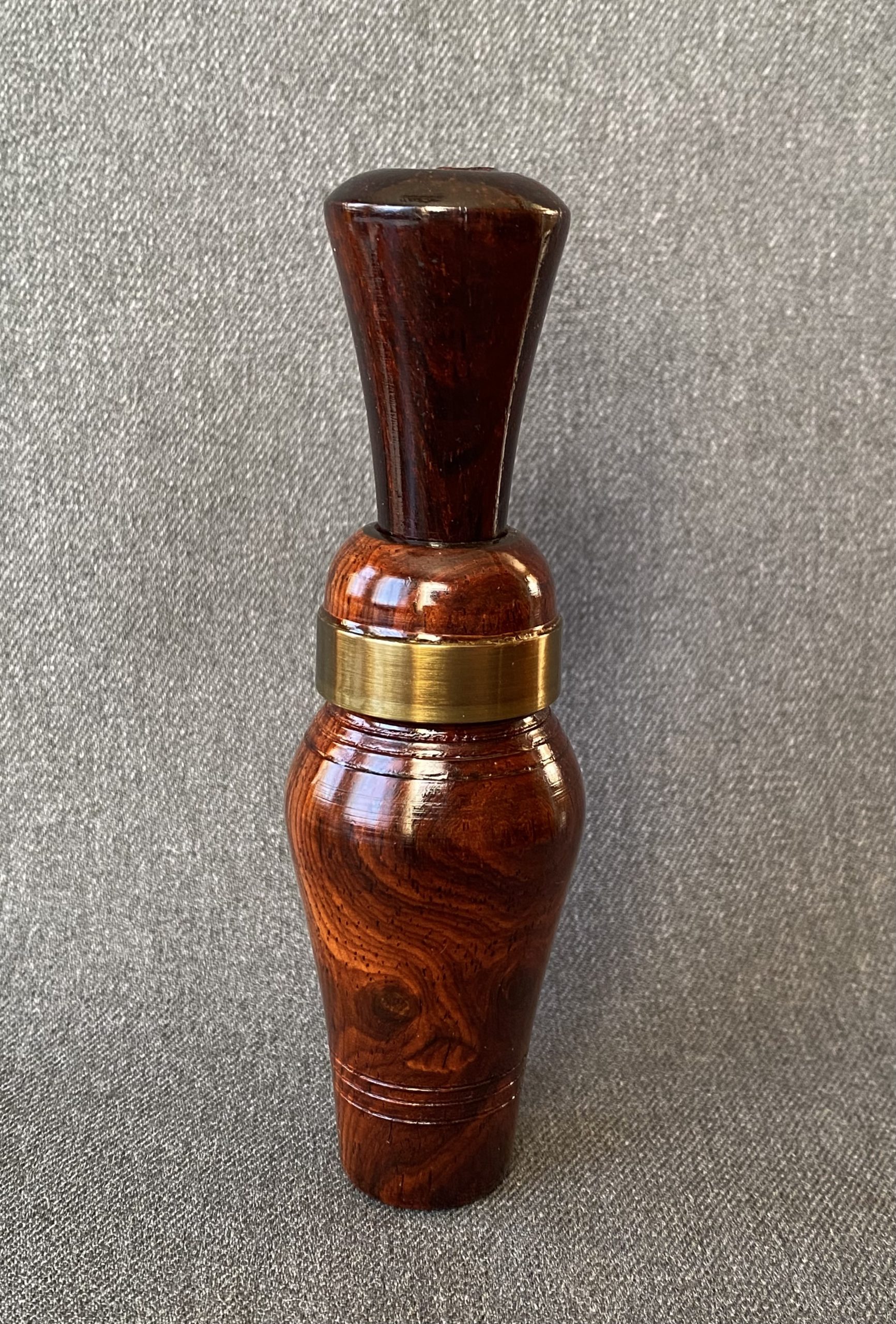 This is a great Hambone call made from beautiful cocobolo burl. The call has a lacquer finish and a brass band at the top.
