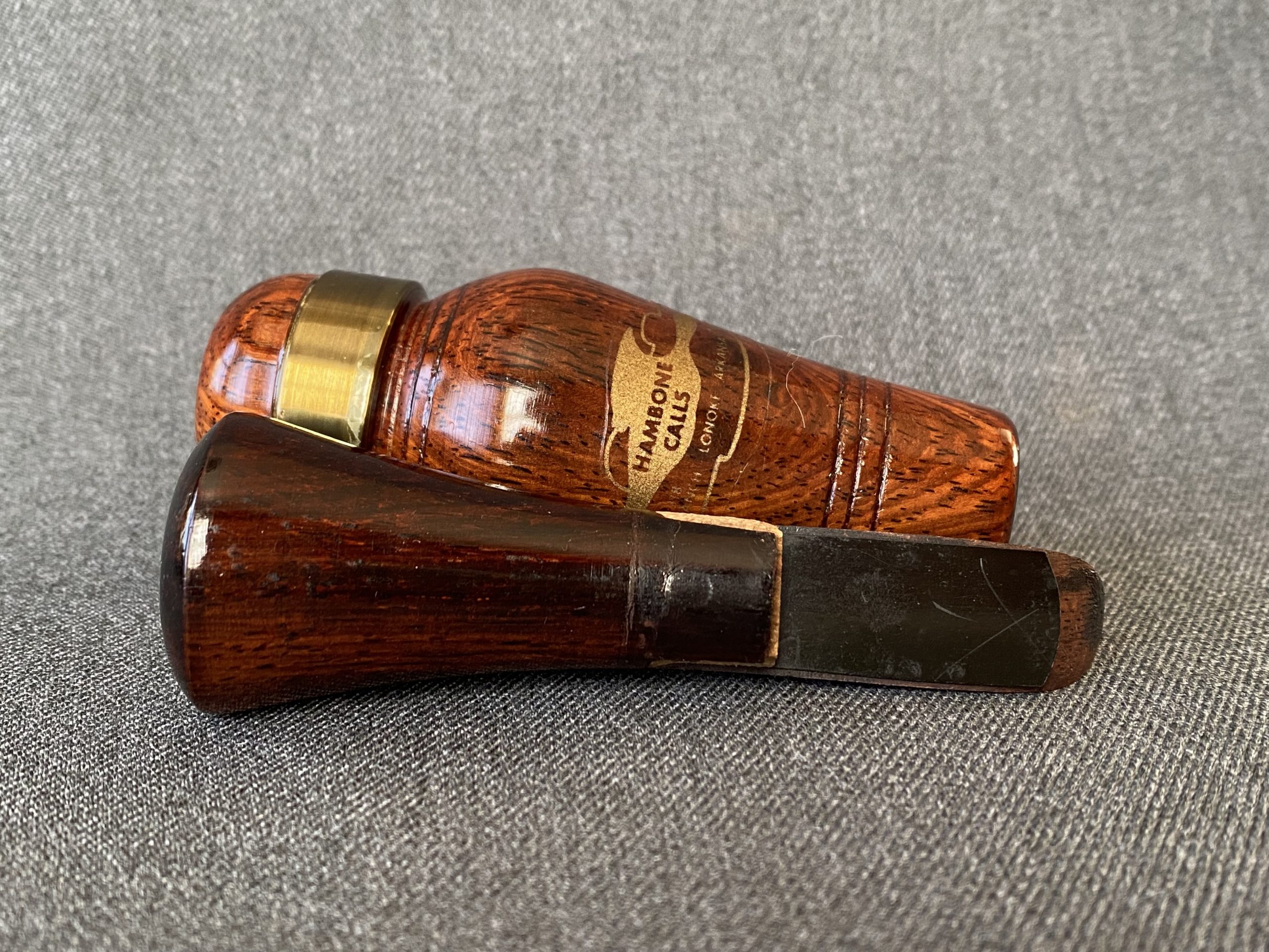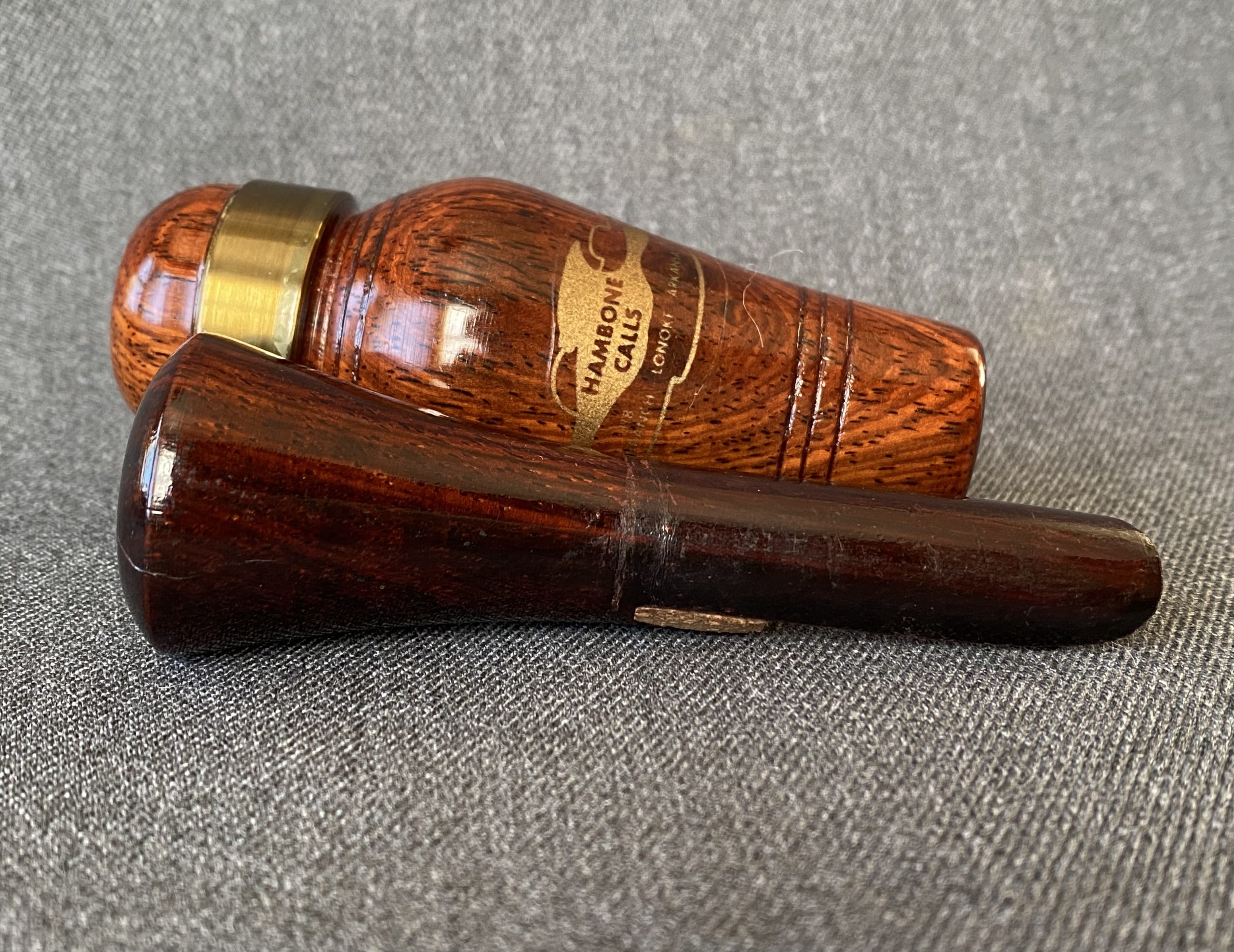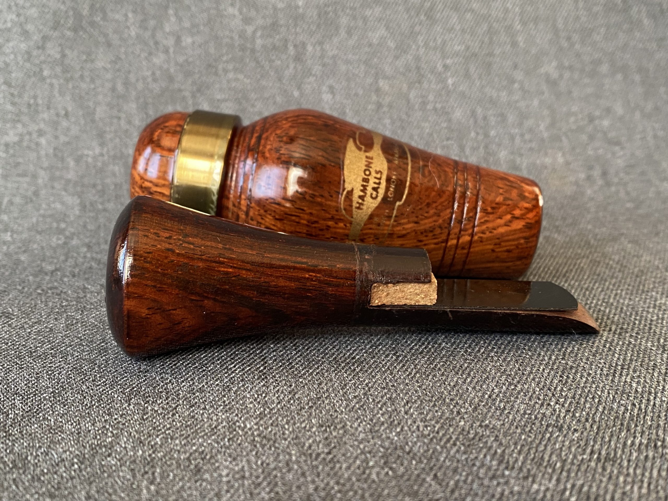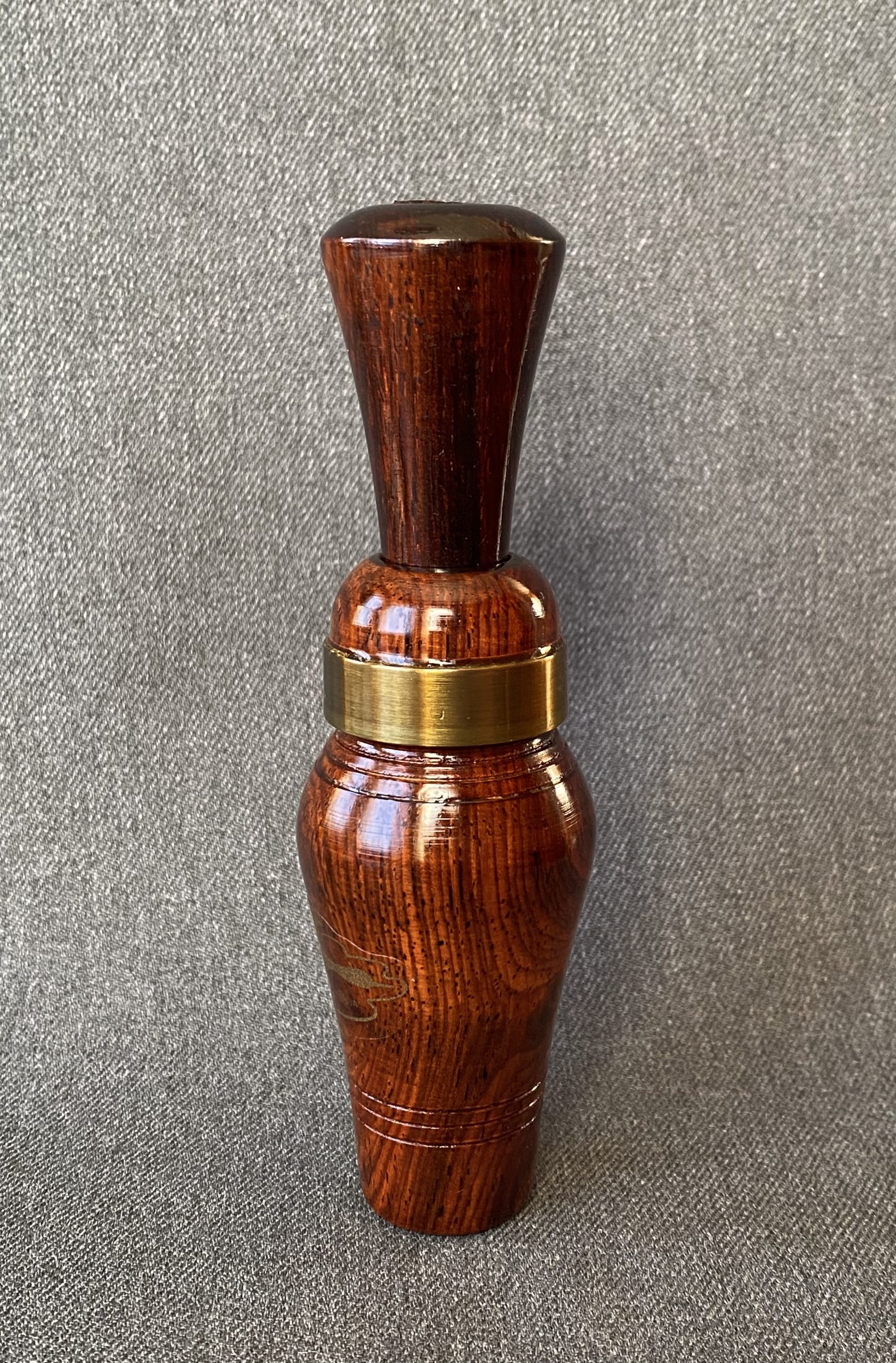 This is a great Hambone call made from beautiful cocobolo burl. The call has a lacquer finish and a brass band at the top.