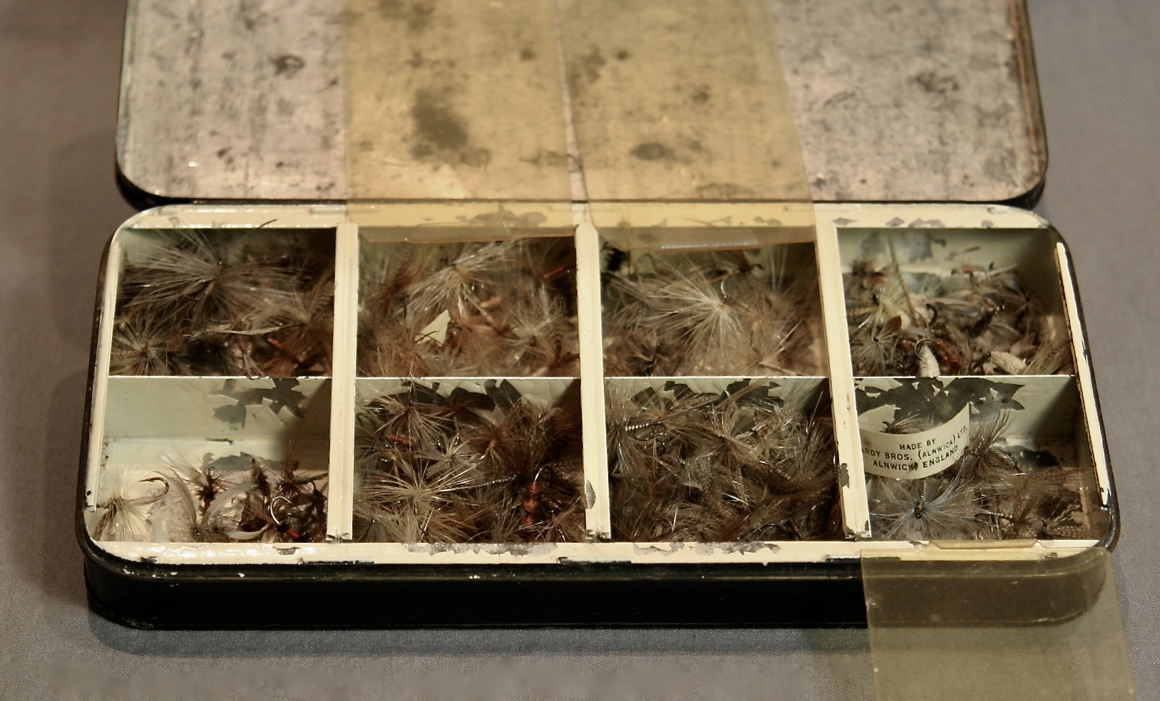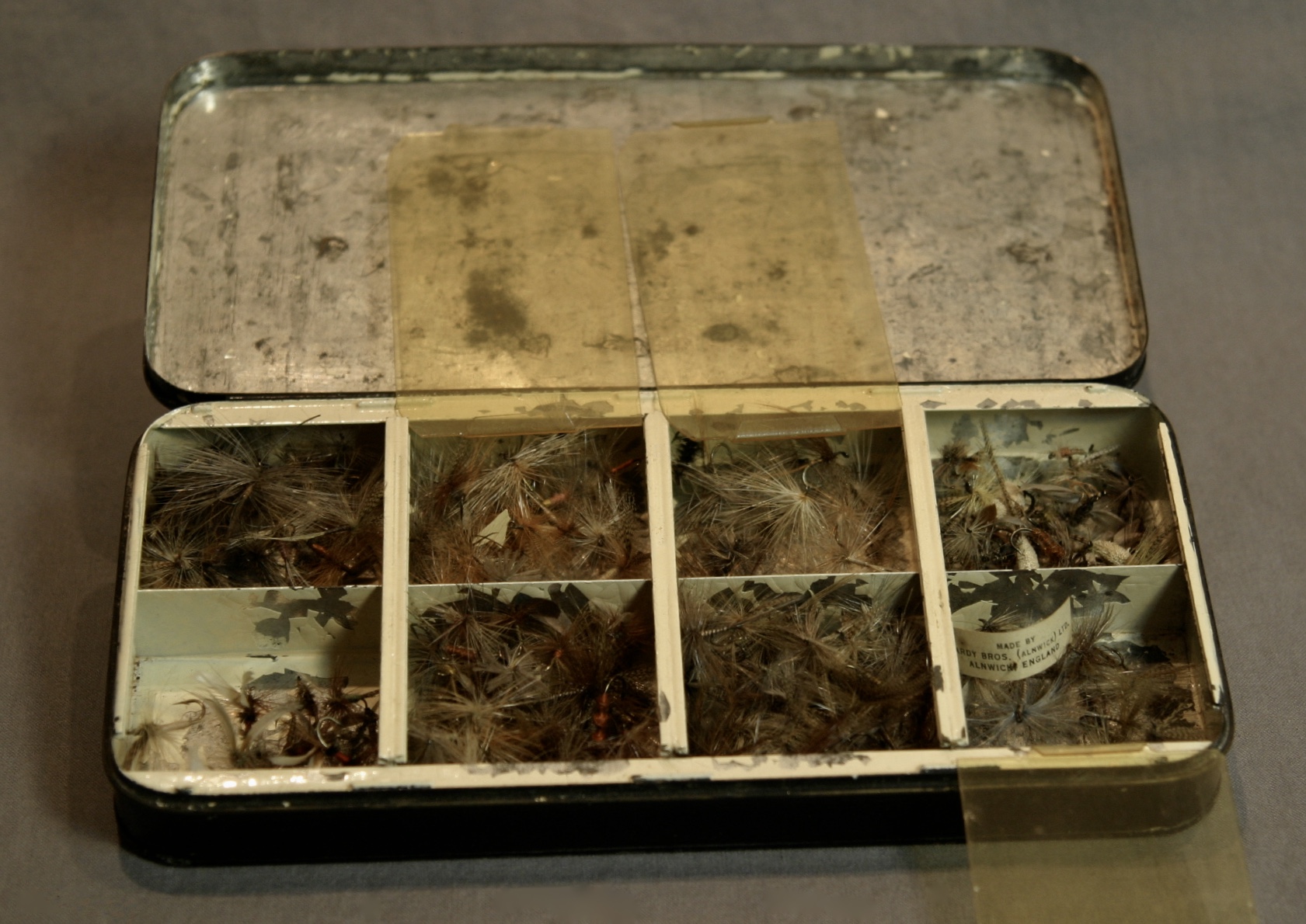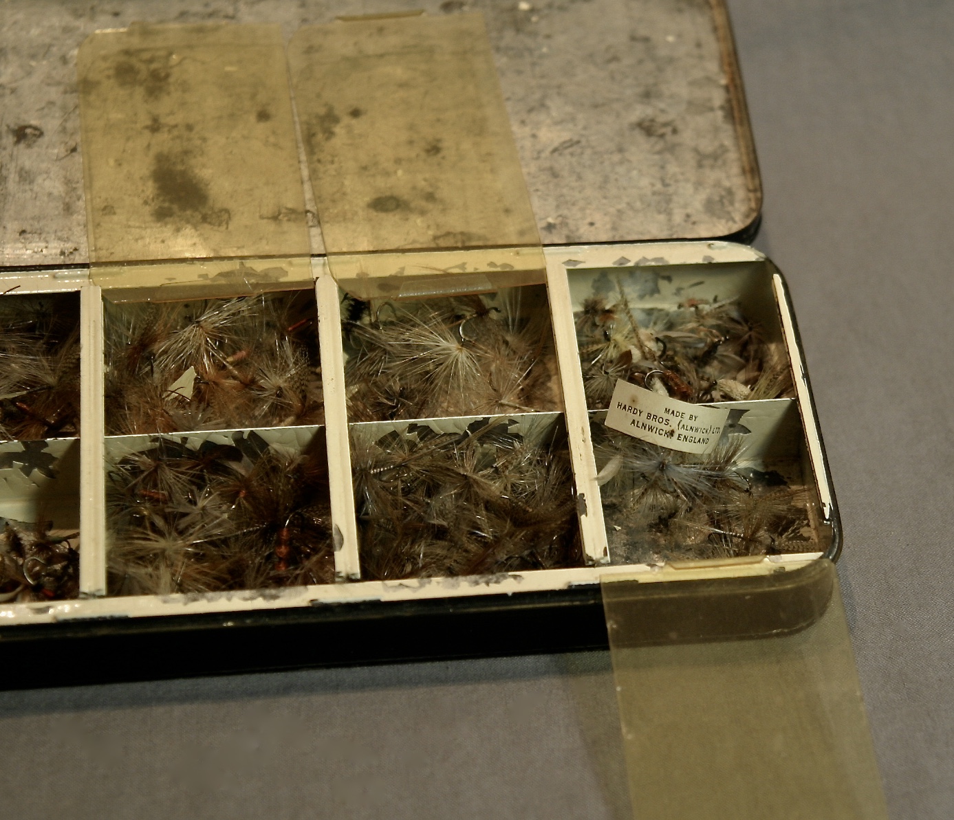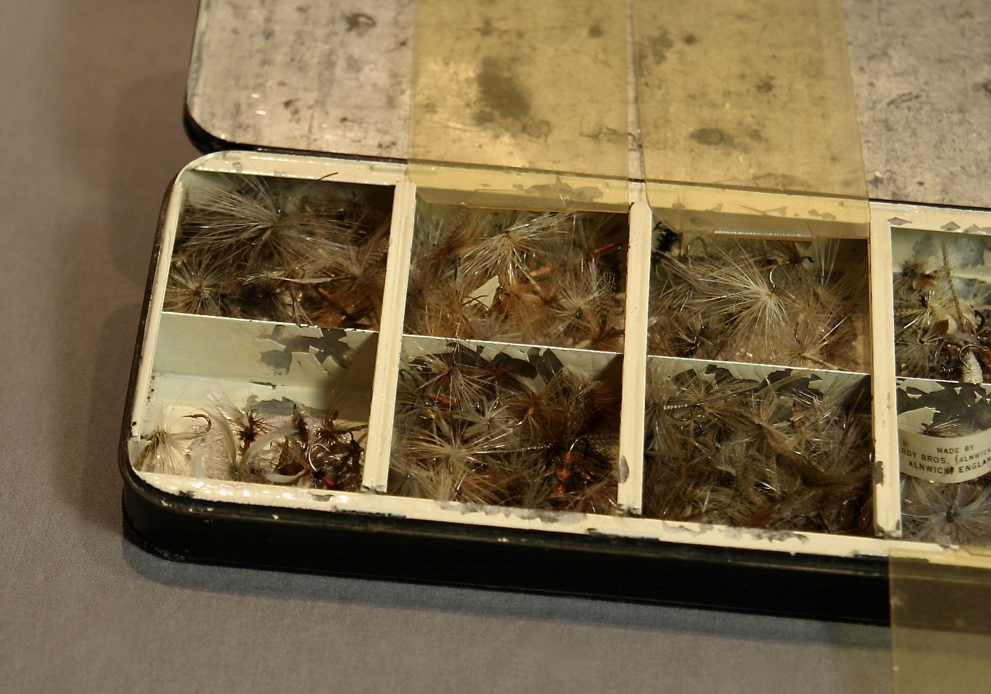 This is a nice fly box from Hardy Bros with dozens of dry flies. There are 8 separate compartments in the box to organize flies. There are thin covers that slide over 2 compartments each, 1 cover is missing.