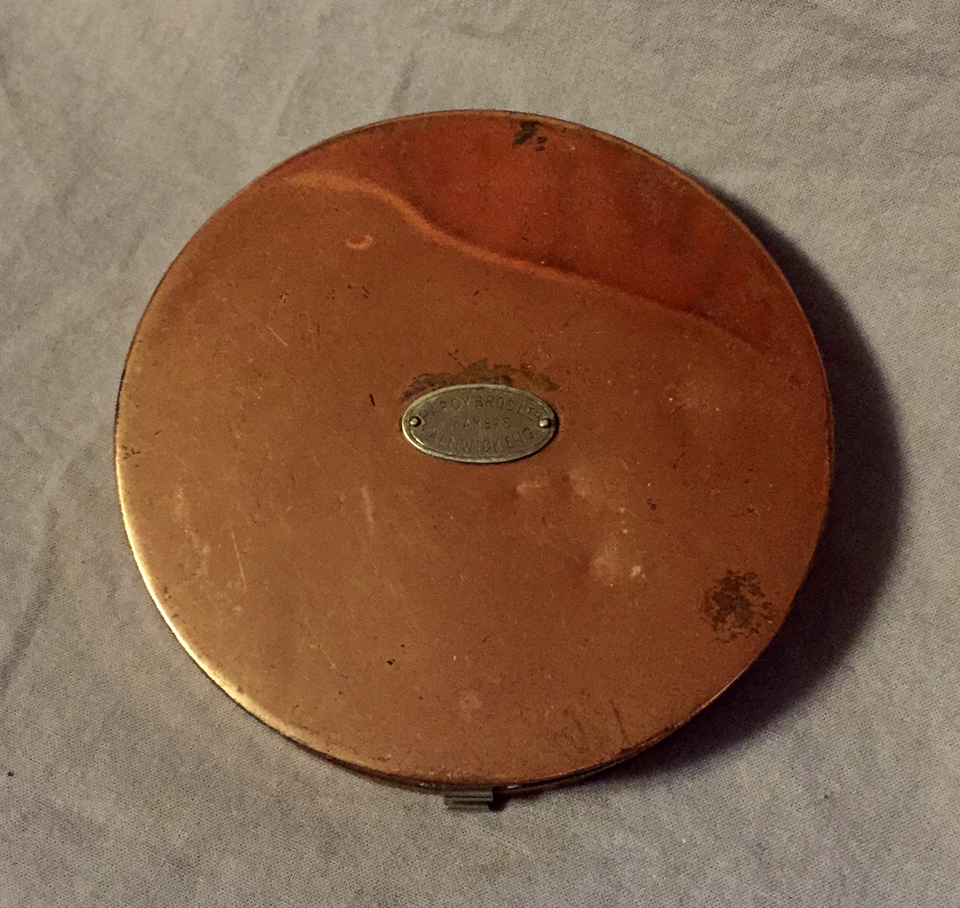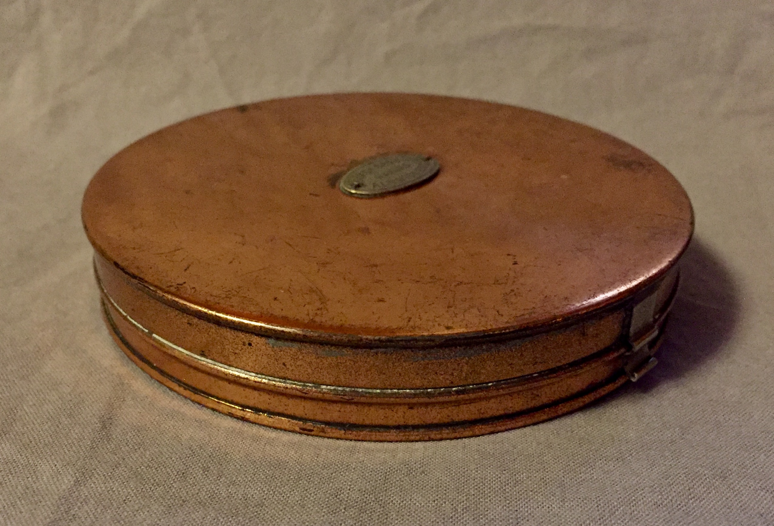This is a great round copper leader and fly box from Hardy. It has two felts with buttons in the pockets.