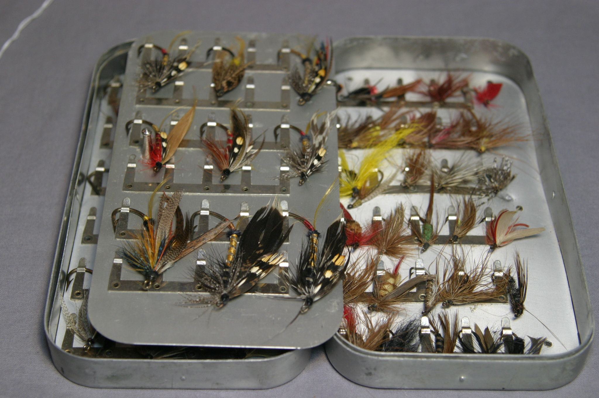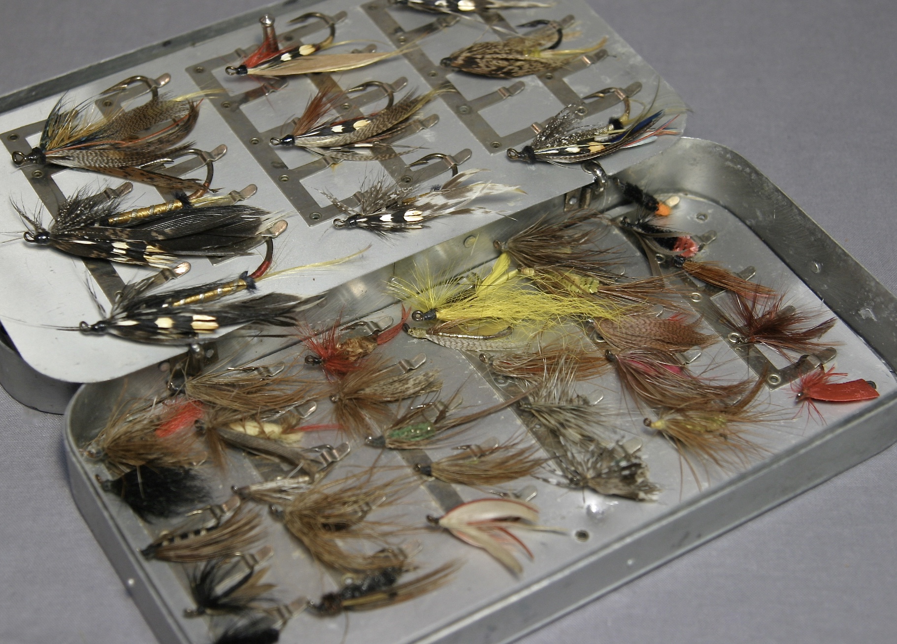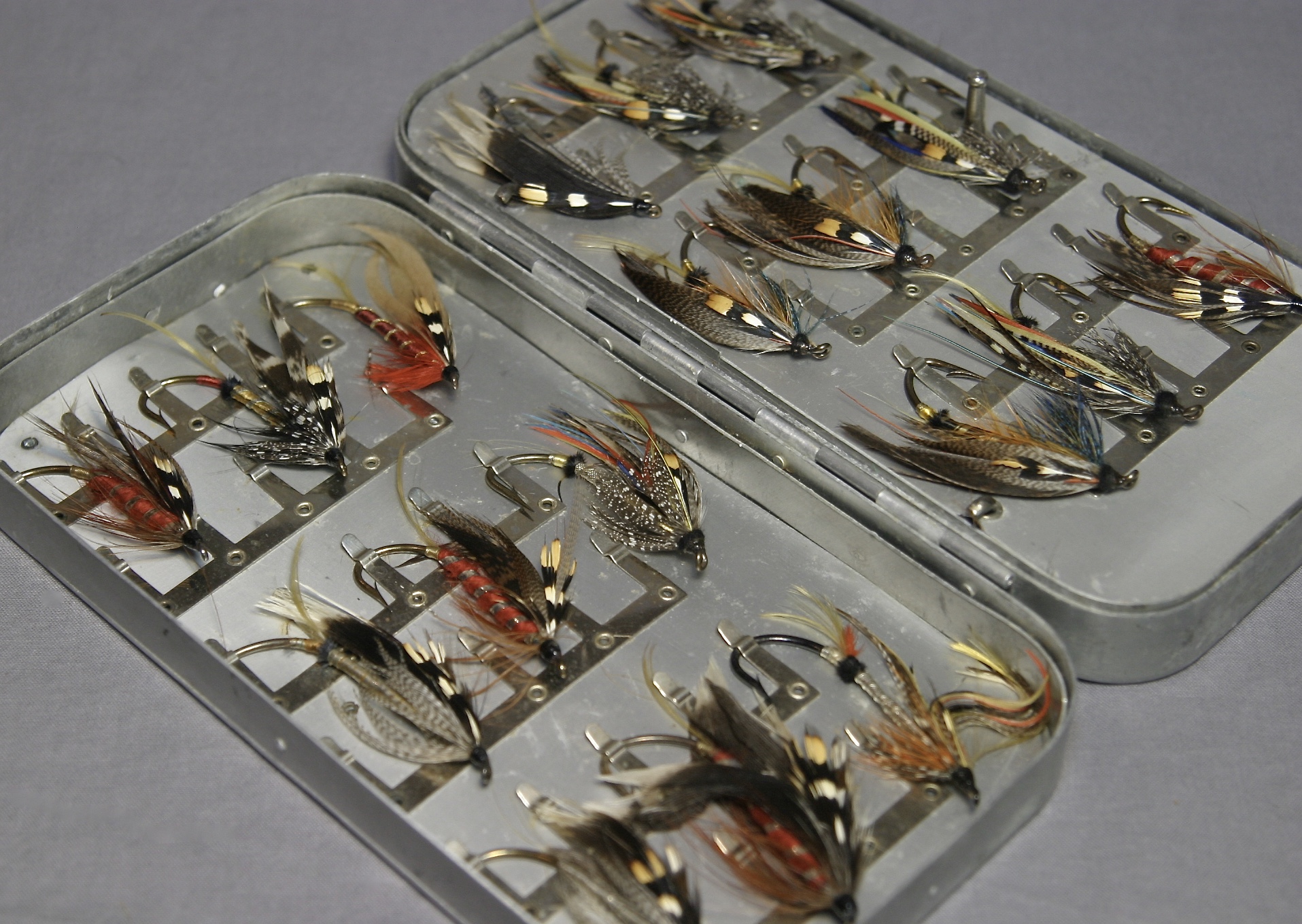 This is an awesome Hardy fly box with large and huge flies! From tip to hook, not including the feathers, they range in length from about 1″ to a bit over 2 1/4″.