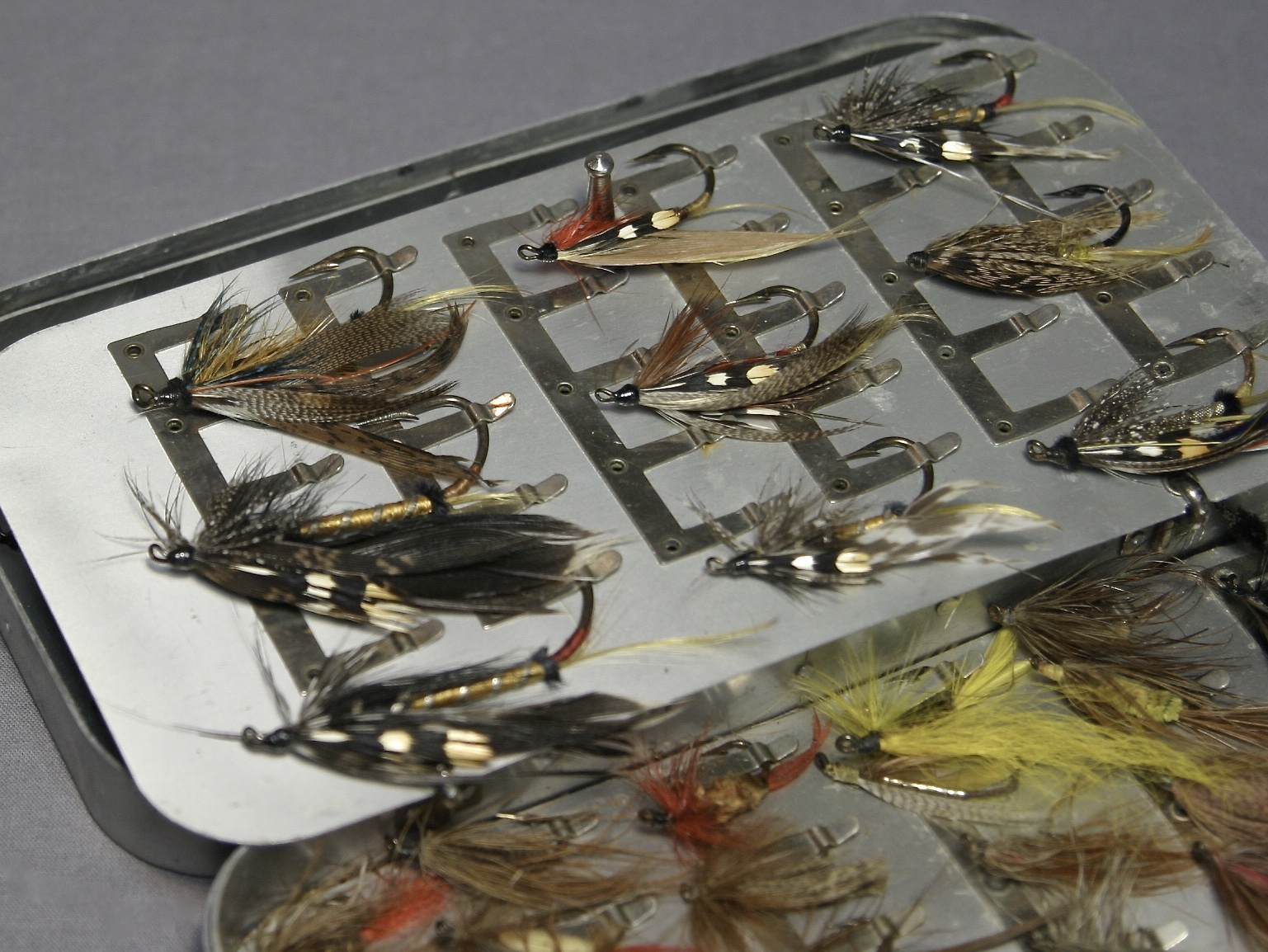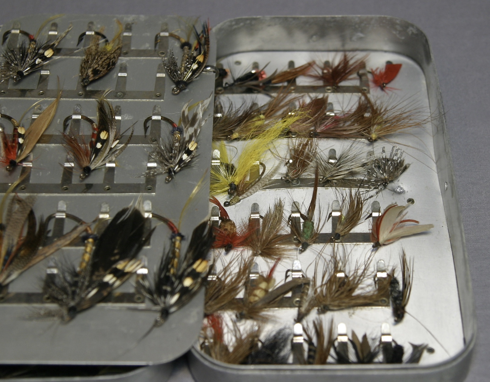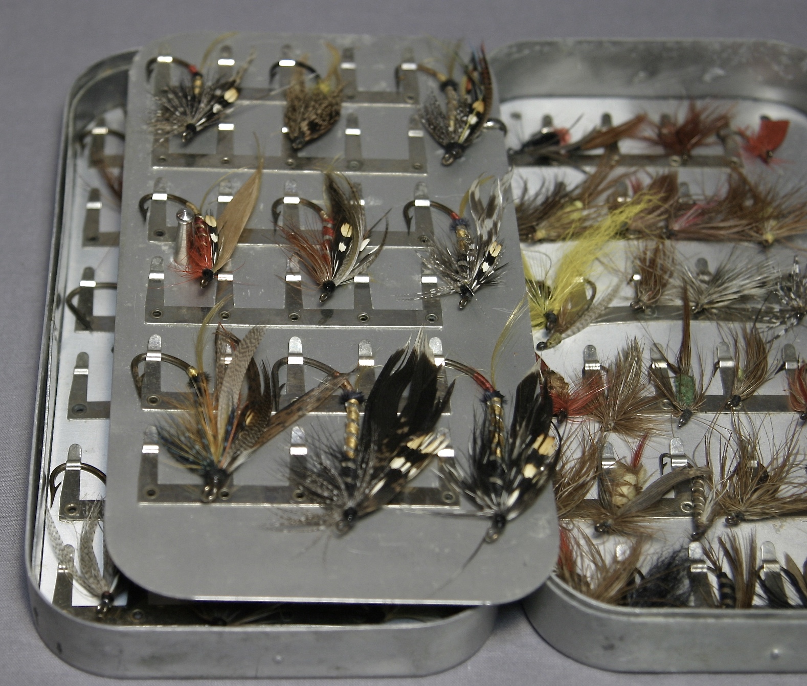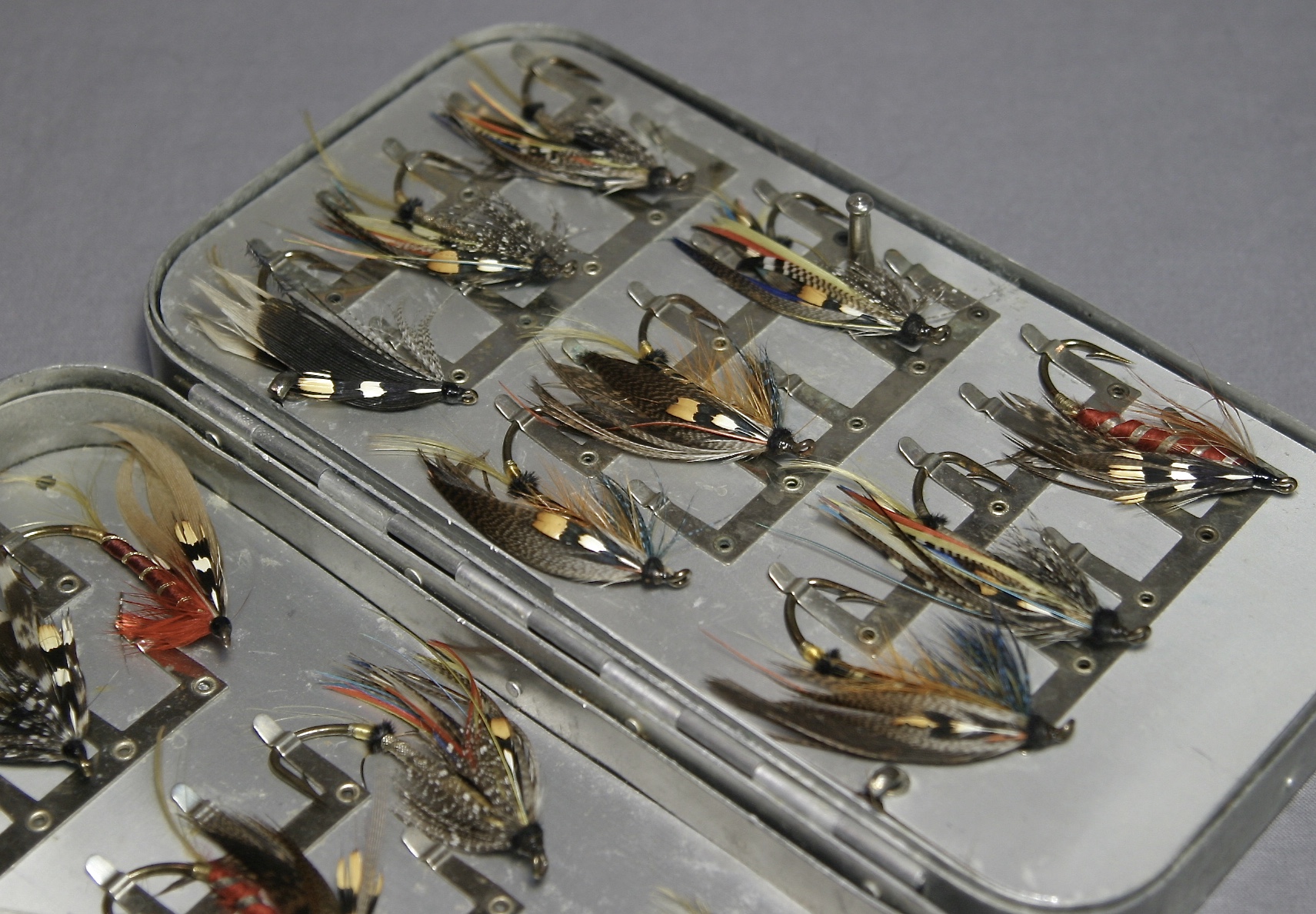 This is an awesome Hardy fly box with large and huge flies! From tip to hook, not including the feathers, they range in length from about 1″ to a bit over 2 1/4″.