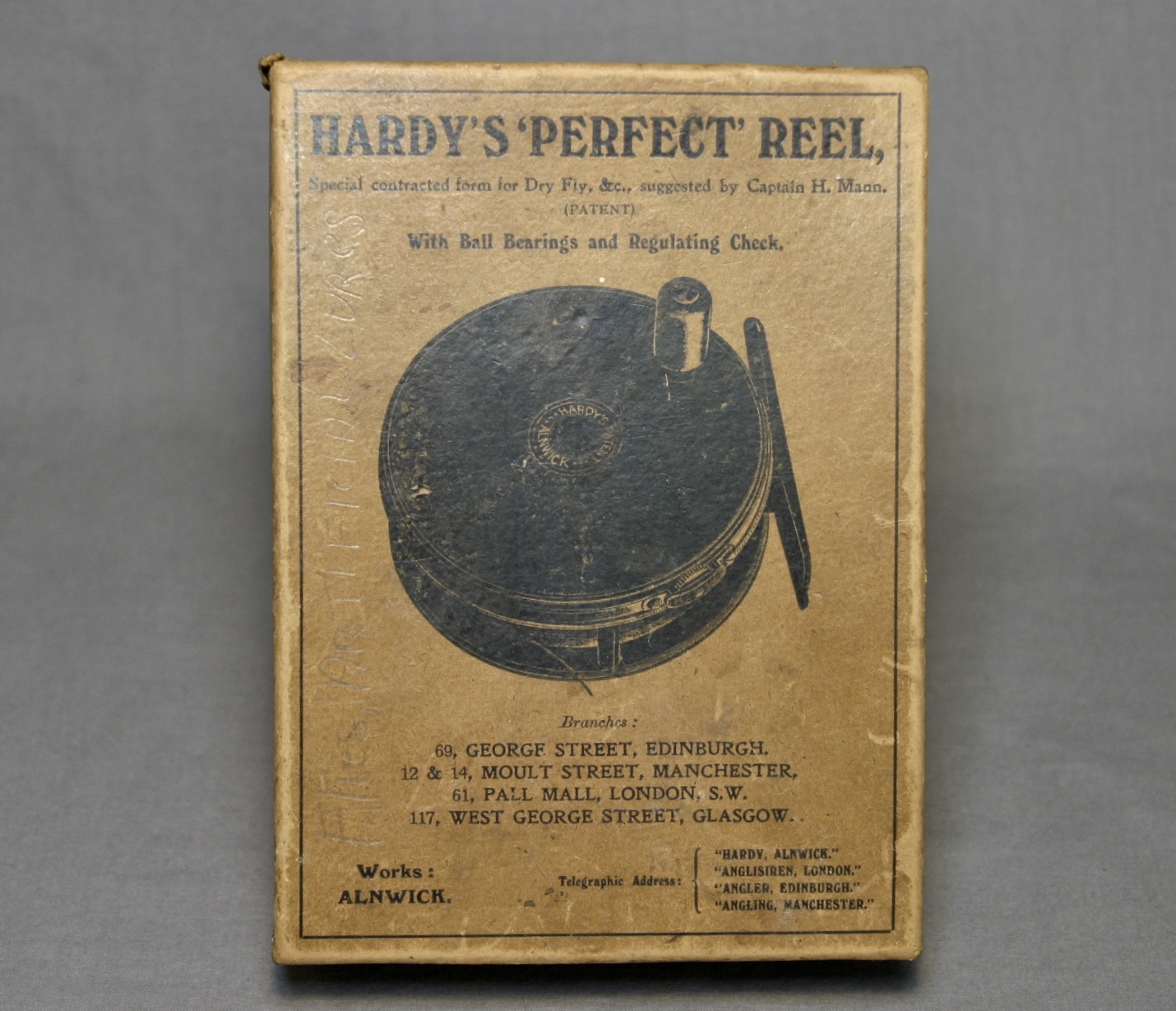 A good looking box for a Hardy “Perfect” reel. The box is in great condition with the exception of one of the reinforced metal corners. There is a split along the metal teeth.